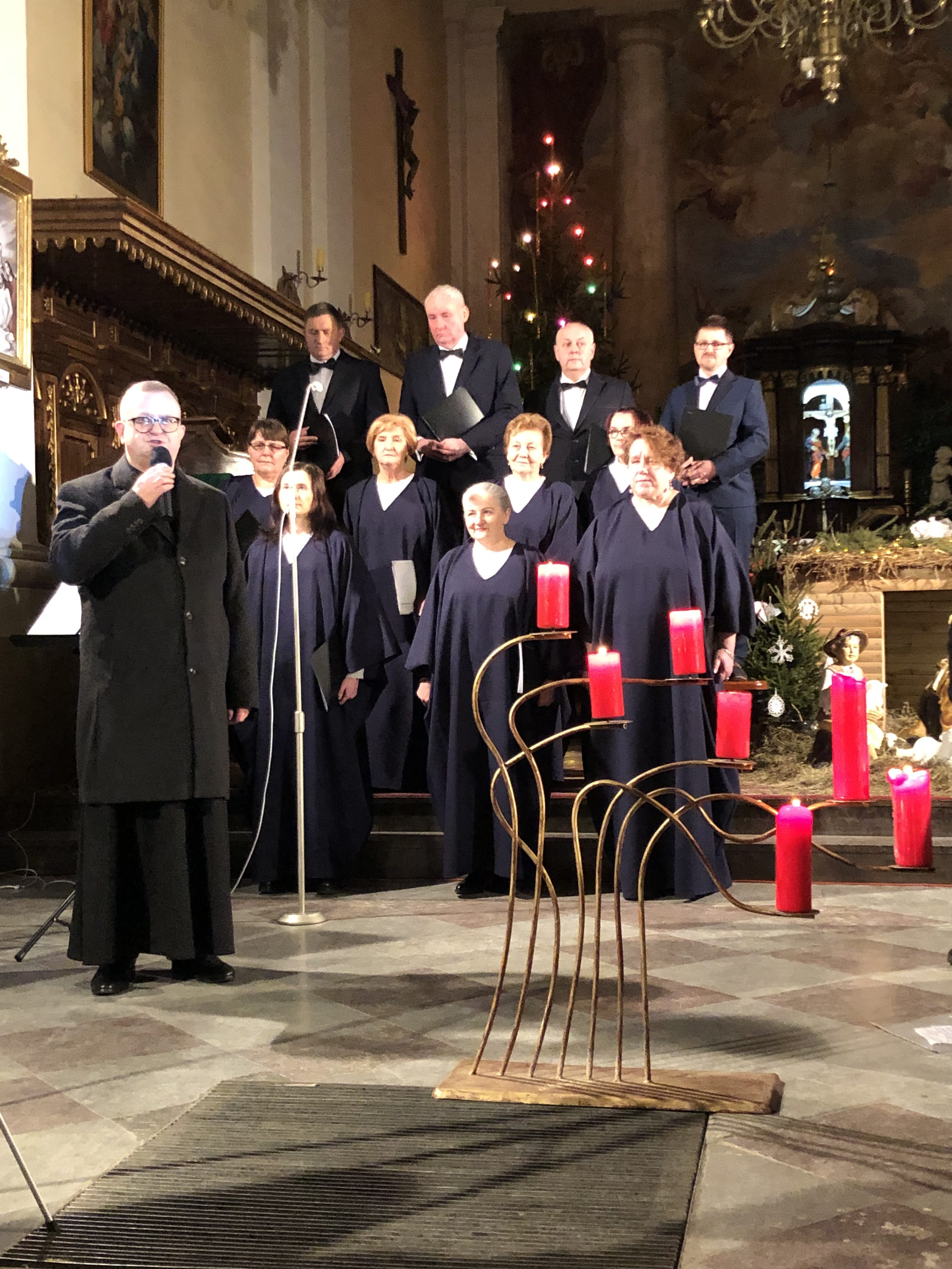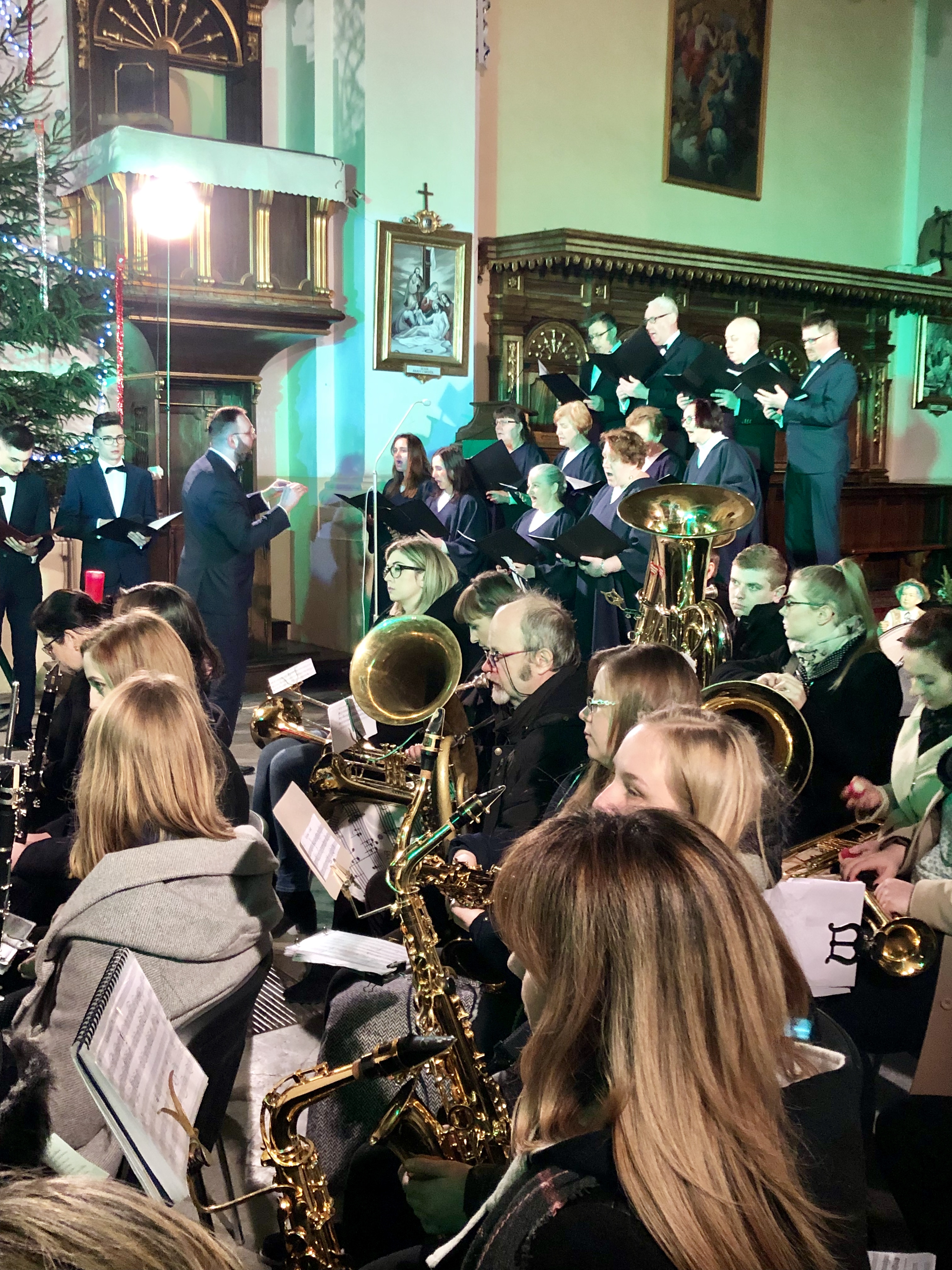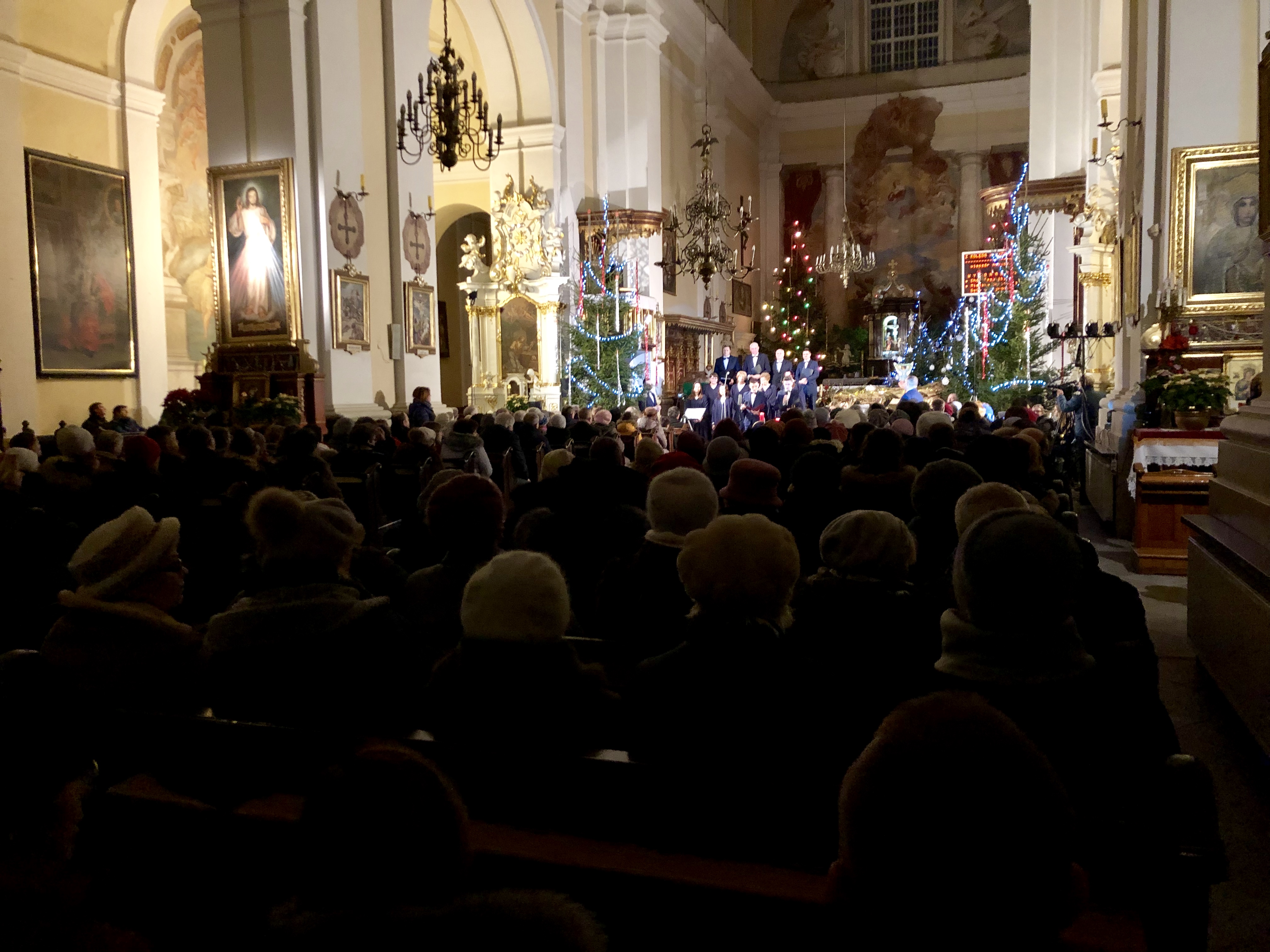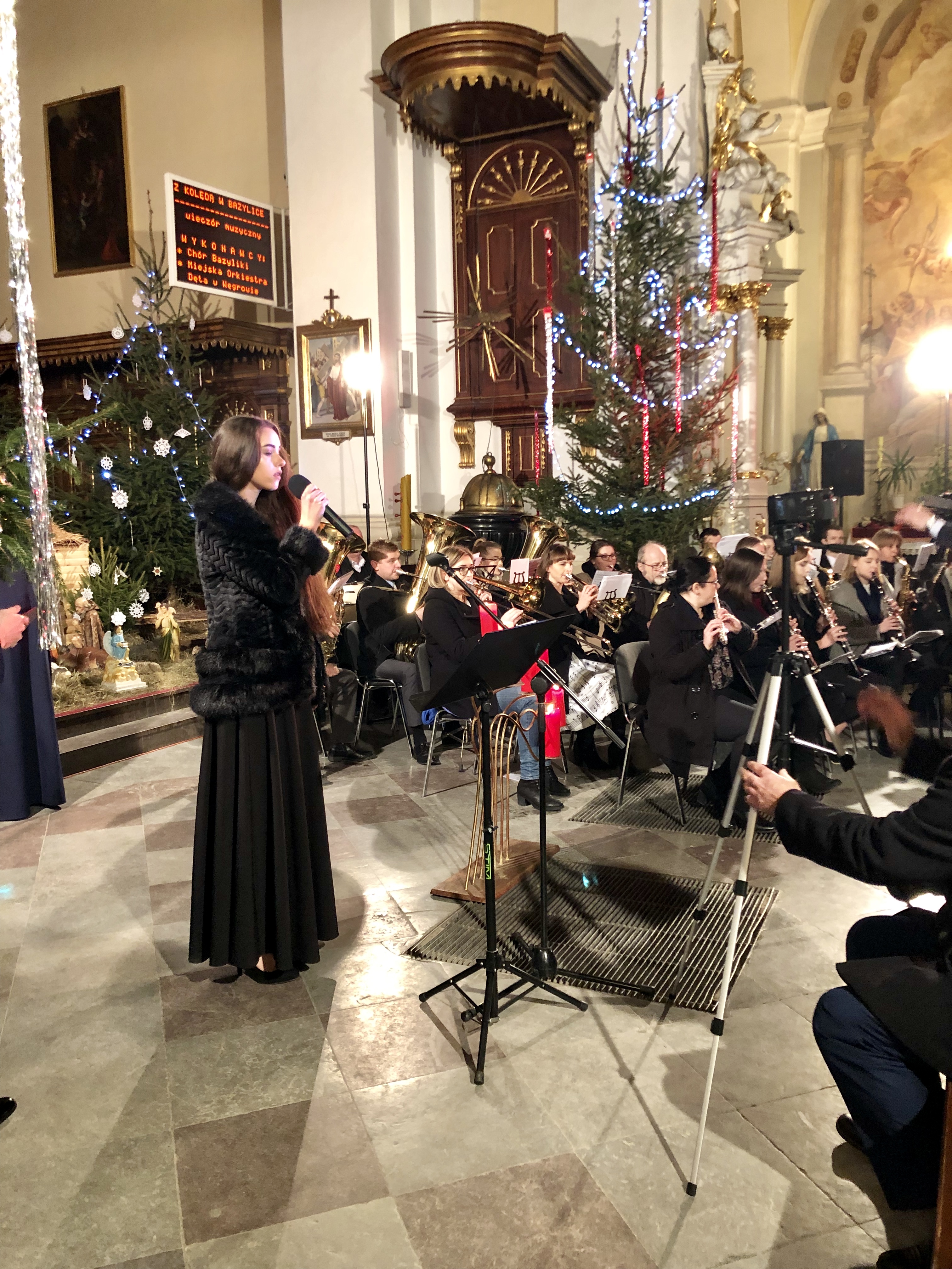 W niedzielę, 20 stycznia, o godz. 19:00 w farze węgrowskiej miał miejsce niezwykły koncert, zatytułowany „Z kolędą w Bazylice”. Śpiew i gra instrumentalna wypełniły świątynię po brzegi. Pośród udekorowanych kolorowymi lampkami choinek wybrzmiały tradycyjne polskie kolędy w wykonaniu chóru parafialnego pod dyr. Jakuba Plasa: „Tryumfy Króla Niebieskiego”, „Narodził się nam w Betlejem”, „Kołysanka Matki Boskiej”. W nieco nowatorskich opracowaniach kolęd i pastorałek wystąpiła także Miejska Orkiestra Dęta z Węgrowa. Instrumentaliści pod batutą kapelmistrza, Tomasza Gronowskiego, zagrali m.in. „Cichą noc”, „O gwiazdo betlejemska”, „Jezusek czuwa”, „White Christmas” i „Dzień jeden w roku”. Nie zabrakło również solistów: Eweliny Krzymowskiej, Magdaleny Rusiniak oraz Wojciecha Rusiniaka. Scenariusz muzycznego wieczoru zawarł cały wachlarz utworów różnych epok, co pozwoliło jednocześnie na przybliżenie odbiorcom sylwetek wielu znanych i wybitnych kompozytorów z Polski i ze świata. Zwieńczeniem całego koncertu w węgrowskiej Bazylice stała się „Pieśń o Narodzeniu Pańskim”, potocznie „Bóg się rodzi”- królowa polskich kolęd, skomponowana w rytmie poloneza koronacyjnego; i w takim też charakterze odśpiewał ją chór parafialny przy akompaniamencie orkiestry. Pozytywnym zaskoczeniem było, kiedy to wszyscy zgromadzeni goście podjęli wspólny śpiew tego majestatycznego utworu. Warto też wspomnieć o nieco zaskakującym rozpoczęciu koncertu: widzowie mięli okazję zaobserwować dość nietypowe wejście chóru środkiem nawy w kierunku prezbiterium, wykonującego kolędę „Wśród nocnej ciszy”. Wygaszone wnętrze świątyni, palące się świece przy żłóbku oraz efekty wizualizacyjne dopełniły kontemplacyjnego nastroju.