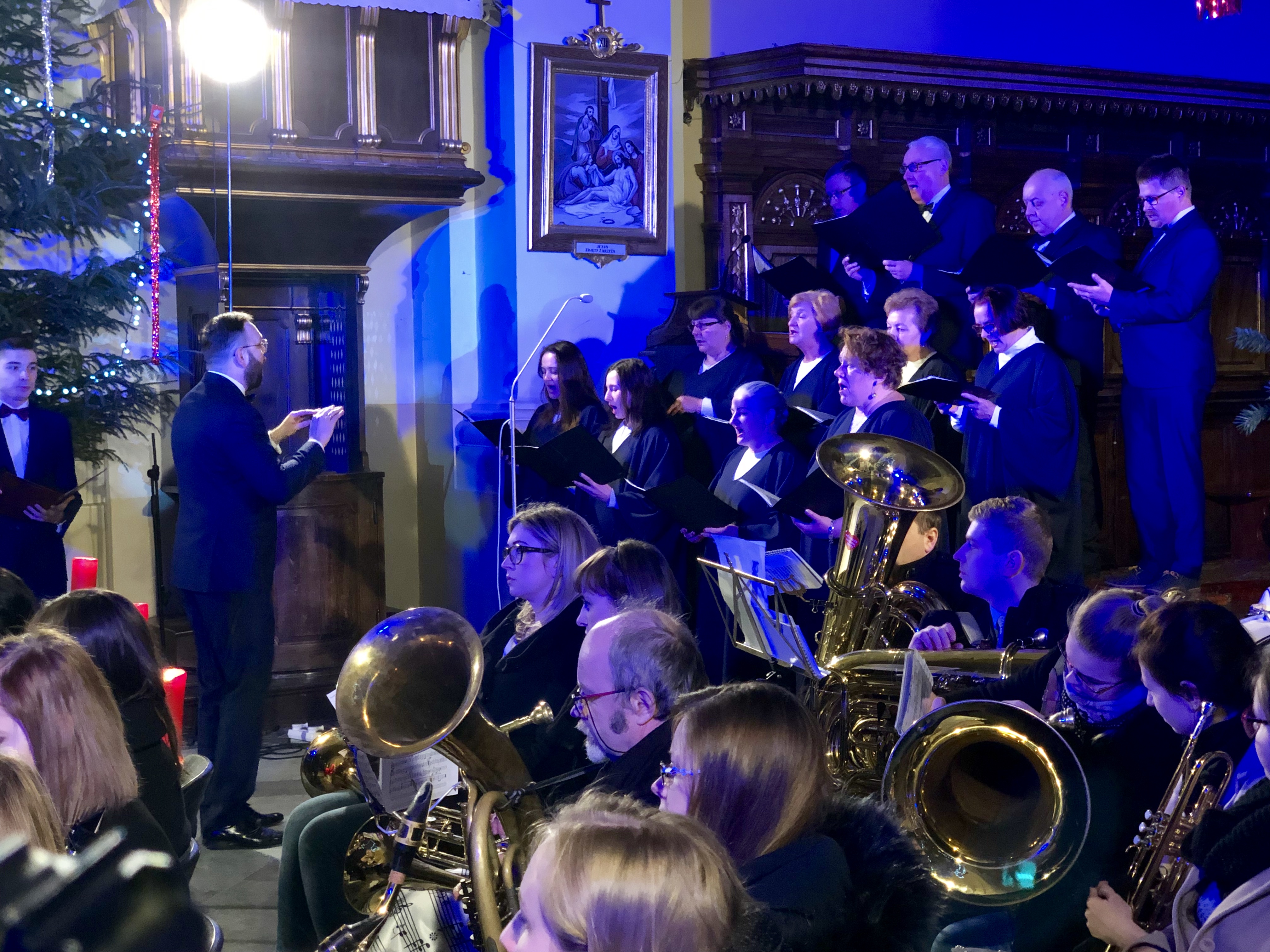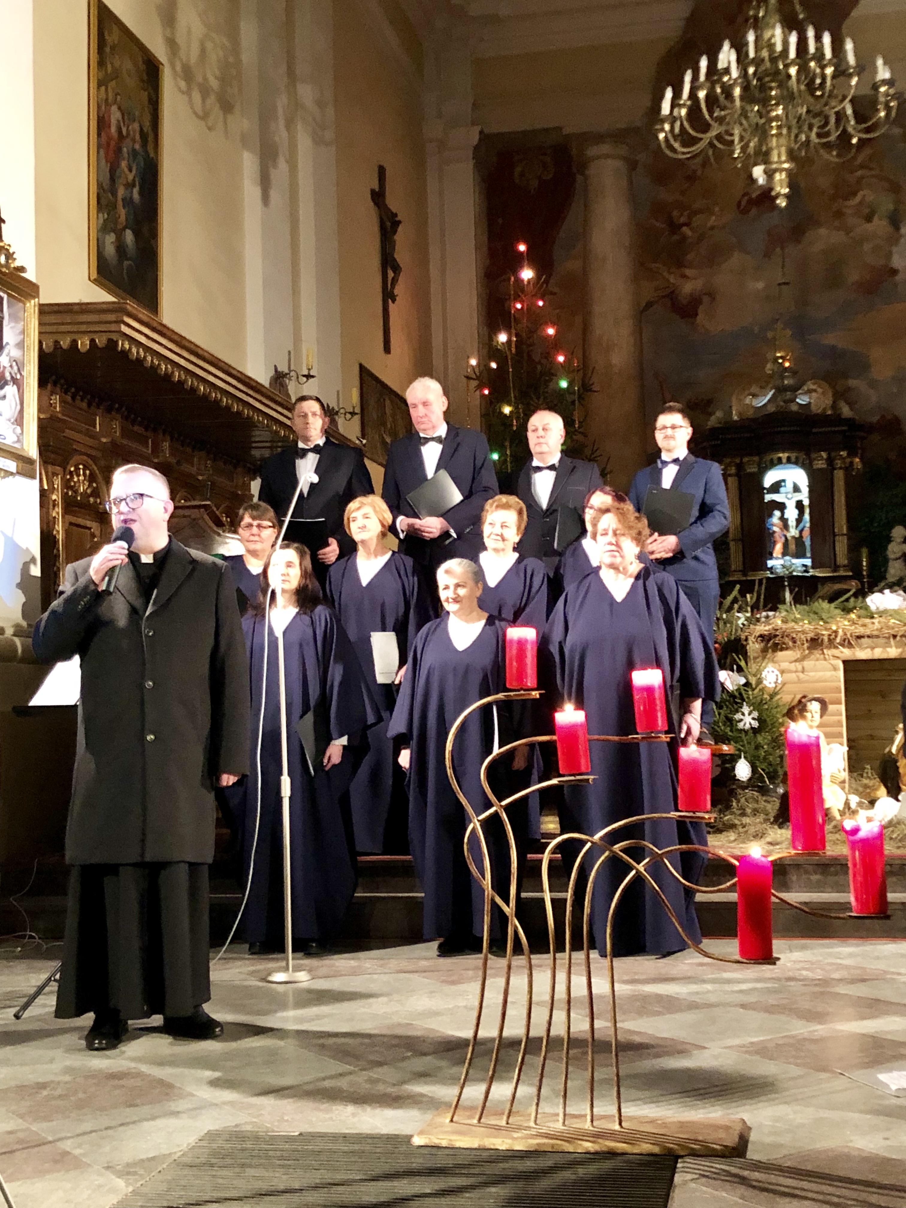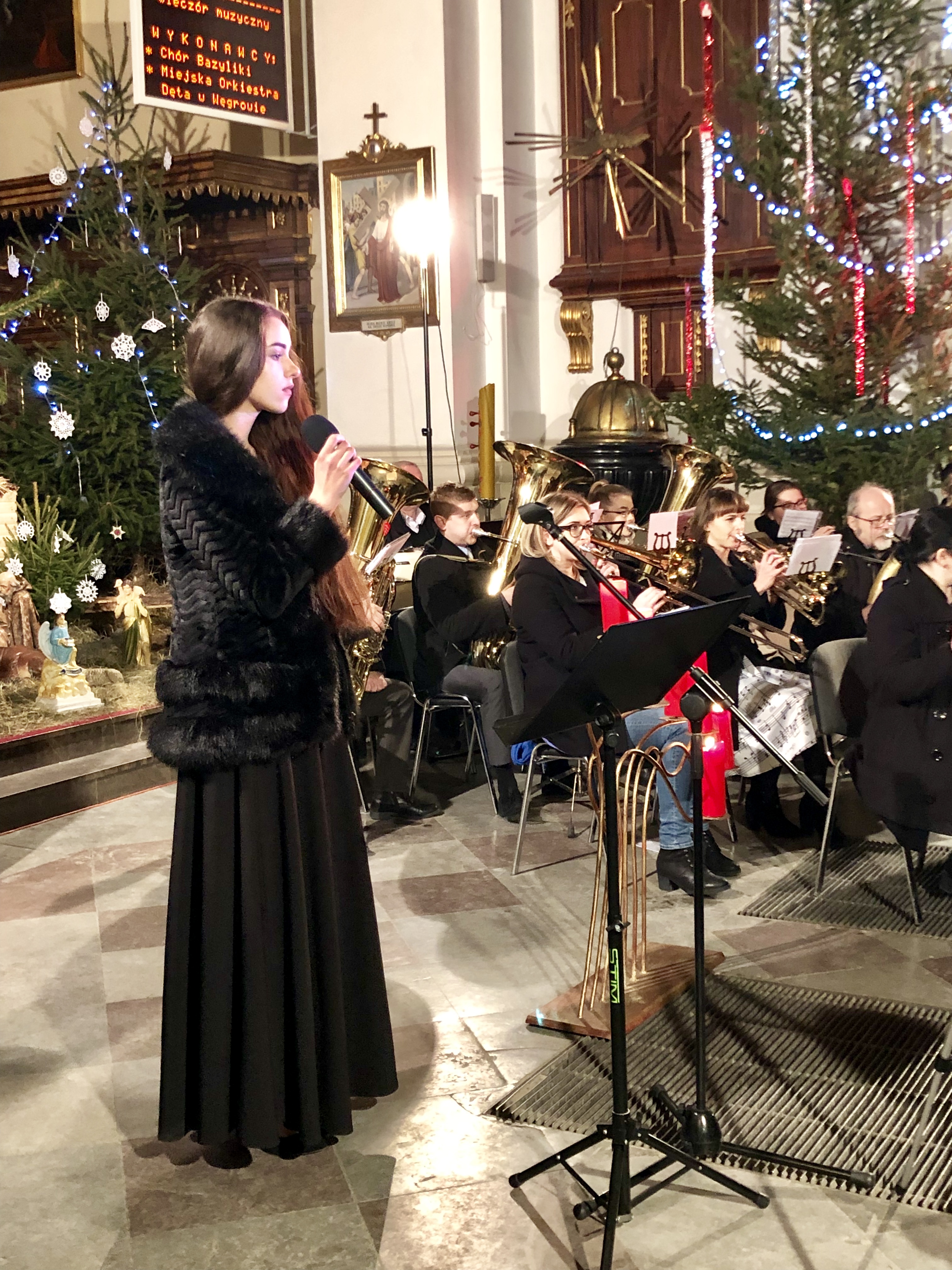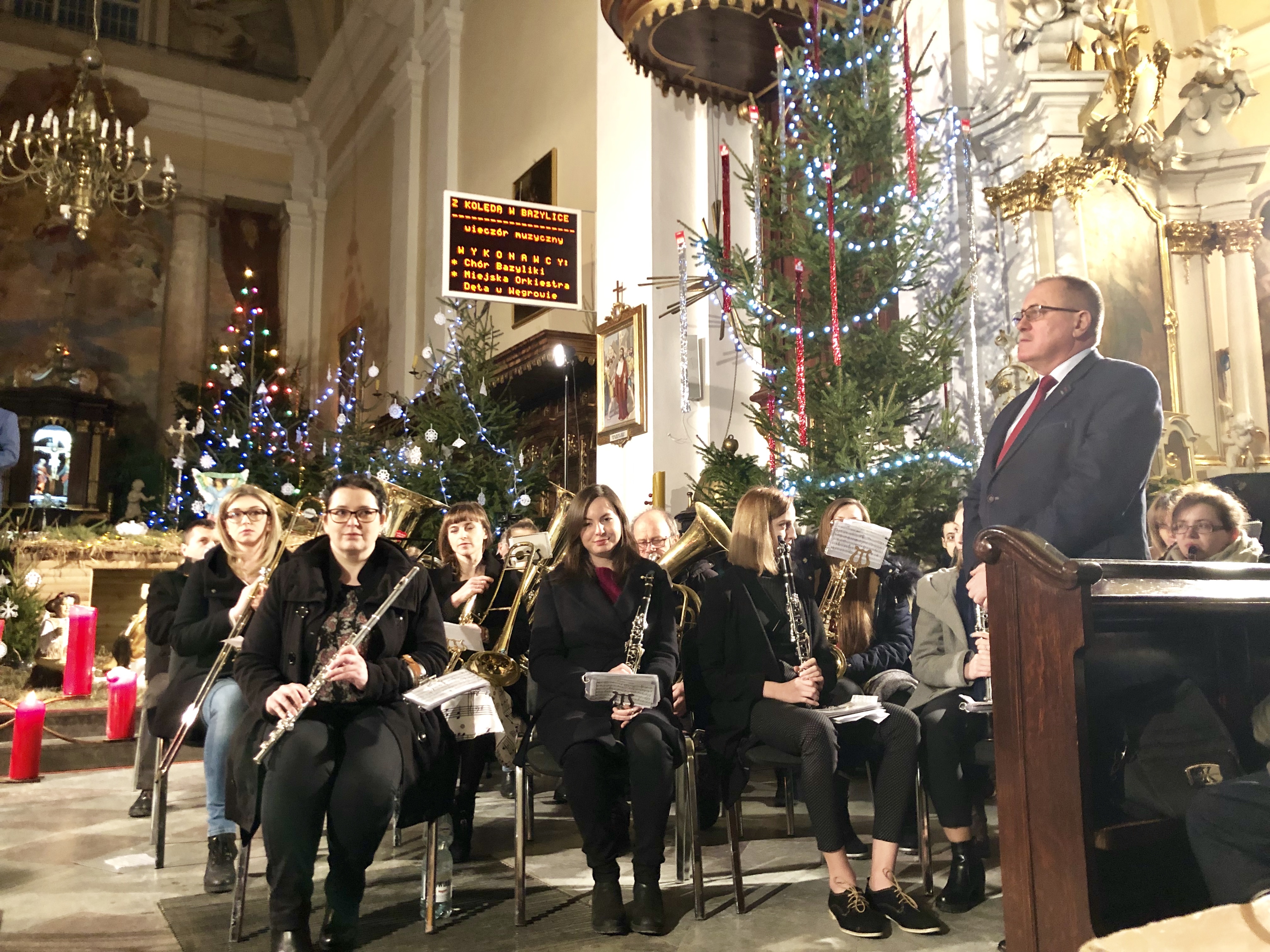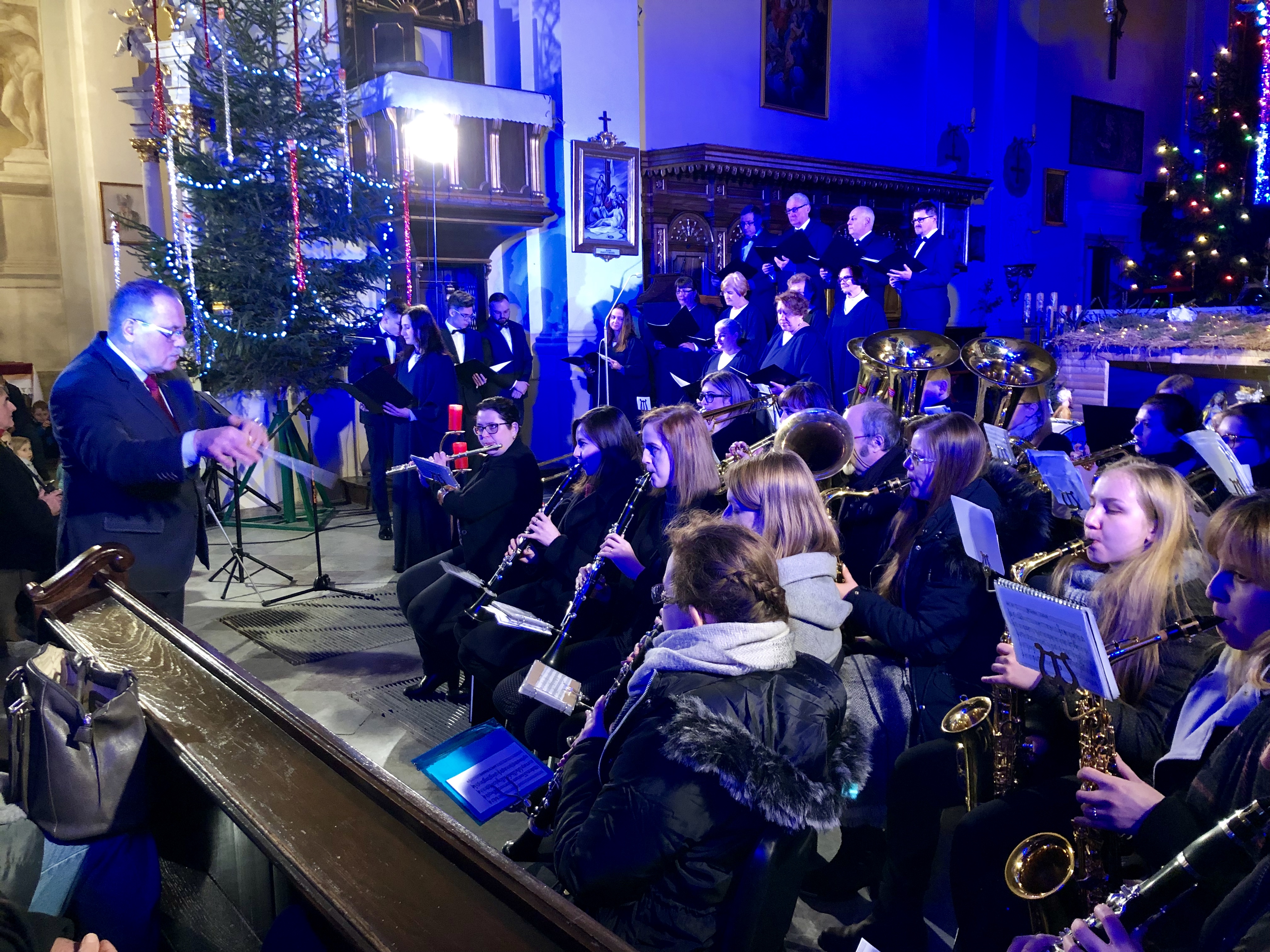 W niedzielę, 20 stycznia, o godz. 19:00 w farze węgrowskiej miał miejsce niezwykły koncert, zatytułowany „Z kolędą w Bazylice”. Śpiew i gra instrumentalna wypełniły świątynię po brzegi. Pośród udekorowanych kolorowymi lampkami choinek wybrzmiały tradycyjne polskie kolędy w wykonaniu chóru parafialnego pod dyr. Jakuba Plasa: „Tryumfy Króla Niebieskiego”, „Narodził się nam w Betlejem”, „Kołysanka Matki Boskiej”. W nieco nowatorskich opracowaniach kolęd i pastorałek wystąpiła także Miejska Orkiestra Dęta z Węgrowa. Instrumentaliści pod batutą kapelmistrza, Tomasza Gronowskiego, zagrali m.in. „Cichą noc”, „O gwiazdo betlejemska”, „Jezusek czuwa”, „White Christmas” i „Dzień jeden w roku”. Nie zabrakło również solistów: Eweliny Krzymowskiej, Magdaleny Rusiniak oraz Wojciecha Rusiniaka. Scenariusz muzycznego wieczoru zawarł cały wachlarz utworów różnych epok, co pozwoliło jednocześnie na przybliżenie odbiorcom sylwetek wielu znanych i wybitnych kompozytorów z Polski i ze świata. Zwieńczeniem całego koncertu w węgrowskiej Bazylice stała się „Pieśń o Narodzeniu Pańskim”, potocznie „Bóg się rodzi”- królowa polskich kolęd, skomponowana w rytmie poloneza koronacyjnego; i w takim też charakterze odśpiewał ją chór parafialny przy akompaniamencie orkiestry. Pozytywnym zaskoczeniem było, kiedy to wszyscy zgromadzeni goście podjęli wspólny śpiew tego majestatycznego utworu. Warto też wspomnieć o nieco zaskakującym rozpoczęciu koncertu: widzowie mięli okazję zaobserwować dość nietypowe wejście chóru środkiem nawy w kierunku prezbiterium, wykonującego kolędę „Wśród nocnej ciszy”. Wygaszone wnętrze świątyni, palące się świece przy żłóbku oraz efekty wizualizacyjne dopełniły kontemplacyjnego nastroju.
