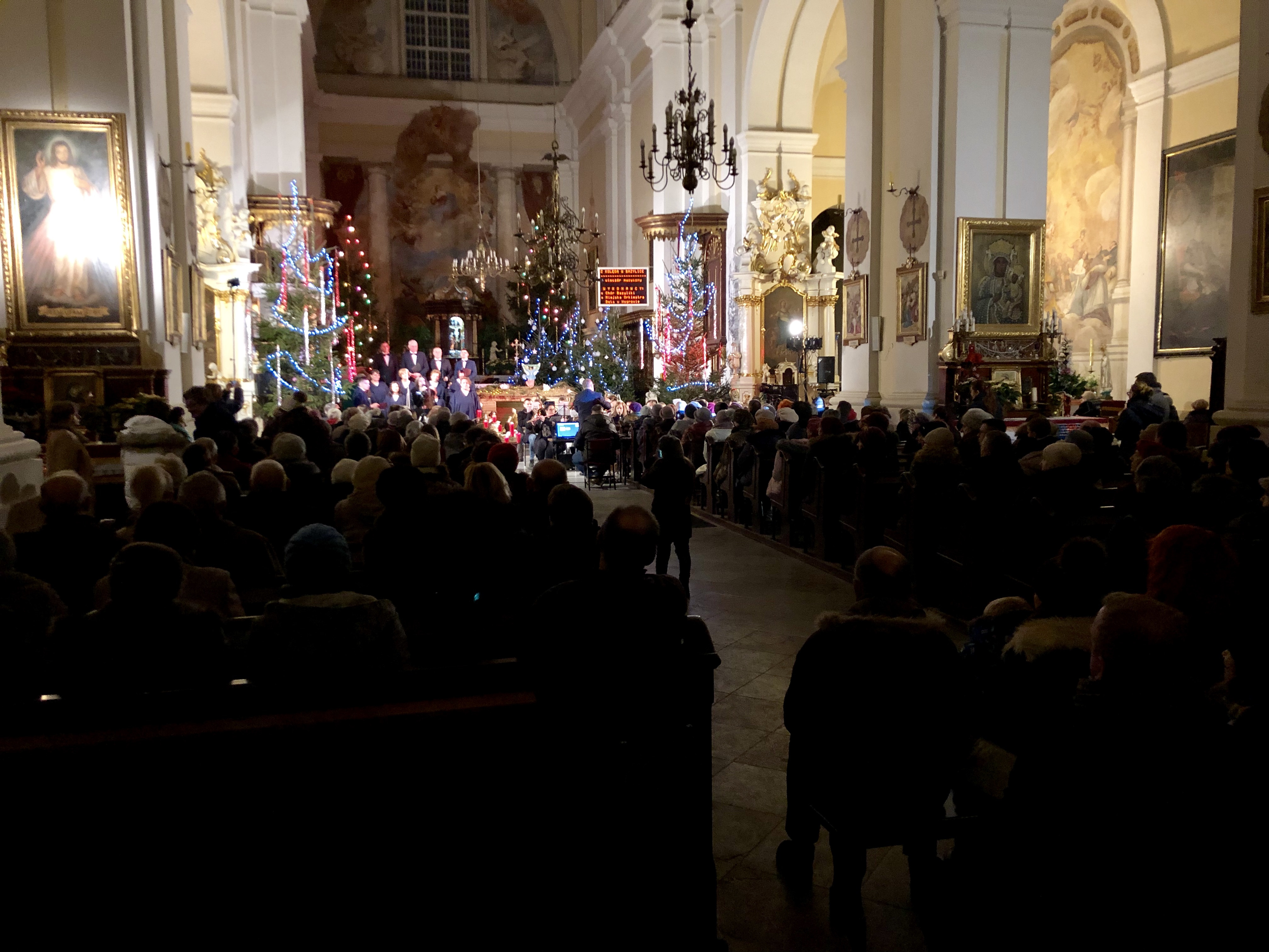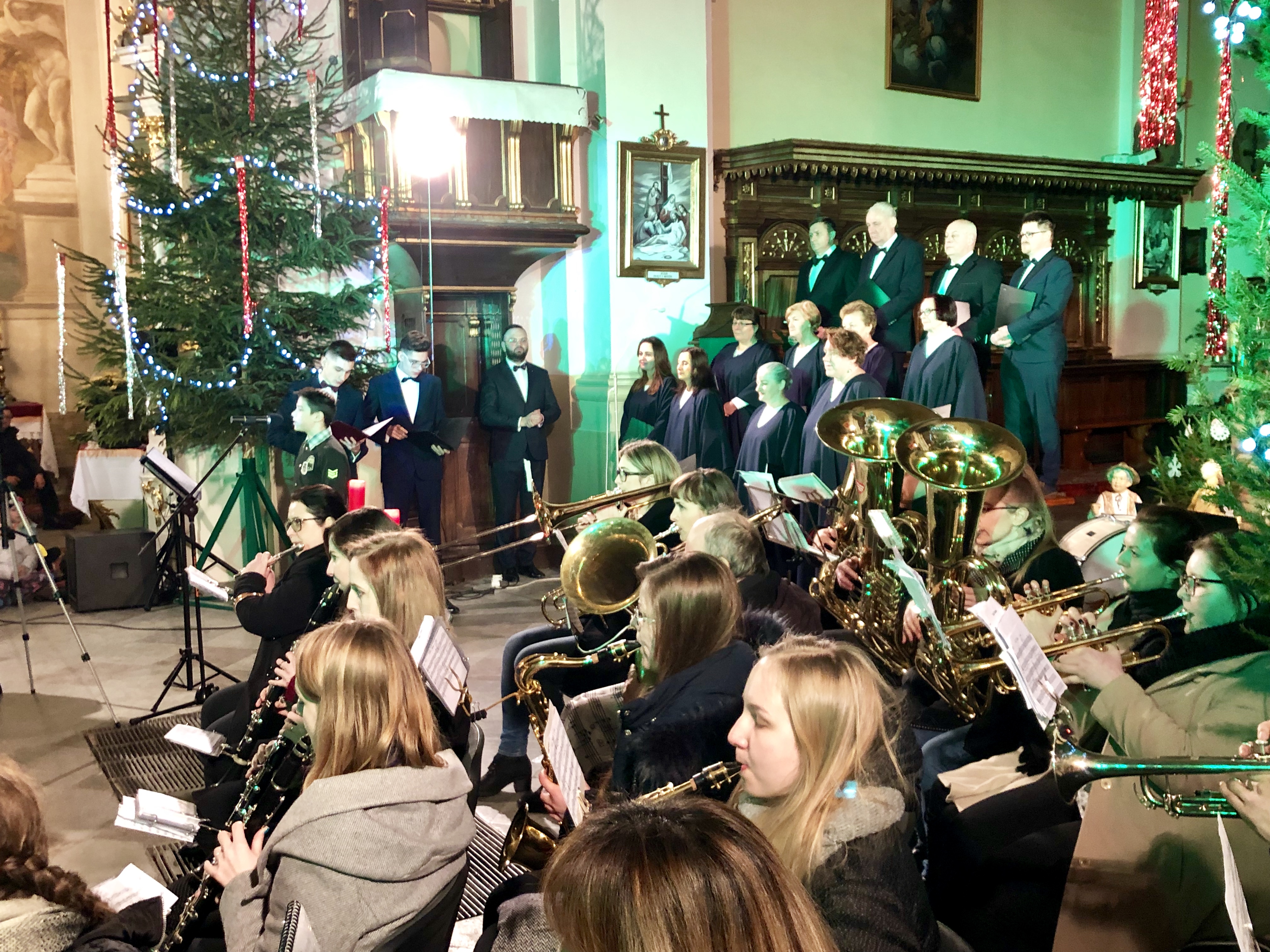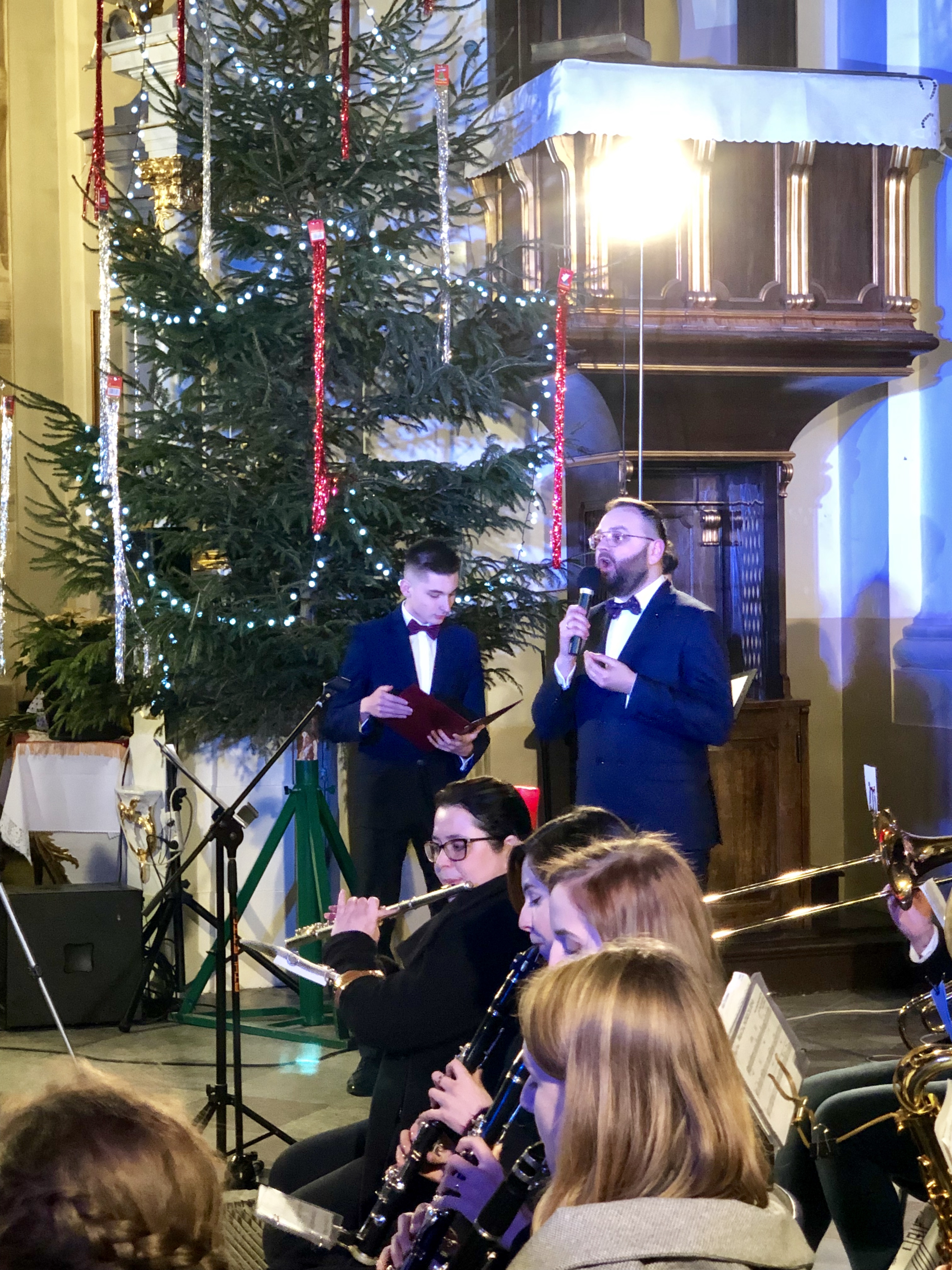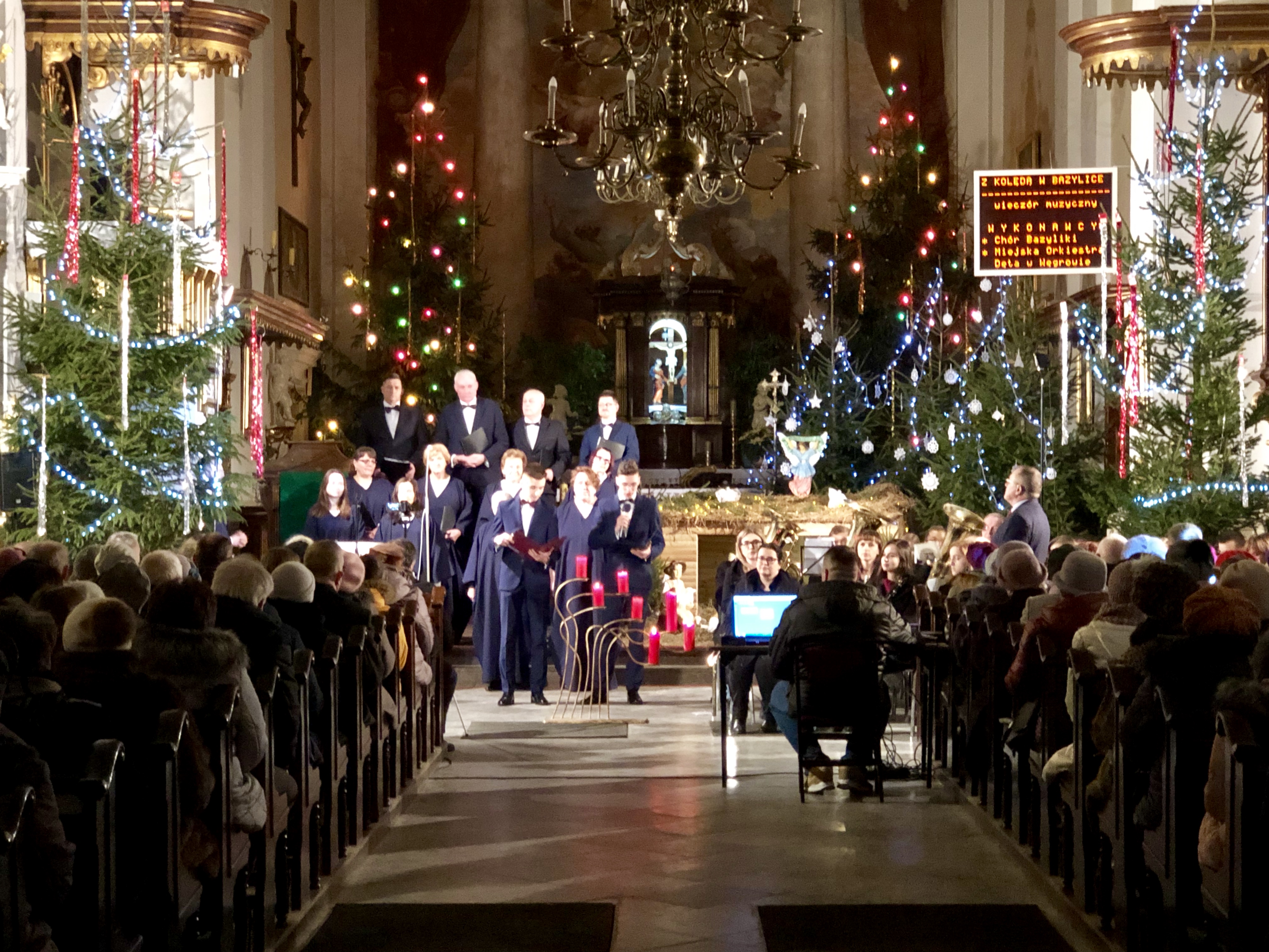 W niedzielę, 20 stycznia, o godz. 19:00 w farze węgrowskiej miał miejsce niezwykły koncert, zatytułowany „Z kolędą w Bazylice”. Śpiew i gra instrumentalna wypełniły świątynię po brzegi. Pośród udekorowanych kolorowymi lampkami choinek wybrzmiały tradycyjne polskie kolędy w wykonaniu chóru parafialnego pod dyr. Jakuba Plasa: „Tryumfy Króla Niebieskiego”, „Narodził się nam w Betlejem”, „Kołysanka Matki Boskiej”. W nieco nowatorskich opracowaniach kolęd i pastorałek wystąpiła także Miejska Orkiestra Dęta z Węgrowa. Instrumentaliści pod batutą kapelmistrza, Tomasza Gronowskiego, zagrali m.in. „Cichą noc”, „O gwiazdo betlejemska”, „Jezusek czuwa”, „White Christmas” i „Dzień jeden w roku”. Nie zabrakło również solistów: Eweliny Krzymowskiej, Magdaleny Rusiniak oraz Wojciecha Rusiniaka. Scenariusz muzycznego wieczoru zawarł cały wachlarz utworów różnych epok, co pozwoliło jednocześnie na przybliżenie odbiorcom sylwetek wielu znanych i wybitnych kompozytorów z Polski i ze świata. Zwieńczeniem całego koncertu w węgrowskiej Bazylice stała się „Pieśń o Narodzeniu Pańskim”, potocznie „Bóg się rodzi”- królowa polskich kolęd, skomponowana w rytmie poloneza koronacyjnego; i w takim też charakterze odśpiewał ją chór parafialny przy akompaniamencie orkiestry. Pozytywnym zaskoczeniem było, kiedy to wszyscy zgromadzeni goście podjęli wspólny śpiew tego majestatycznego utworu. Warto też wspomnieć o nieco zaskakującym rozpoczęciu koncertu: widzowie mięli okazję zaobserwować dość nietypowe wejście chóru środkiem nawy w kierunku prezbiterium, wykonującego kolędę „Wśród nocnej ciszy”. Wygaszone wnętrze świątyni, palące się świece przy żłóbku oraz efekty wizualizacyjne dopełniły kontemplacyjnego nastroju.