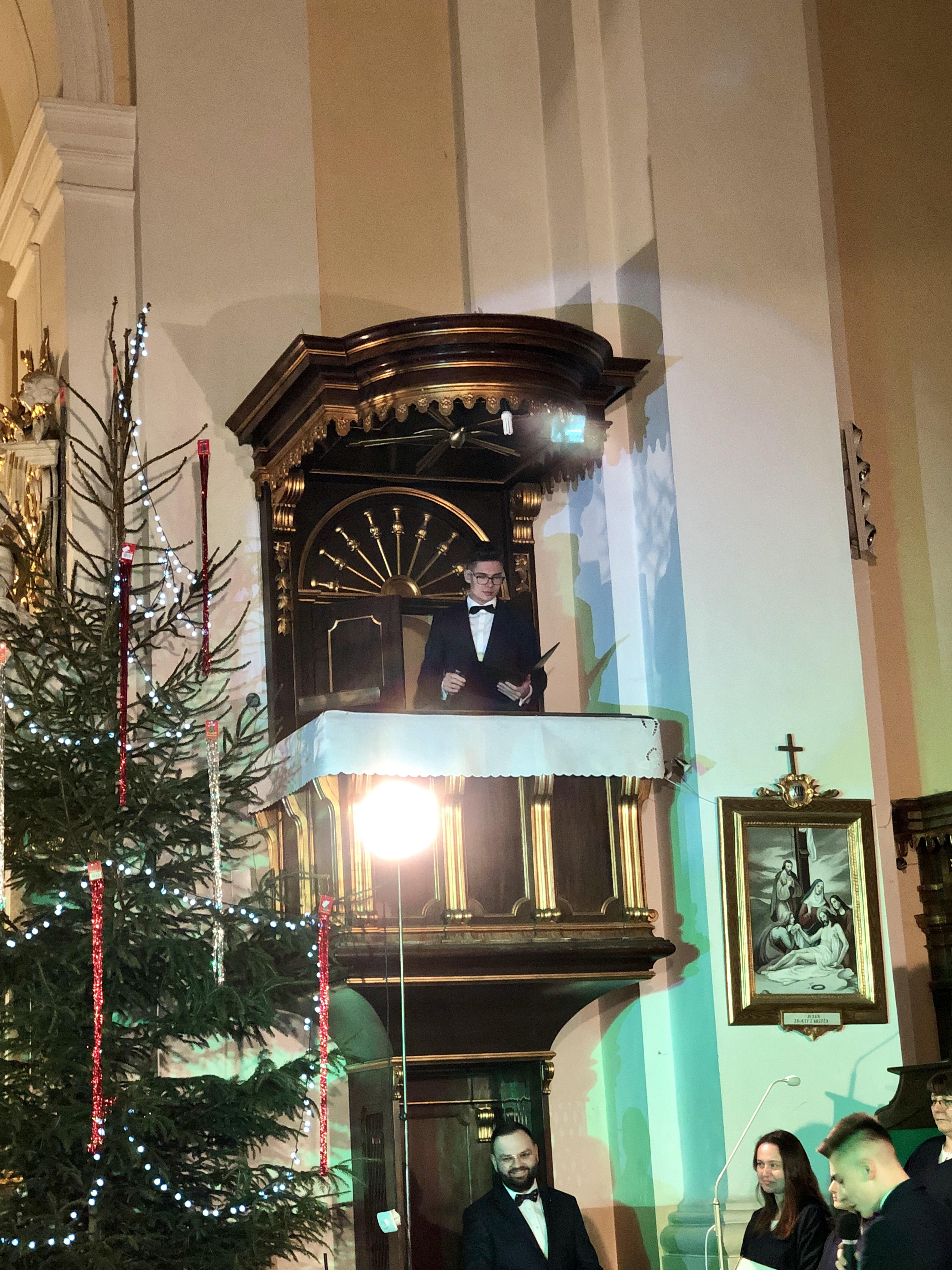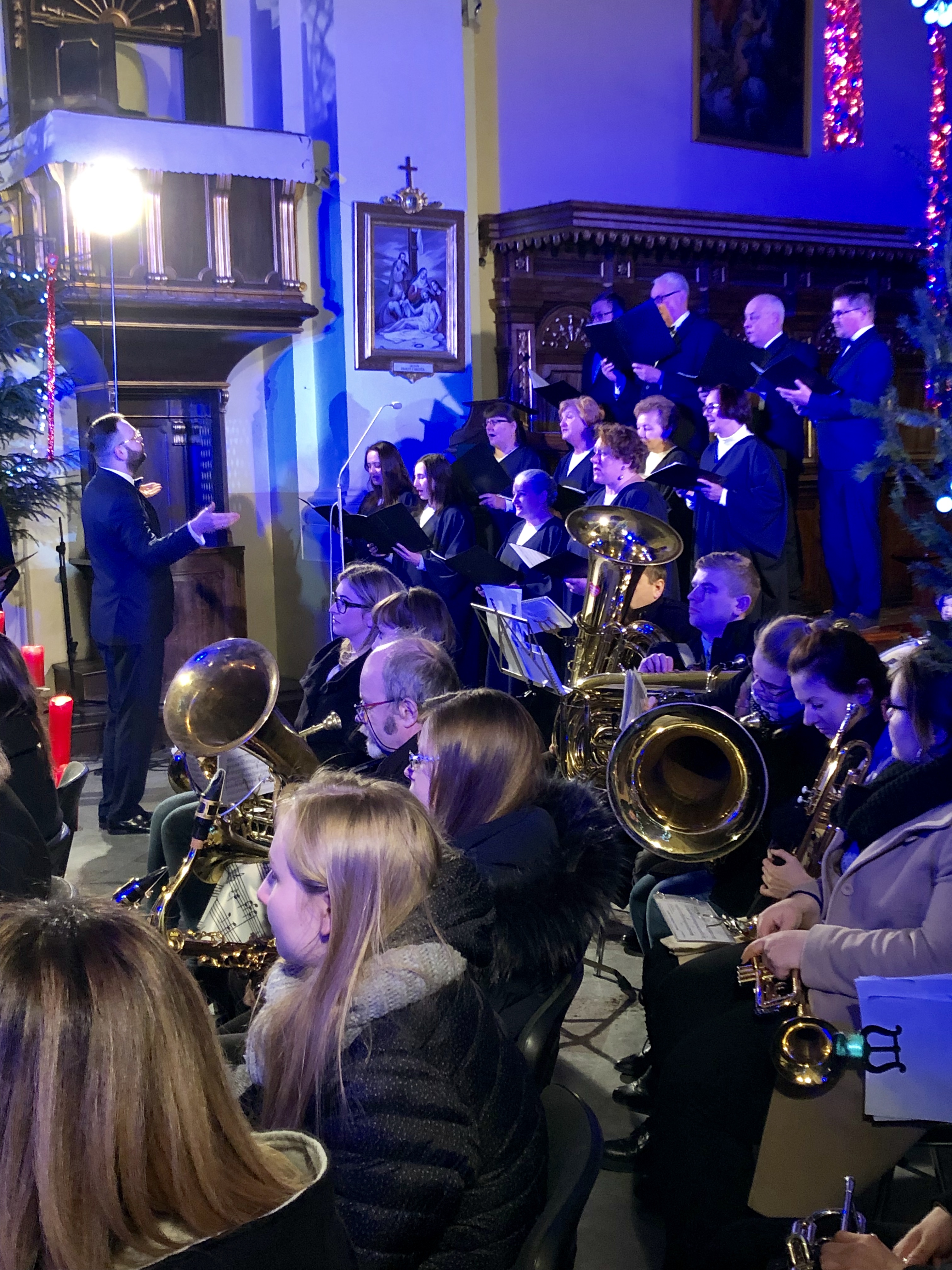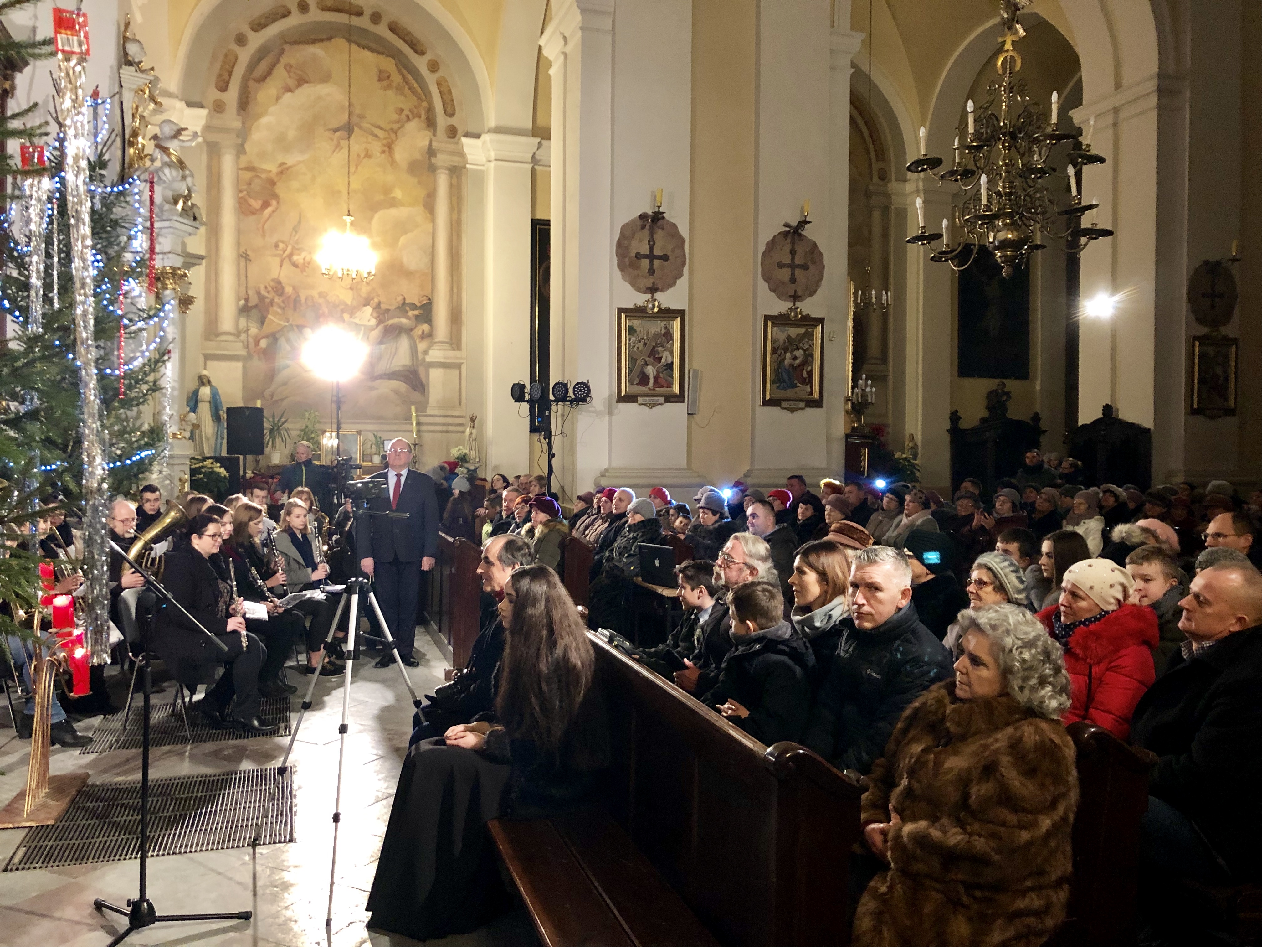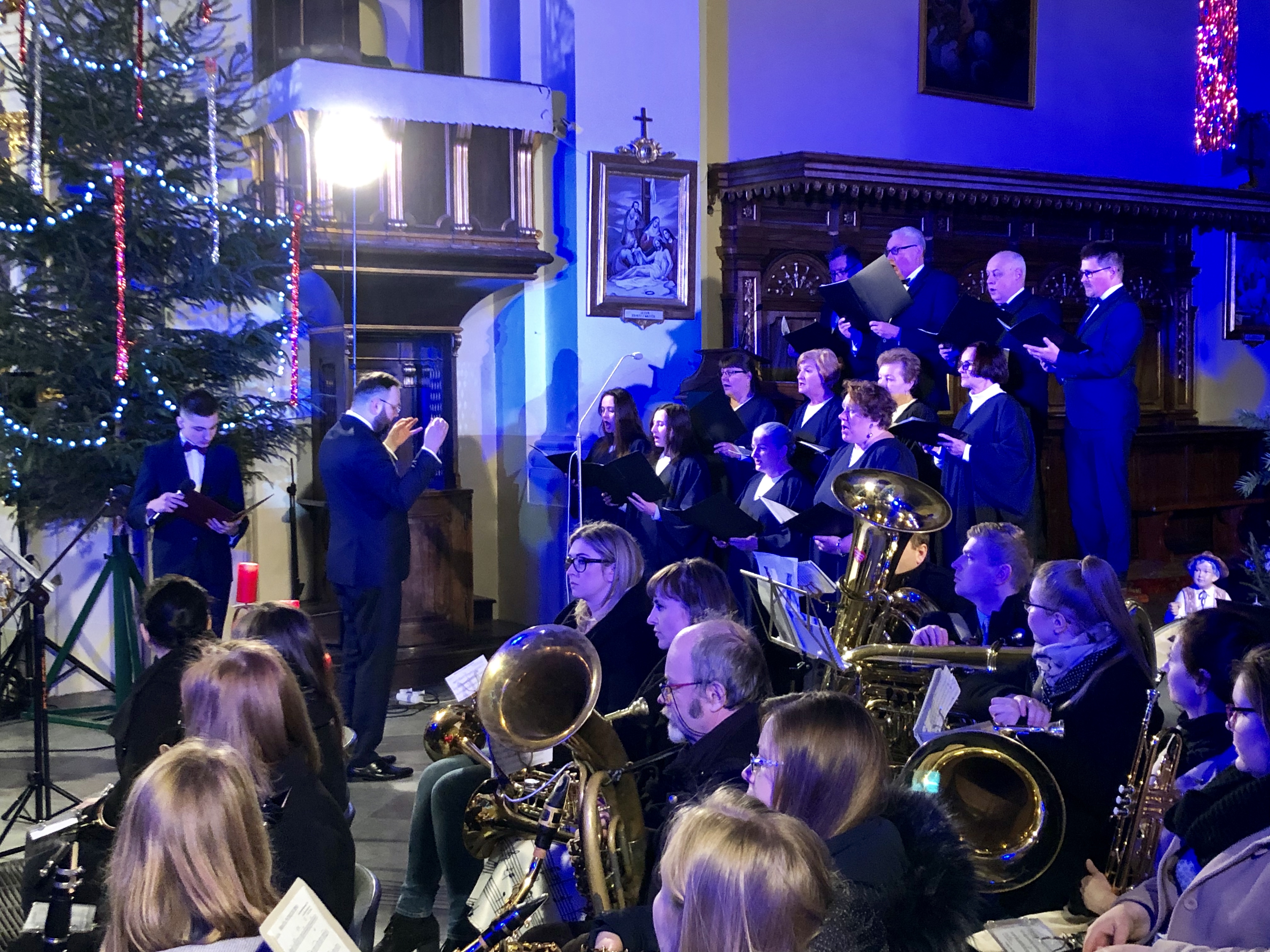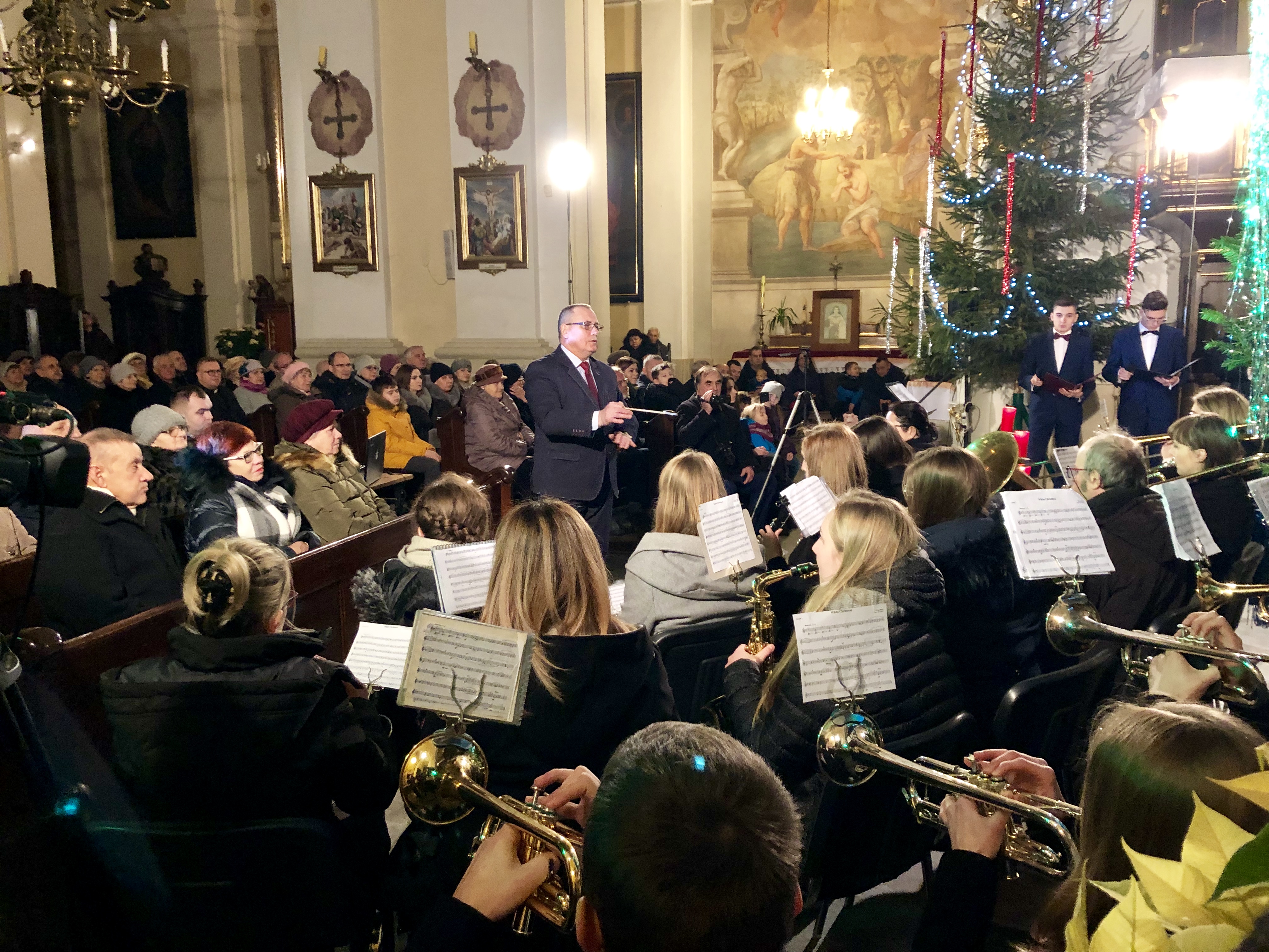 W niedzielę, 20 stycznia, o godz. 19:00 w farze węgrowskiej miał miejsce niezwykły koncert, zatytułowany „Z kolędą w Bazylice”. Śpiew i gra instrumentalna wypełniły świątynię po brzegi. Pośród udekorowanych kolorowymi lampkami choinek wybrzmiały tradycyjne polskie kolędy w wykonaniu chóru parafialnego pod dyr. Jakuba Plasa: „Tryumfy Króla Niebieskiego”, „Narodził się nam w Betlejem”, „Kołysanka Matki Boskiej”. W nieco nowatorskich opracowaniach kolęd i pastorałek wystąpiła także Miejska Orkiestra Dęta z Węgrowa. Instrumentaliści pod batutą kapelmistrza, Tomasza Gronowskiego, zagrali m.in. „Cichą noc”, „O gwiazdo betlejemska”, „Jezusek czuwa”, „White Christmas” i „Dzień jeden w roku”. Nie zabrakło również solistów: Eweliny Krzymowskiej, Magdaleny Rusiniak oraz Wojciecha Rusiniaka. Scenariusz muzycznego wieczoru zawarł cały wachlarz utworów różnych epok, co pozwoliło jednocześnie na przybliżenie odbiorcom sylwetek wielu znanych i wybitnych kompozytorów z Polski i ze świata. Zwieńczeniem całego koncertu w węgrowskiej Bazylice stała się „Pieśń o Narodzeniu Pańskim”, potocznie „Bóg się rodzi”- królowa polskich kolęd, skomponowana w rytmie poloneza koronacyjnego; i w takim też charakterze odśpiewał ją chór parafialny przy akompaniamencie orkiestry. Pozytywnym zaskoczeniem było, kiedy to wszyscy zgromadzeni goście podjęli wspólny śpiew tego majestatycznego utworu. Warto też wspomnieć o nieco zaskakującym rozpoczęciu koncertu: widzowie mięli okazję zaobserwować dość nietypowe wejście chóru środkiem nawy w kierunku prezbiterium, wykonującego kolędę „Wśród nocnej ciszy”. Wygaszone wnętrze świątyni, palące się świece przy żłóbku oraz efekty wizualizacyjne dopełniły kontemplacyjnego nastroju.