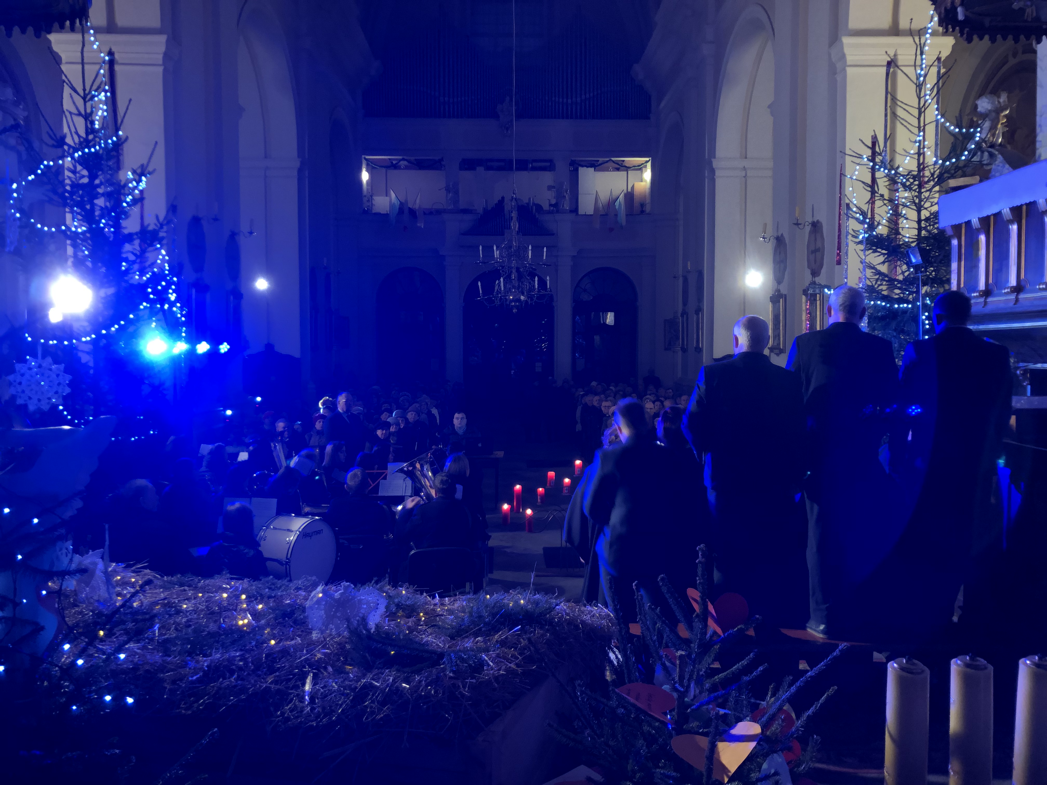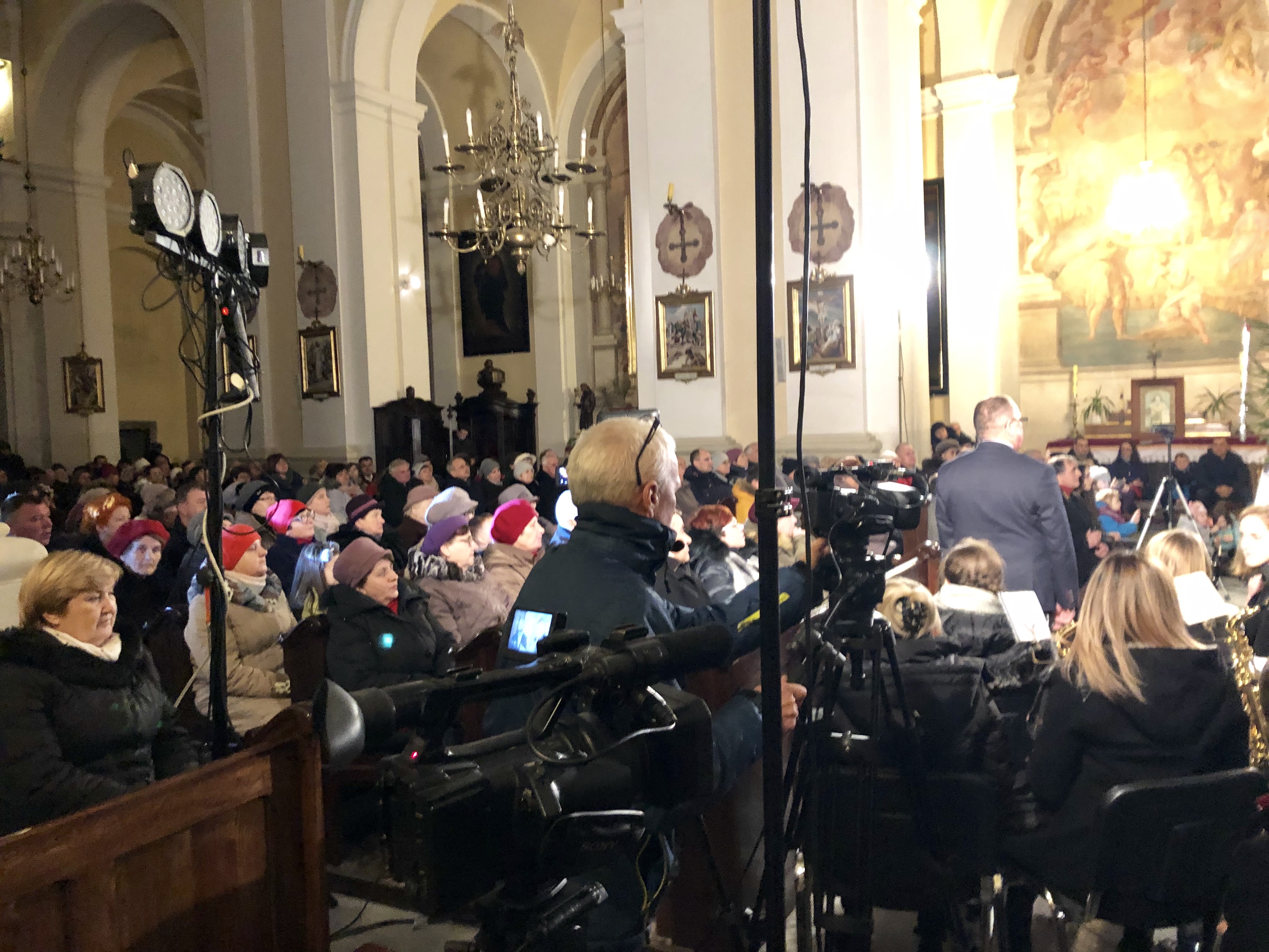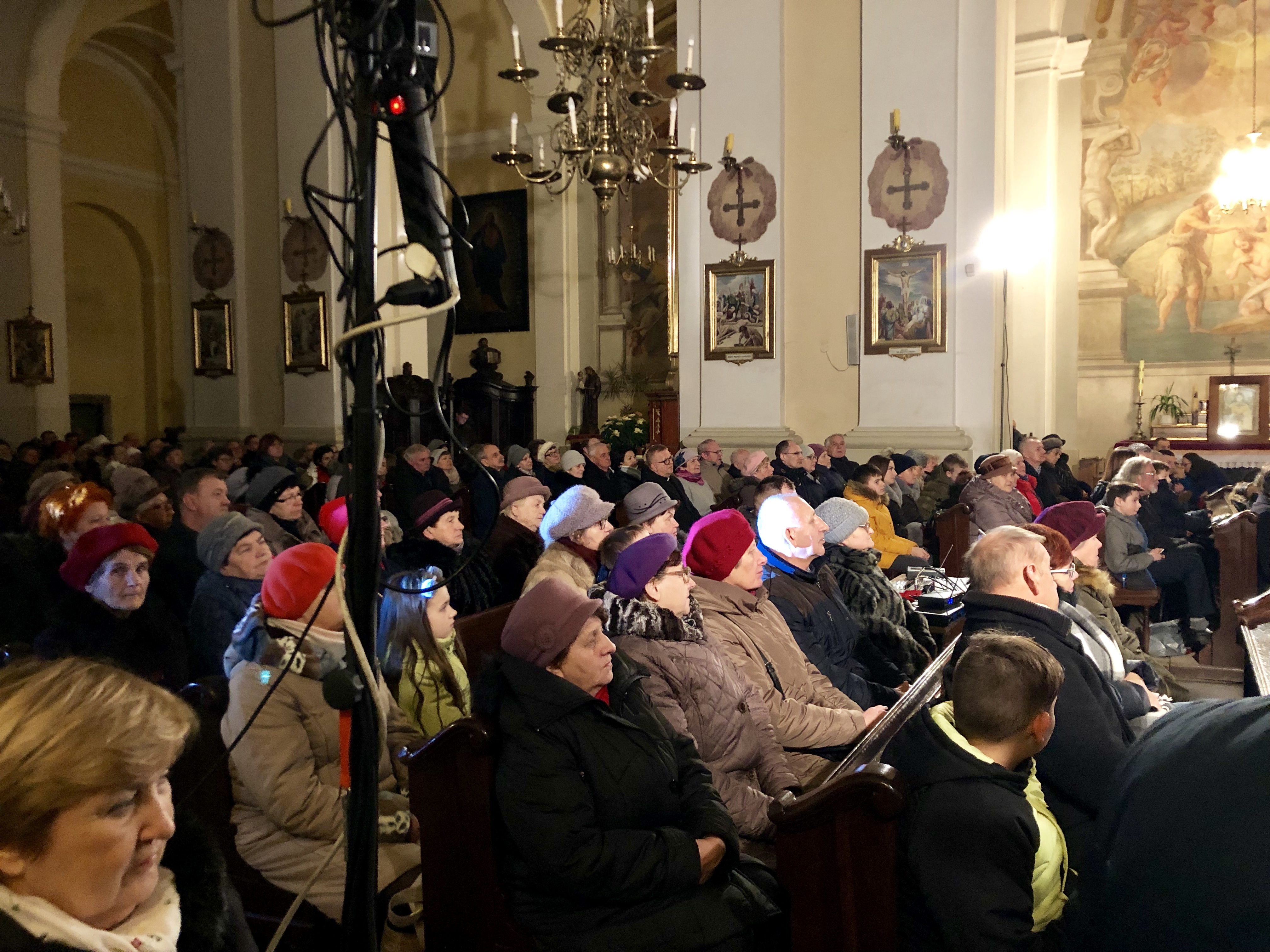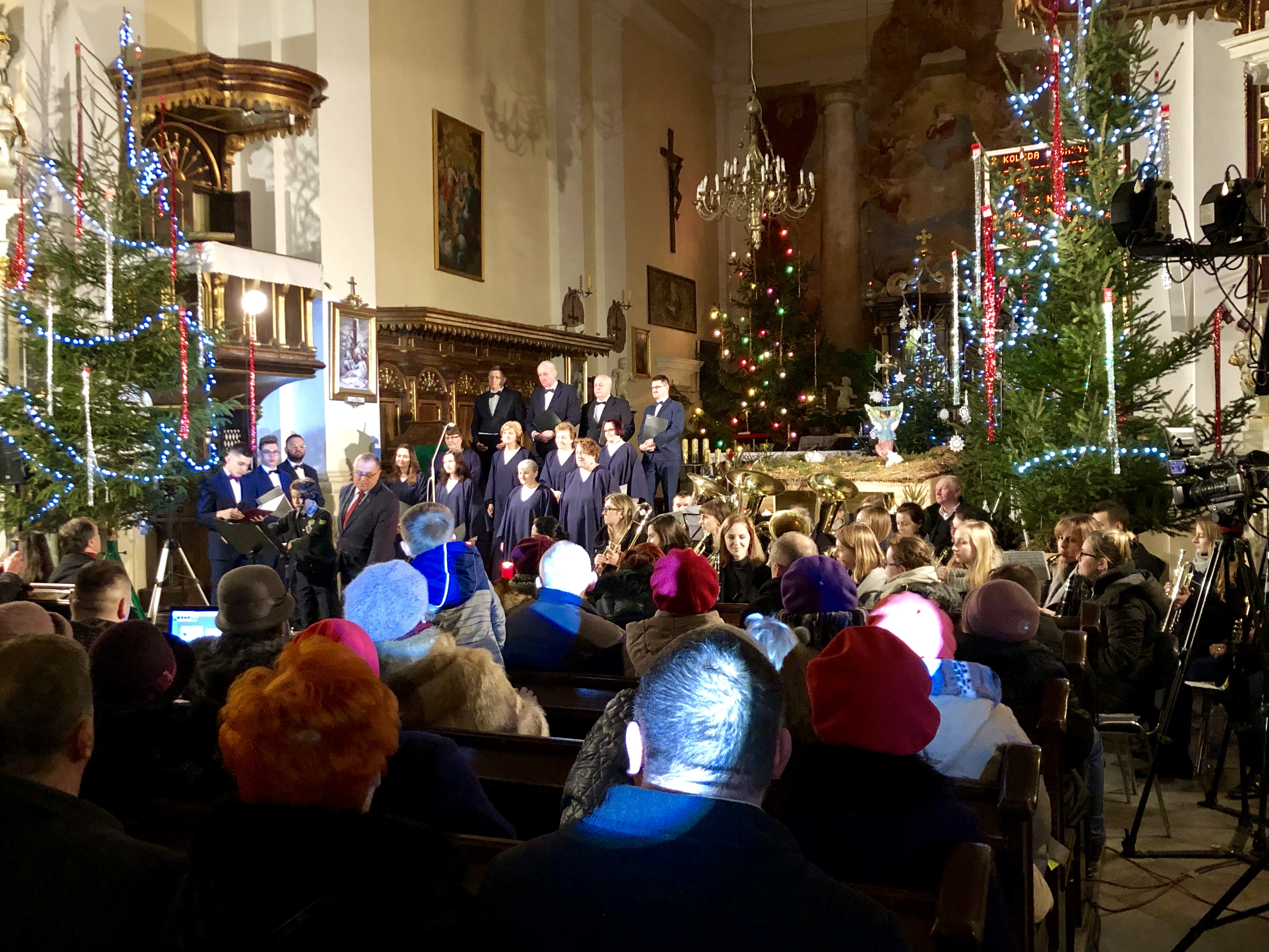 W niedzielę, 20 stycznia, o godz. 19:00 w farze węgrowskiej miał miejsce niezwykły koncert, zatytułowany „Z kolędą w Bazylice”. Śpiew i gra instrumentalna wypełniły świątynię po brzegi. Pośród udekorowanych kolorowymi lampkami choinek wybrzmiały tradycyjne polskie kolędy w wykonaniu chóru parafialnego pod dyr. Jakuba Plasa: „Tryumfy Króla Niebieskiego”, „Narodził się nam w Betlejem”, „Kołysanka Matki Boskiej”. W nieco nowatorskich opracowaniach kolęd i pastorałek wystąpiła także Miejska Orkiestra Dęta z Węgrowa. Instrumentaliści pod batutą kapelmistrza, Tomasza Gronowskiego, zagrali m.in. „Cichą noc”, „O gwiazdo betlejemska”, „Jezusek czuwa”, „White Christmas” i „Dzień jeden w roku”. Nie zabrakło również solistów: Eweliny Krzymowskiej, Magdaleny Rusiniak oraz Wojciecha Rusiniaka. Scenariusz muzycznego wieczoru zawarł cały wachlarz utworów różnych epok, co pozwoliło jednocześnie na przybliżenie odbiorcom sylwetek wielu znanych i wybitnych kompozytorów z Polski i ze świata. Zwieńczeniem całego koncertu w węgrowskiej Bazylice stała się „Pieśń o Narodzeniu Pańskim”, potocznie „Bóg się rodzi”- królowa polskich kolęd, skomponowana w rytmie poloneza koronacyjnego; i w takim też charakterze odśpiewał ją chór parafialny przy akompaniamencie orkiestry. Pozytywnym zaskoczeniem było, kiedy to wszyscy zgromadzeni goście podjęli wspólny śpiew tego majestatycznego utworu. Warto też wspomnieć o nieco zaskakującym rozpoczęciu koncertu: widzowie mięli okazję zaobserwować dość nietypowe wejście chóru środkiem nawy w kierunku prezbiterium, wykonującego kolędę „Wśród nocnej ciszy”. Wygaszone wnętrze świątyni, palące się świece przy żłóbku oraz efekty wizualizacyjne dopełniły kontemplacyjnego nastroju.
