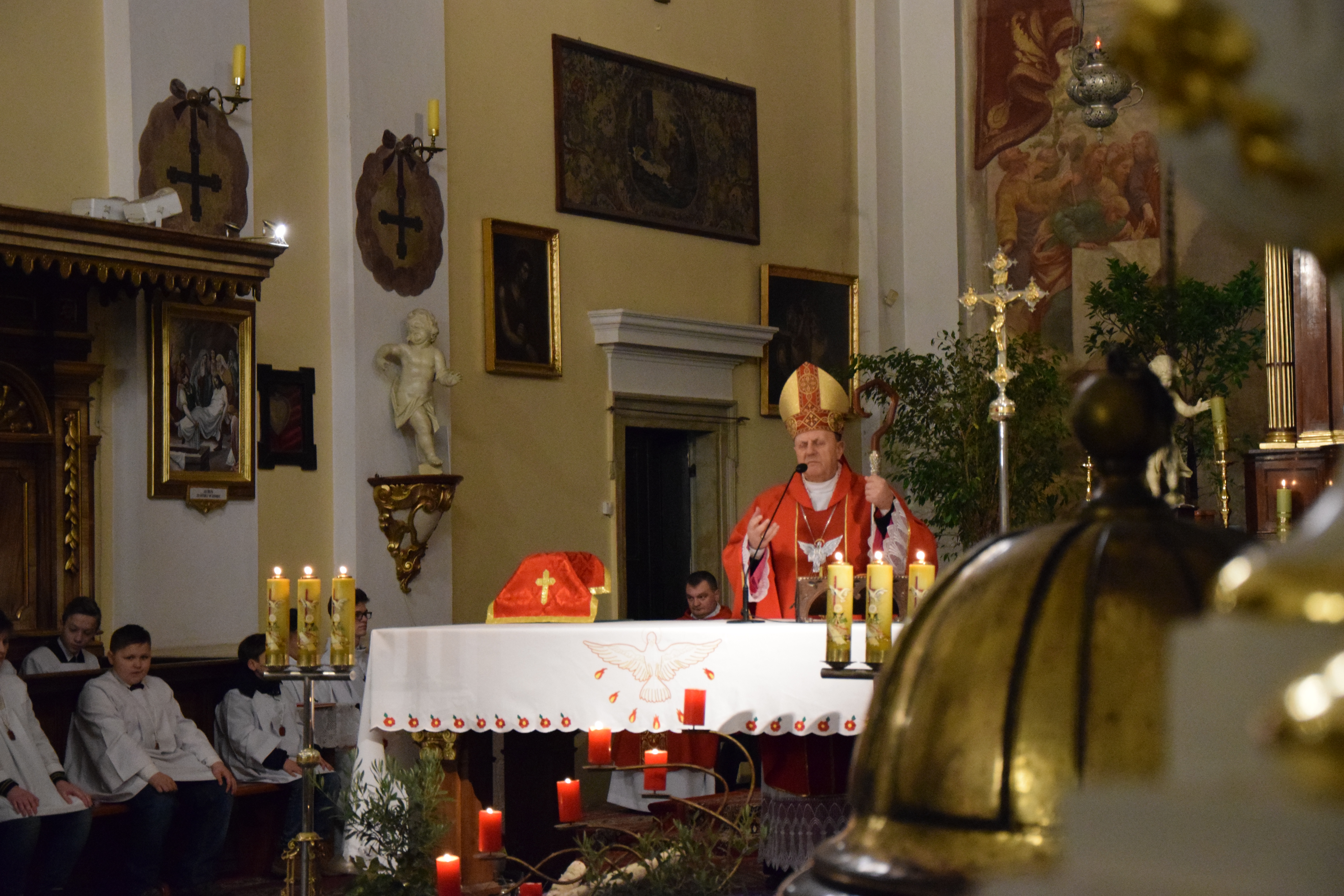 Ks. Bp Tadeusz Pikus w swoim słowie pasterskim skierowanym do młodzieży przytoczył słowa św. Pawła, który podaje warunki konieczne do zbawienia człowieka: „jeśli ustami swoimi wyznasz, że Jezus jest Panem i w sercu swoim uwierzysz, że Bóg go wskrzesił, będziesz zbawiony”. Cytując Pismo św., Ks. Biskup wskazał, iż „nikt bez pomocy Ducha Świętego nie może powiedzieć: Panem jest Jezus”. Wytłumaczył przez to, jak wielkie znaczenie w życiu każdego chrześcijanina odgrywa prawda wypowiadanego słowa, prawda serca, prawda myśli. I aby nie zatracić tej prawdy o Jezusie Chrystusie potrzebna jest moc Ducha Świętego, który daje odwagę i męstwo do przezwyciężania największych przeszkód oraz lęku przed wyznaniem wiary w Zbawiciela. Pasterz przywołał biblijną scenę zesłania Ducha Św. na Apostołów, którzy pod Jego natchnieniem otworzyli drzwi Wieczernika, aby głosić Dobrą Nowinę o Zmartwychwstaniu. Na koniec homilii Ks. Biskup podsumował, że dlatego Sakrament Bierzmowania jest tak bardzo ważny, ponieważ nie da się poznać Ducha Świętego bez posiadania Go w swoim sercu.