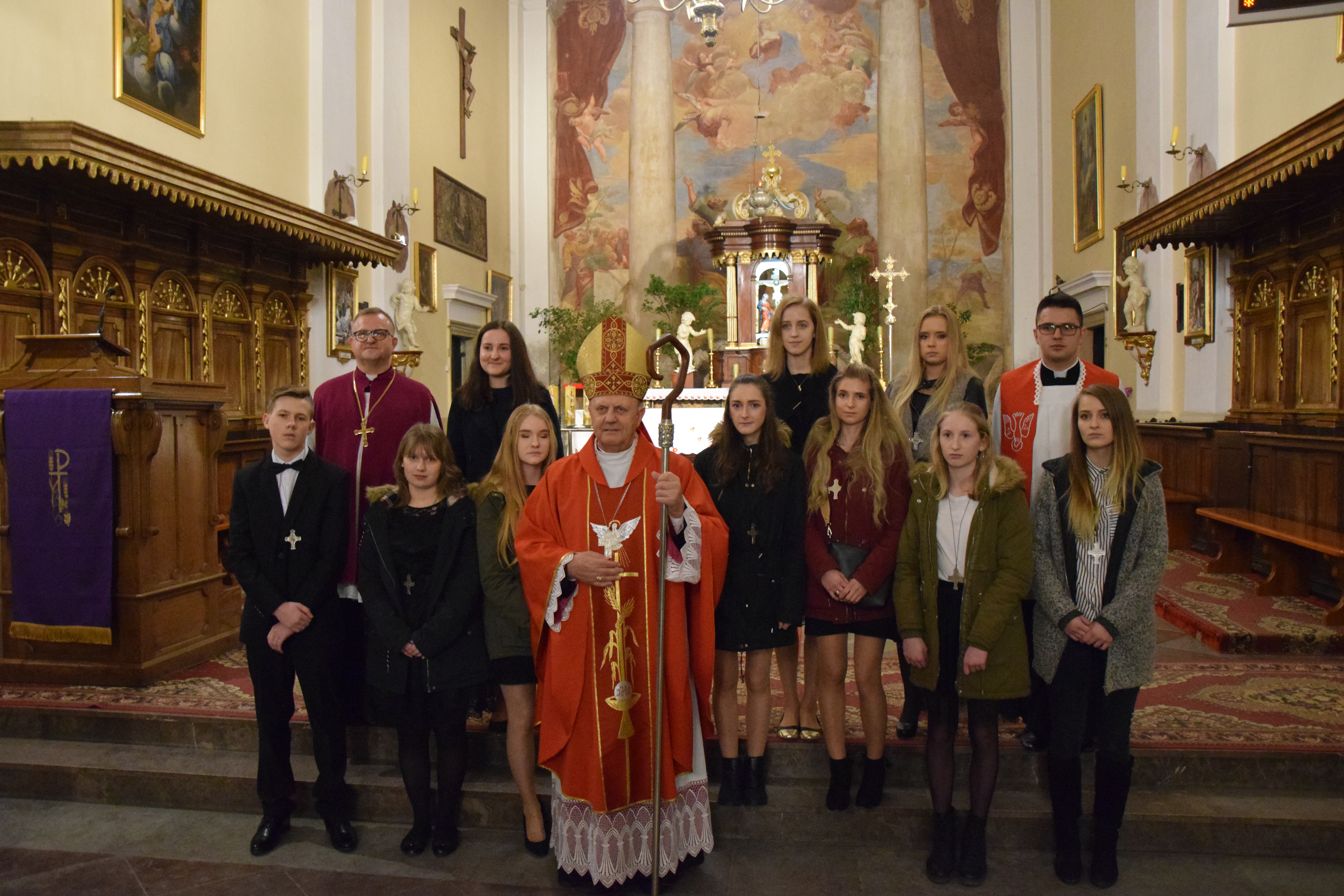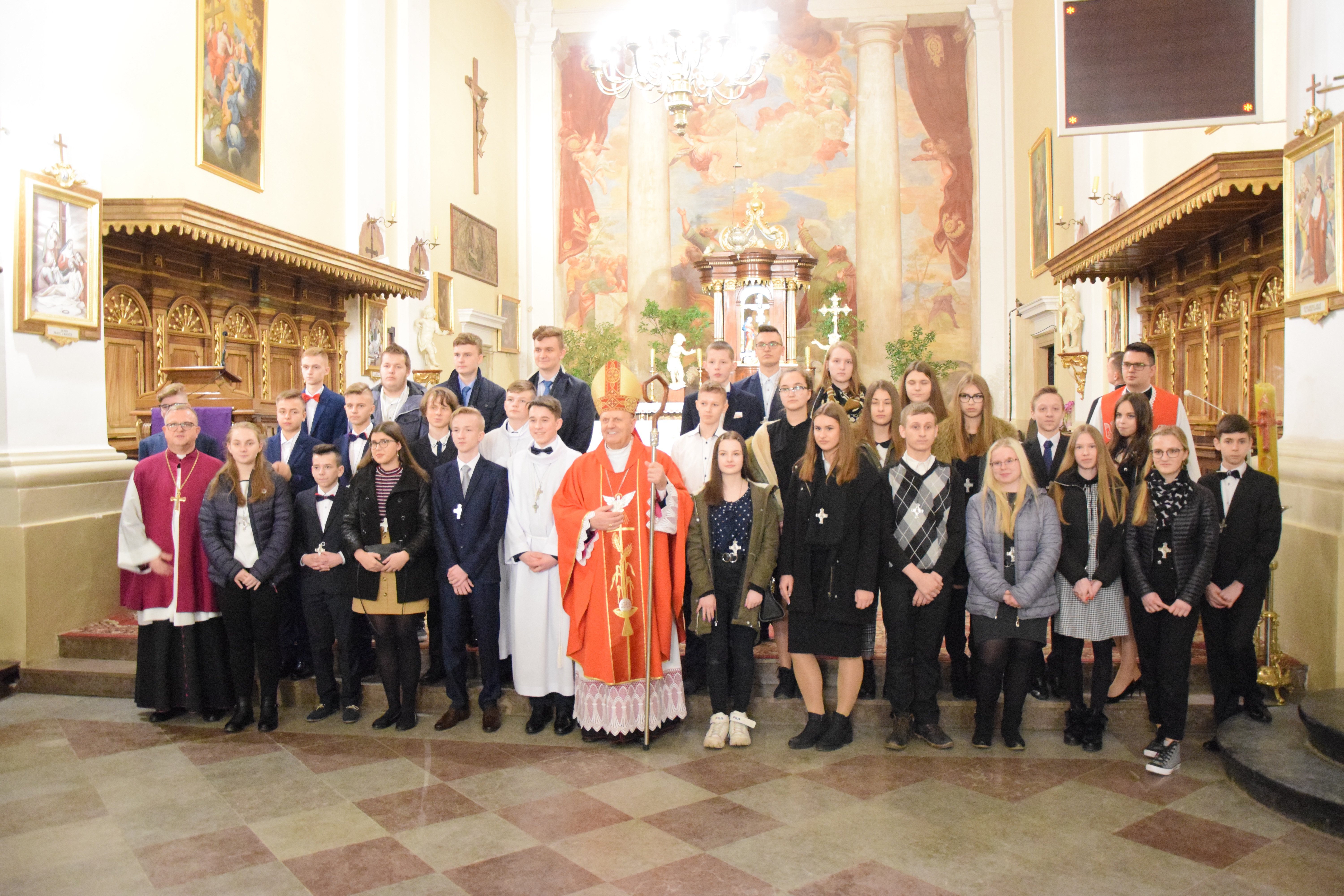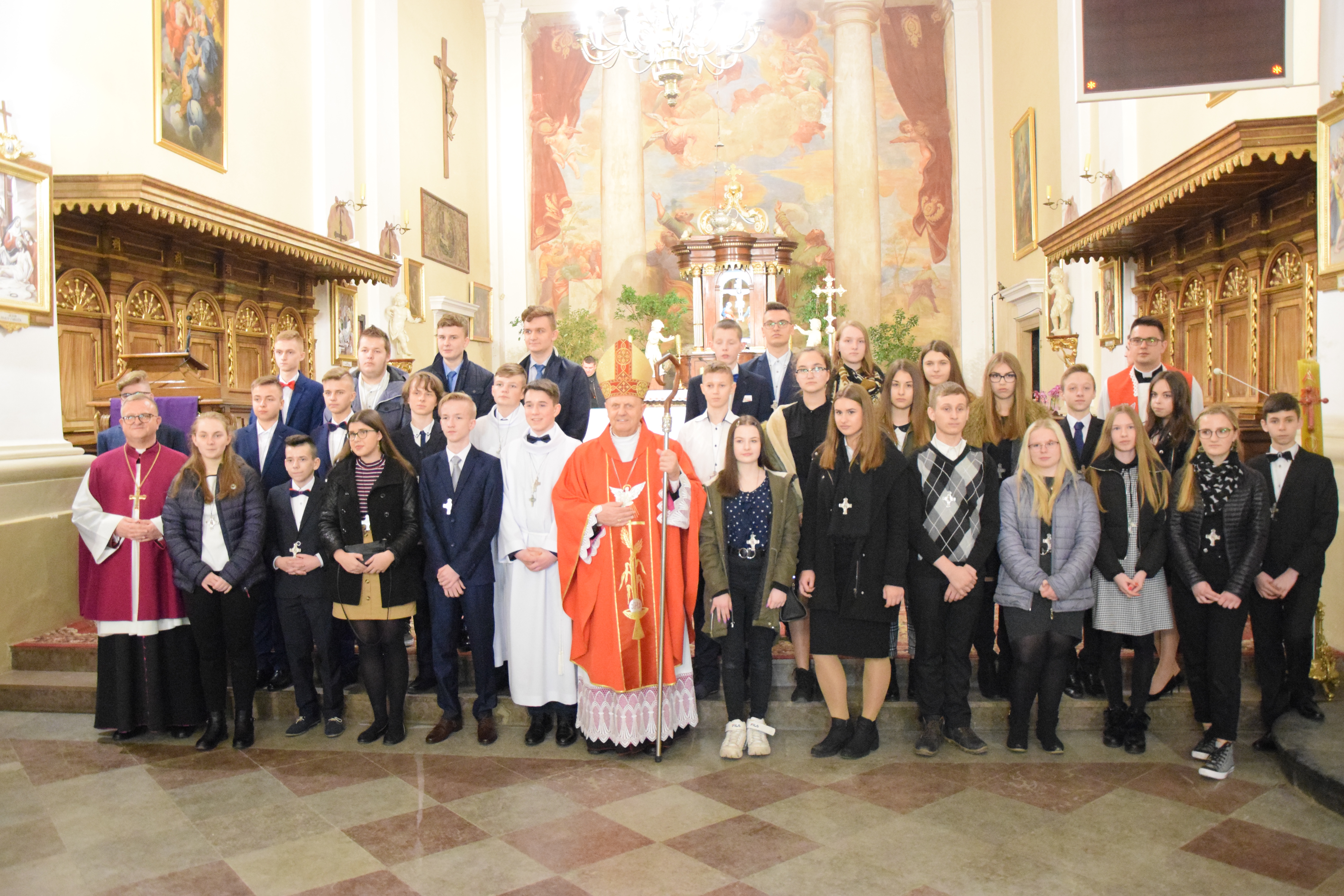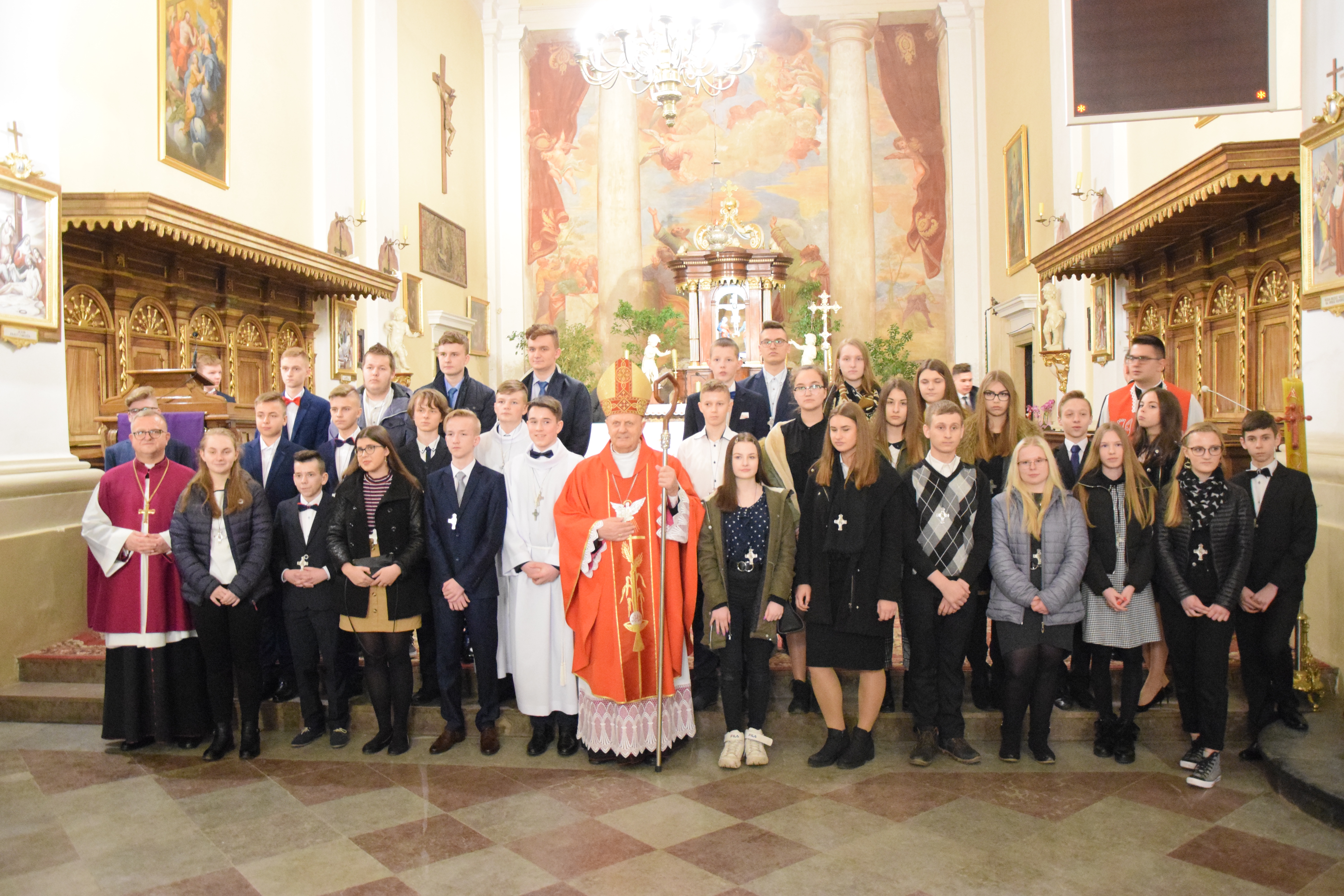 Po skończonej Mszy Świętej i błogosławieństwie pasterskim wszyscy zostali uwiecznieni na pamiątkowych fotografiach grupowych z J. E. Ks. Biskupem Tadeuszem Pikusem, ks. prał. Leszkiem Gardzińskim, proboszczem Bazyliki Mniejszej w Węgrowie oraz ks. mgr Grzegorzem Konopackim, wikariuszem miejscowym i opiekunem młodzieży, która tego roku przystąpiła do Sakramentu Bierzmowania.