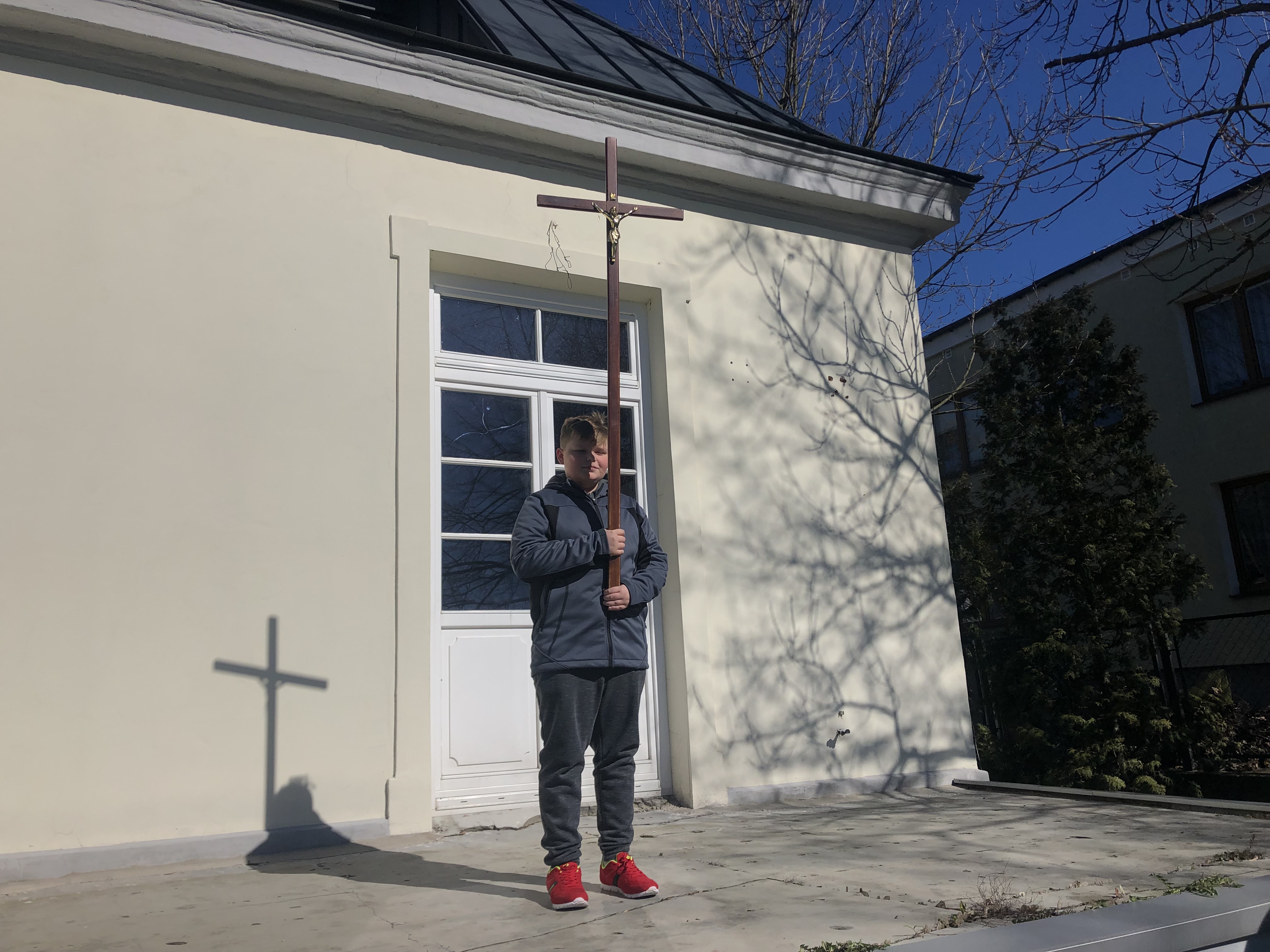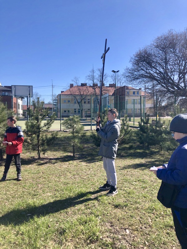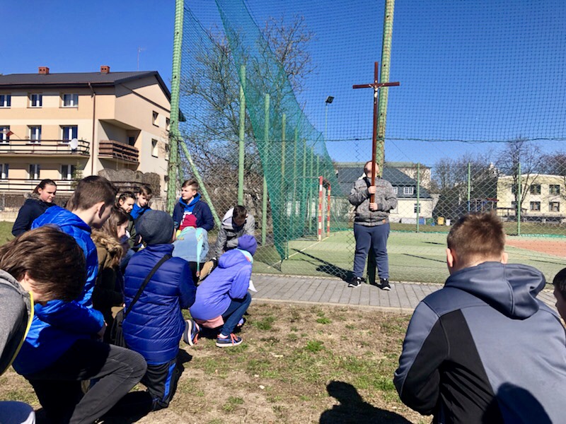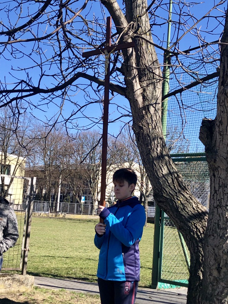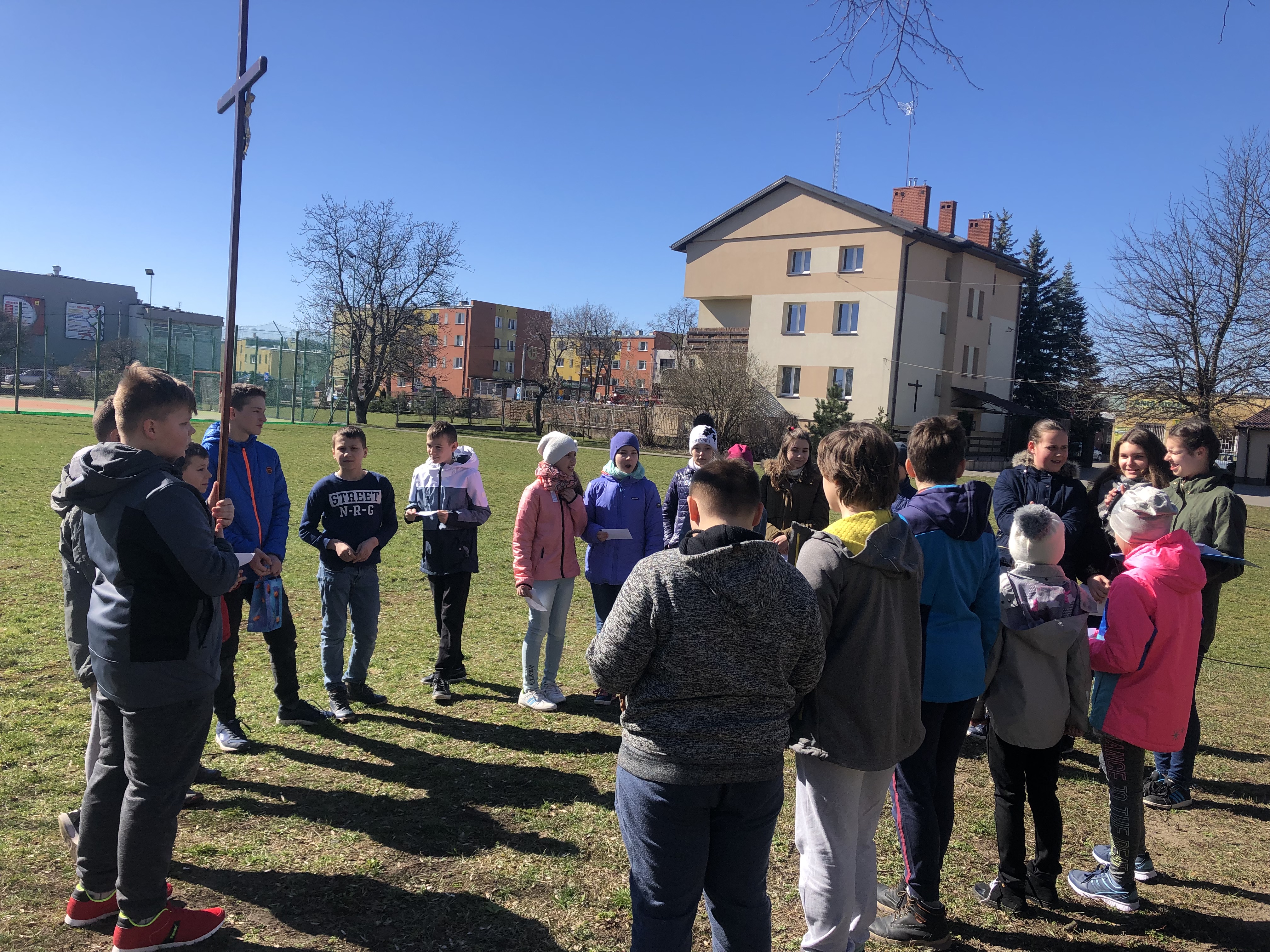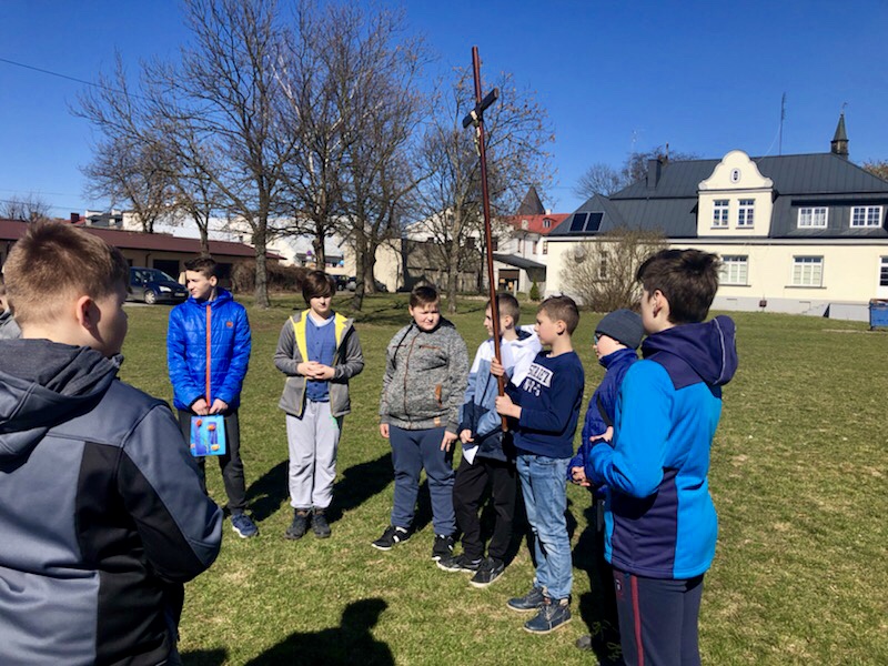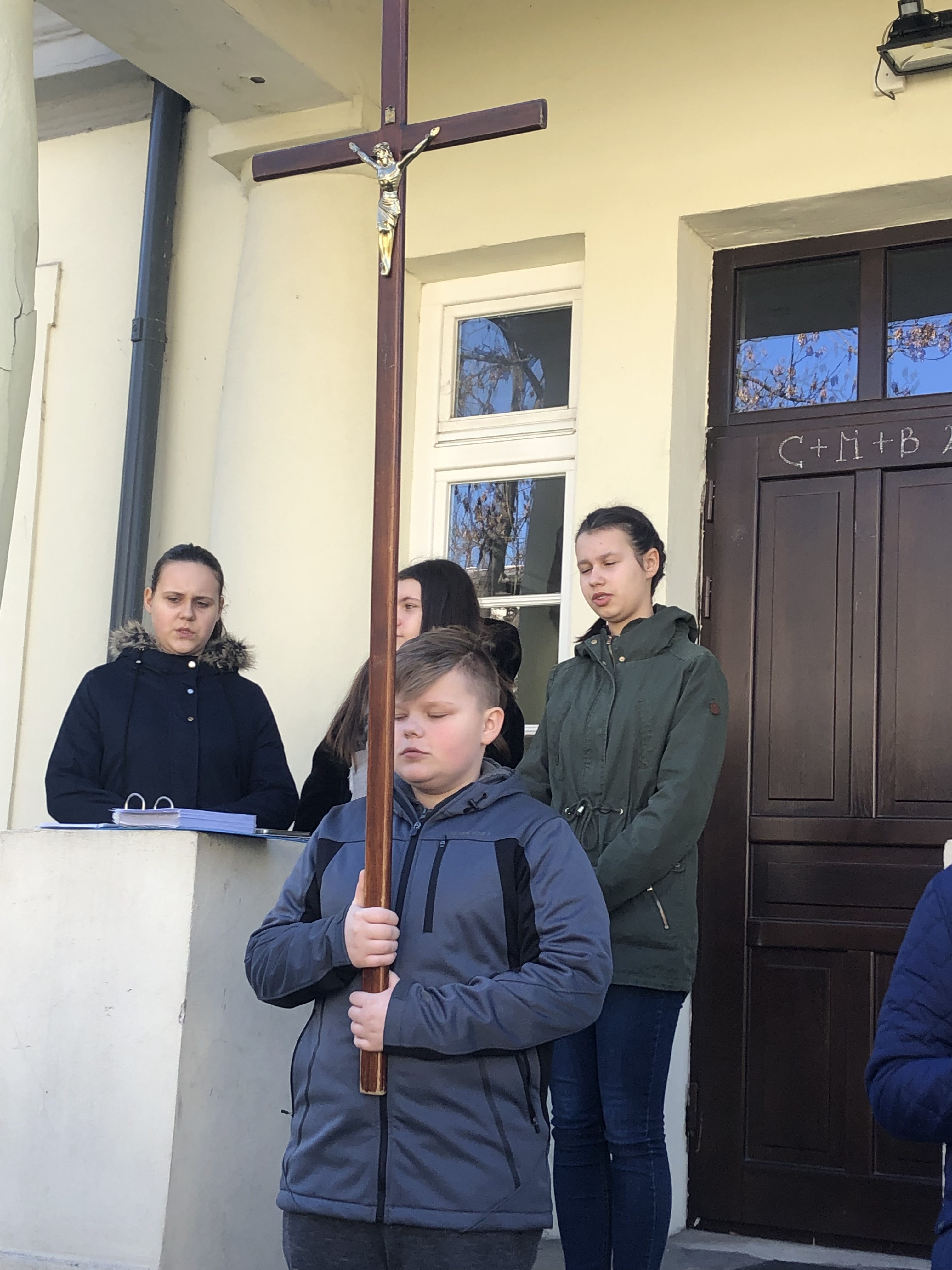 Fotorelacja z plenerowej Drogi Krzyżowej, zorganizowanej przez ks. Grzegorza Konopackiego w sobotę, 30 marca 2019 r., o godz. 10:00, na placu przy budynkach parafialnych, w której uczestniczyły dzieci i młodzież z oazy, scholi parafialnej oraz ministranci.