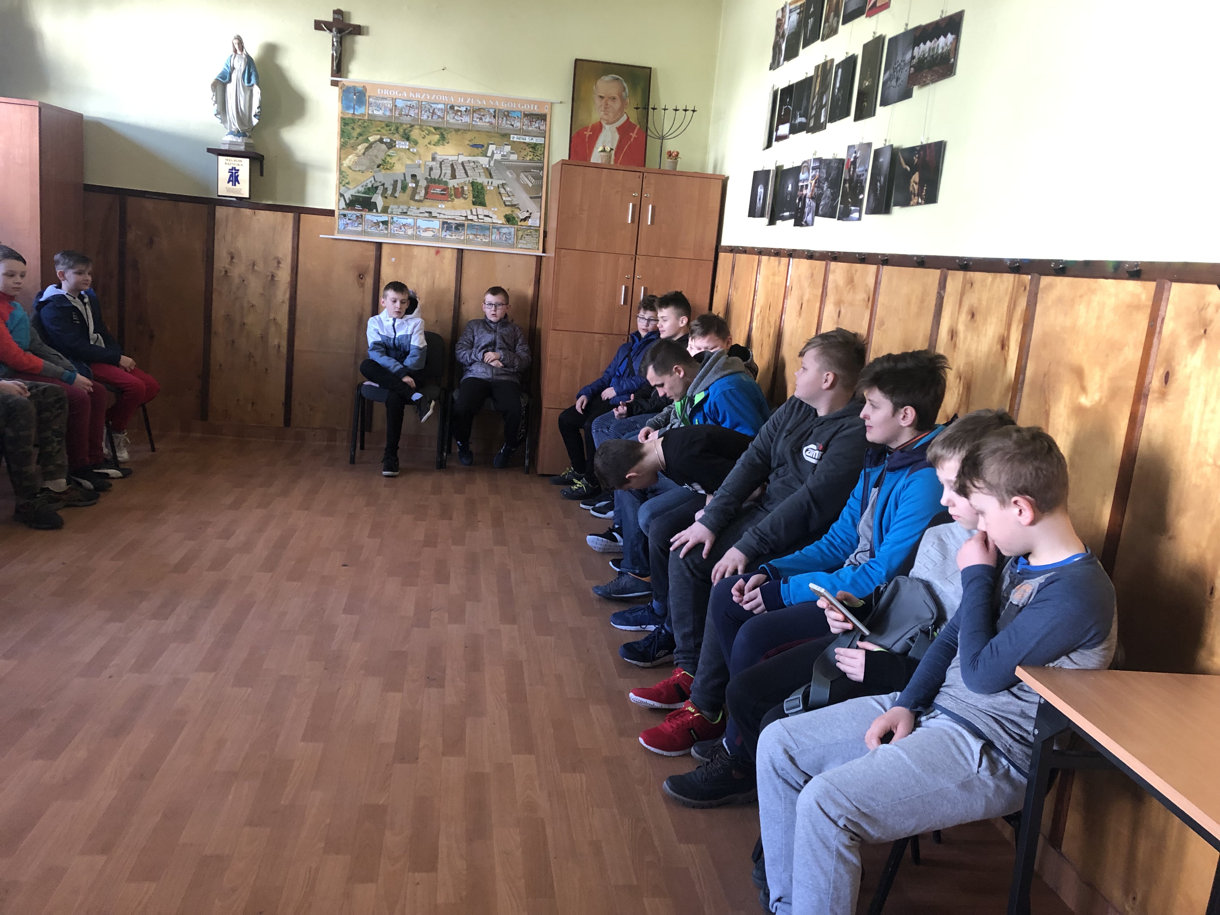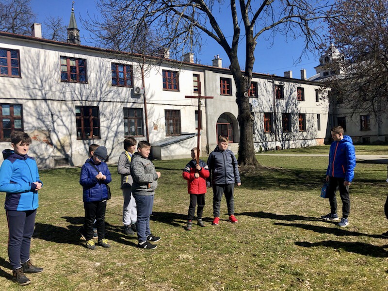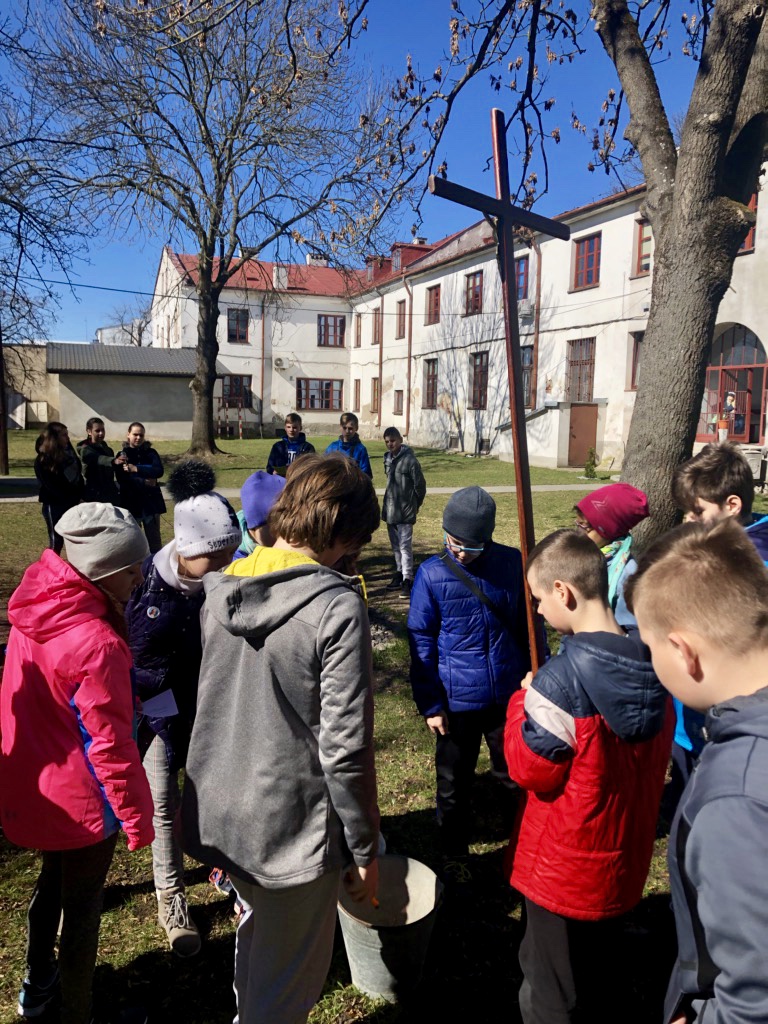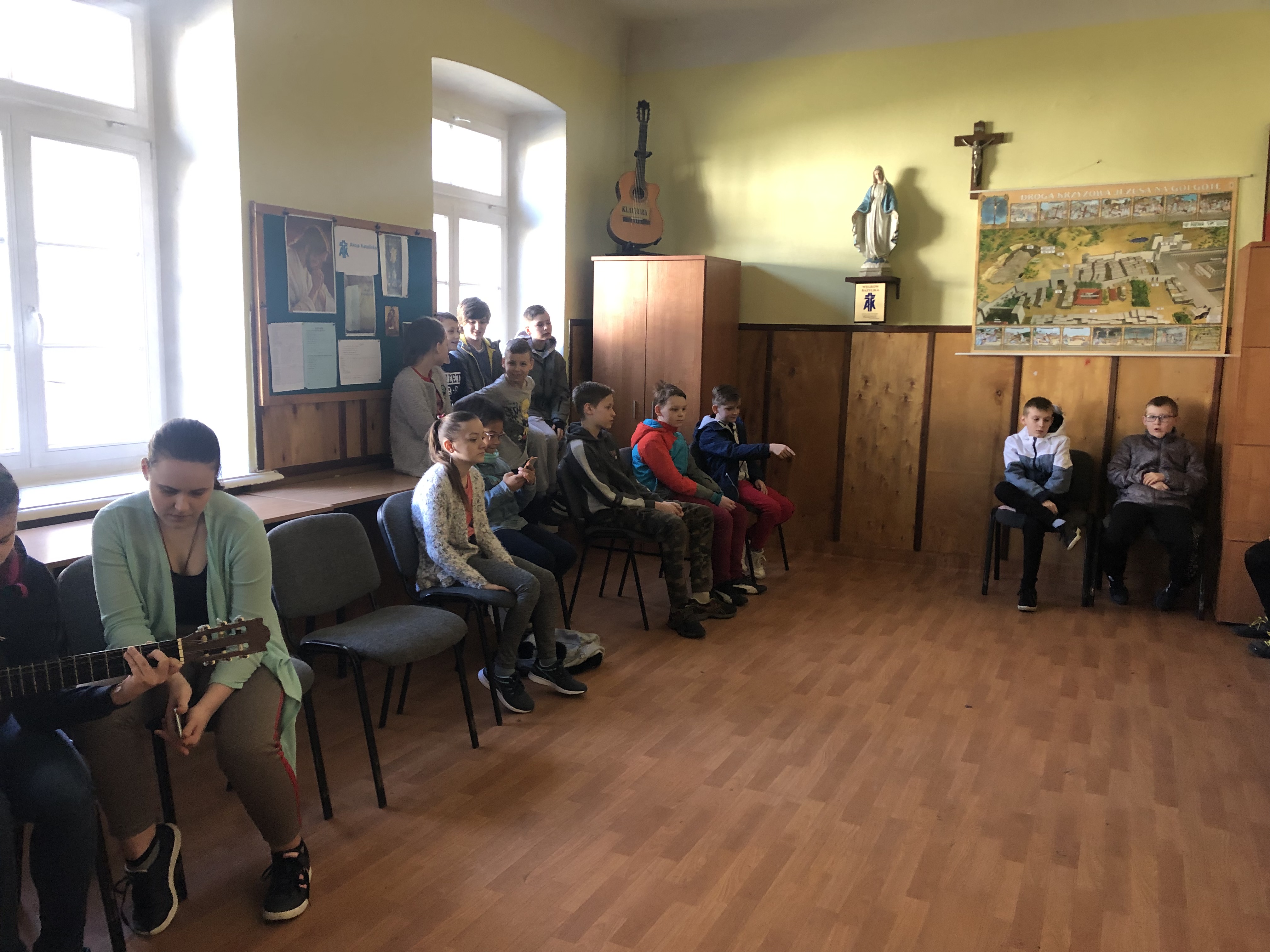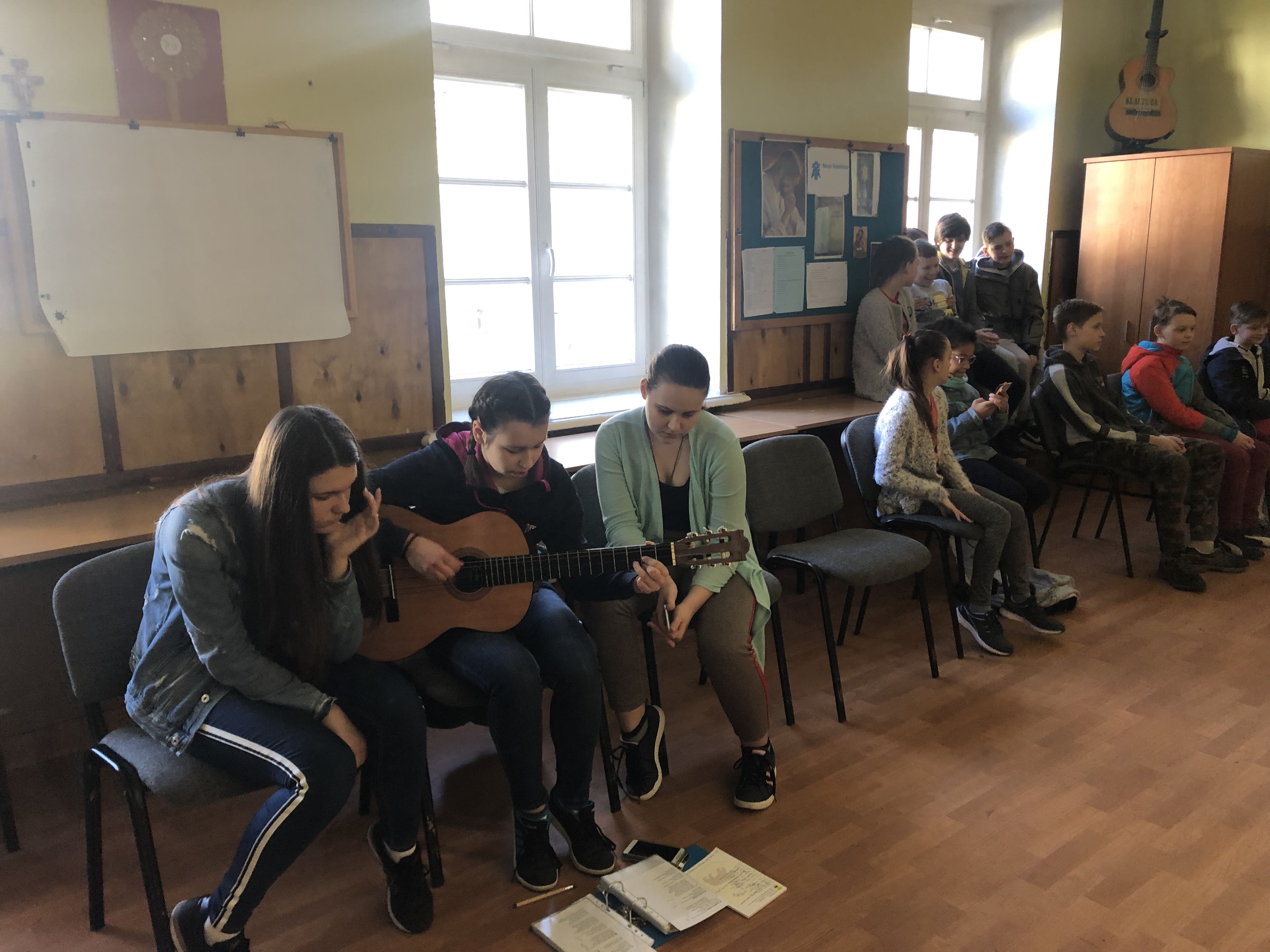Fotorelacja z plenerowej Drogi Krzyżowej, zorganizowanej przez ks. Grzegorza Konopackiego w sobotę, 30 marca 2019 r., o godz. 10:00, na placu przy budynkach parafialnych, w której uczestniczyły dzieci i młodzież z oazy, scholi parafialnej oraz ministranci.