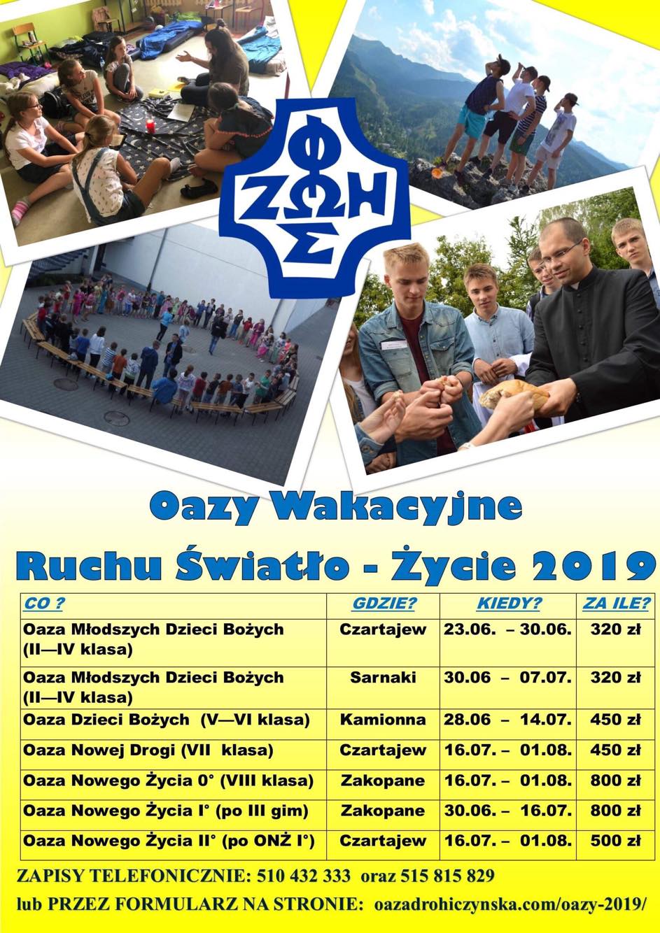 Oazy Wakacyjne Ruchu Światło-Życie 2019 przez Jakub Plas / 6 lat temu Serdecznie i gorąco zapraszamy na zapisy!!! 🙂 Więcej informacji dostępnych na stronie internetowej, w zakrystii naszej parafii oraz u ks. Grzegorza Konopackiego. http://www.oazadrohiczynska.com/oazy-2019/