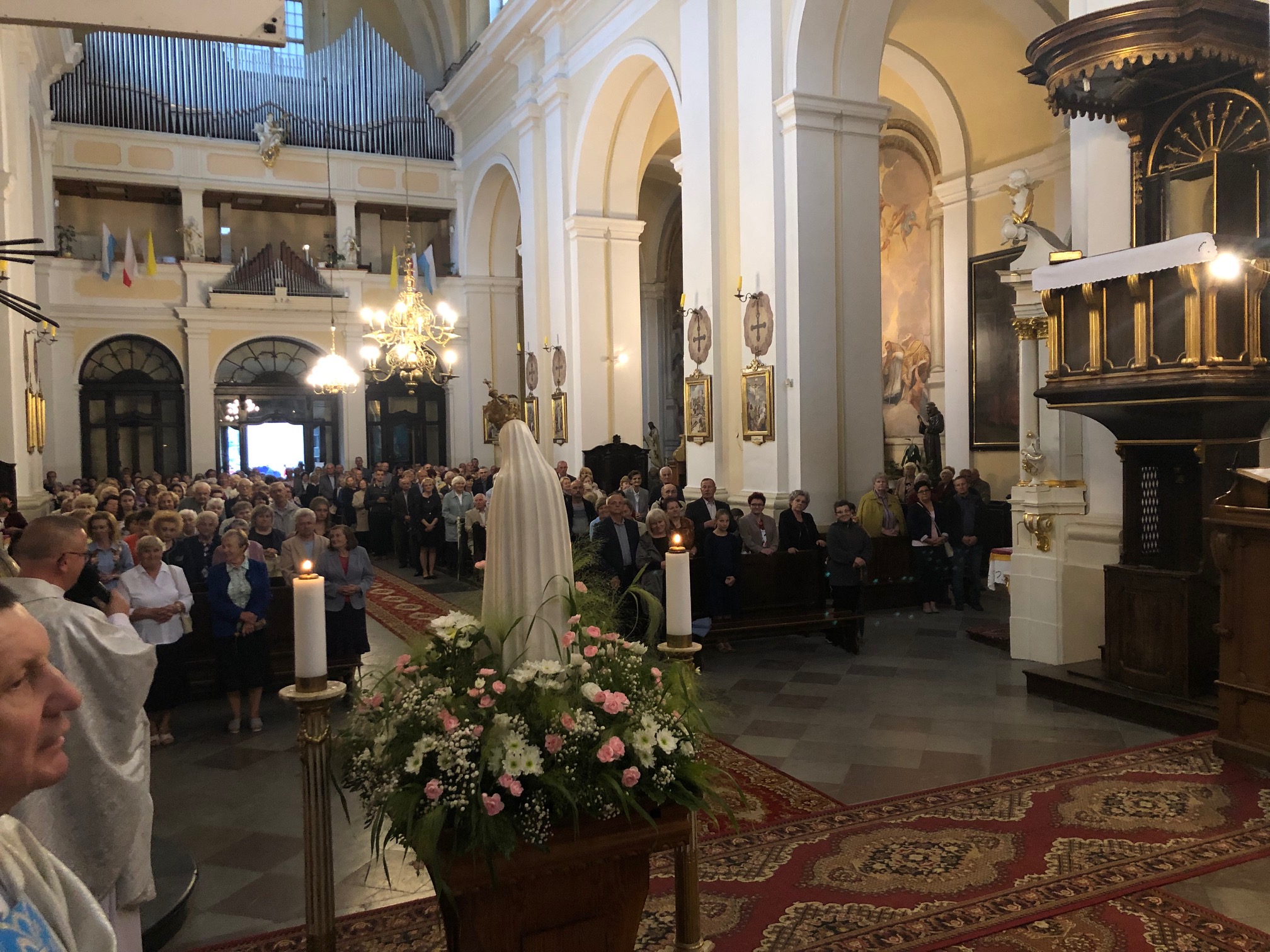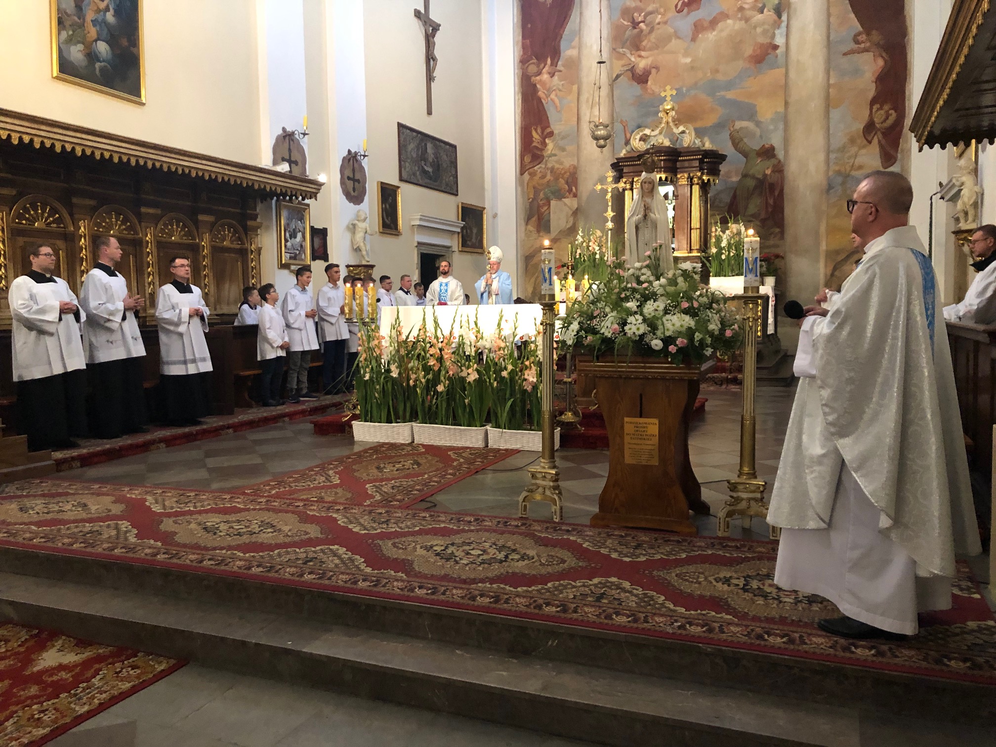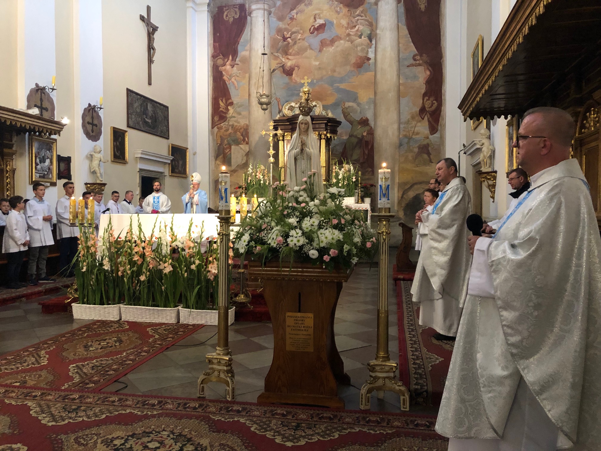 O godz. 17:30 rozpoczęło się czytanie próśb i podziękowań, kierowanych do Jezusa Chrystusa obecnego pod postacią Chleba, przez wstawiennictwo Matki Bożej Fatimskiej. Ta krótka Adoracja Najświętszego Sakramentu zakończyła się odczytaniem Litanii Loretańskiej i błogosławieństwem. Podczas uroczystej Mszy św. o godz. 18:00 ks. prał. Leszek Gardziński wprowadzając w liturgię powiedział o kolejnym tym roku nabożeństwie fatimskim i wskazał na szczególną intencję modlitwy za Jubilata ks. Biskupa Antoniego Dydycza, który 25 lat temu 10 lipcaprzyjął sakrę biskupią. Ponadto ks. Proboszcz powiedział, że „węgrowska fara staraniem Ks. Bpa Antoniego Dydycza, podczas pełnienia posługi Ordynariusza Diecezji Drohiczyńskiej w 1997 r. (oficjalnie 2 lata później) została podniesiona do rangi Bazyliki Mniejszej. Ponadto Ekscelencja ustanowił tę świątynię Sanktuarium Matki Bożej Fatimskiej na prawach diecezjalnych. Przy Bazylice Mniejszej mieści się także Kolegiacka Kapituła Węgrowska. Dziesiątki razy ks. Biskup przewodniczył uroczystościom religijnym i patriotycznym głosząc Słowo Boże”.