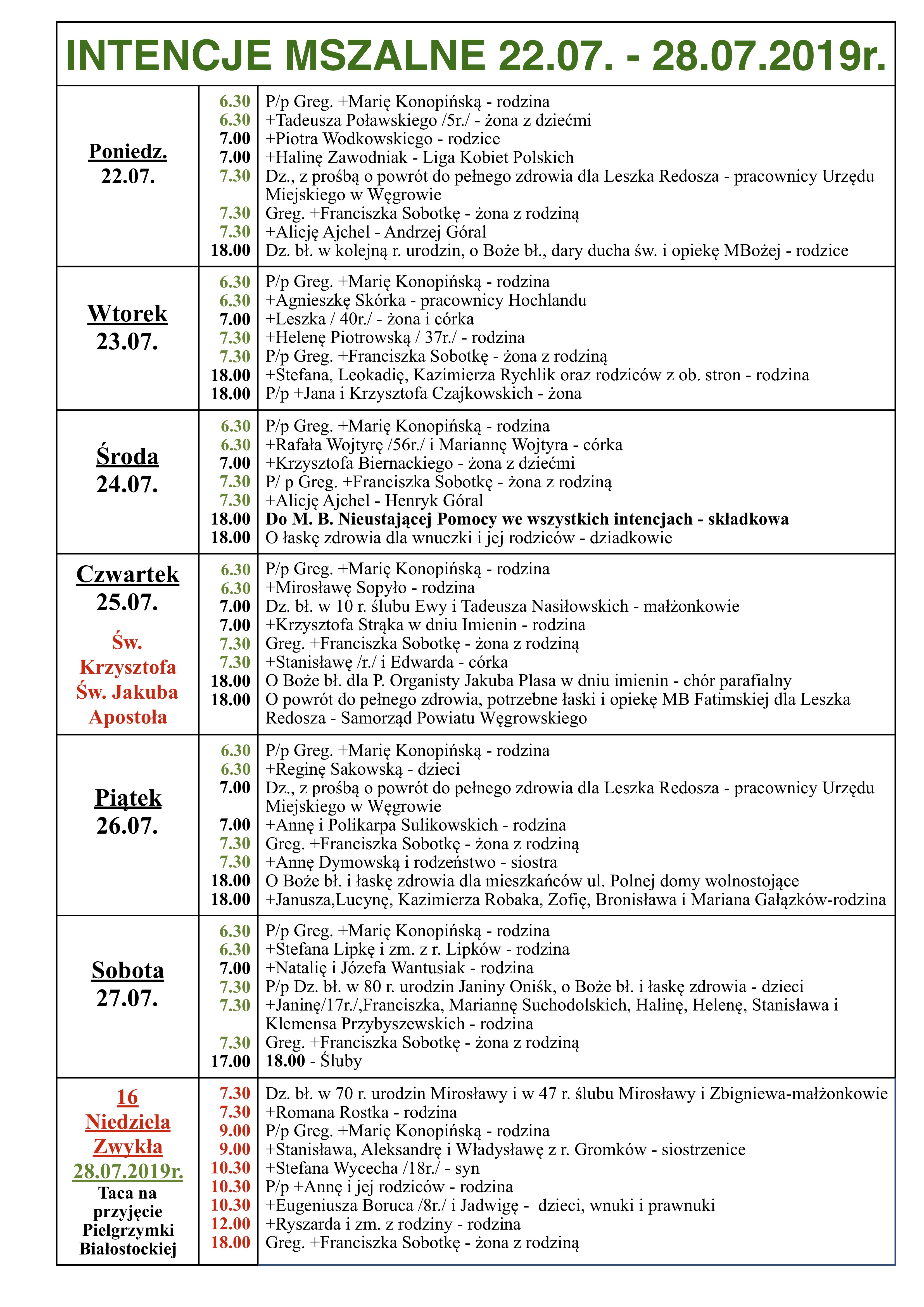 INTENCJE MSZALNE 22.07. – 28.07.2019r.