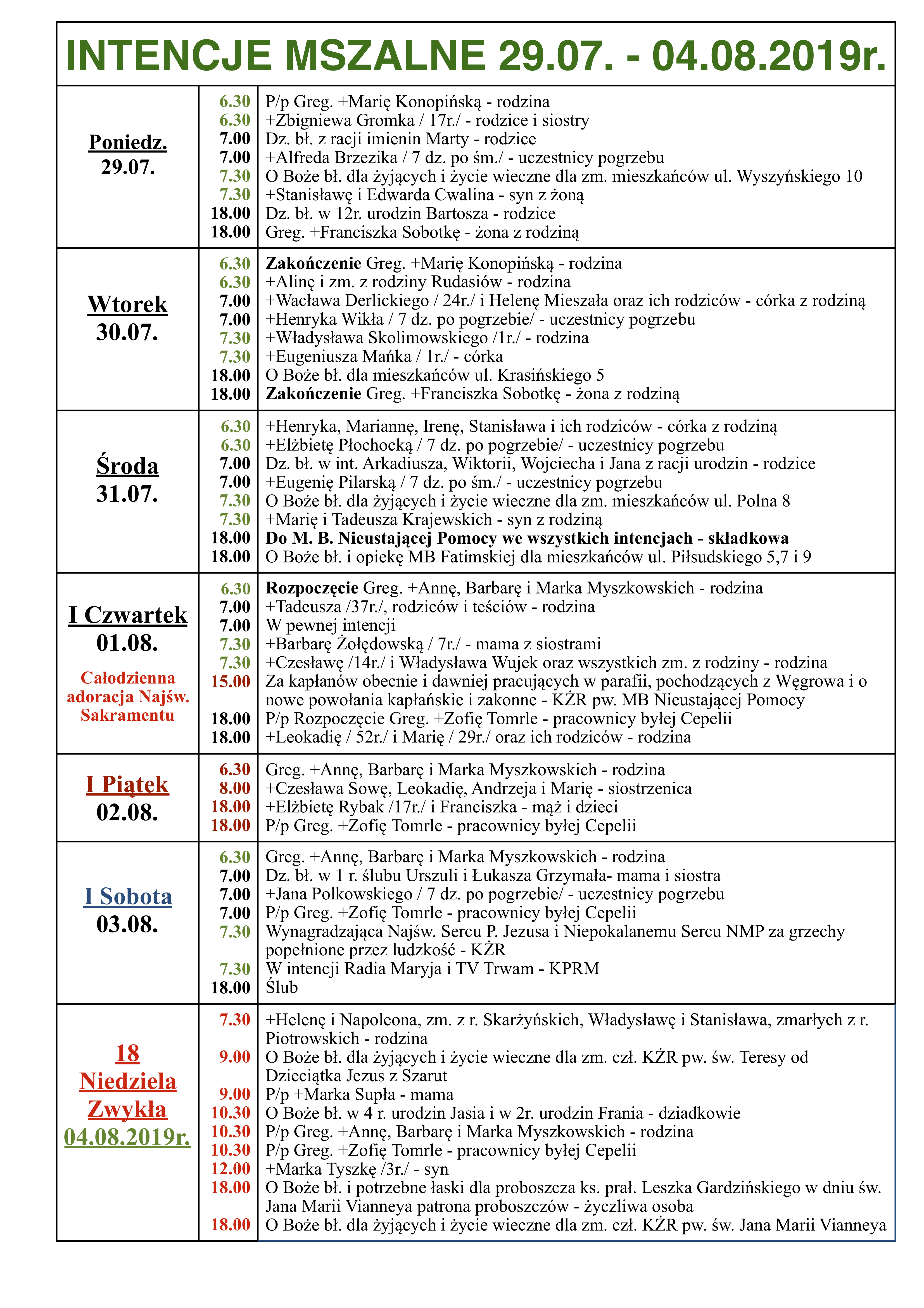 INTENCJE MSZALNE 29.07. – 04.08.2019r.