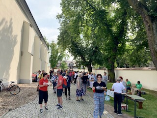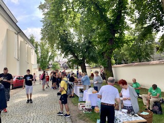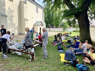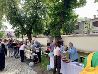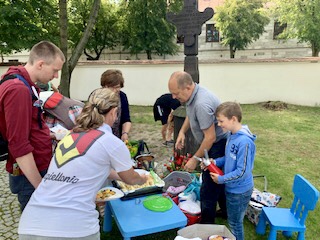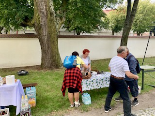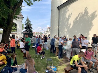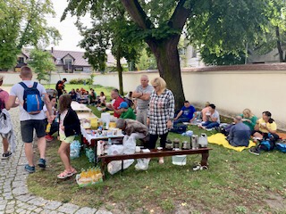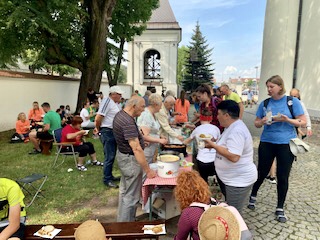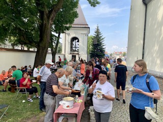 Na placu wokół kościoła pielgrzymi mogli odpocząć i nabrać sił na dalszą drogę, zaś w ciszy wnętrza świątyni spokojnie pomodlić się. Naturalnie, nie zabrakło też strawy dla ciała, a to dzięki uprzejmości parafian, którzy przygotowali ciepły posiłek, słodkie przekąski, zimne napoje, oranżadę i wodę.