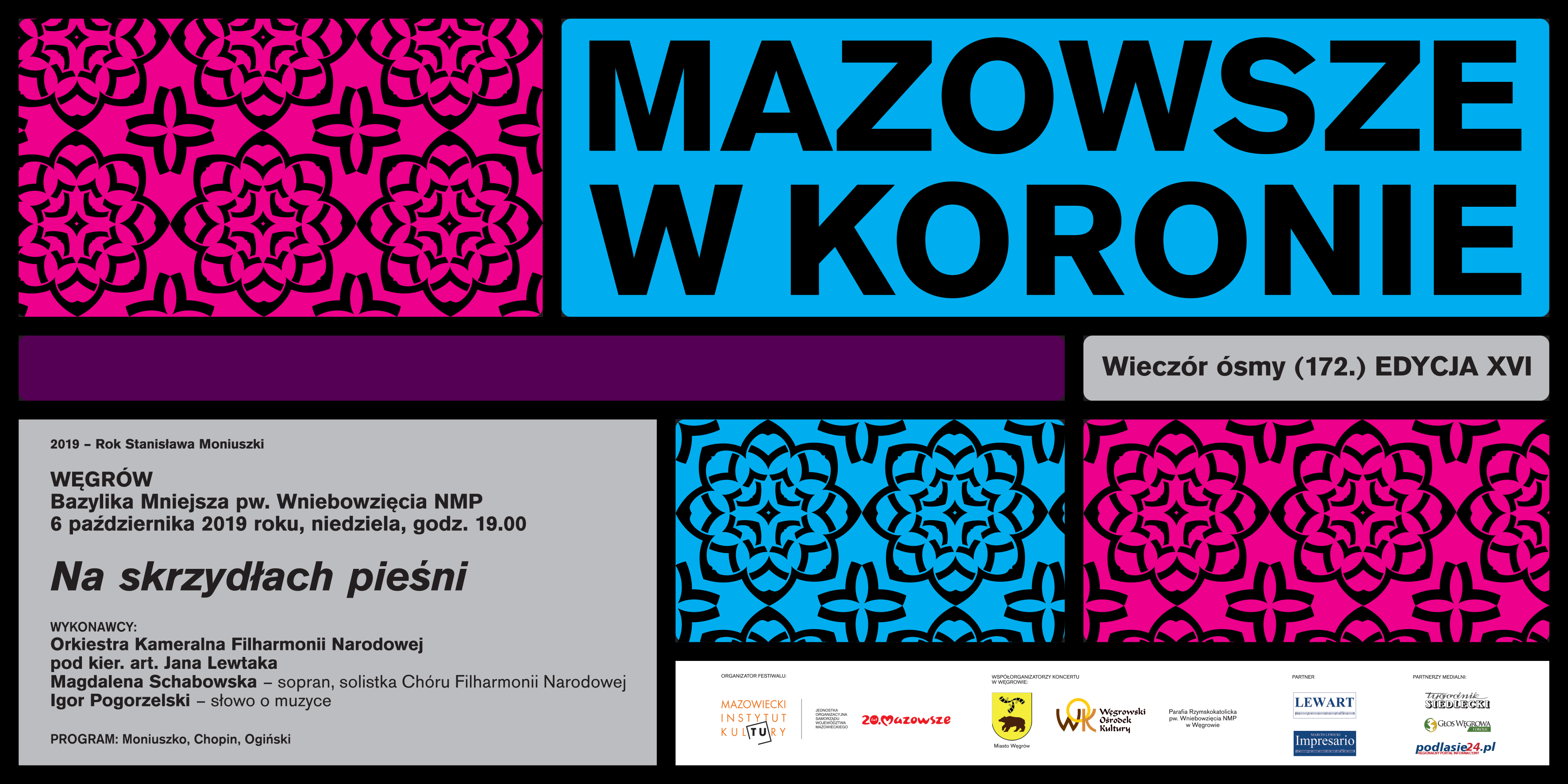 Serdecznie i gorąco zapraszamy na koncert z cyklu „MAZOWSZE W KORONIE”, zatytułowany „Na skrzydłach pieśni”, który odbędzie się w Niedzielę, 6 października 2019 r. o godz. 19:00 w naszej Węgrowskiej Bazylice.