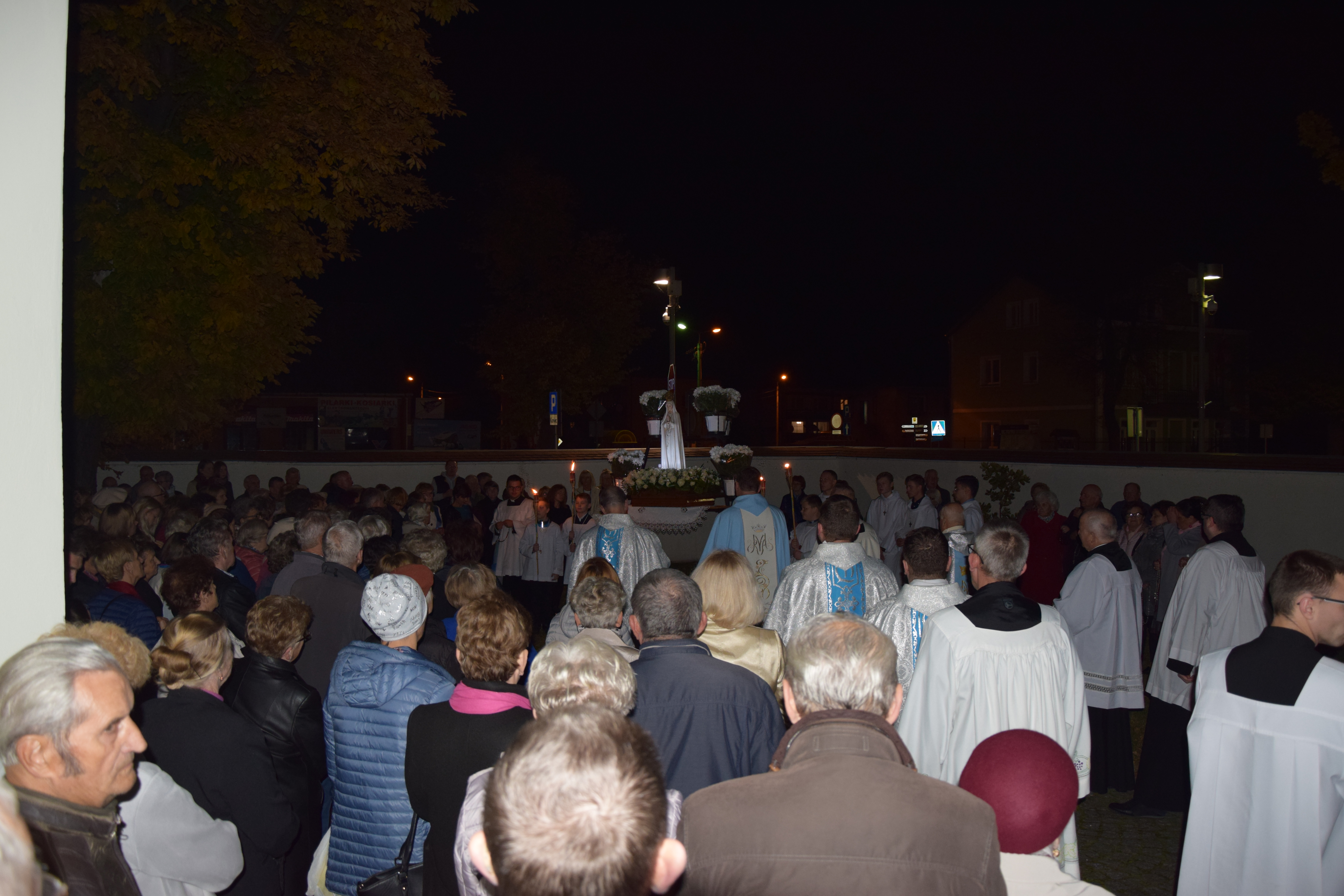 Piękna pogoda i złote słońce jesieni sprzyjało kontemplacji kolejnych chwalebnych tajemnic Różańca Świętego. Zaproszony ksiądz-gość przygotował i wygłosił głębokie w treści misyjne rozważania. Płomienna i gorliwa modlitwa licznie zgromadzonych wiernych z Węgrowa i okolic dawała o sobie znać poprzez gromkie odmawianie kolejnych „zdrowasiek”. Parafialne Koła Żywego i Nieustającego Różańca udekorowały ołtarze oraz figurę Matki Bożej pięknymi kwiatami. Ten zewnętrzny element jakim są kwiaty, to też wyraz wdzięczności Pani Fatimskiej za wyproszone łaski i nieustanne wstawiennictwo u Boga.