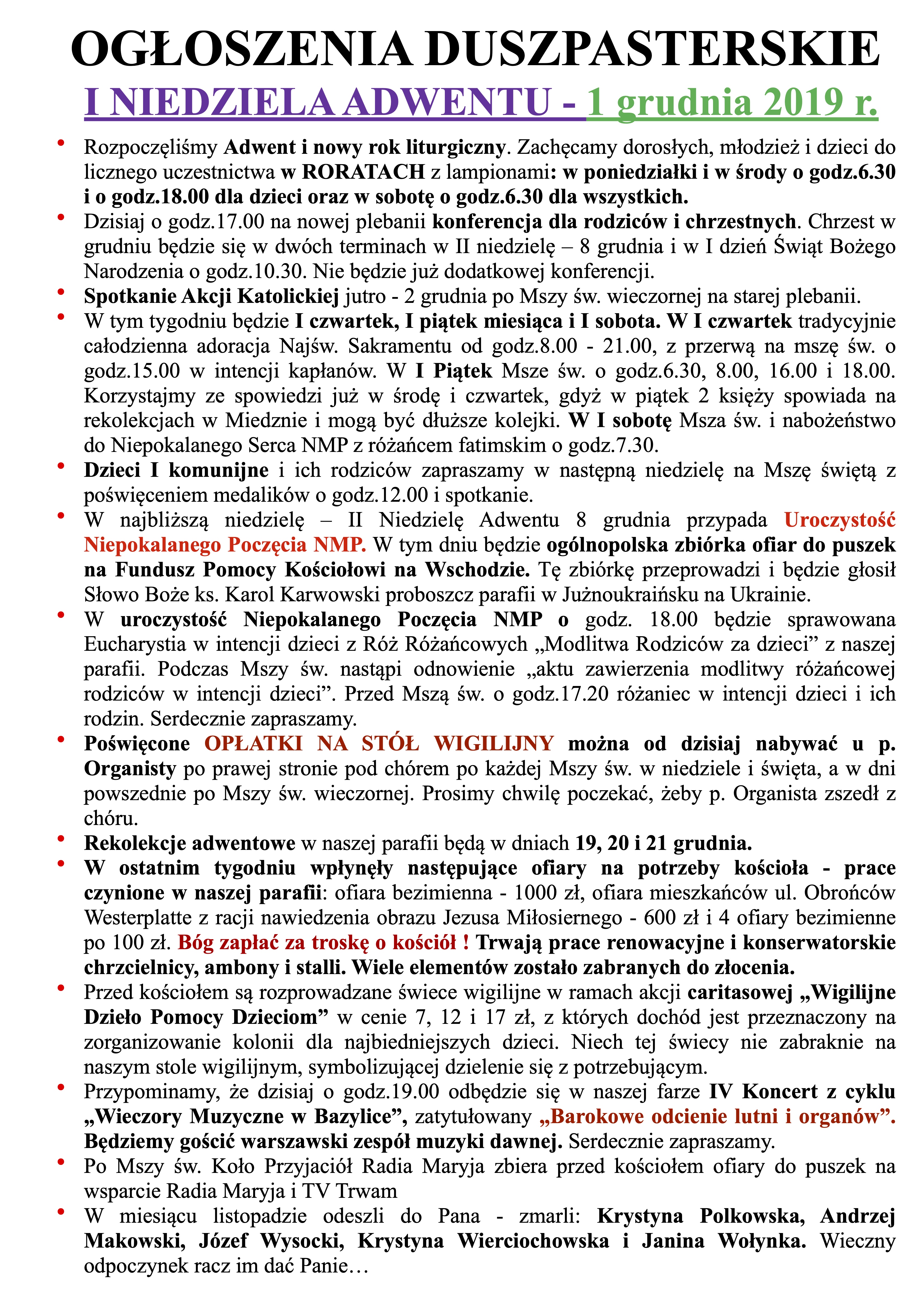 OGŁOSZENIA DUSZPASTERSKIE I NIEDZIELA ADWENTU – 1 grudnia 2019 r.