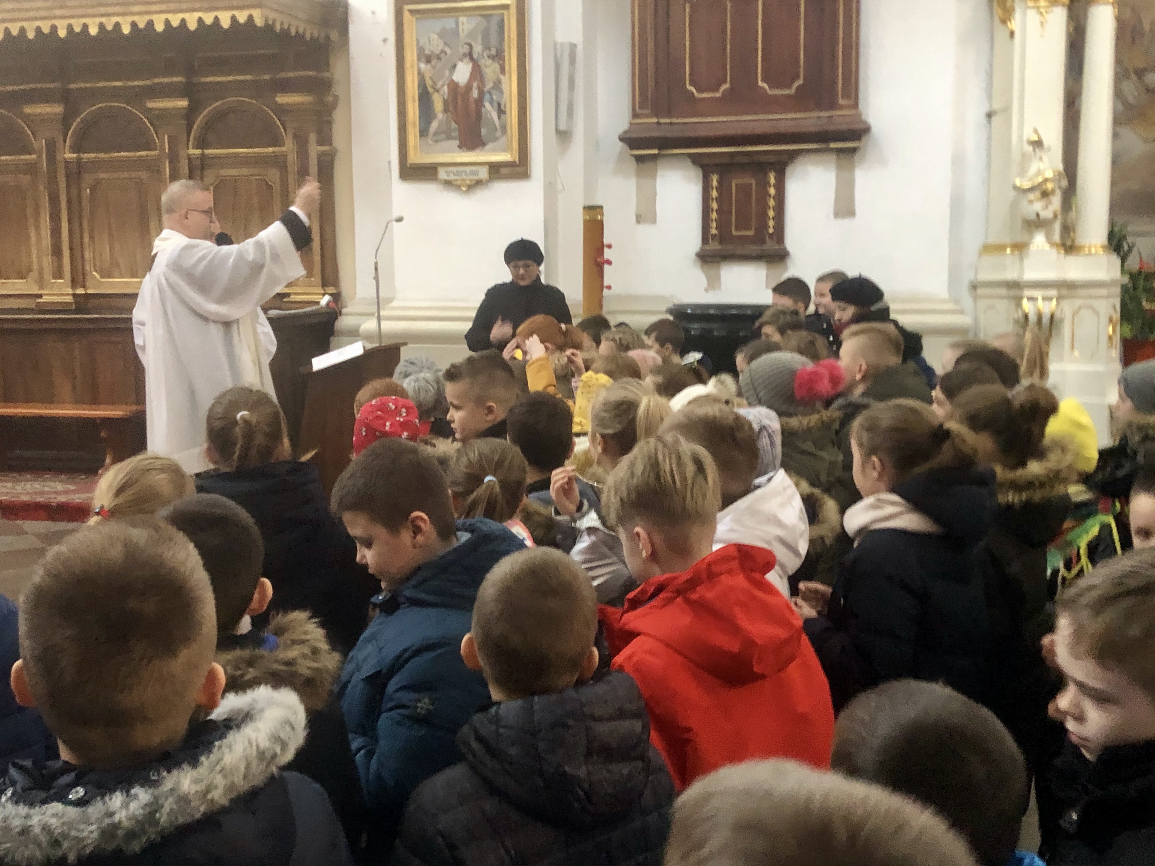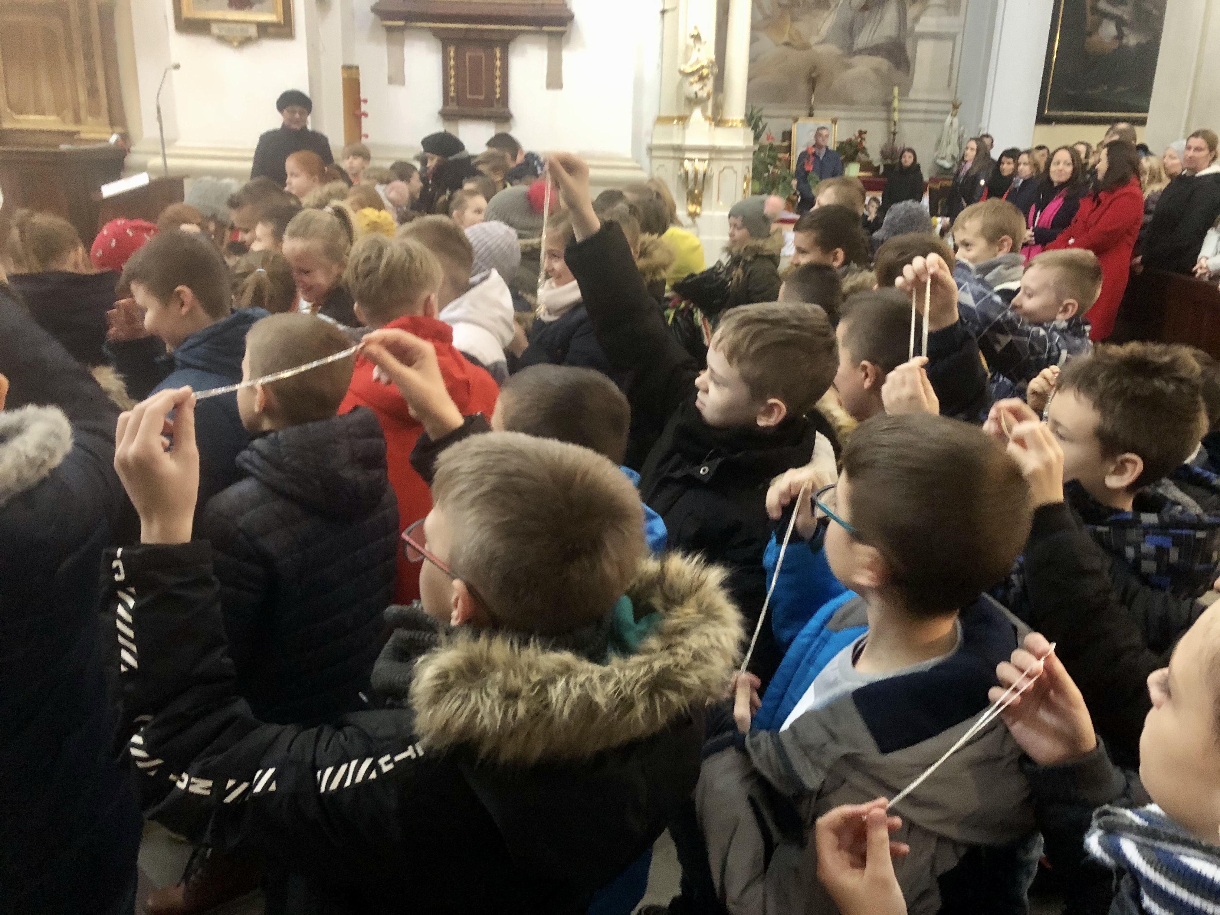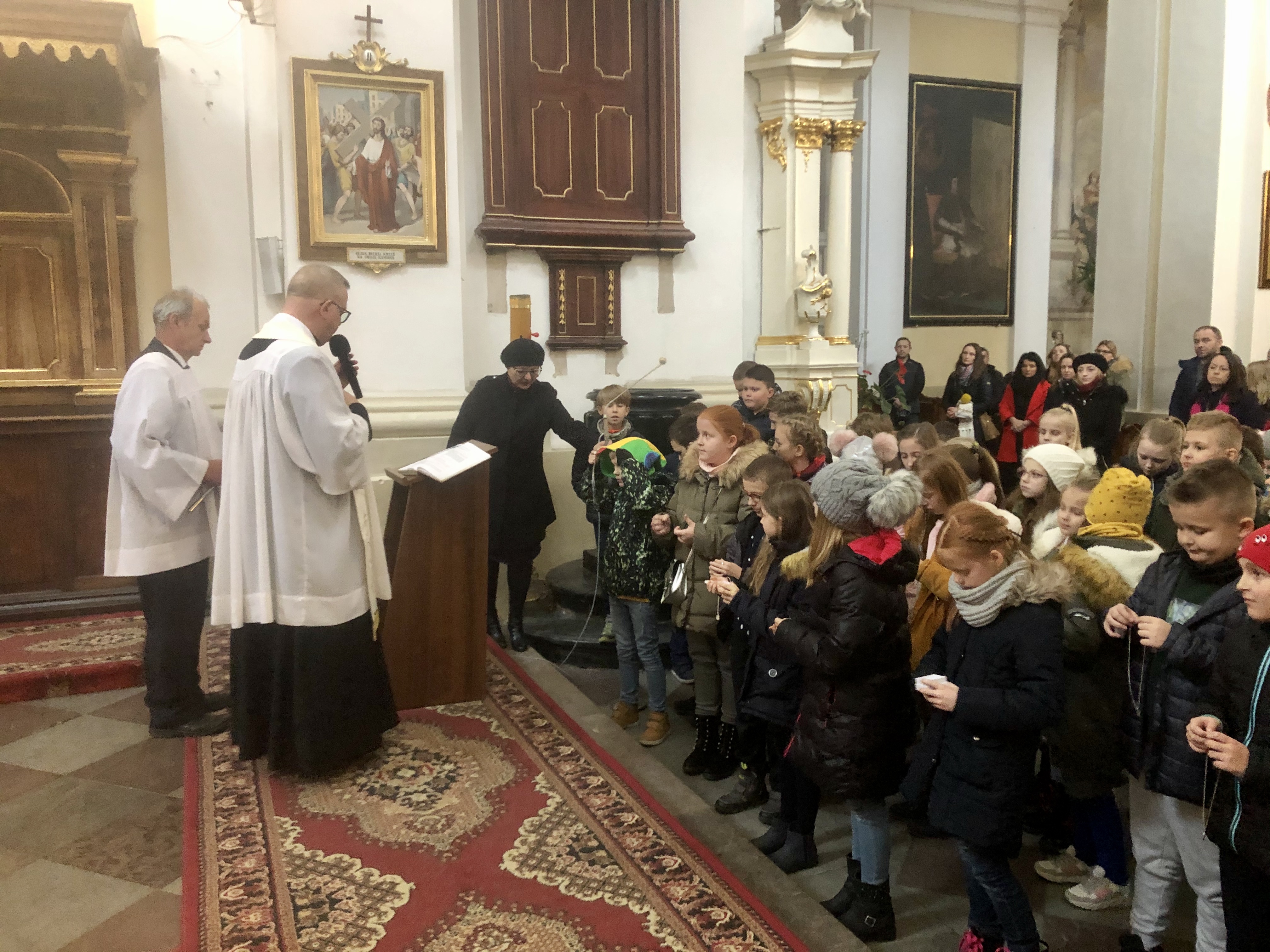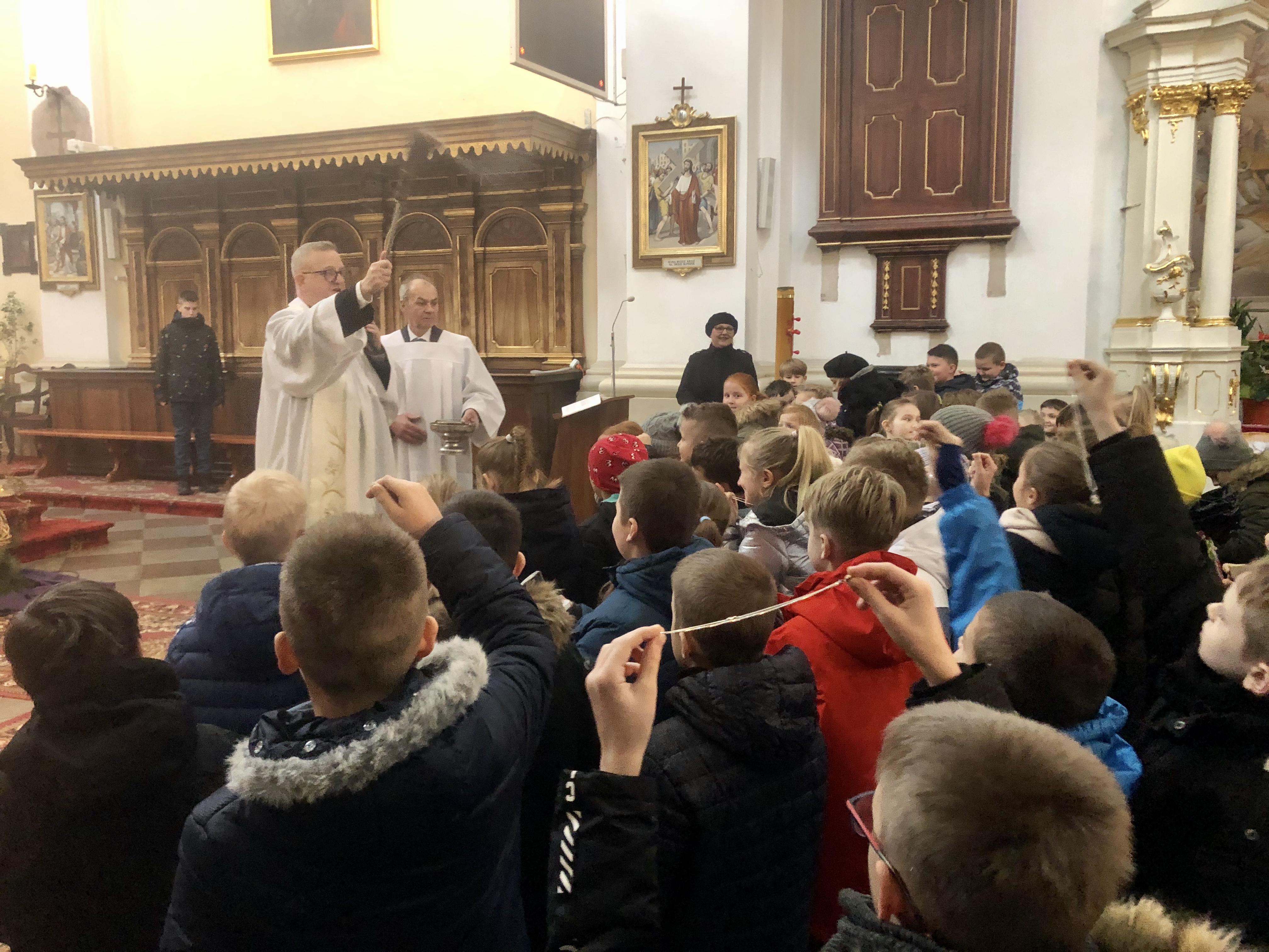 Oto pokaźna grupa dzieci przygotowujących się do pierwszej komunii świętej przyniosła na Mszę świętą różańce, które zostały uroczyście poświęcone przez proboszcza parafii, ks. prałata Leszka Gardzińskiego. Nie tylko te dzieci podeszły do stopni prezbiterium, ale i starsze koleżanki i koledzy, pragnące poświęcić swoje pamiątki religijne.