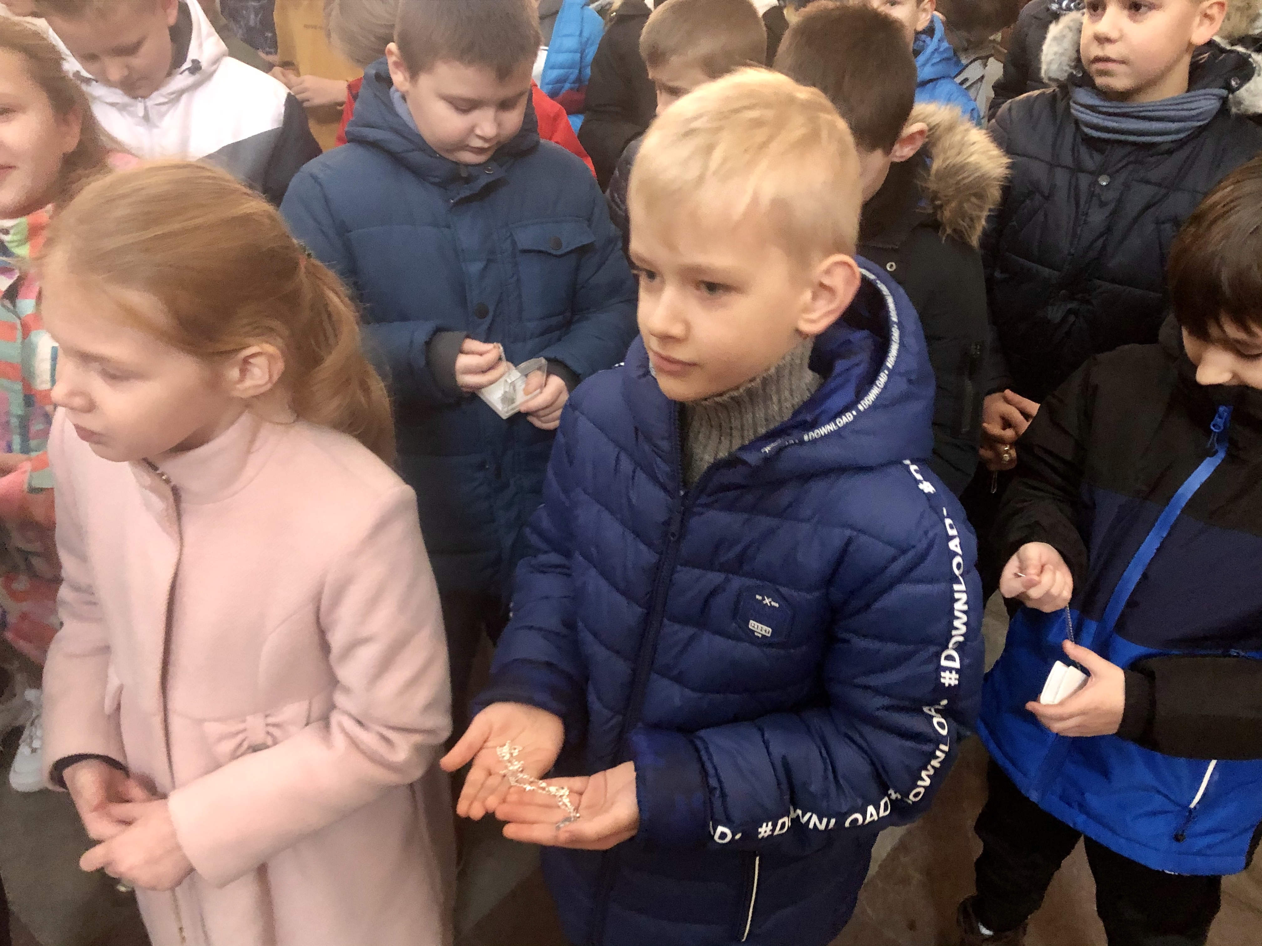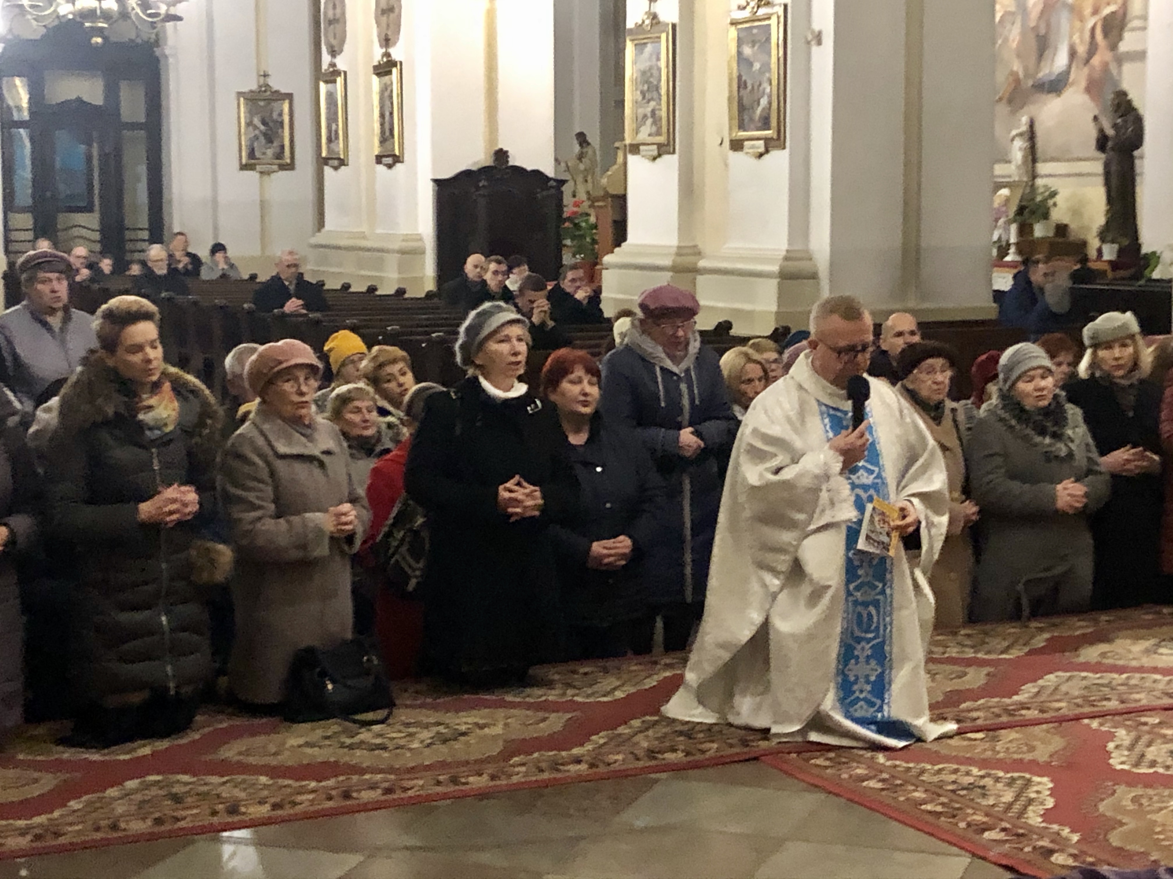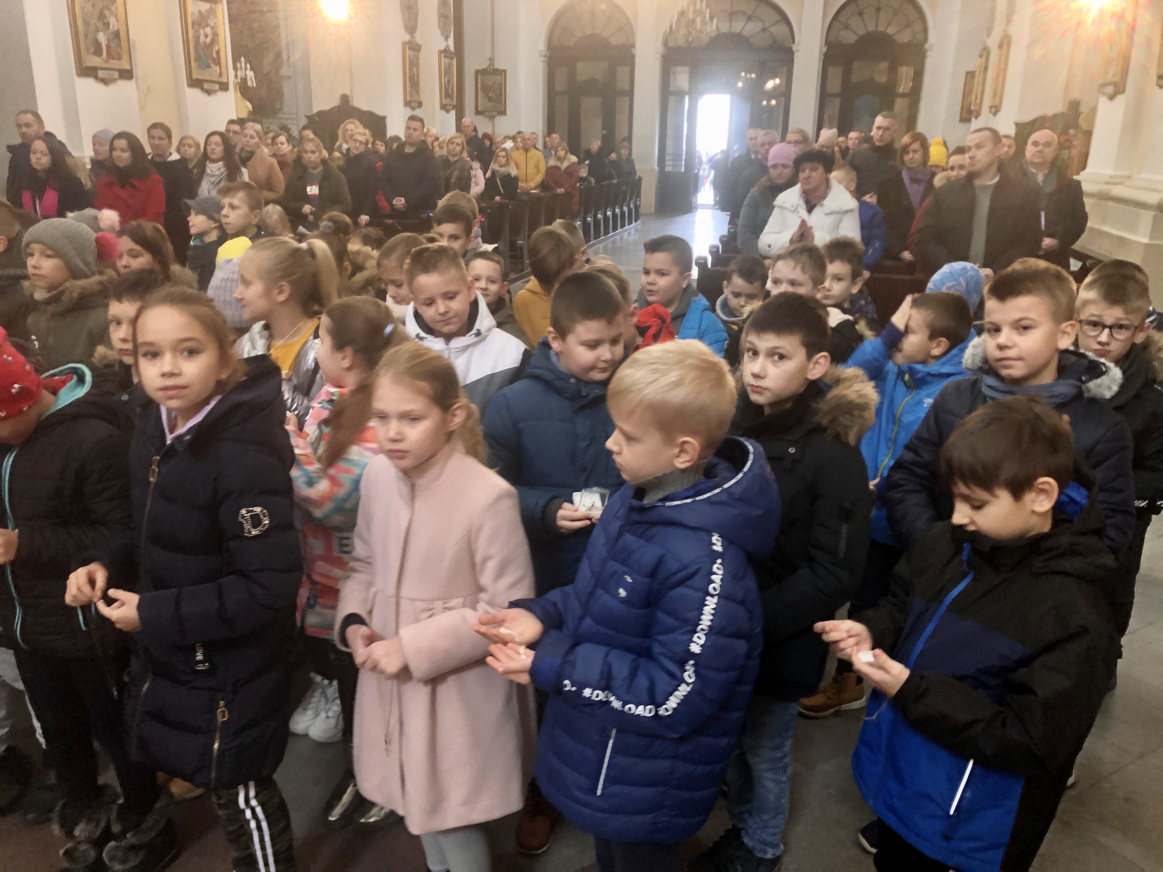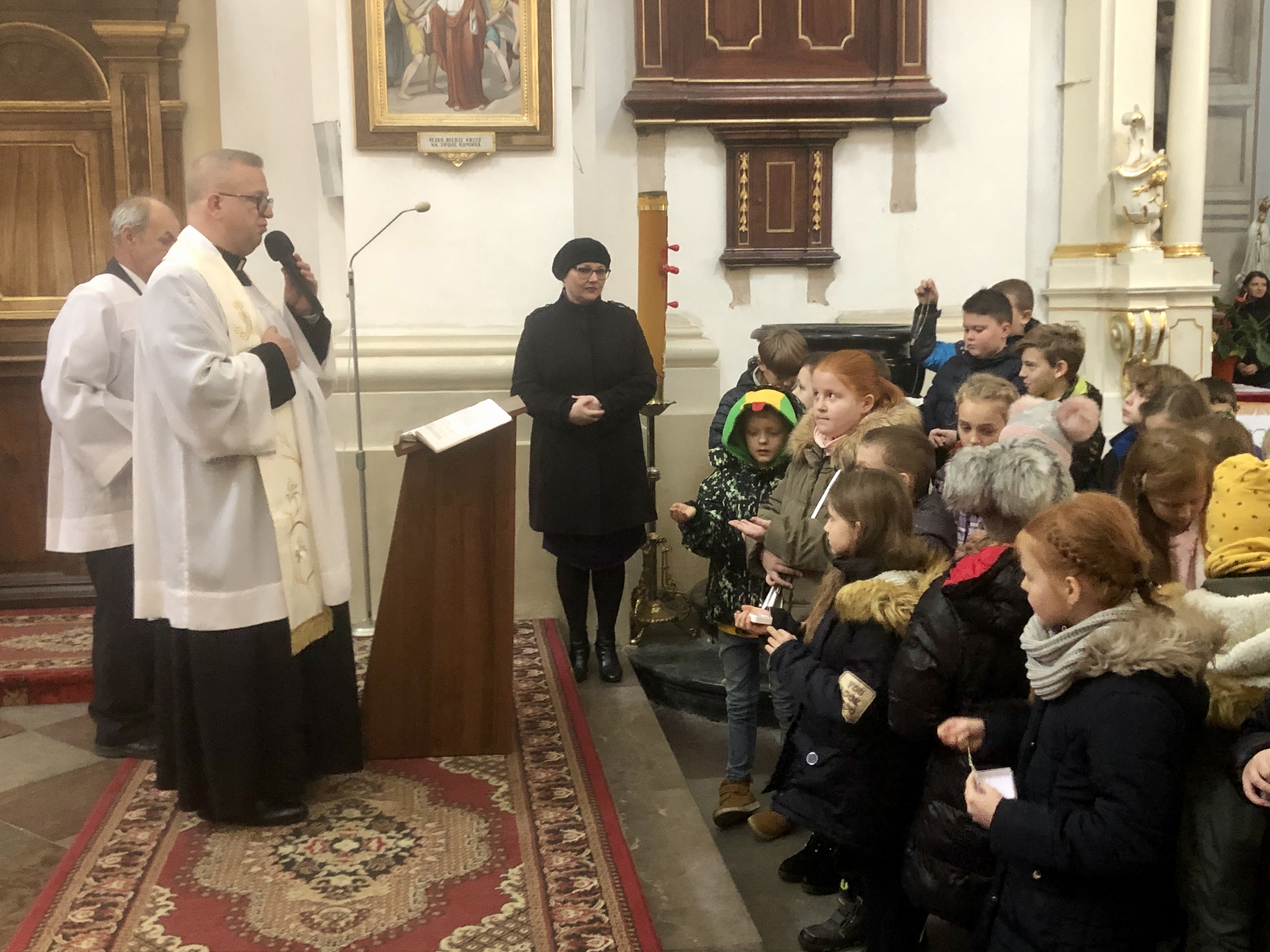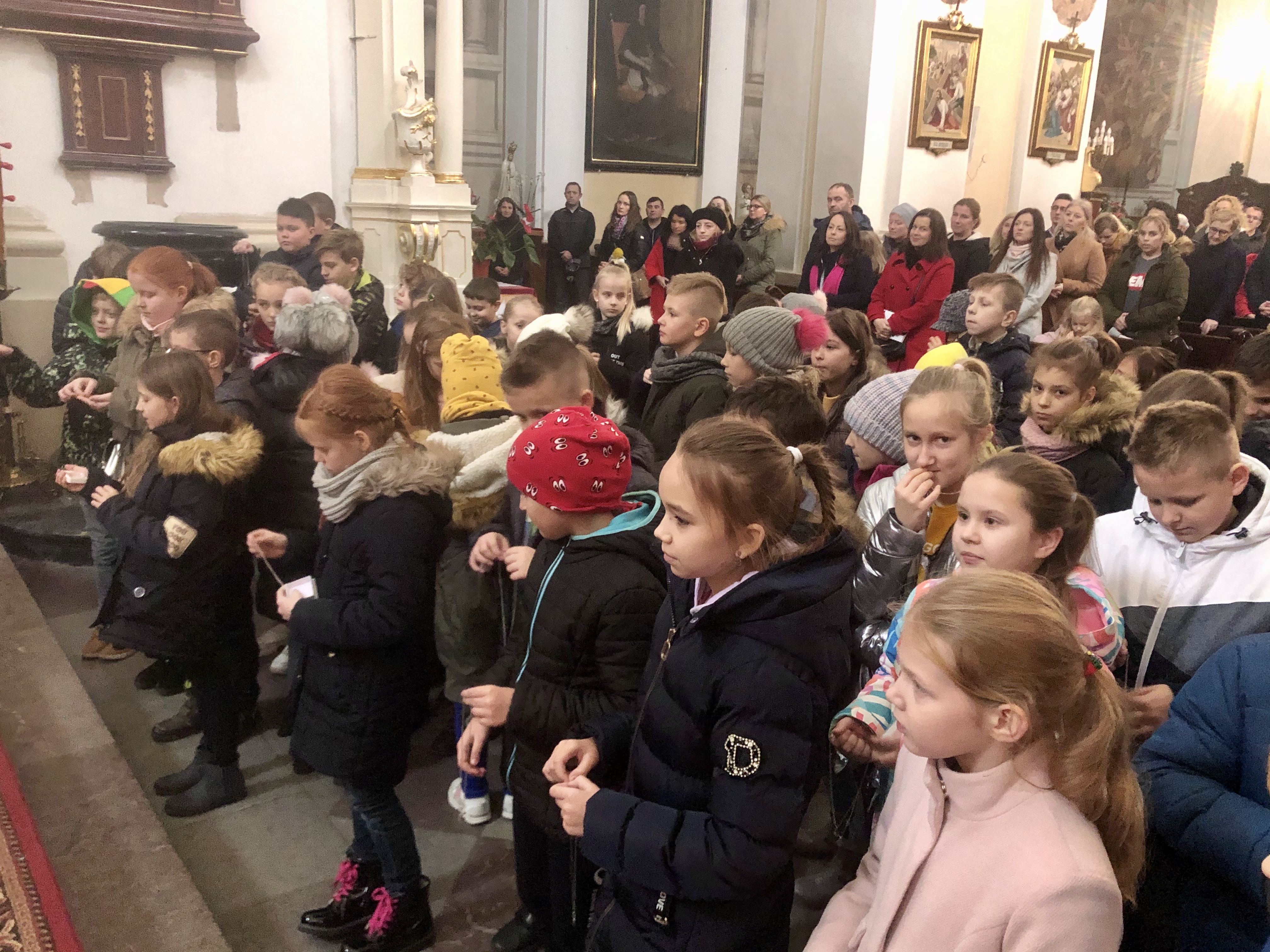 Oto pokaźna grupa dzieci przygotowujących się do pierwszej komunii świętej przyniosła na Mszę świętą różańce, które zostały uroczyście poświęcone przez proboszcza parafii, ks. prałata Leszka Gardzińskiego. Nie tylko te dzieci podeszły do stopni prezbiterium, ale i starsze koleżanki i koledzy, pragnące poświęcić swoje pamiątki religijne.
