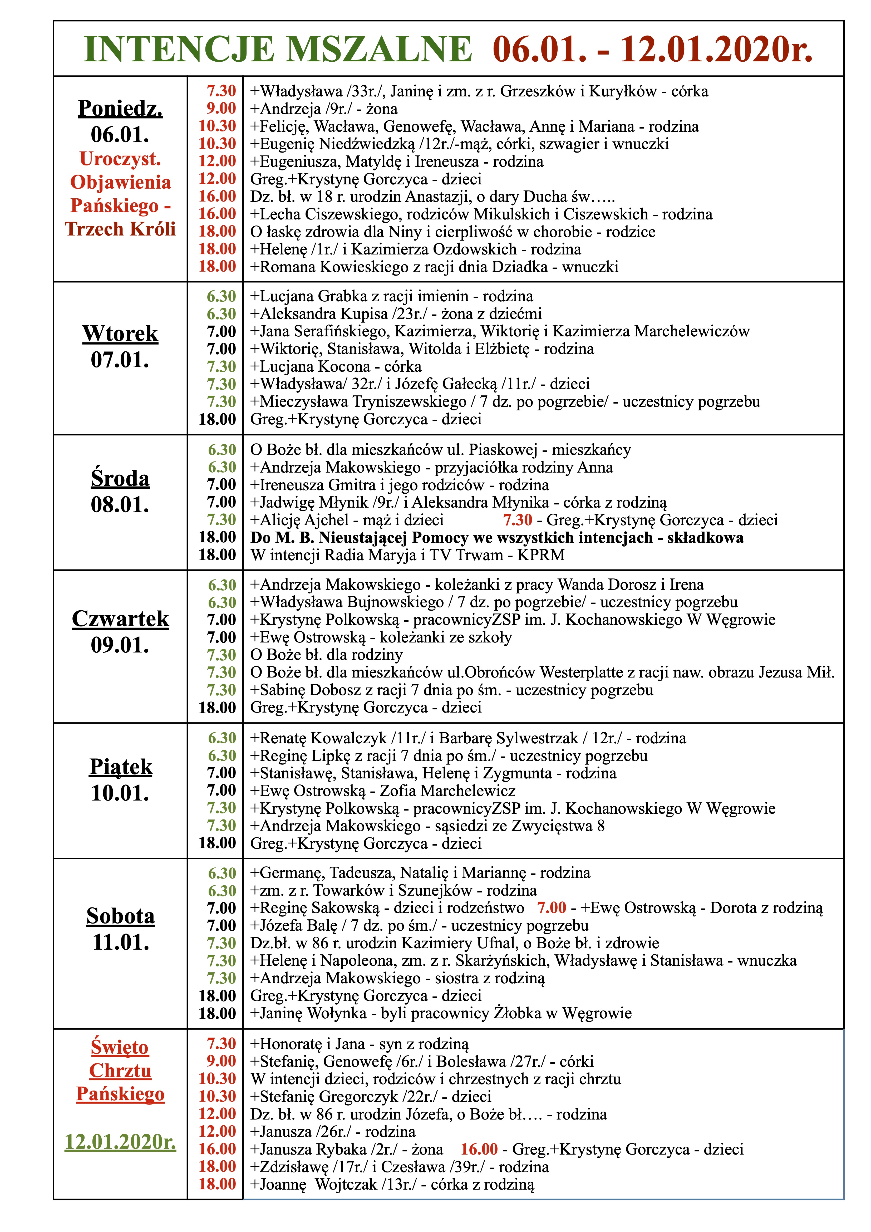 INTENCJE MSZALNE 06.01. – 12.01.2020r.