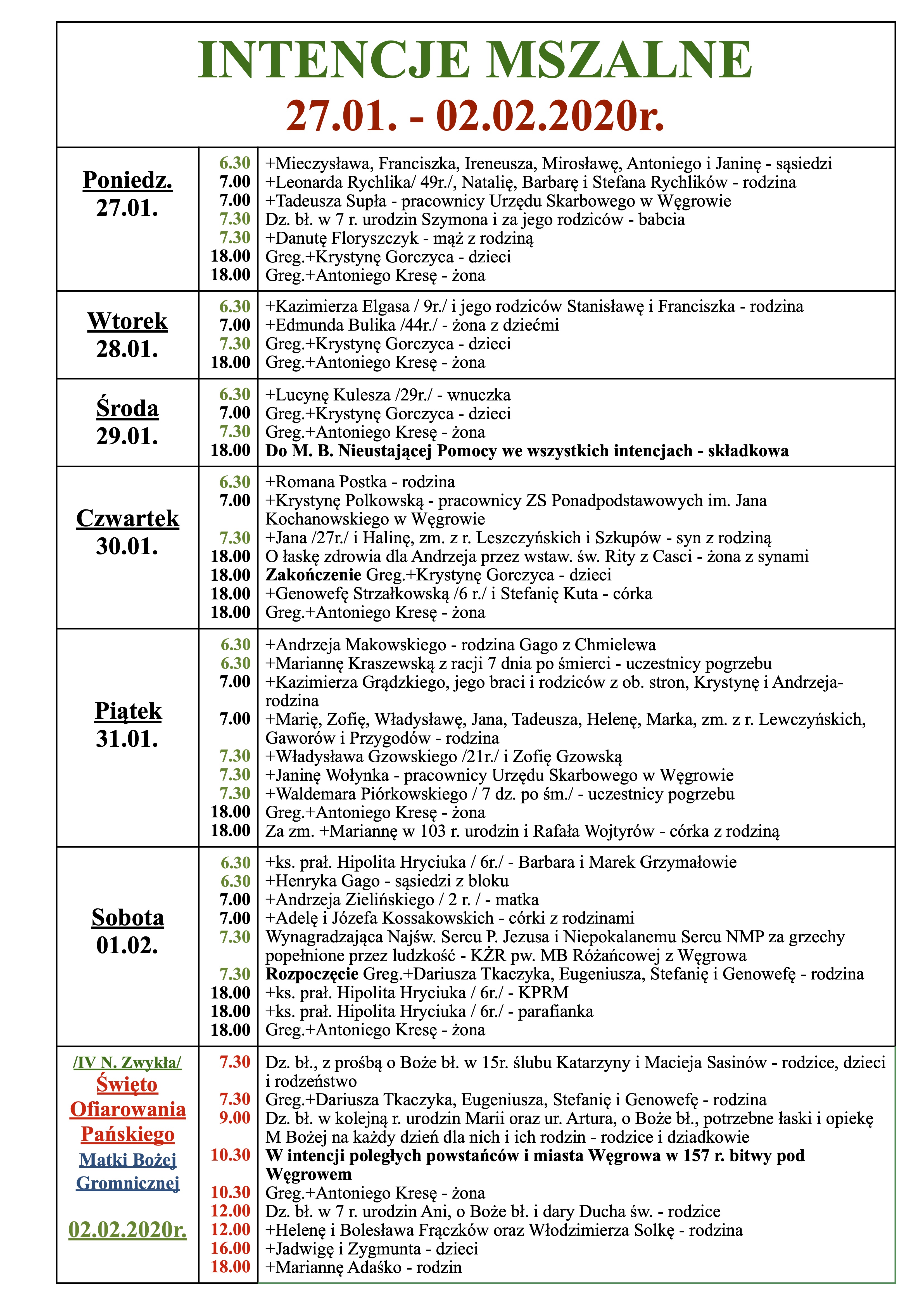 INTENCJE MSZALNE 27.01. – 02.02.2020r.