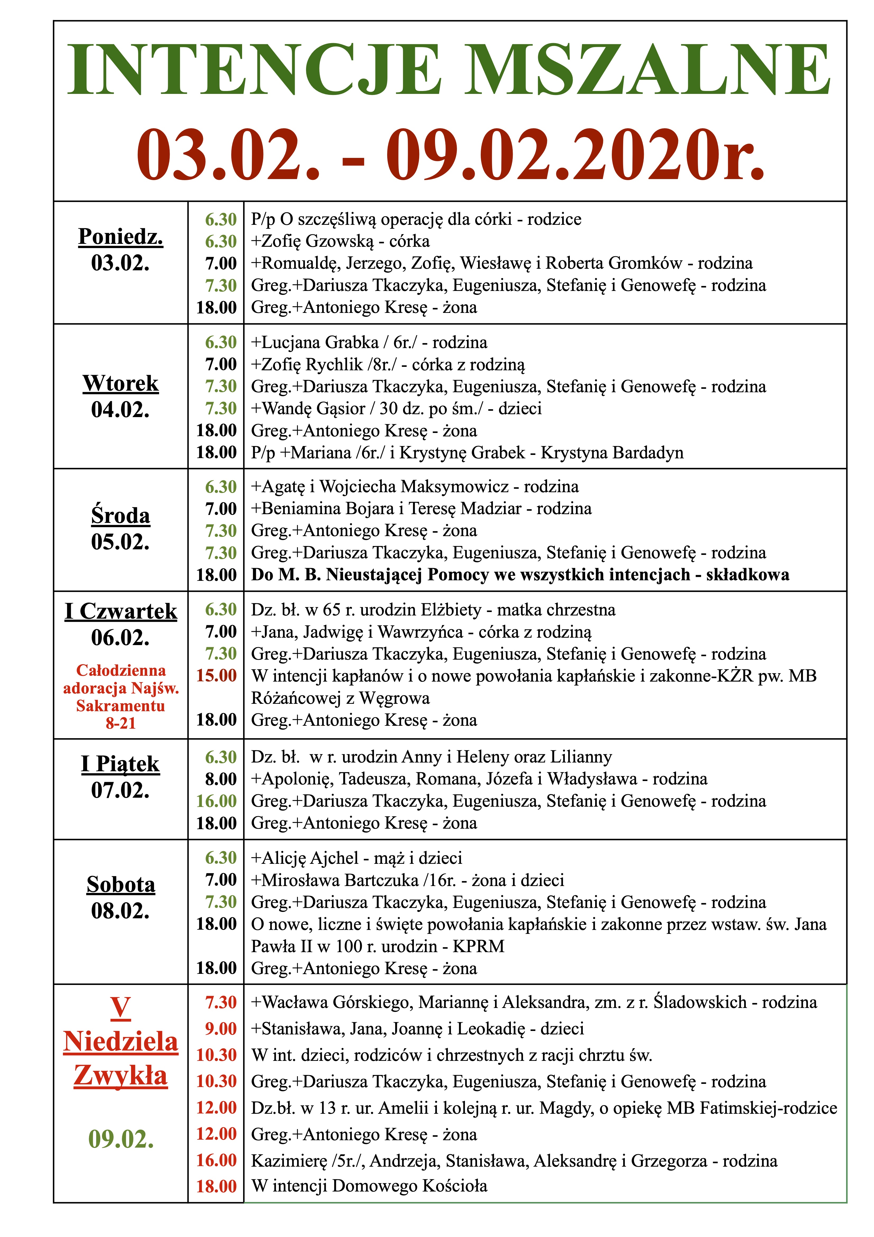 INTENCJE MSZALNE 03.02. – 09.02.2020r.