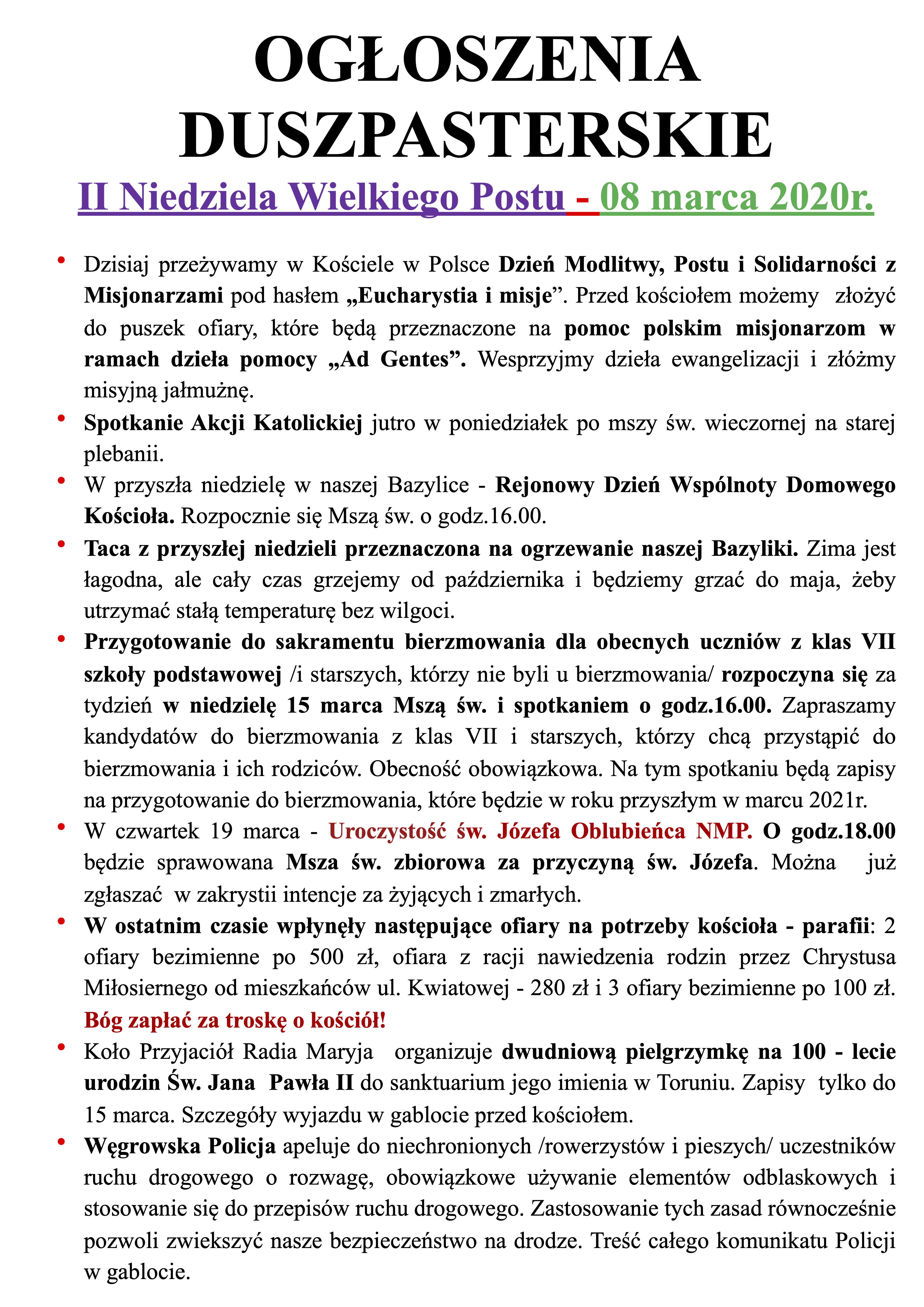 II Niedziela Wielkiego Postu – 08 marca 2020r.