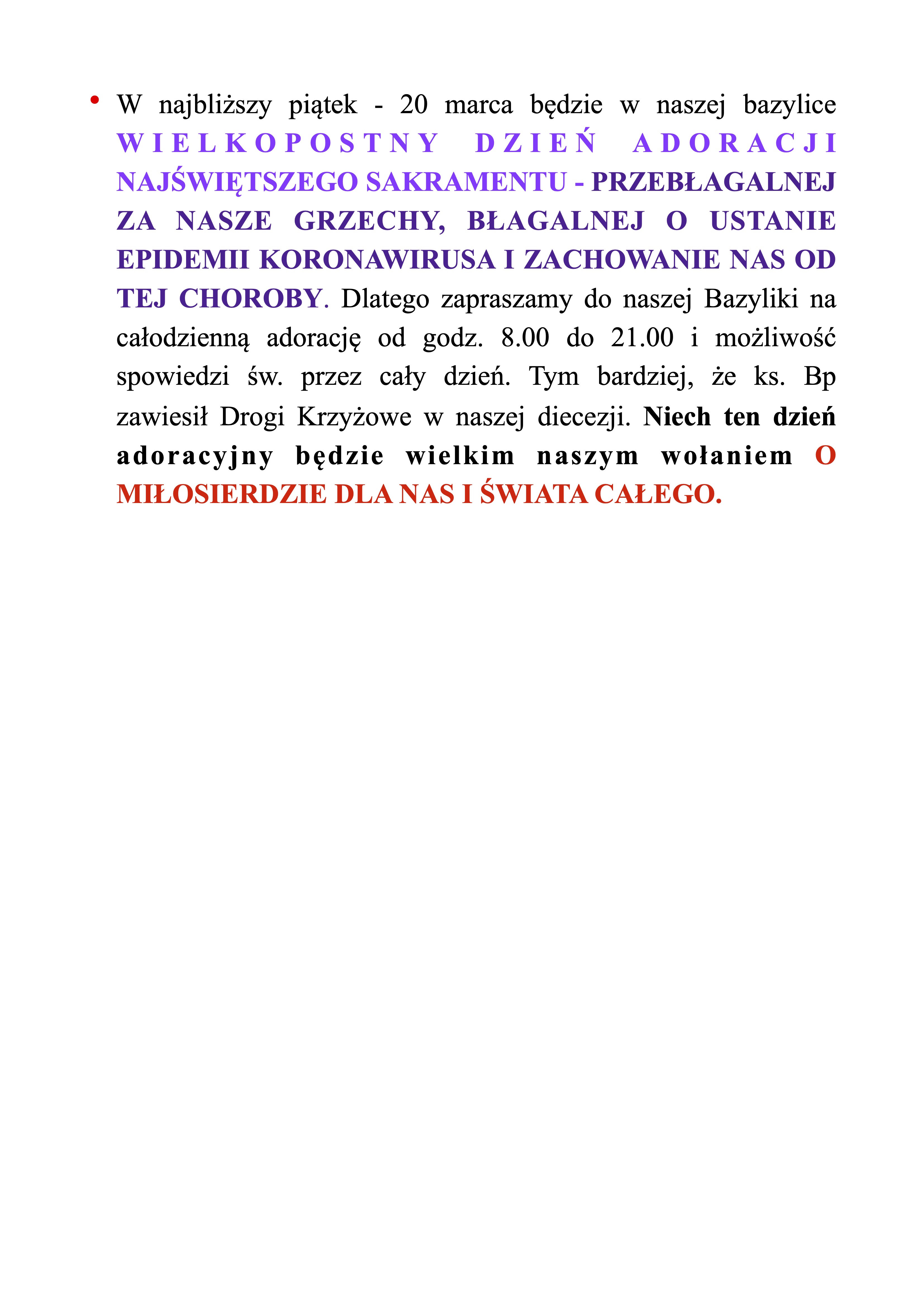 W Bazylice Węgrowskiej DZIEŃ ADORACJI NAJŚWIĘTSZEGO SAKRAMENTU PRZEBŁAGALNEJ ZA NASZE GRZECHY, BŁAGALNEJ O USTANIE EPIDEMII KORONAWIRUSA I ZACHOWANIE NAS OD TEJ CHOROBY – 20 marca 2020r. przez Ks. Proboszcz / 6 lat temu