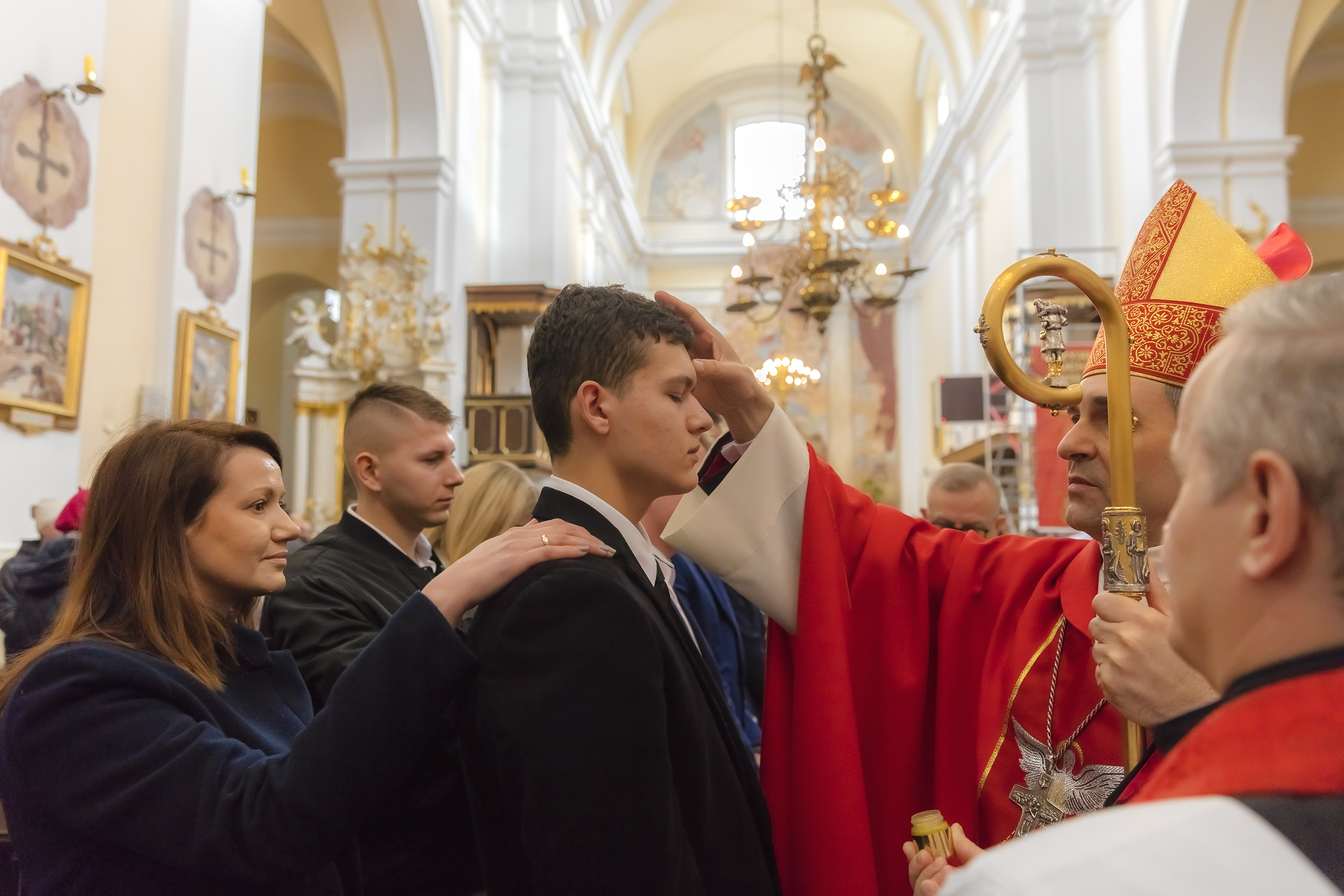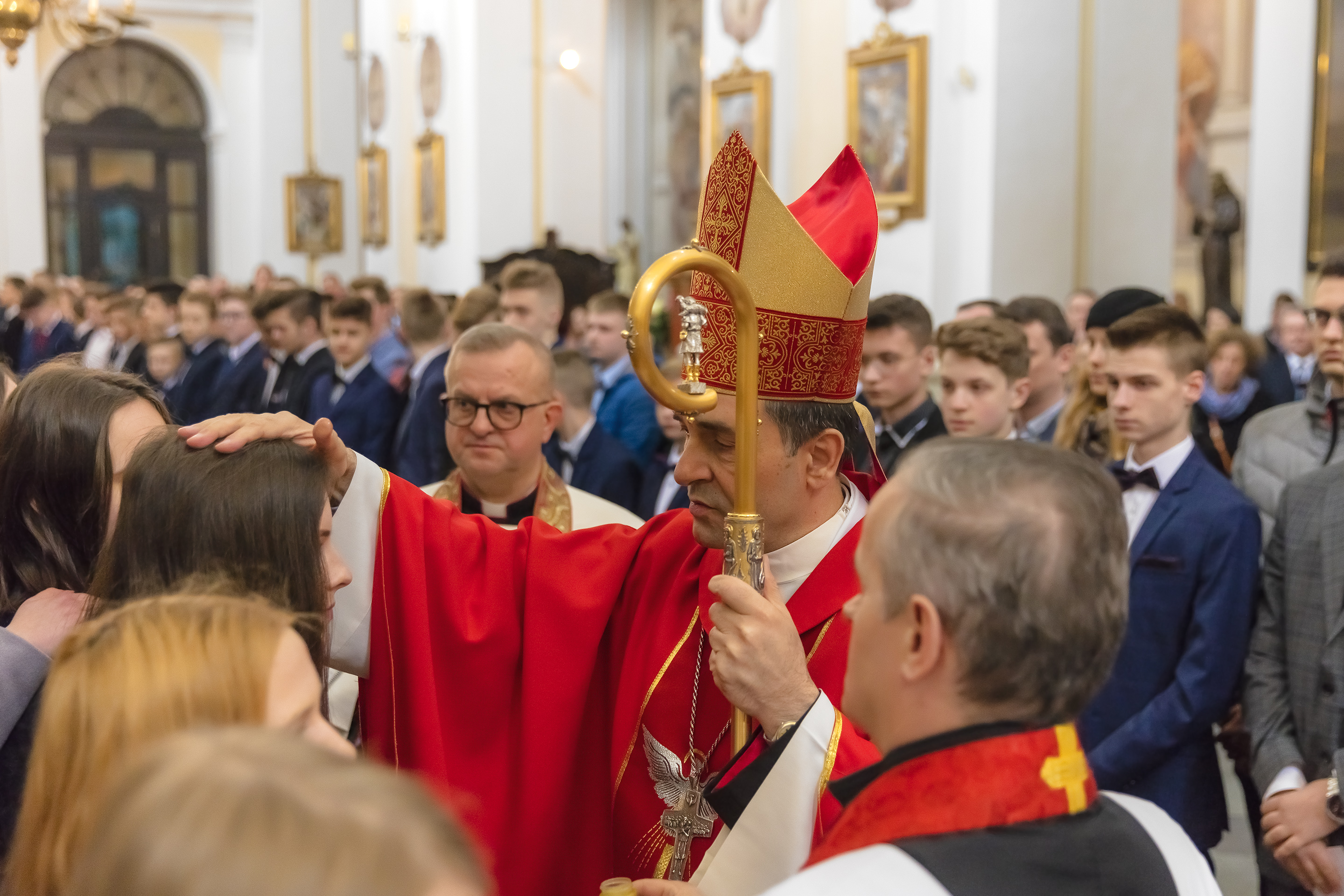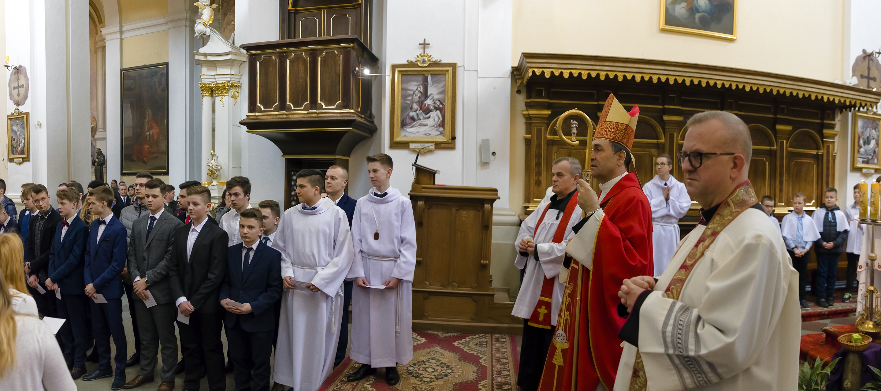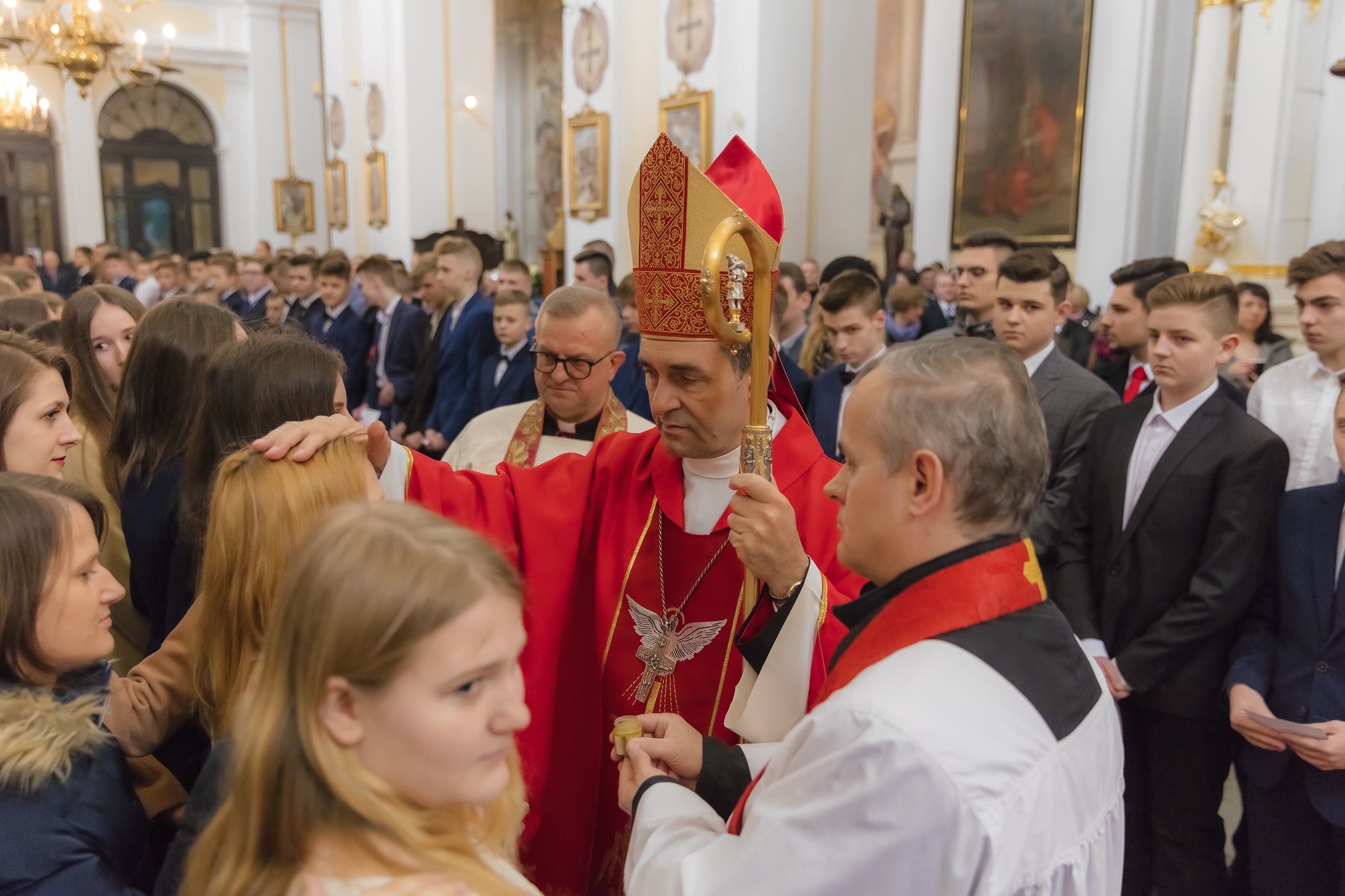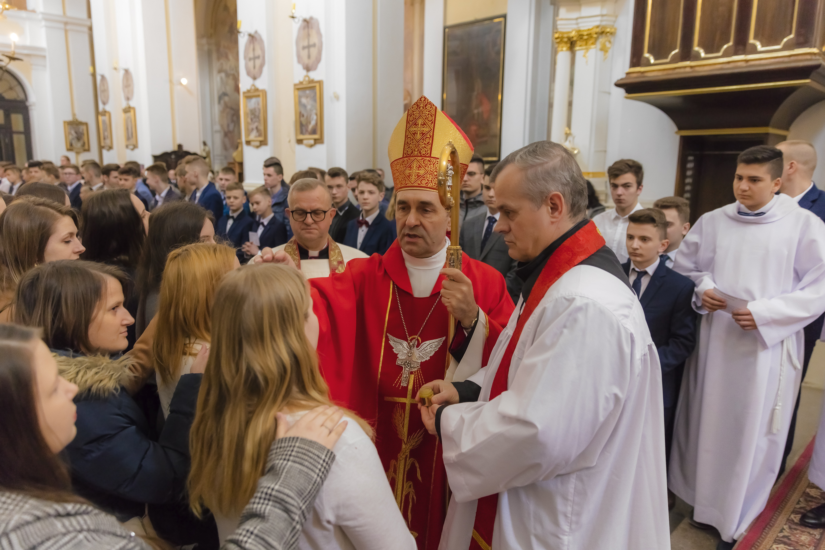 Podczas homilii skierowanej do kandydatów i towarzyszących im rodziców, rodziców chrzestnych oraz świadków, Ksiądz Biskup podkreślił, że mimo rozpoczynającego się okresu Wielkiego Postu, w którym rozważamy sprawy bolesne – Mękę Chrystusa, to jednak sam fakt przyjęcia znamion Ducha Świętego przez młodych ludzi, napawa wielką radością zarówno wspólnotę parafialną, jak i cały Kościół. Pasterz zwrócił uwagę na dwa istotne momenty: Kościół zrodził się na Golgocie, a objawił się światu w dniu Pięćdziesiątnicy. Od Golgoty do Pięćdziesiątnicy jest zatem bardzo blisko. Zesłanie Ducha Świętego nastąpiło jako owoc Męki i Śmierci Pana Jezusa. W opisie zesłania Ducha Świętego użyte są słowa twarde, nie sielankowe – te same, co w starotestamentalnym opisie przekazania Mojżeszowi Dekalogu na Synaju. Ksiądz Biskup przypomniał, że w dniu Pięćdziesiątnicy Żydzi obchodzili Święto Tygodni, czyli Święto odnowienia Prawa. Stroili synagogi na zielono, podobnie ja dziś chrześcijanie stoją swoje kościoły na Zielone Świątki. I to właśnie w tym dniu, kiedy Żydzi wspominali wydarzenia z Synaju, narodził się Kościół. Duch Święty dokonał przemiany w sercach Apostołów, którzy otrzymali nadprzyrodzone dary, o których istnieniu nie mieli nawet pojęcia i o których nawet nie marzyli: odwagę, męstwo – od tego momentu zaczęli głosić Dobrą Nowinę o zbawieniu, które przyszło w Chrystusie. Czynili to z wielkim zapałem, z wielką radością. Duch Święty pomógł im przezwyciężyć dotychczasowy lęk i duchowe zagubienie. Biskup Piotr zauważył, że Bóg bardzo często przychodzi w taką szczelinę, jaka tworzy się między naszym ludzkim lękiem, a zaufaniem, na które się zdobędziemy, na które się wzniesiemy. Jezus zapowiedział uczniom prześladowania, ale to jest mimo wszystko Dobra Nowina, choć mówi o trudnościach, o cierpieniu, o czekającym krzyżu. W Krzyżu jest ratunek, jest zbawienie, a Duch Święty pomaga w to uwierzyć, i właśnie bez lęku, a z zaufaniem to przyjąć. Sakrament Bierzmowania pomaga odnaleźć się w Kościele w czasach, gdy wielu ludzi odwraca się od Niego. Zamknięcie się na Ducha Świętego prowadzi do utraty wiary oraz spojrzenia przez jej pryzmat na Kościół. Dlatego też to Duch Święty daje mądrość nadprzyrodzoną, oświeca umysły, wyprowadza z różnorakich lęków i obaw. Wszystko to ku dojrzałości, świadomości i radości bycia uczniem Jezusa Chrystusa.
