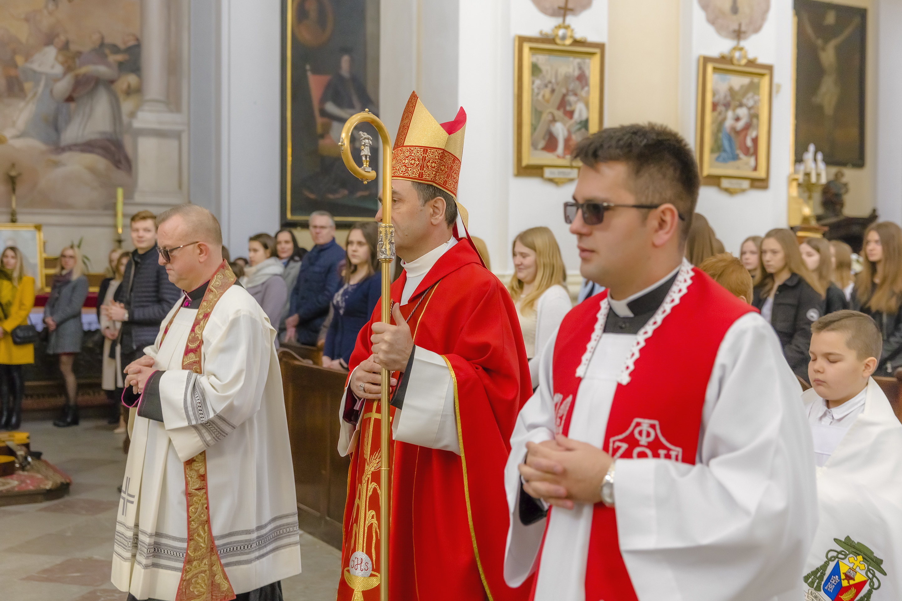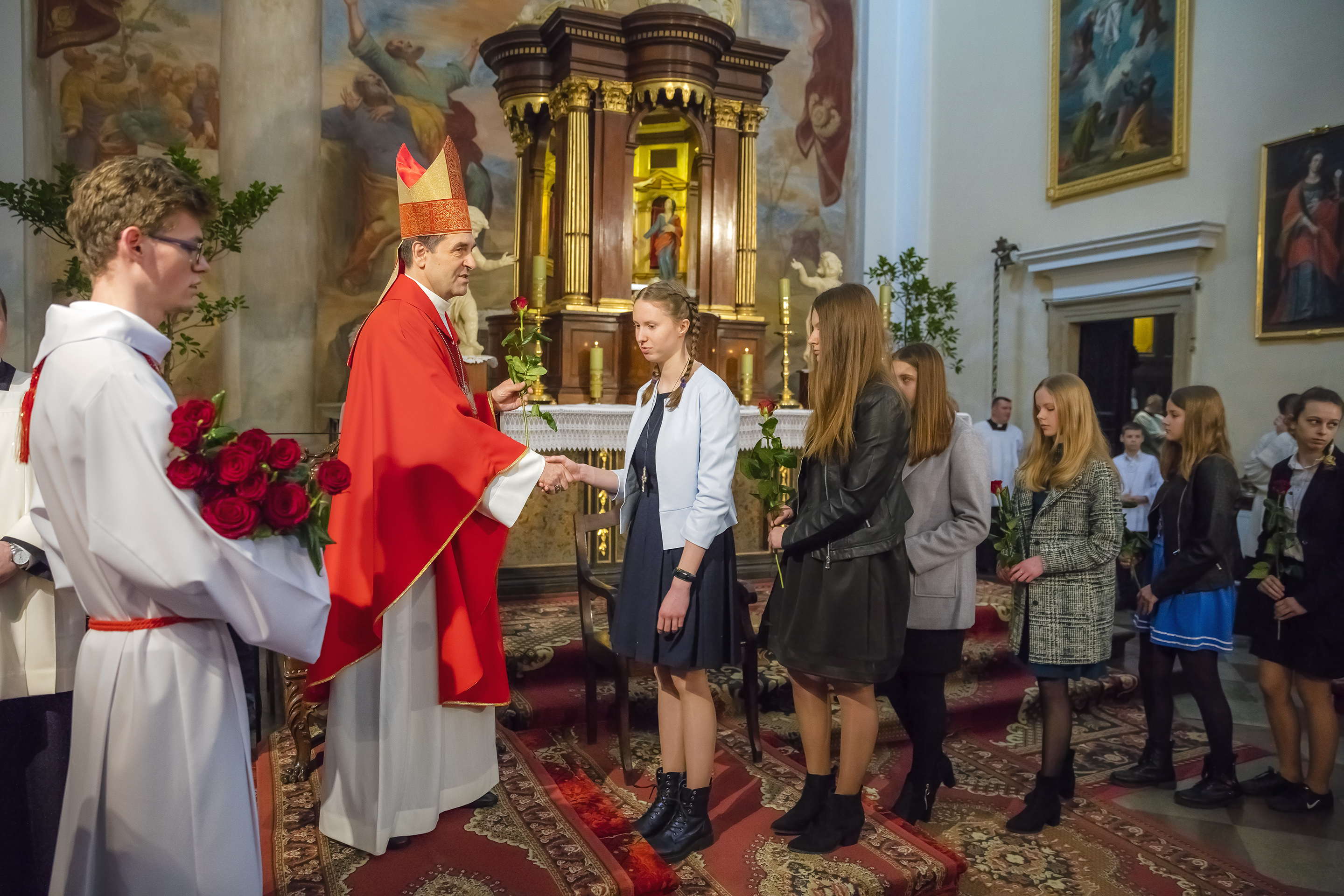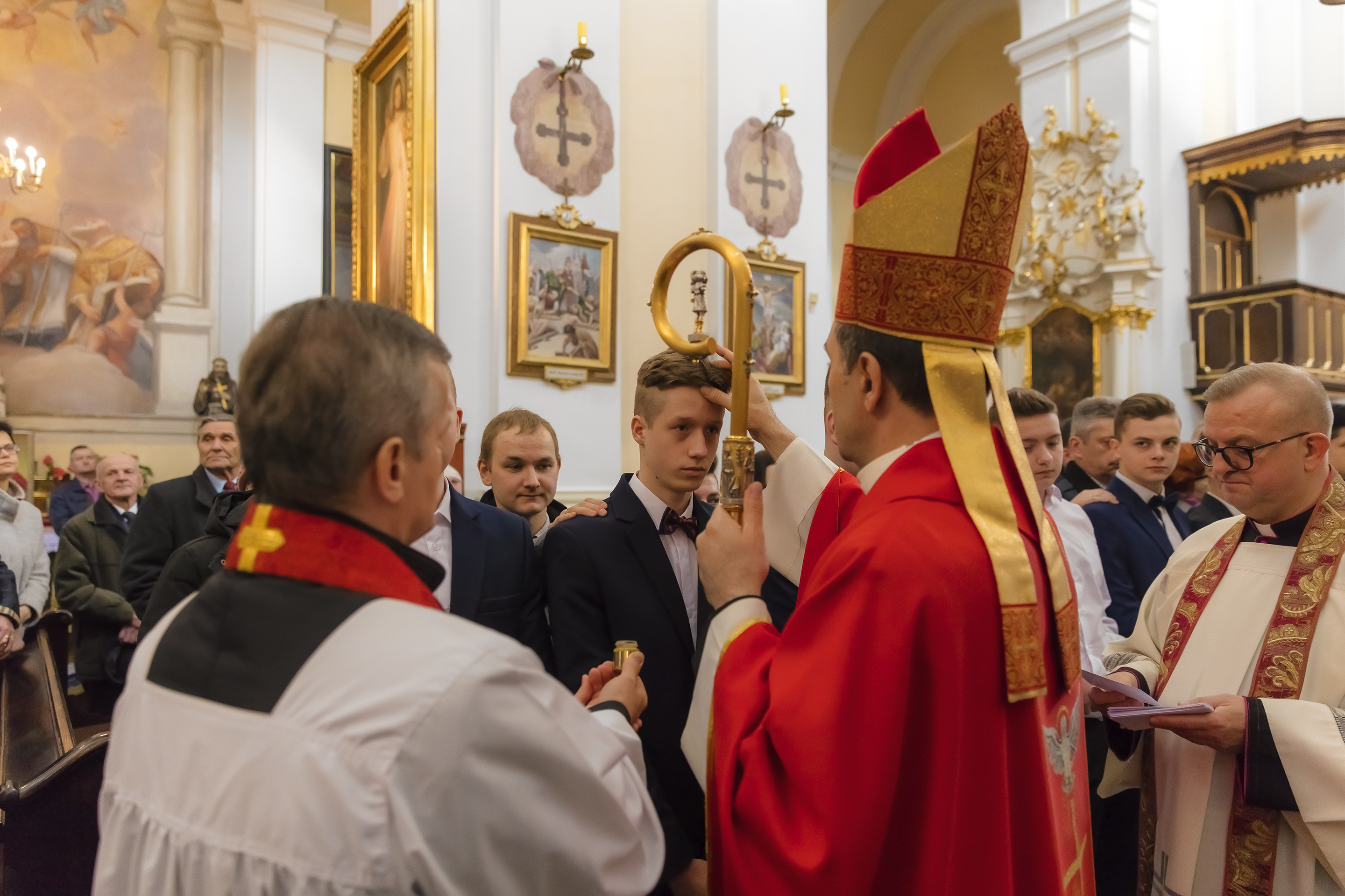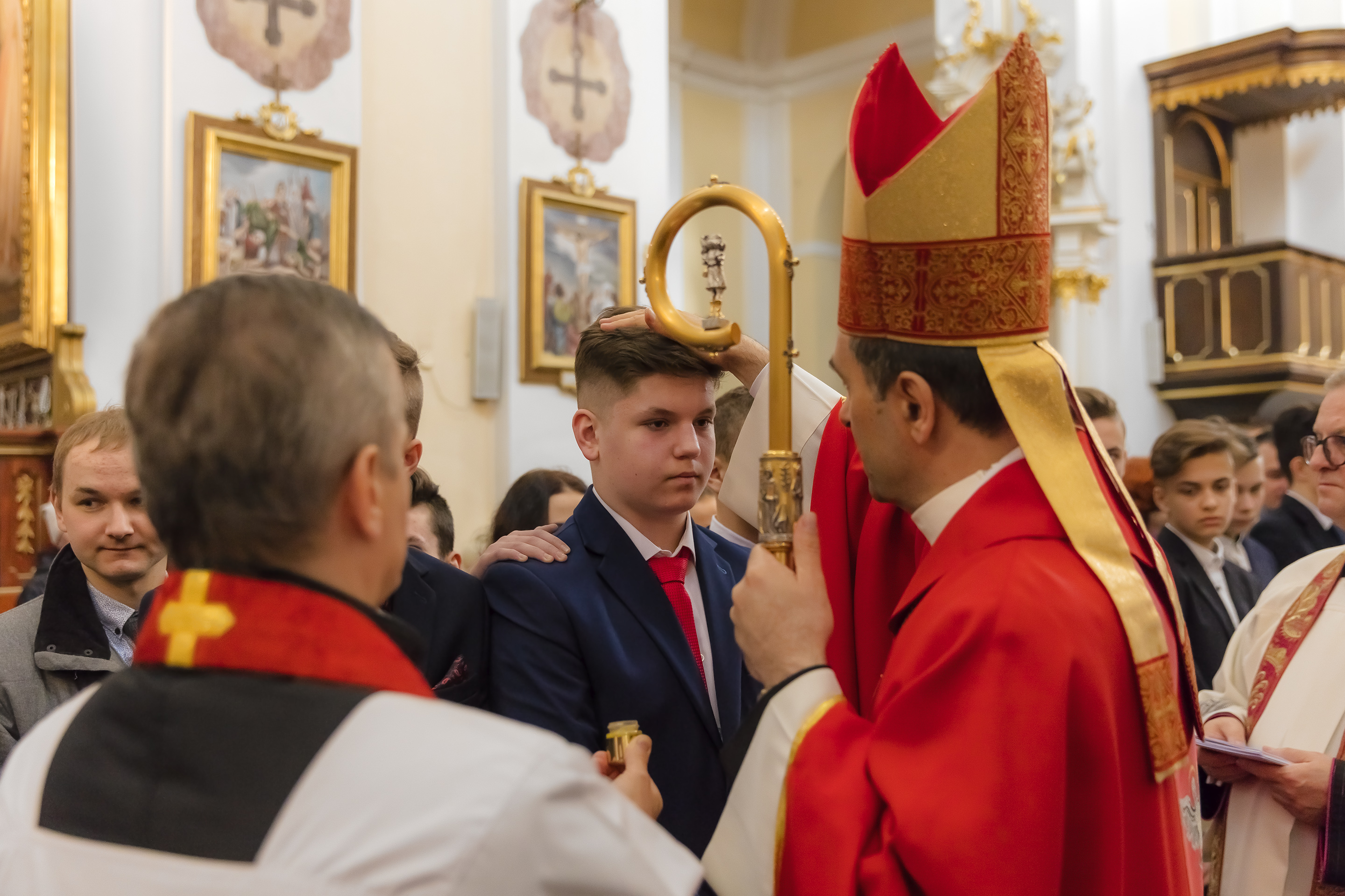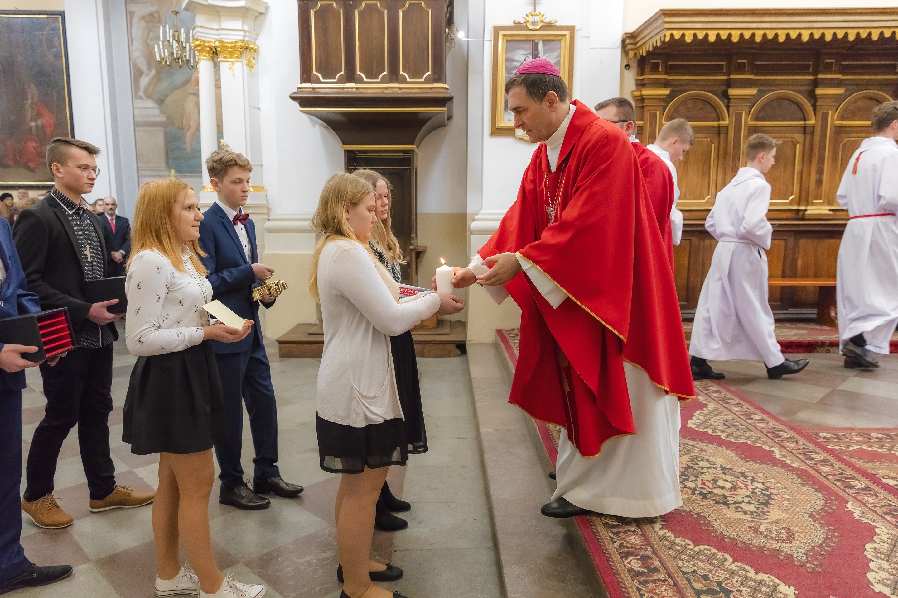 Podczas homilii skierowanej do kandydatów i towarzyszących im rodziców, rodziców chrzestnych oraz świadków, Ksiądz Biskup podkreślił, że mimo rozpoczynającego się okresu Wielkiego Postu, w którym rozważamy sprawy bolesne – Mękę Chrystusa, to jednak sam fakt przyjęcia znamion Ducha Świętego przez młodych ludzi, napawa wielką radością zarówno wspólnotę parafialną, jak i cały Kościół. Pasterz zwrócił uwagę na dwa istotne momenty: Kościół zrodził się na Golgocie, a objawił się światu w dniu Pięćdziesiątnicy. Od Golgoty do Pięćdziesiątnicy jest zatem bardzo blisko. Zesłanie Ducha Świętego nastąpiło jako owoc Męki i Śmierci Pana Jezusa. W opisie zesłania Ducha Świętego użyte są słowa twarde, nie sielankowe – te same, co w starotestamentalnym opisie przekazania Mojżeszowi Dekalogu na Synaju. Ksiądz Biskup przypomniał, że w dniu Pięćdziesiątnicy Żydzi obchodzili Święto Tygodni, czyli Święto odnowienia Prawa. Stroili synagogi na zielono, podobnie ja dziś chrześcijanie stoją swoje kościoły na Zielone Świątki. I to właśnie w tym dniu, kiedy Żydzi wspominali wydarzenia z Synaju, narodził się Kościół. Duch Święty dokonał przemiany w sercach Apostołów, którzy otrzymali nadprzyrodzone dary, o których istnieniu nie mieli nawet pojęcia i o których nawet nie marzyli: odwagę, męstwo – od tego momentu zaczęli głosić Dobrą Nowinę o zbawieniu, które przyszło w Chrystusie. Czynili to z wielkim zapałem, z wielką radością. Duch Święty pomógł im przezwyciężyć dotychczasowy lęk i duchowe zagubienie. Biskup Piotr zauważył, że Bóg bardzo często przychodzi w taką szczelinę, jaka tworzy się między naszym ludzkim lękiem, a zaufaniem, na które się zdobędziemy, na które się wzniesiemy. Jezus zapowiedział uczniom prześladowania, ale to jest mimo wszystko Dobra Nowina, choć mówi o trudnościach, o cierpieniu, o czekającym krzyżu. W Krzyżu jest ratunek, jest zbawienie, a Duch Święty pomaga w to uwierzyć, i właśnie bez lęku, a z zaufaniem to przyjąć. Sakrament Bierzmowania pomaga odnaleźć się w Kościele w czasach, gdy wielu ludzi odwraca się od Niego. Zamknięcie się na Ducha Świętego prowadzi do utraty wiary oraz spojrzenia przez jej pryzmat na Kościół. Dlatego też to Duch Święty daje mądrość nadprzyrodzoną, oświeca umysły, wyprowadza z różnorakich lęków i obaw. Wszystko to ku dojrzałości, świadomości i radości bycia uczniem Jezusa Chrystusa.