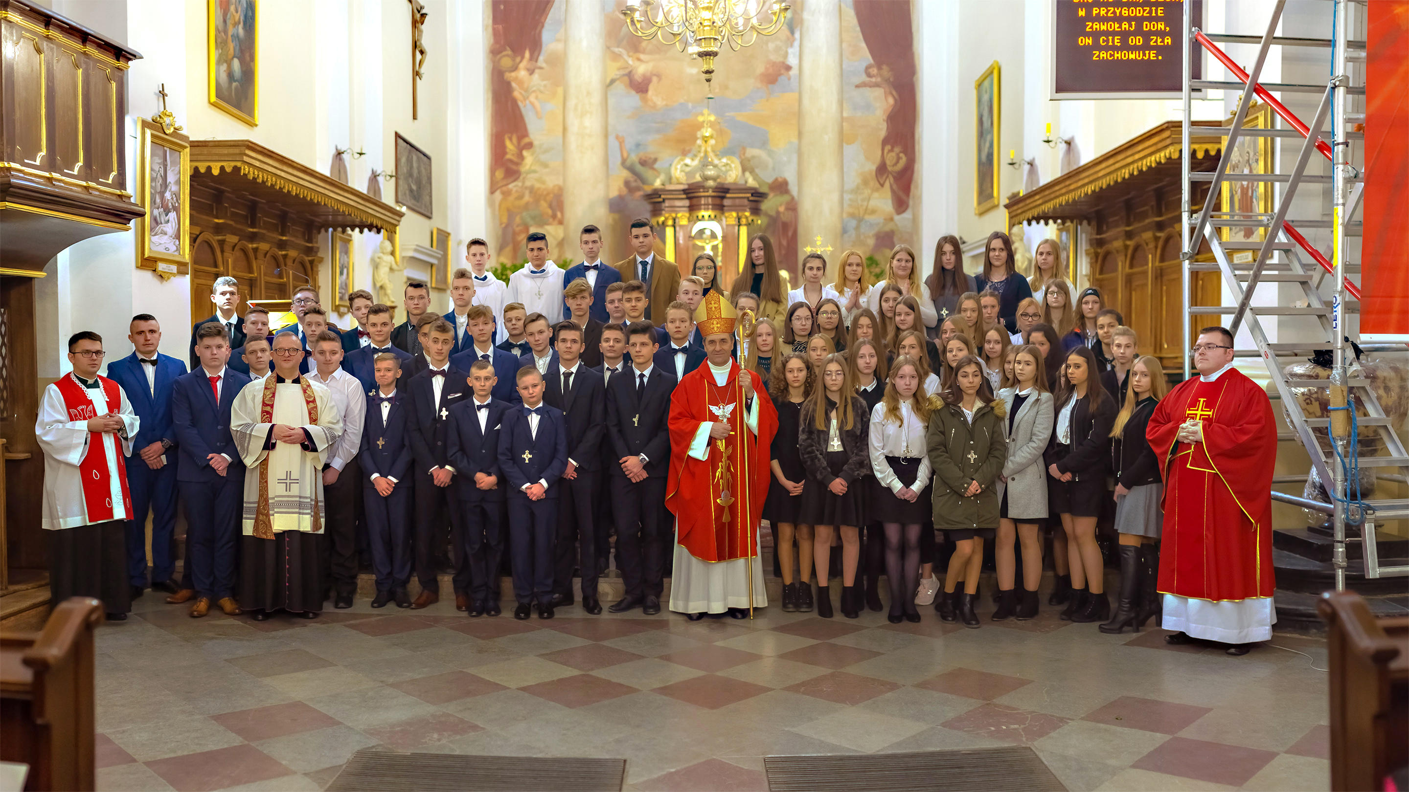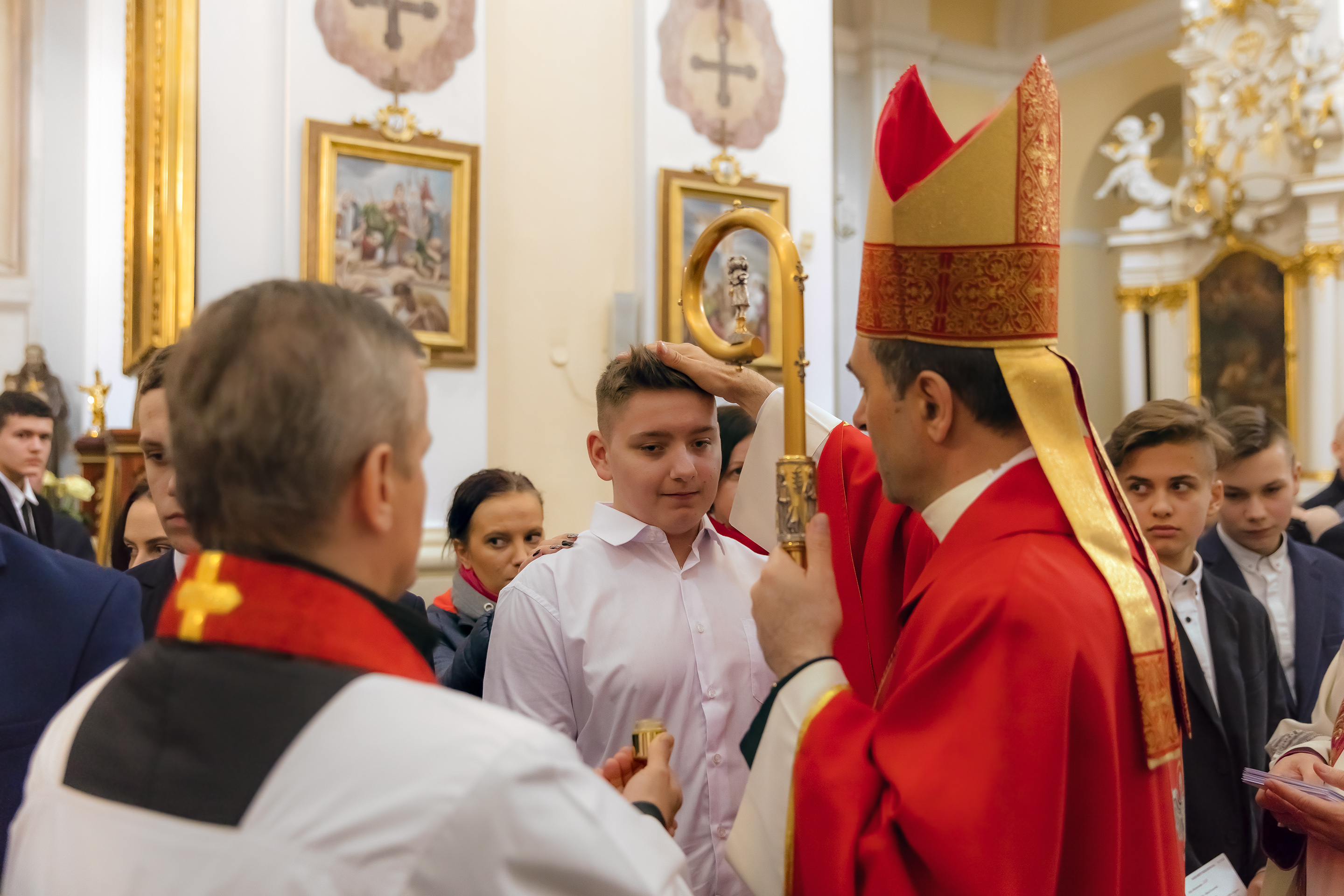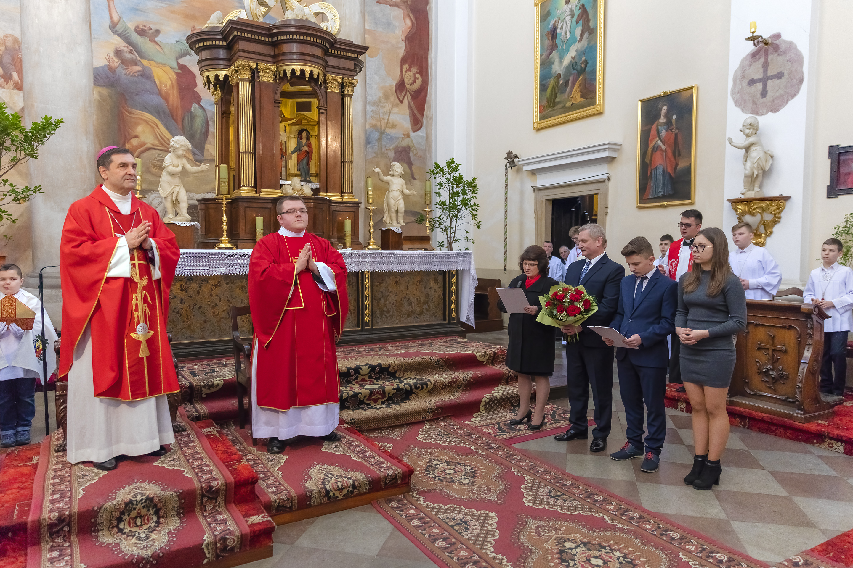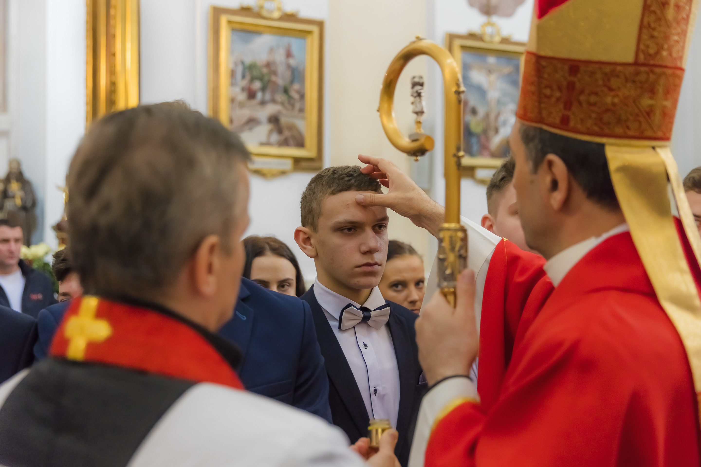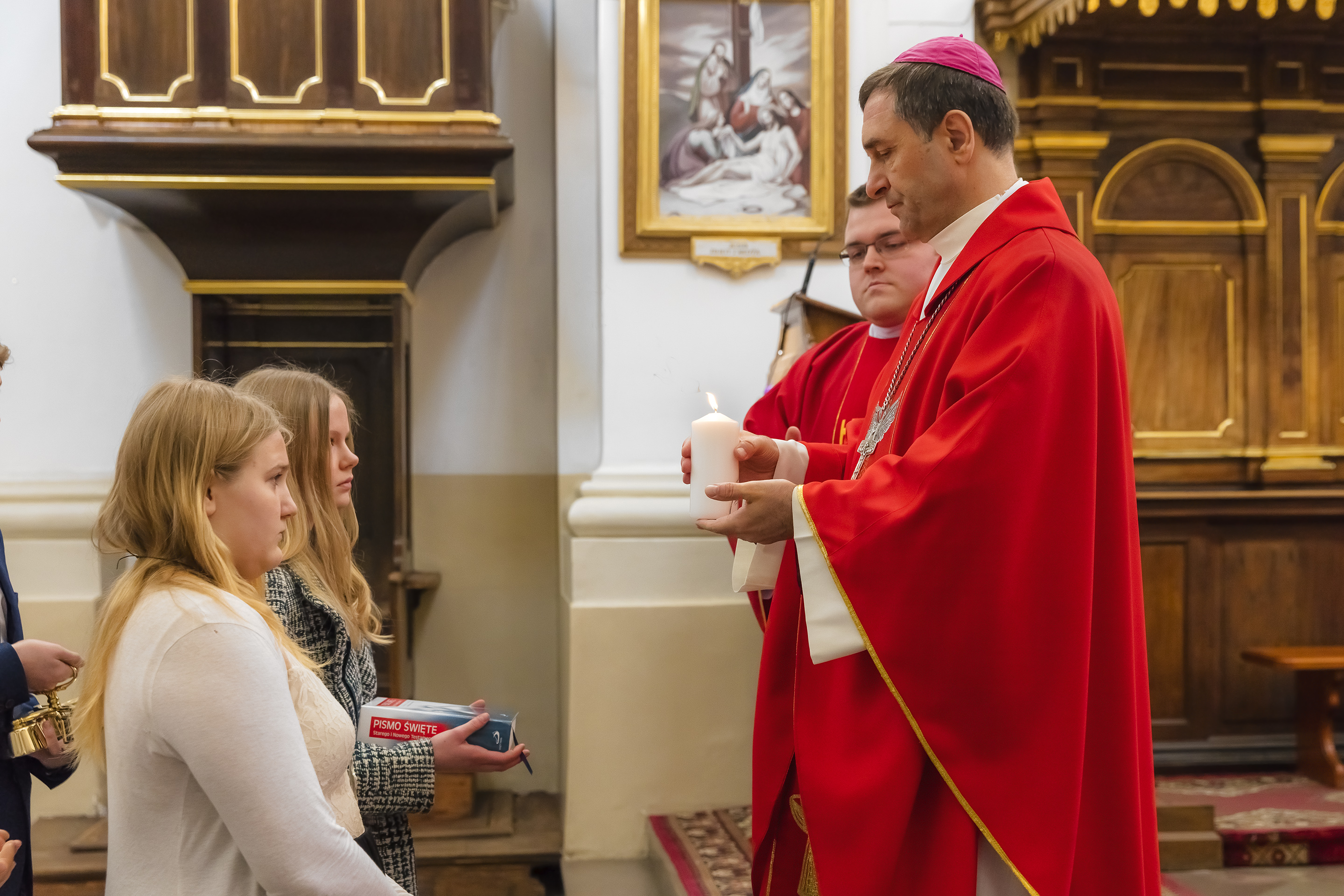 Podczas homilii skierowanej do kandydatów i towarzyszących im rodziców, rodziców chrzestnych oraz świadków, Ksiądz Biskup podkreślił, że mimo rozpoczynającego się okresu Wielkiego Postu, w którym rozważamy sprawy bolesne – Mękę Chrystusa, to jednak sam fakt przyjęcia znamion Ducha Świętego przez młodych ludzi, napawa wielką radością zarówno wspólnotę parafialną, jak i cały Kościół. Pasterz zwrócił uwagę na dwa istotne momenty: Kościół zrodził się na Golgocie, a objawił się światu w dniu Pięćdziesiątnicy. Od Golgoty do Pięćdziesiątnicy jest zatem bardzo blisko. Zesłanie Ducha Świętego nastąpiło jako owoc Męki i Śmierci Pana Jezusa. W opisie zesłania Ducha Świętego użyte są słowa twarde, nie sielankowe – te same, co w starotestamentalnym opisie przekazania Mojżeszowi Dekalogu na Synaju. Ksiądz Biskup przypomniał, że w dniu Pięćdziesiątnicy Żydzi obchodzili Święto Tygodni, czyli Święto odnowienia Prawa. Stroili synagogi na zielono, podobnie ja dziś chrześcijanie stoją swoje kościoły na Zielone Świątki. I to właśnie w tym dniu, kiedy Żydzi wspominali wydarzenia z Synaju, narodził się Kościół. Duch Święty dokonał przemiany w sercach Apostołów, którzy otrzymali nadprzyrodzone dary, o których istnieniu nie mieli nawet pojęcia i o których nawet nie marzyli: odwagę, męstwo – od tego momentu zaczęli głosić Dobrą Nowinę o zbawieniu, które przyszło w Chrystusie. Czynili to z wielkim zapałem, z wielką radością. Duch Święty pomógł im przezwyciężyć dotychczasowy lęk i duchowe zagubienie. Biskup Piotr zauważył, że Bóg bardzo często przychodzi w taką szczelinę, jaka tworzy się między naszym ludzkim lękiem, a zaufaniem, na które się zdobędziemy, na które się wzniesiemy. Jezus zapowiedział uczniom prześladowania, ale to jest mimo wszystko Dobra Nowina, choć mówi o trudnościach, o cierpieniu, o czekającym krzyżu. W Krzyżu jest ratunek, jest zbawienie, a Duch Święty pomaga w to uwierzyć, i właśnie bez lęku, a z zaufaniem to przyjąć. Sakrament Bierzmowania pomaga odnaleźć się w Kościele w czasach, gdy wielu ludzi odwraca się od Niego. Zamknięcie się na Ducha Świętego prowadzi do utraty wiary oraz spojrzenia przez jej pryzmat na Kościół. Dlatego też to Duch Święty daje mądrość nadprzyrodzoną, oświeca umysły, wyprowadza z różnorakich lęków i obaw. Wszystko to ku dojrzałości, świadomości i radości bycia uczniem Jezusa Chrystusa.