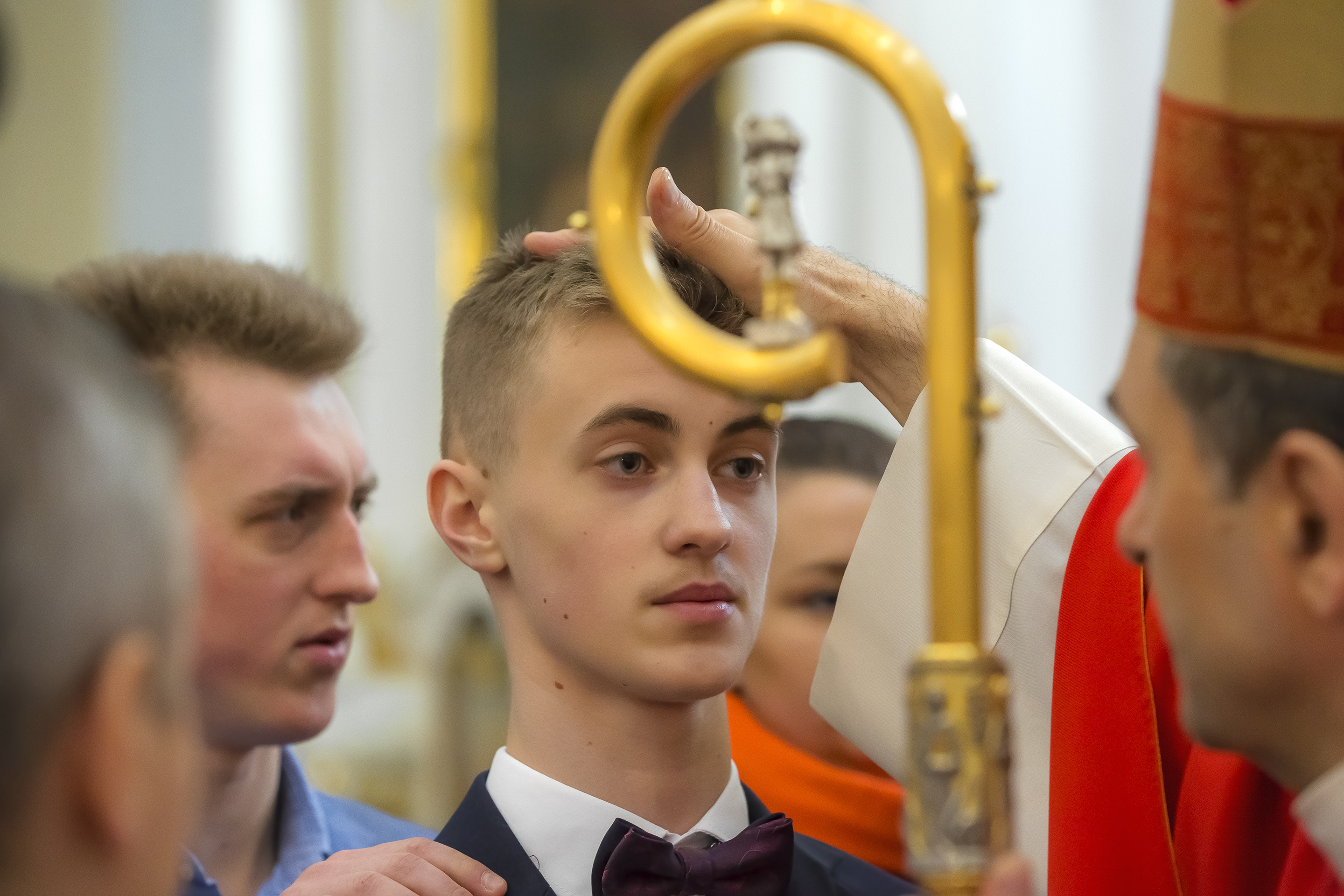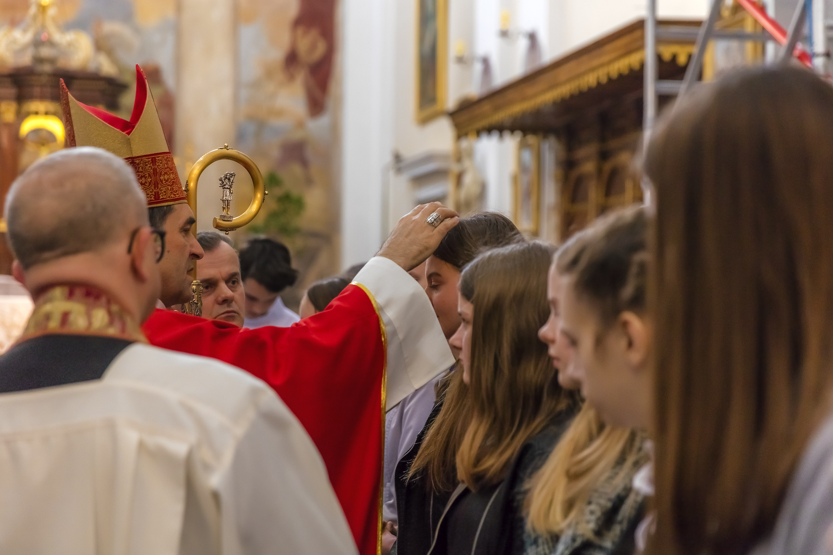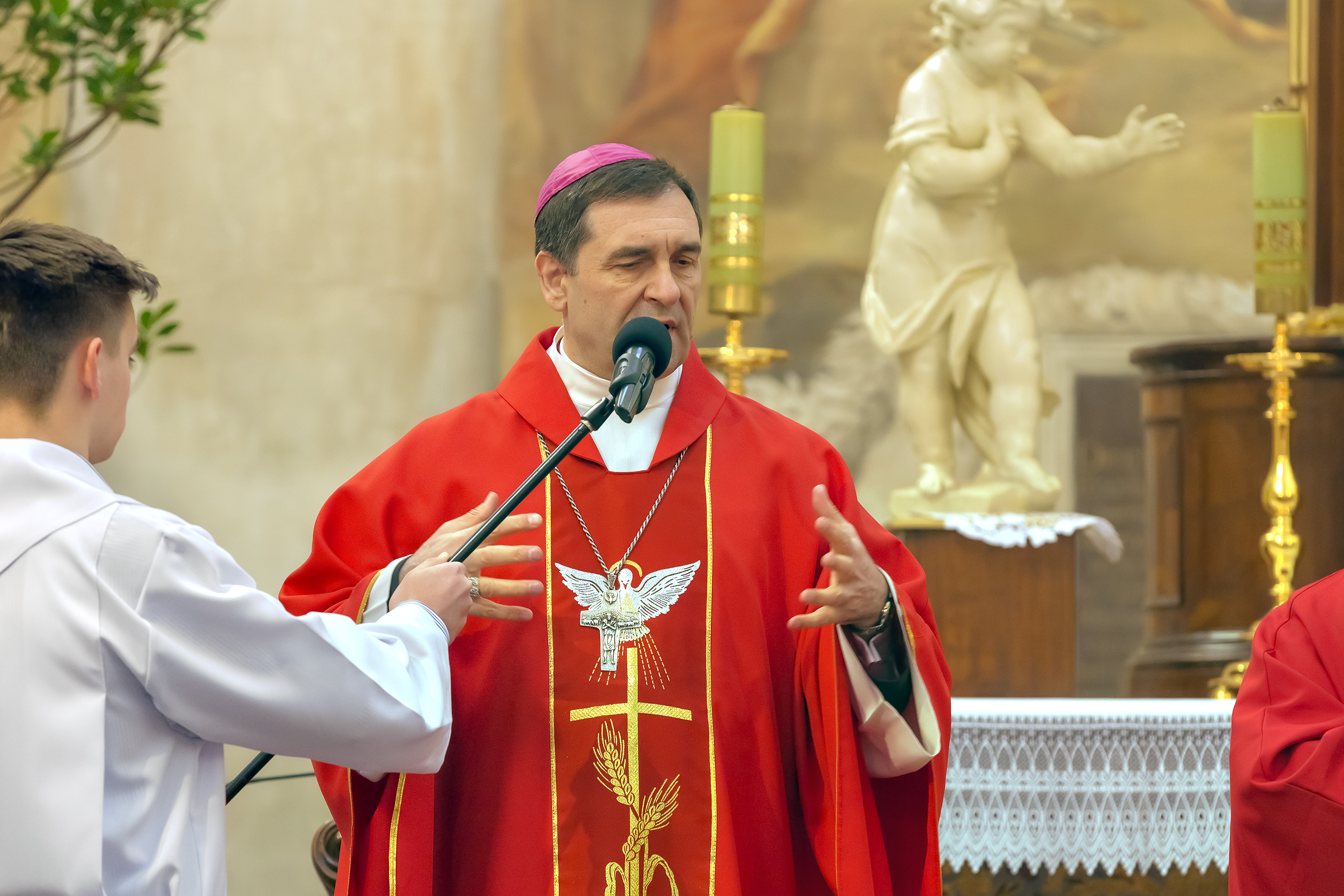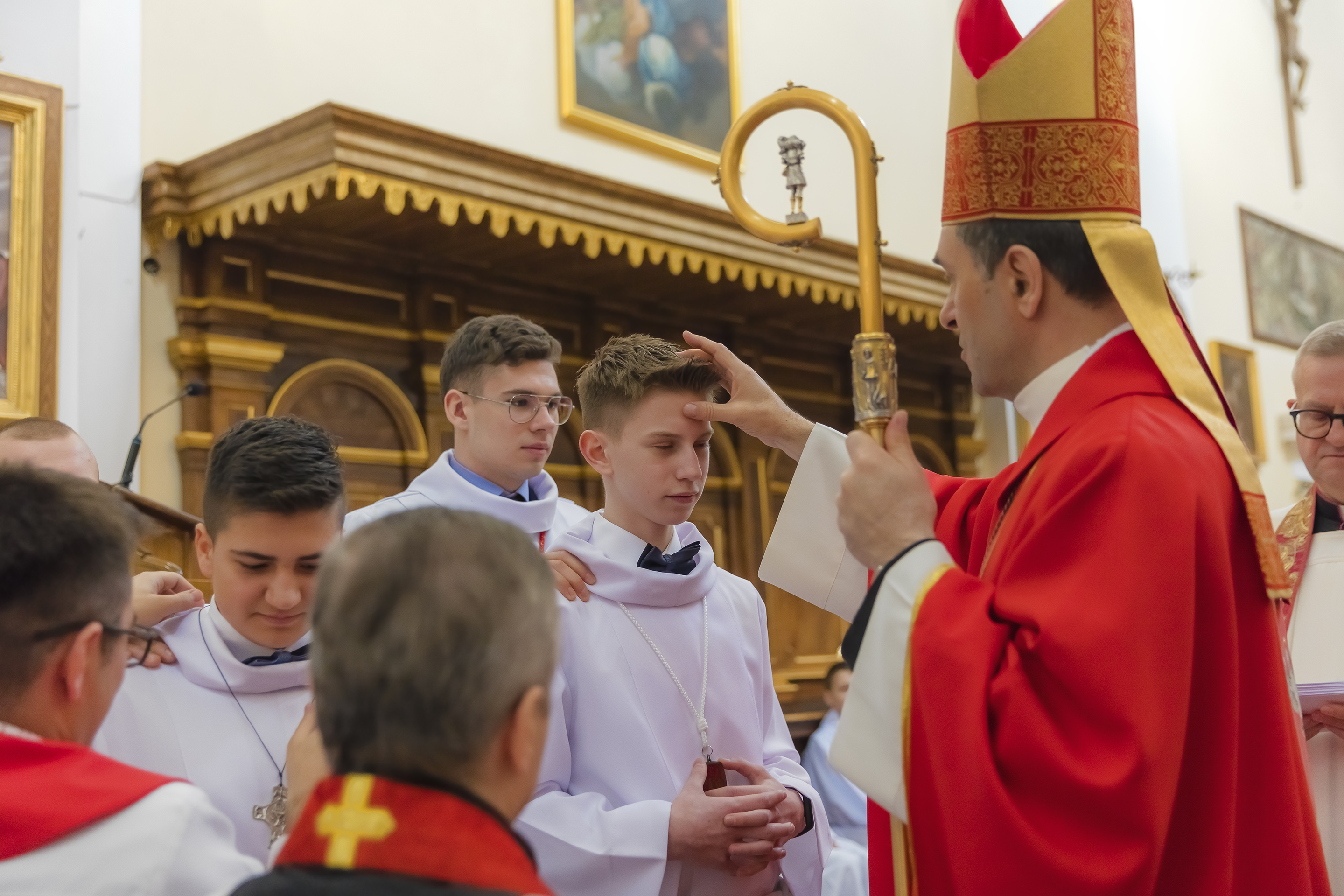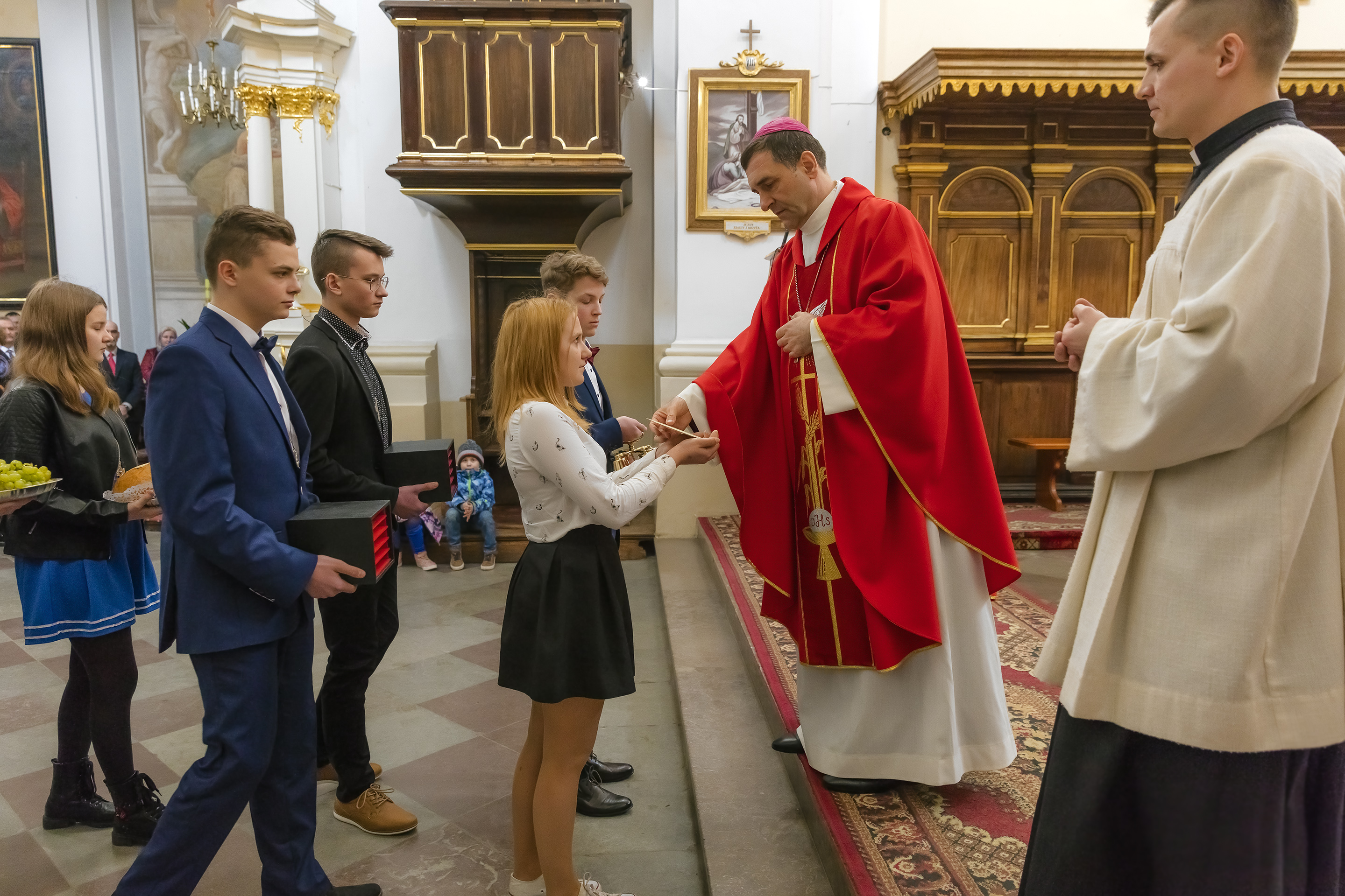 Podczas homilii skierowanej do kandydatów i towarzyszących im rodziców, rodziców chrzestnych oraz świadków, Ksiądz Biskup podkreślił, że mimo rozpoczynającego się okresu Wielkiego Postu, w którym rozważamy sprawy bolesne – Mękę Chrystusa, to jednak sam fakt przyjęcia znamion Ducha Świętego przez młodych ludzi, napawa wielką radością zarówno wspólnotę parafialną, jak i cały Kościół. Pasterz zwrócił uwagę na dwa istotne momenty: Kościół zrodził się na Golgocie, a objawił się światu w dniu Pięćdziesiątnicy. Od Golgoty do Pięćdziesiątnicy jest zatem bardzo blisko. Zesłanie Ducha Świętego nastąpiło jako owoc Męki i Śmierci Pana Jezusa. W opisie zesłania Ducha Świętego użyte są słowa twarde, nie sielankowe – te same, co w starotestamentalnym opisie przekazania Mojżeszowi Dekalogu na Synaju. Ksiądz Biskup przypomniał, że w dniu Pięćdziesiątnicy Żydzi obchodzili Święto Tygodni, czyli Święto odnowienia Prawa. Stroili synagogi na zielono, podobnie ja dziś chrześcijanie stoją swoje kościoły na Zielone Świątki. I to właśnie w tym dniu, kiedy Żydzi wspominali wydarzenia z Synaju, narodził się Kościół. Duch Święty dokonał przemiany w sercach Apostołów, którzy otrzymali nadprzyrodzone dary, o których istnieniu nie mieli nawet pojęcia i o których nawet nie marzyli: odwagę, męstwo – od tego momentu zaczęli głosić Dobrą Nowinę o zbawieniu, które przyszło w Chrystusie. Czynili to z wielkim zapałem, z wielką radością. Duch Święty pomógł im przezwyciężyć dotychczasowy lęk i duchowe zagubienie. Biskup Piotr zauważył, że Bóg bardzo często przychodzi w taką szczelinę, jaka tworzy się między naszym ludzkim lękiem, a zaufaniem, na które się zdobędziemy, na które się wzniesiemy. Jezus zapowiedział uczniom prześladowania, ale to jest mimo wszystko Dobra Nowina, choć mówi o trudnościach, o cierpieniu, o czekającym krzyżu. W Krzyżu jest ratunek, jest zbawienie, a Duch Święty pomaga w to uwierzyć, i właśnie bez lęku, a z zaufaniem to przyjąć. Sakrament Bierzmowania pomaga odnaleźć się w Kościele w czasach, gdy wielu ludzi odwraca się od Niego. Zamknięcie się na Ducha Świętego prowadzi do utraty wiary oraz spojrzenia przez jej pryzmat na Kościół. Dlatego też to Duch Święty daje mądrość nadprzyrodzoną, oświeca umysły, wyprowadza z różnorakich lęków i obaw. Wszystko to ku dojrzałości, świadomości i radości bycia uczniem Jezusa Chrystusa.
