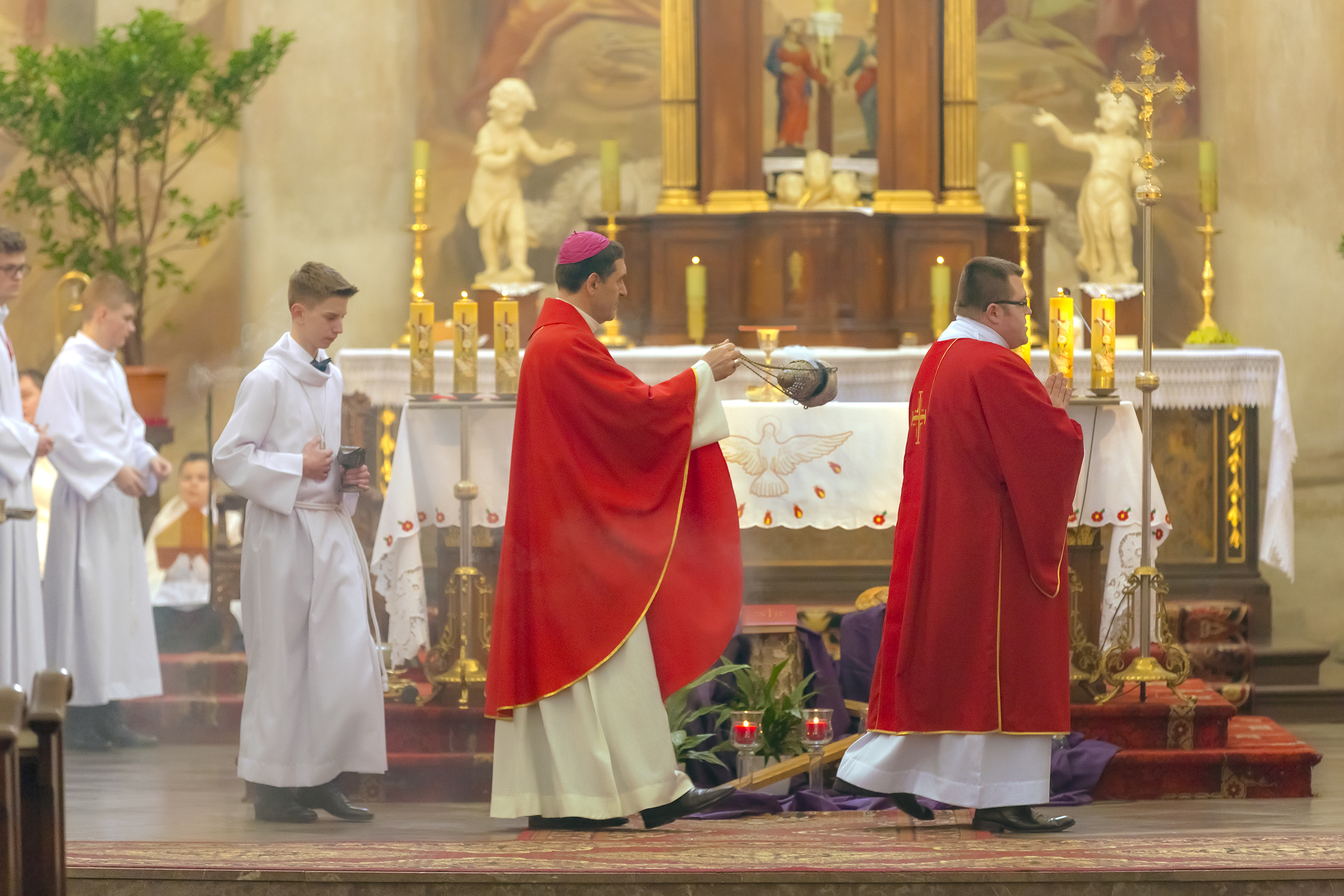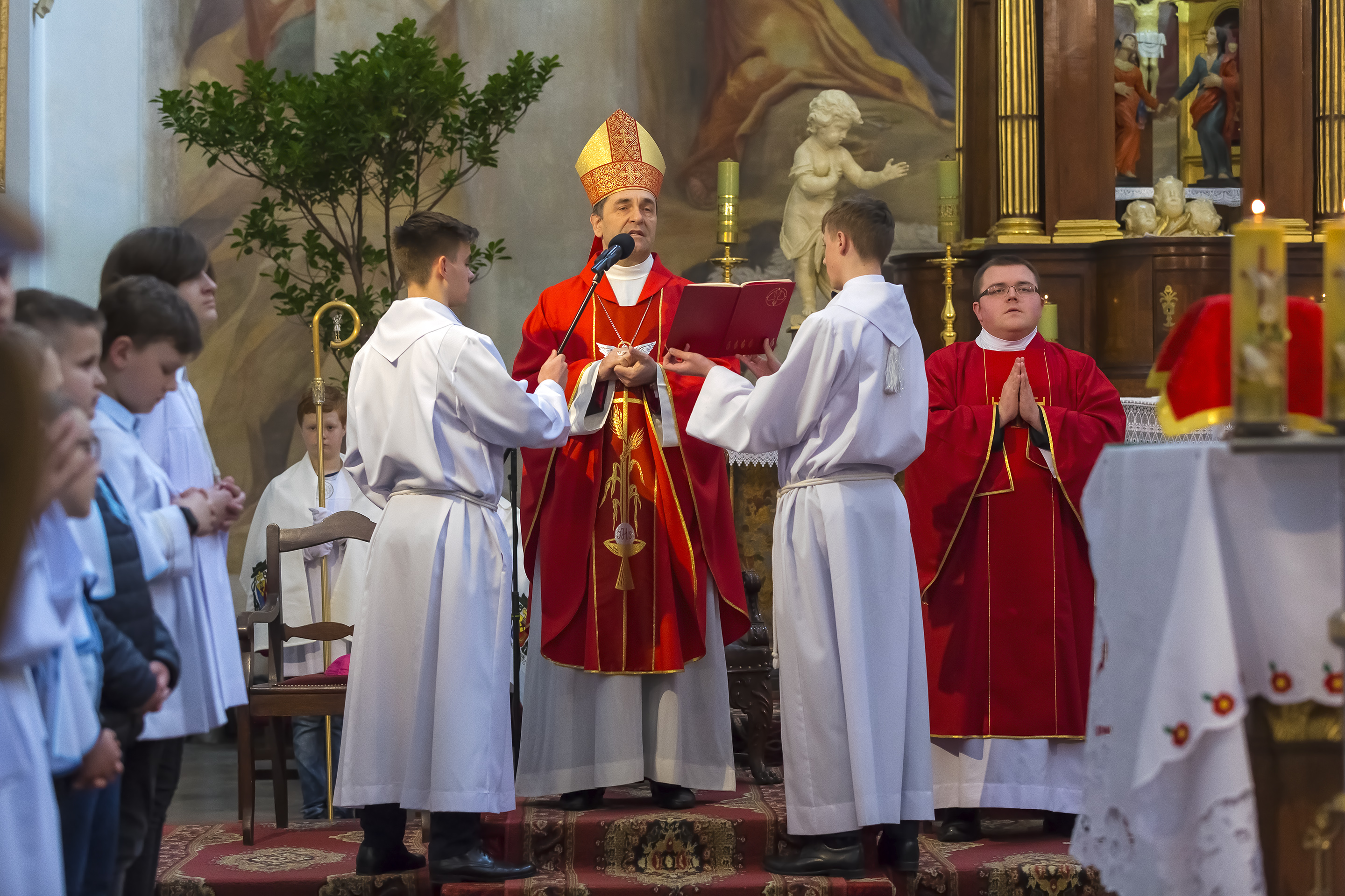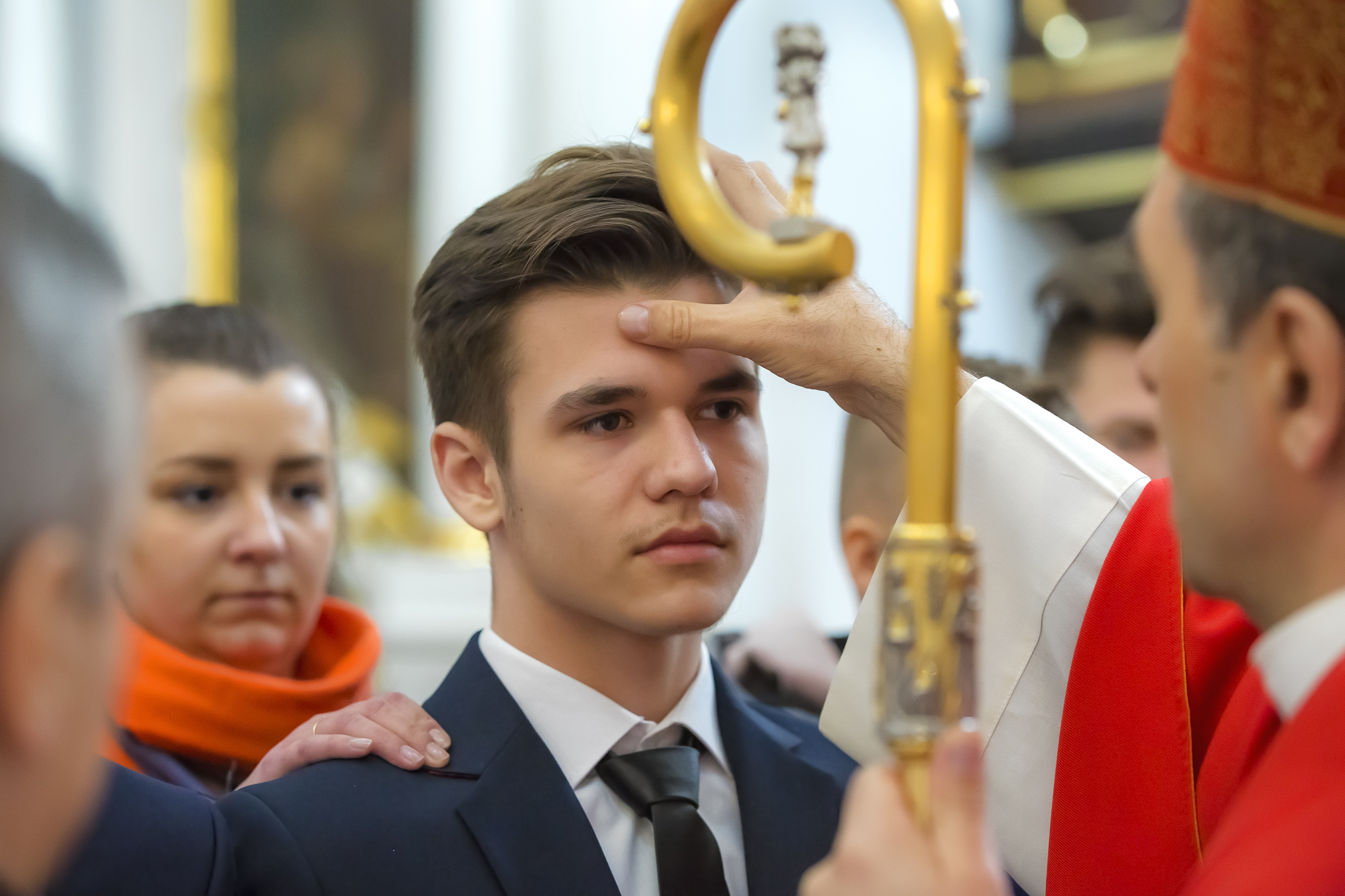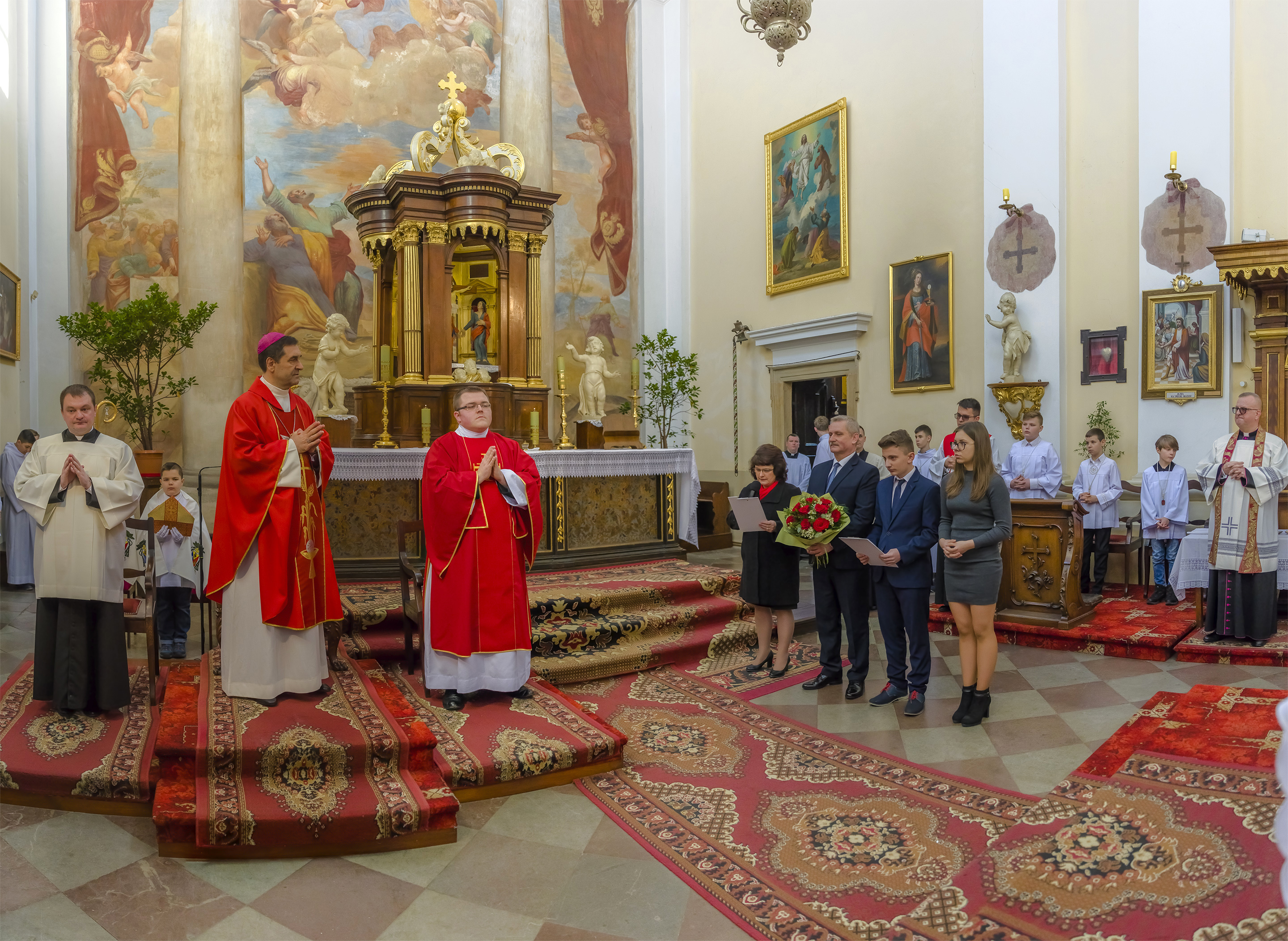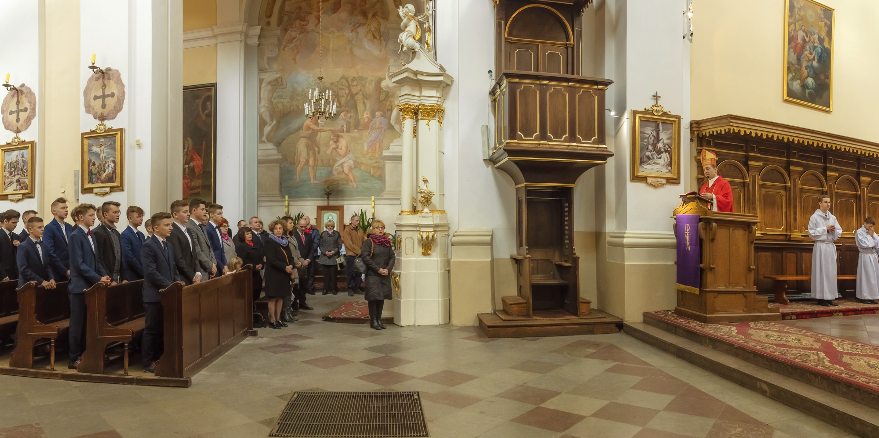Podczas homilii skierowanej do kandydatów i towarzyszących im rodziców, rodziców chrzestnych oraz świadków, Ksiądz Biskup podkreślił, że mimo rozpoczynającego się okresu Wielkiego Postu, w którym rozważamy sprawy bolesne – Mękę Chrystusa, to jednak sam fakt przyjęcia znamion Ducha Świętego przez młodych ludzi, napawa wielką radością zarówno wspólnotę parafialną, jak i cały Kościół. Pasterz zwrócił uwagę na dwa istotne momenty: Kościół zrodził się na Golgocie, a objawił się światu w dniu Pięćdziesiątnicy. Od Golgoty do Pięćdziesiątnicy jest zatem bardzo blisko. Zesłanie Ducha Świętego nastąpiło jako owoc Męki i Śmierci Pana Jezusa. W opisie zesłania Ducha Świętego użyte są słowa twarde, nie sielankowe – te same, co w starotestamentalnym opisie przekazania Mojżeszowi Dekalogu na Synaju. Ksiądz Biskup przypomniał, że w dniu Pięćdziesiątnicy Żydzi obchodzili Święto Tygodni, czyli Święto odnowienia Prawa. Stroili synagogi na zielono, podobnie ja dziś chrześcijanie stoją swoje kościoły na Zielone Świątki. I to właśnie w tym dniu, kiedy Żydzi wspominali wydarzenia z Synaju, narodził się Kościół. Duch Święty dokonał przemiany w sercach Apostołów, którzy otrzymali nadprzyrodzone dary, o których istnieniu nie mieli nawet pojęcia i o których nawet nie marzyli: odwagę, męstwo – od tego momentu zaczęli głosić Dobrą Nowinę o zbawieniu, które przyszło w Chrystusie. Czynili to z wielkim zapałem, z wielką radością. Duch Święty pomógł im przezwyciężyć dotychczasowy lęk i duchowe zagubienie. Biskup Piotr zauważył, że Bóg bardzo często przychodzi w taką szczelinę, jaka tworzy się między naszym ludzkim lękiem, a zaufaniem, na które się zdobędziemy, na które się wzniesiemy. Jezus zapowiedział uczniom prześladowania, ale to jest mimo wszystko Dobra Nowina, choć mówi o trudnościach, o cierpieniu, o czekającym krzyżu. W Krzyżu jest ratunek, jest zbawienie, a Duch Święty pomaga w to uwierzyć, i właśnie bez lęku, a z zaufaniem to przyjąć. Sakrament Bierzmowania pomaga odnaleźć się w Kościele w czasach, gdy wielu ludzi odwraca się od Niego. Zamknięcie się na Ducha Świętego prowadzi do utraty wiary oraz spojrzenia przez jej pryzmat na Kościół. Dlatego też to Duch Święty daje mądrość nadprzyrodzoną, oświeca umysły, wyprowadza z różnorakich lęków i obaw. Wszystko to ku dojrzałości, świadomości i radości bycia uczniem Jezusa Chrystusa.
