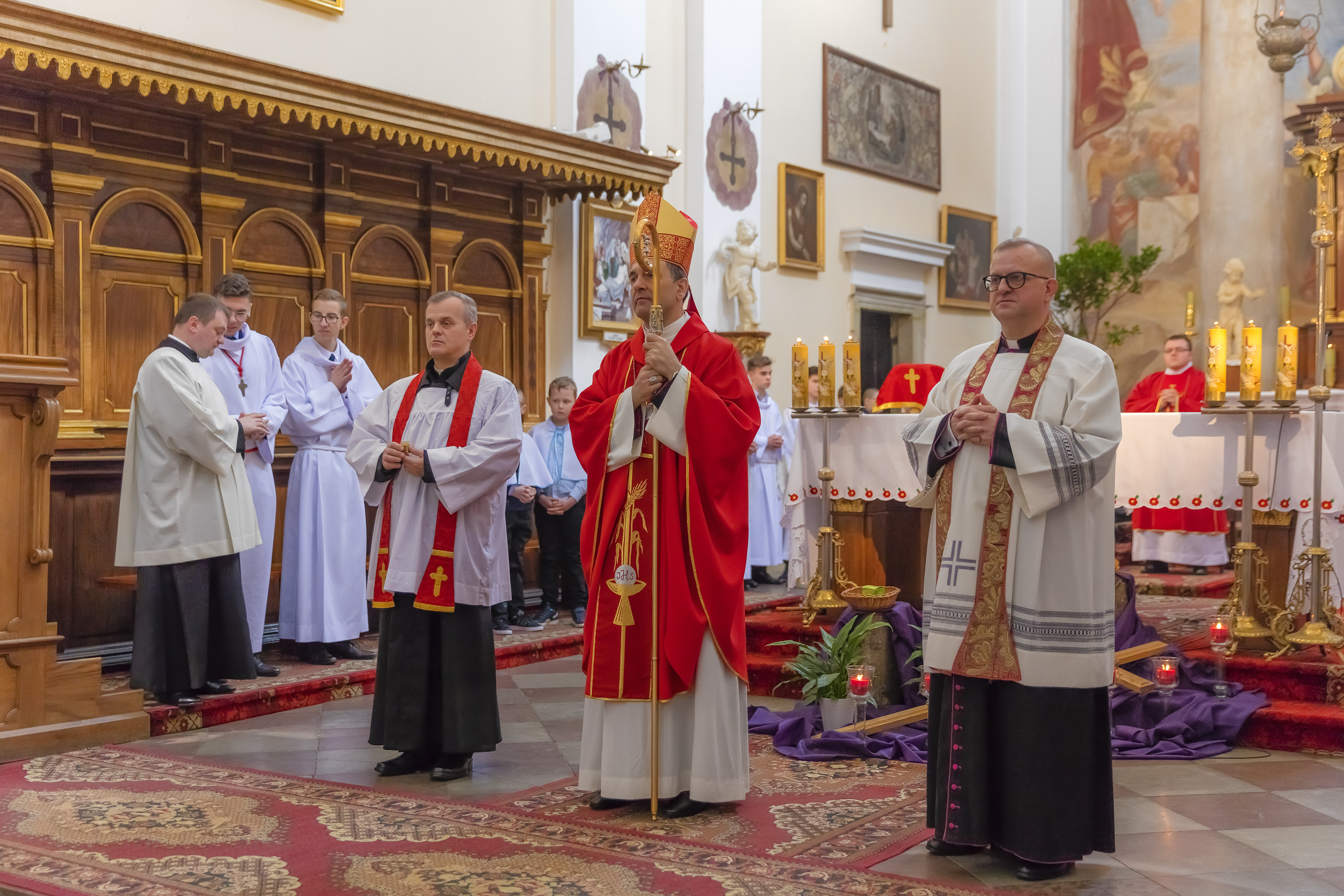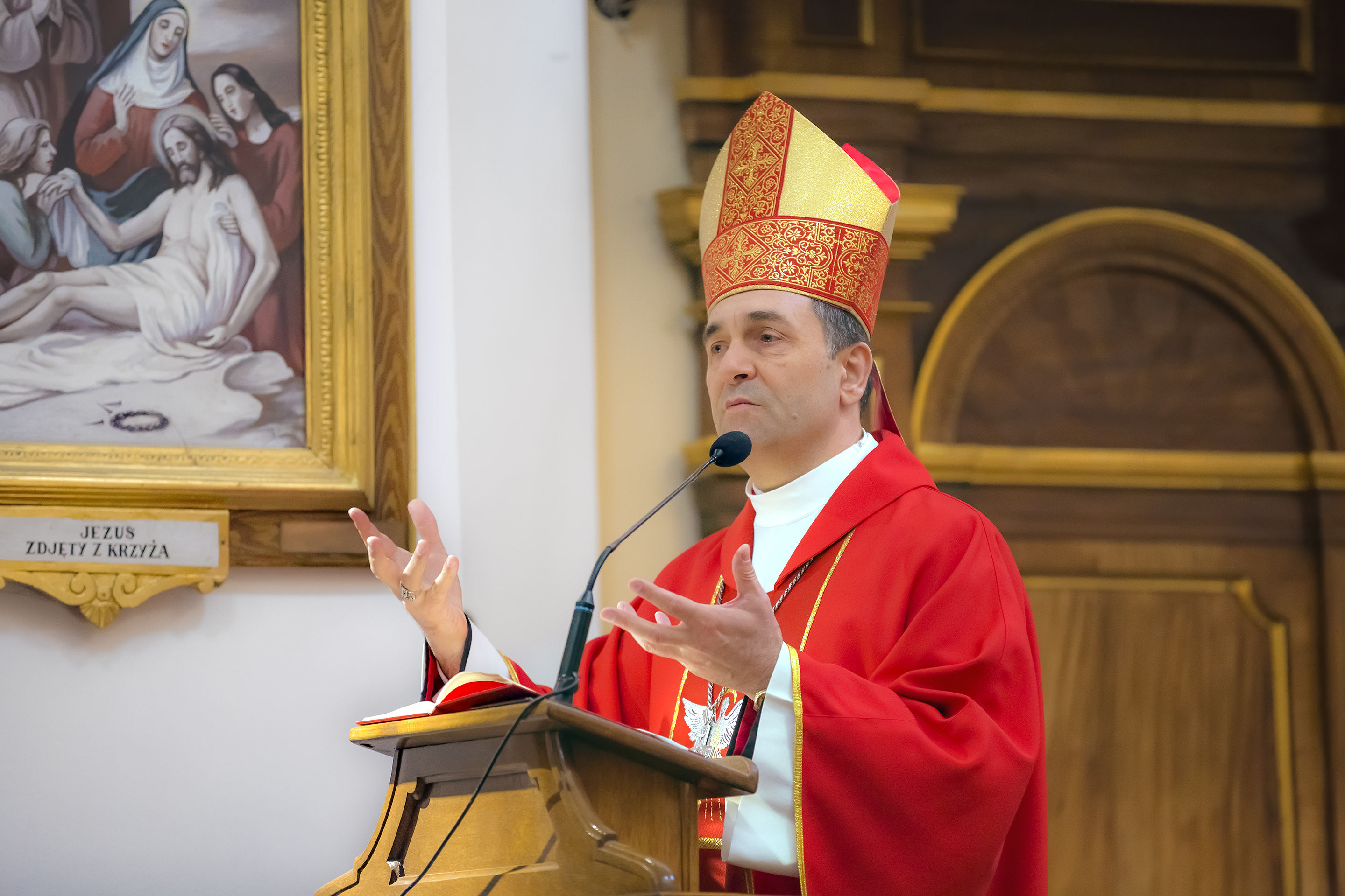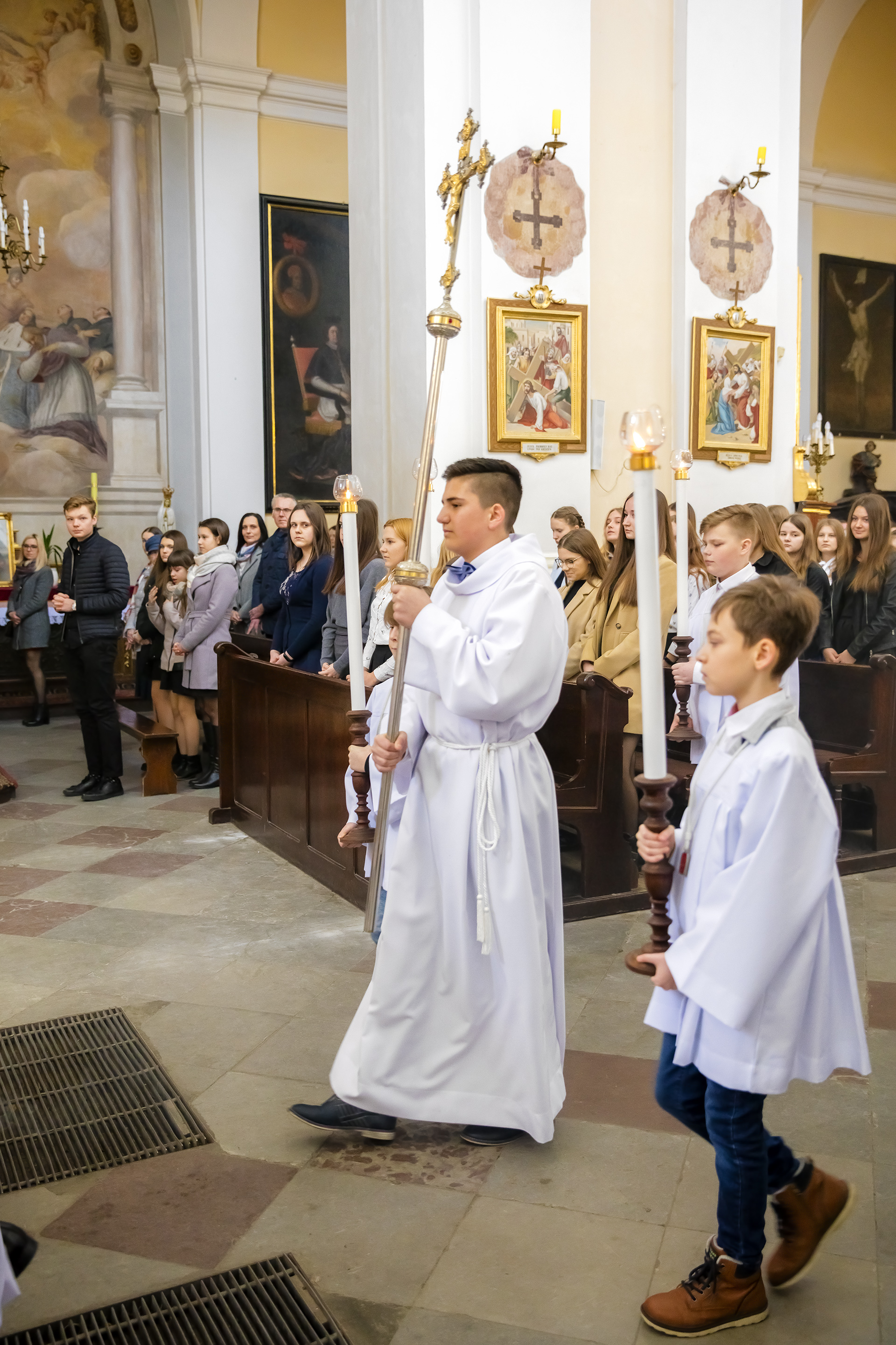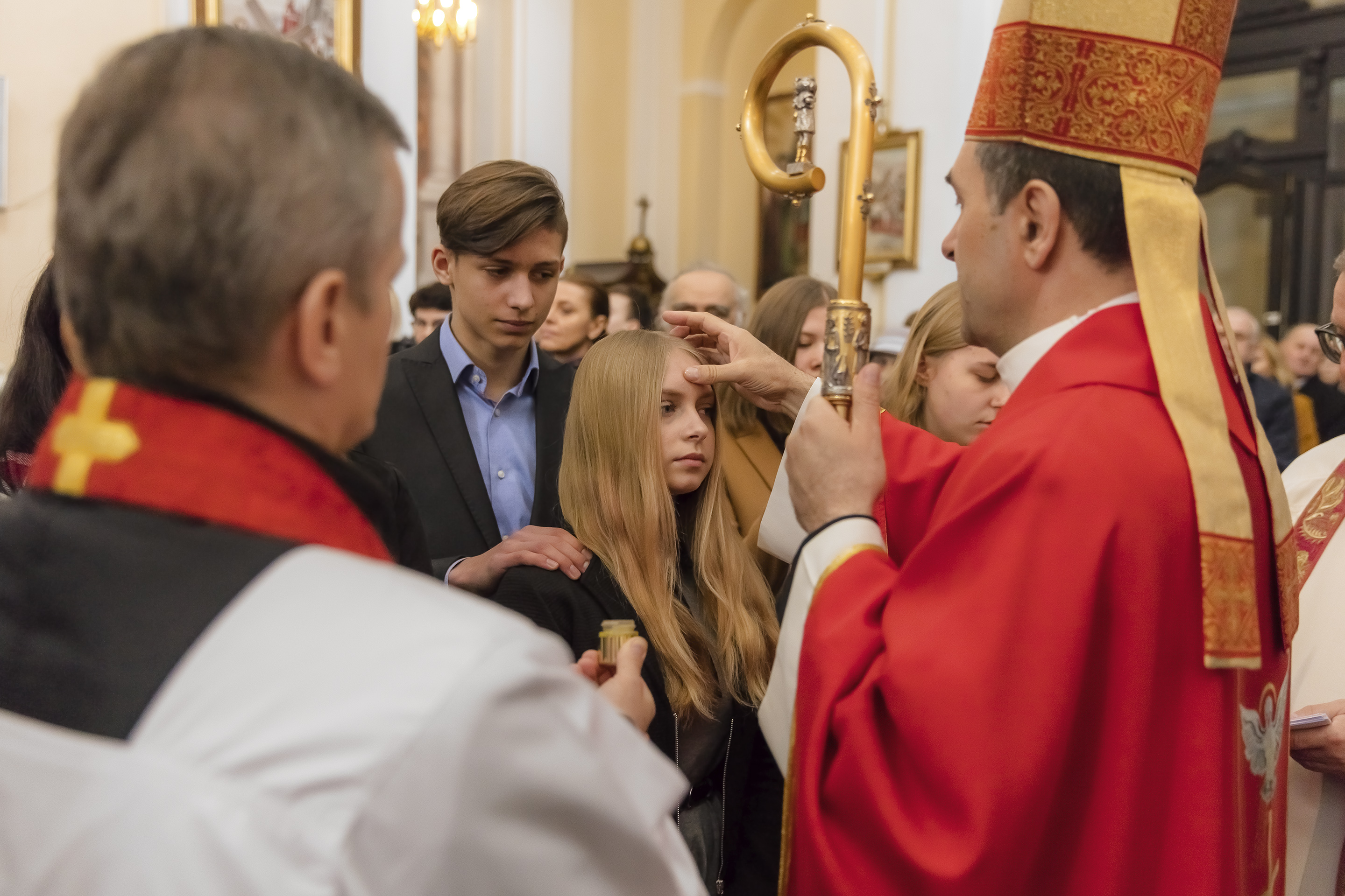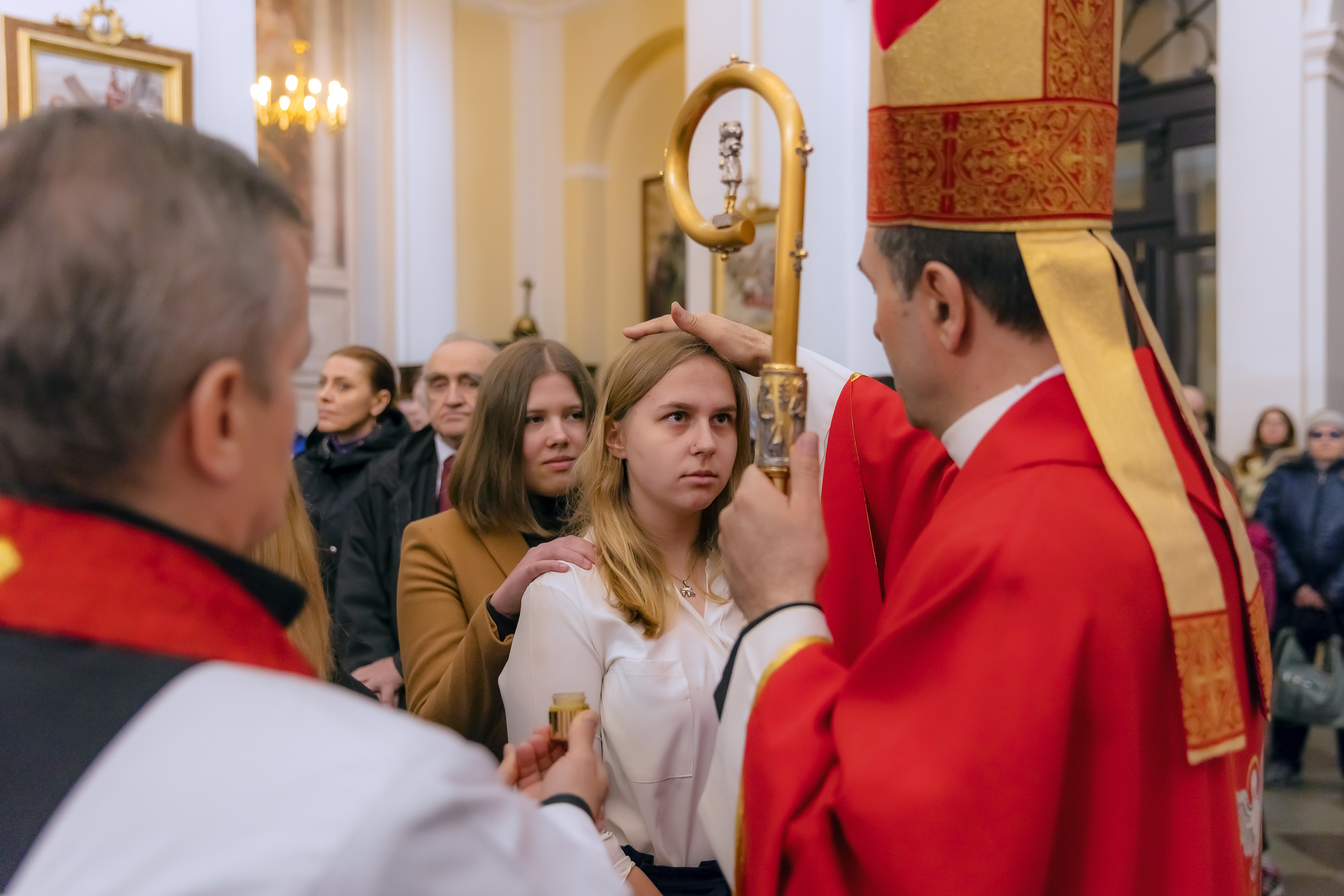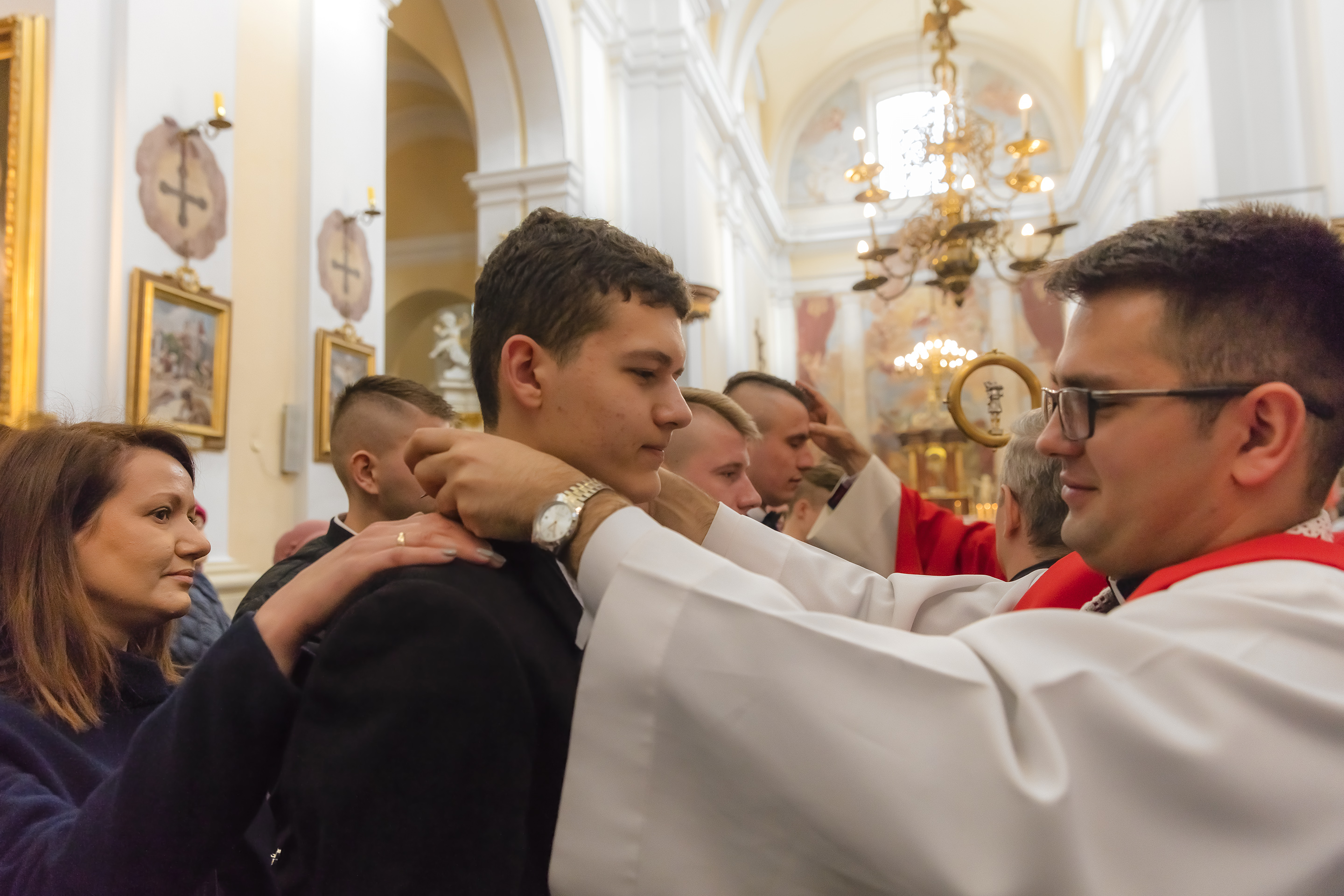Podczas homilii skierowanej do kandydatów i towarzyszących im rodziców, rodziców chrzestnych oraz świadków, Ksiądz Biskup podkreślił, że mimo rozpoczynającego się okresu Wielkiego Postu, w którym rozważamy sprawy bolesne – Mękę Chrystusa, to jednak sam fakt przyjęcia znamion Ducha Świętego przez młodych ludzi, napawa wielką radością zarówno wspólnotę parafialną, jak i cały Kościół. Pasterz zwrócił uwagę na dwa istotne momenty: Kościół zrodził się na Golgocie, a objawił się światu w dniu Pięćdziesiątnicy. Od Golgoty do Pięćdziesiątnicy jest zatem bardzo blisko. Zesłanie Ducha Świętego nastąpiło jako owoc Męki i Śmierci Pana Jezusa. W opisie zesłania Ducha Świętego użyte są słowa twarde, nie sielankowe – te same, co w starotestamentalnym opisie przekazania Mojżeszowi Dekalogu na Synaju. Ksiądz Biskup przypomniał, że w dniu Pięćdziesiątnicy Żydzi obchodzili Święto Tygodni, czyli Święto odnowienia Prawa. Stroili synagogi na zielono, podobnie ja dziś chrześcijanie stoją swoje kościoły na Zielone Świątki. I to właśnie w tym dniu, kiedy Żydzi wspominali wydarzenia z Synaju, narodził się Kościół. Duch Święty dokonał przemiany w sercach Apostołów, którzy otrzymali nadprzyrodzone dary, o których istnieniu nie mieli nawet pojęcia i o których nawet nie marzyli: odwagę, męstwo – od tego momentu zaczęli głosić Dobrą Nowinę o zbawieniu, które przyszło w Chrystusie. Czynili to z wielkim zapałem, z wielką radością. Duch Święty pomógł im przezwyciężyć dotychczasowy lęk i duchowe zagubienie. Biskup Piotr zauważył, że Bóg bardzo często przychodzi w taką szczelinę, jaka tworzy się między naszym ludzkim lękiem, a zaufaniem, na które się zdobędziemy, na które się wzniesiemy. Jezus zapowiedział uczniom prześladowania, ale to jest mimo wszystko Dobra Nowina, choć mówi o trudnościach, o cierpieniu, o czekającym krzyżu. W Krzyżu jest ratunek, jest zbawienie, a Duch Święty pomaga w to uwierzyć, i właśnie bez lęku, a z zaufaniem to przyjąć. Sakrament Bierzmowania pomaga odnaleźć się w Kościele w czasach, gdy wielu ludzi odwraca się od Niego. Zamknięcie się na Ducha Świętego prowadzi do utraty wiary oraz spojrzenia przez jej pryzmat na Kościół. Dlatego też to Duch Święty daje mądrość nadprzyrodzoną, oświeca umysły, wyprowadza z różnorakich lęków i obaw. Wszystko to ku dojrzałości, świadomości i radości bycia uczniem Jezusa Chrystusa.