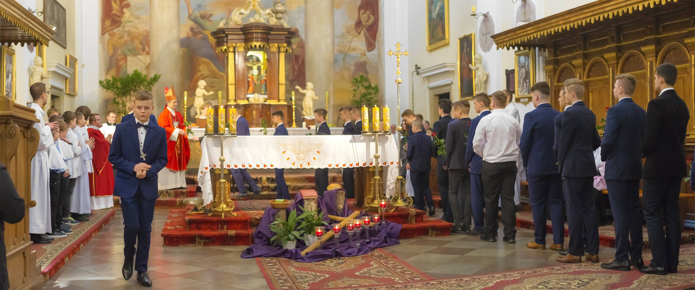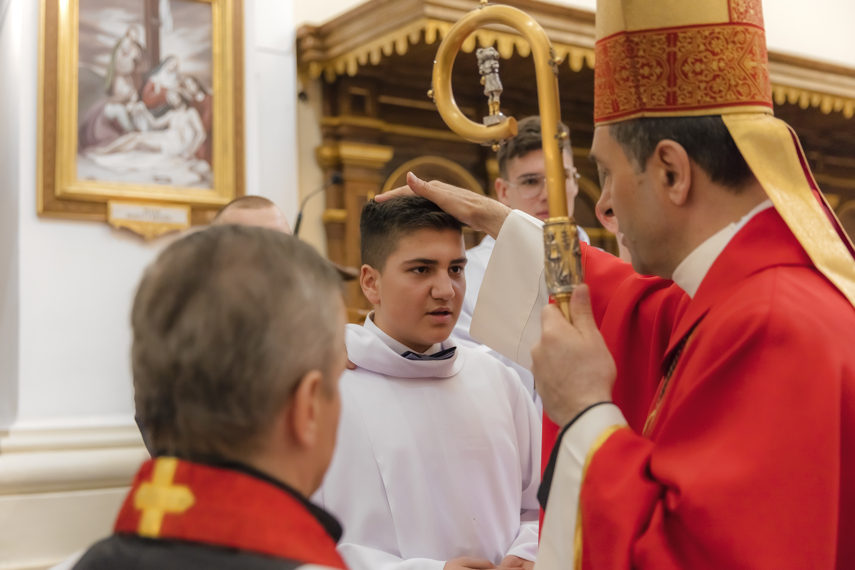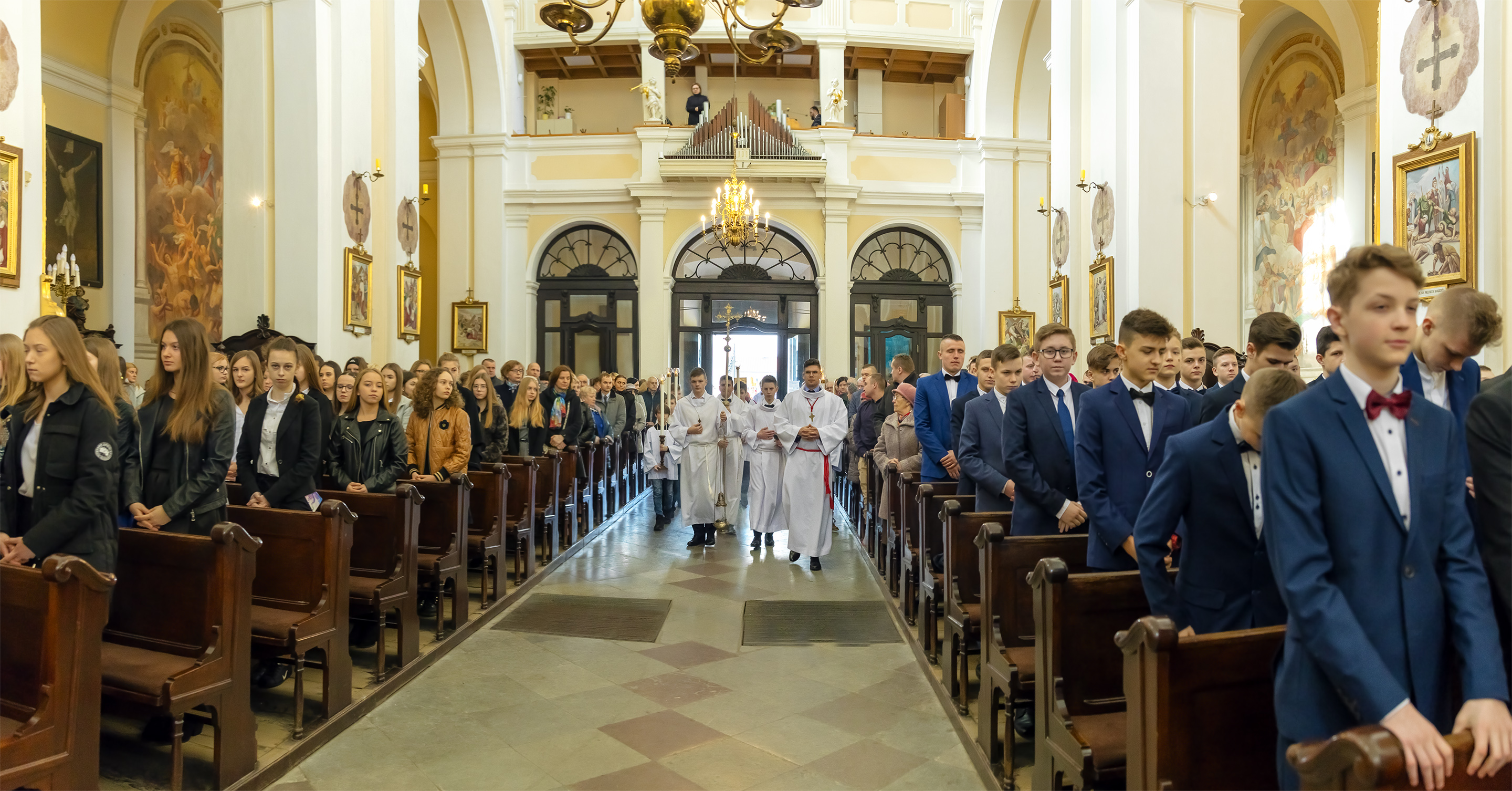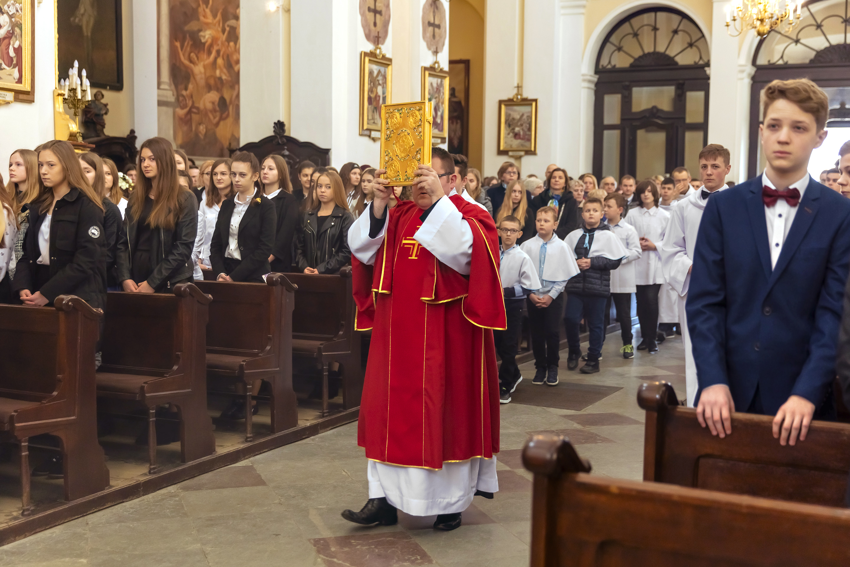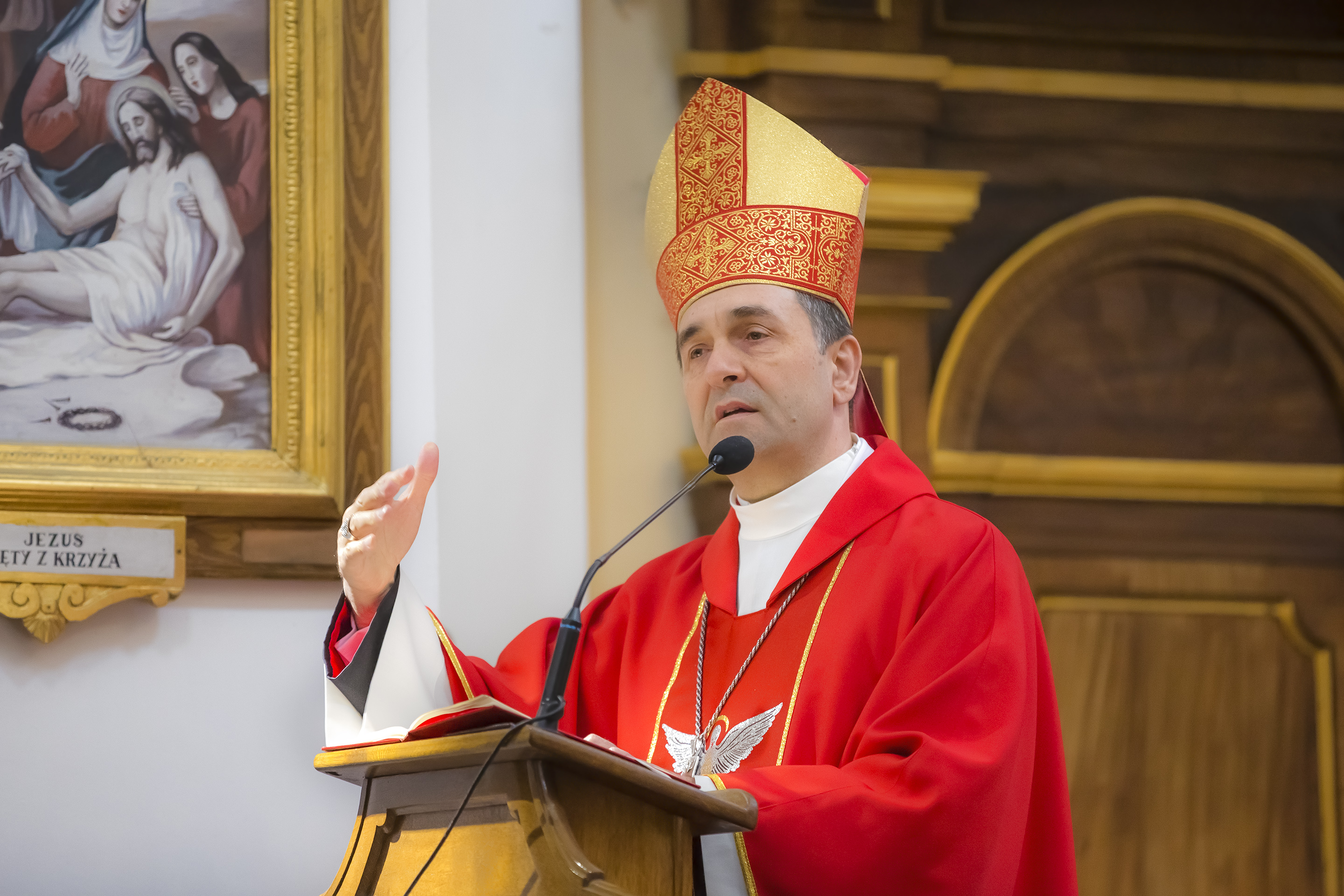 Podczas homilii skierowanej do kandydatów i towarzyszących im rodziców, rodziców chrzestnych oraz świadków, Ksiądz Biskup podkreślił, że mimo rozpoczynającego się okresu Wielkiego Postu, w którym rozważamy sprawy bolesne – Mękę Chrystusa, to jednak sam fakt przyjęcia znamion Ducha Świętego przez młodych ludzi, napawa wielką radością zarówno wspólnotę parafialną, jak i cały Kościół. Pasterz zwrócił uwagę na dwa istotne momenty: Kościół zrodził się na Golgocie, a objawił się światu w dniu Pięćdziesiątnicy. Od Golgoty do Pięćdziesiątnicy jest zatem bardzo blisko. Zesłanie Ducha Świętego nastąpiło jako owoc Męki i Śmierci Pana Jezusa. W opisie zesłania Ducha Świętego użyte są słowa twarde, nie sielankowe – te same, co w starotestamentalnym opisie przekazania Mojżeszowi Dekalogu na Synaju. Ksiądz Biskup przypomniał, że w dniu Pięćdziesiątnicy Żydzi obchodzili Święto Tygodni, czyli Święto odnowienia Prawa. Stroili synagogi na zielono, podobnie ja dziś chrześcijanie stoją swoje kościoły na Zielone Świątki. I to właśnie w tym dniu, kiedy Żydzi wspominali wydarzenia z Synaju, narodził się Kościół. Duch Święty dokonał przemiany w sercach Apostołów, którzy otrzymali nadprzyrodzone dary, o których istnieniu nie mieli nawet pojęcia i o których nawet nie marzyli: odwagę, męstwo – od tego momentu zaczęli głosić Dobrą Nowinę o zbawieniu, które przyszło w Chrystusie. Czynili to z wielkim zapałem, z wielką radością. Duch Święty pomógł im przezwyciężyć dotychczasowy lęk i duchowe zagubienie. Biskup Piotr zauważył, że Bóg bardzo często przychodzi w taką szczelinę, jaka tworzy się między naszym ludzkim lękiem, a zaufaniem, na które się zdobędziemy, na które się wzniesiemy. Jezus zapowiedział uczniom prześladowania, ale to jest mimo wszystko Dobra Nowina, choć mówi o trudnościach, o cierpieniu, o czekającym krzyżu. W Krzyżu jest ratunek, jest zbawienie, a Duch Święty pomaga w to uwierzyć, i właśnie bez lęku, a z zaufaniem to przyjąć. Sakrament Bierzmowania pomaga odnaleźć się w Kościele w czasach, gdy wielu ludzi odwraca się od Niego. Zamknięcie się na Ducha Świętego prowadzi do utraty wiary oraz spojrzenia przez jej pryzmat na Kościół. Dlatego też to Duch Święty daje mądrość nadprzyrodzoną, oświeca umysły, wyprowadza z różnorakich lęków i obaw. Wszystko to ku dojrzałości, świadomości i radości bycia uczniem Jezusa Chrystusa.