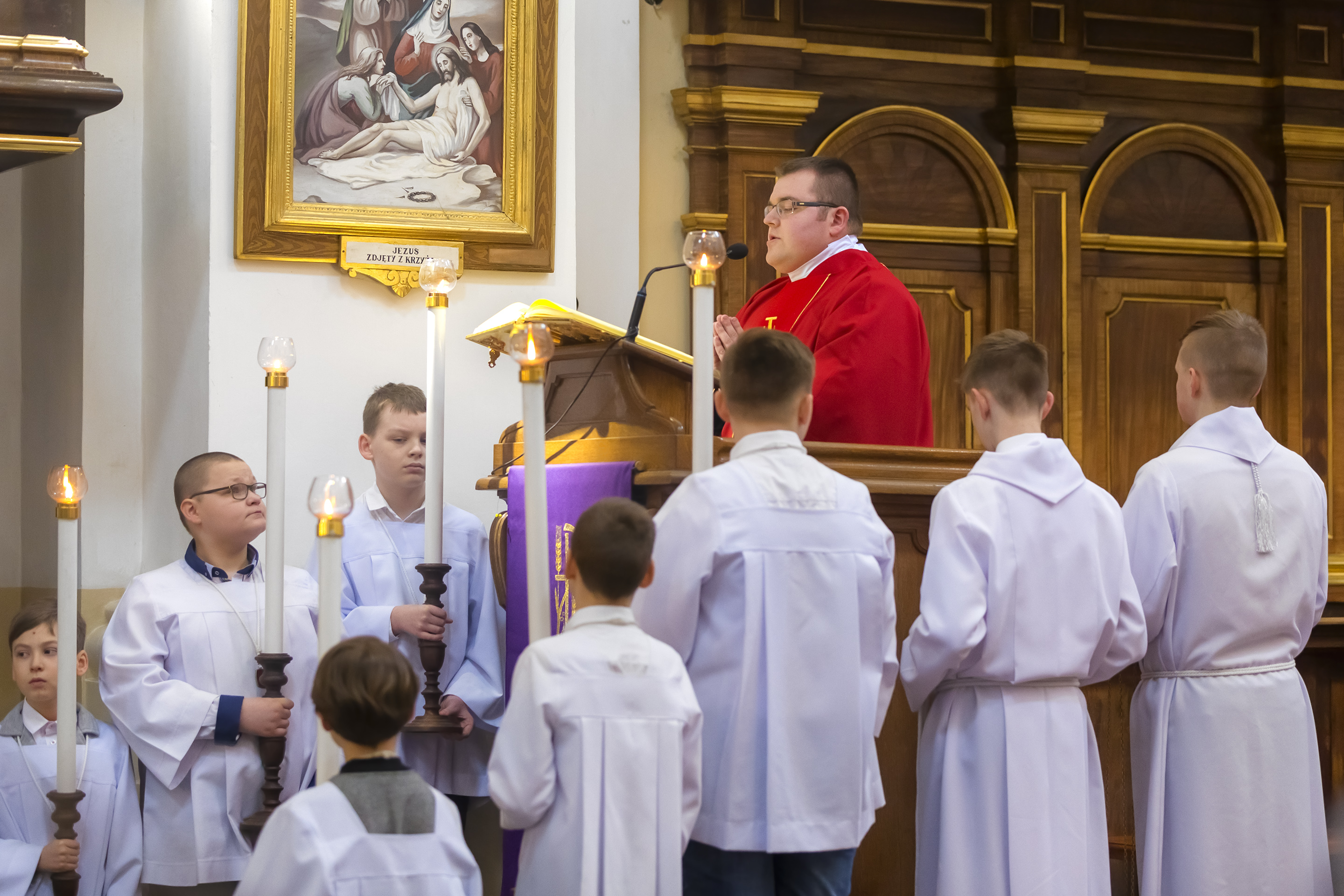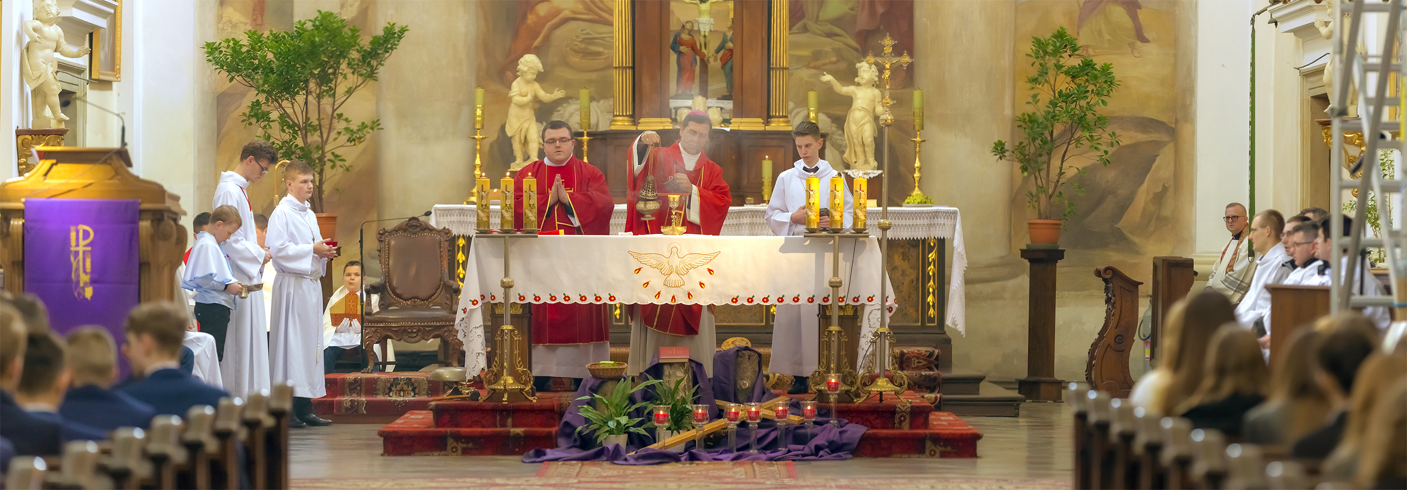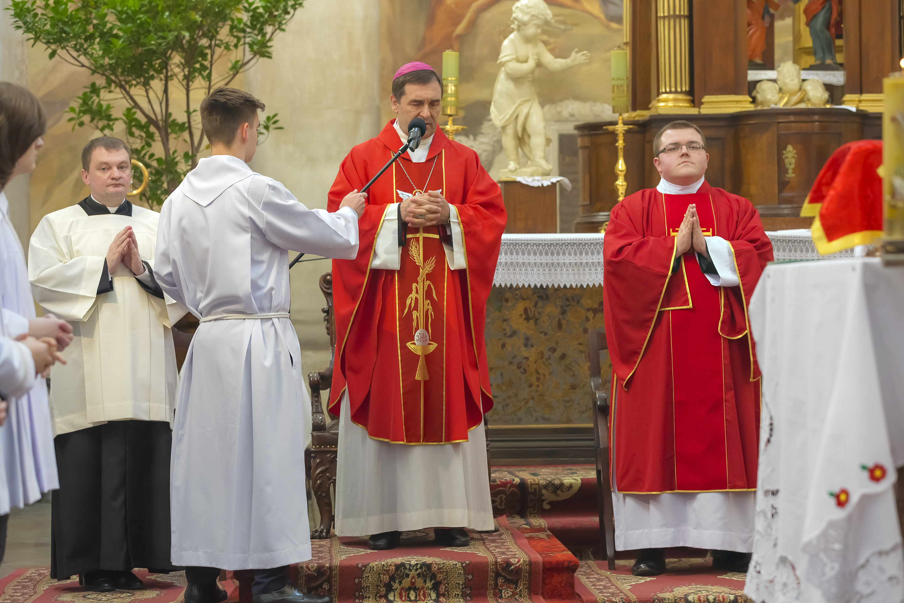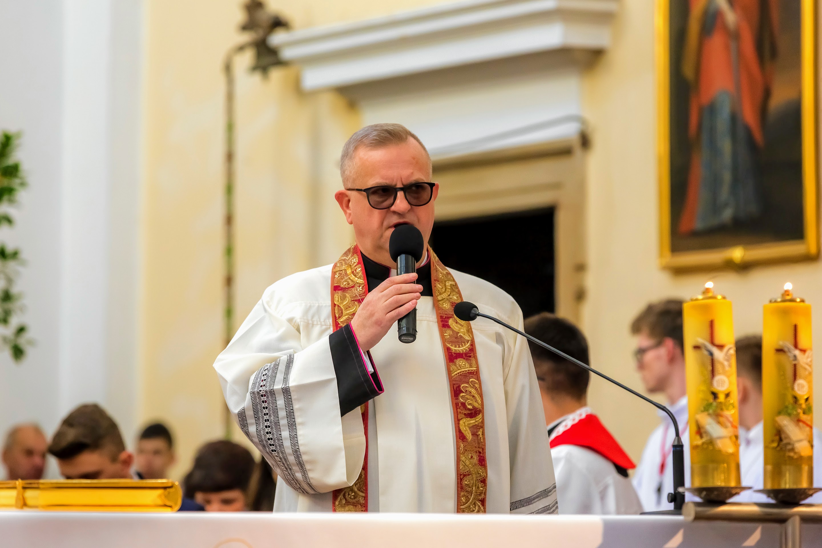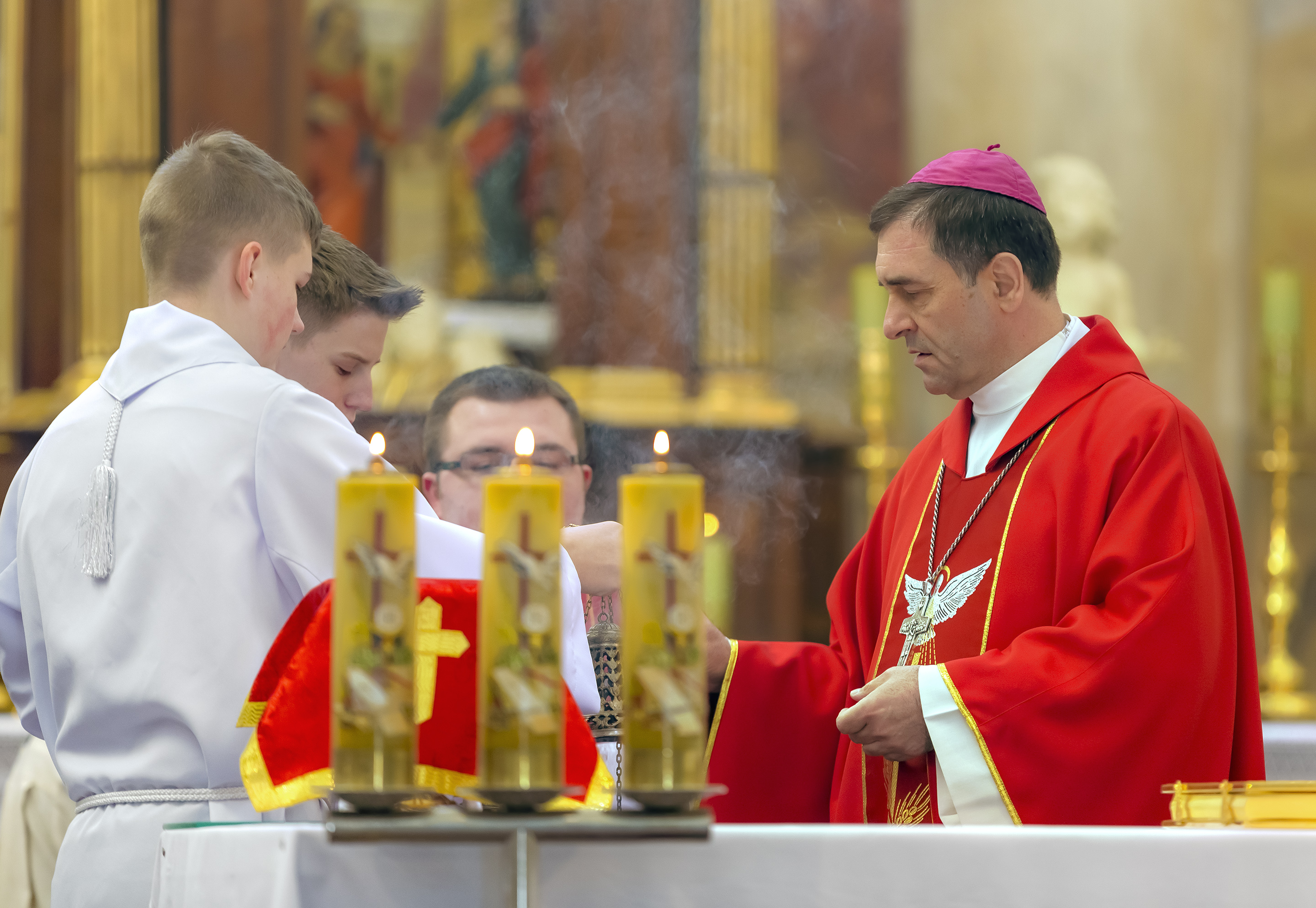 Podczas homilii skierowanej do kandydatów i towarzyszących im rodziców, rodziców chrzestnych oraz świadków, Ksiądz Biskup podkreślił, że mimo rozpoczynającego się okresu Wielkiego Postu, w którym rozważamy sprawy bolesne – Mękę Chrystusa, to jednak sam fakt przyjęcia znamion Ducha Świętego przez młodych ludzi, napawa wielką radością zarówno wspólnotę parafialną, jak i cały Kościół. Pasterz zwrócił uwagę na dwa istotne momenty: Kościół zrodził się na Golgocie, a objawił się światu w dniu Pięćdziesiątnicy. Od Golgoty do Pięćdziesiątnicy jest zatem bardzo blisko. Zesłanie Ducha Świętego nastąpiło jako owoc Męki i Śmierci Pana Jezusa. W opisie zesłania Ducha Świętego użyte są słowa twarde, nie sielankowe – te same, co w starotestamentalnym opisie przekazania Mojżeszowi Dekalogu na Synaju. Ksiądz Biskup przypomniał, że w dniu Pięćdziesiątnicy Żydzi obchodzili Święto Tygodni, czyli Święto odnowienia Prawa. Stroili synagogi na zielono, podobnie ja dziś chrześcijanie stoją swoje kościoły na Zielone Świątki. I to właśnie w tym dniu, kiedy Żydzi wspominali wydarzenia z Synaju, narodził się Kościół. Duch Święty dokonał przemiany w sercach Apostołów, którzy otrzymali nadprzyrodzone dary, o których istnieniu nie mieli nawet pojęcia i o których nawet nie marzyli: odwagę, męstwo – od tego momentu zaczęli głosić Dobrą Nowinę o zbawieniu, które przyszło w Chrystusie. Czynili to z wielkim zapałem, z wielką radością. Duch Święty pomógł im przezwyciężyć dotychczasowy lęk i duchowe zagubienie. Biskup Piotr zauważył, że Bóg bardzo często przychodzi w taką szczelinę, jaka tworzy się między naszym ludzkim lękiem, a zaufaniem, na które się zdobędziemy, na które się wzniesiemy. Jezus zapowiedział uczniom prześladowania, ale to jest mimo wszystko Dobra Nowina, choć mówi o trudnościach, o cierpieniu, o czekającym krzyżu. W Krzyżu jest ratunek, jest zbawienie, a Duch Święty pomaga w to uwierzyć, i właśnie bez lęku, a z zaufaniem to przyjąć. Sakrament Bierzmowania pomaga odnaleźć się w Kościele w czasach, gdy wielu ludzi odwraca się od Niego. Zamknięcie się na Ducha Świętego prowadzi do utraty wiary oraz spojrzenia przez jej pryzmat na Kościół. Dlatego też to Duch Święty daje mądrość nadprzyrodzoną, oświeca umysły, wyprowadza z różnorakich lęków i obaw. Wszystko to ku dojrzałości, świadomości i radości bycia uczniem Jezusa Chrystusa.