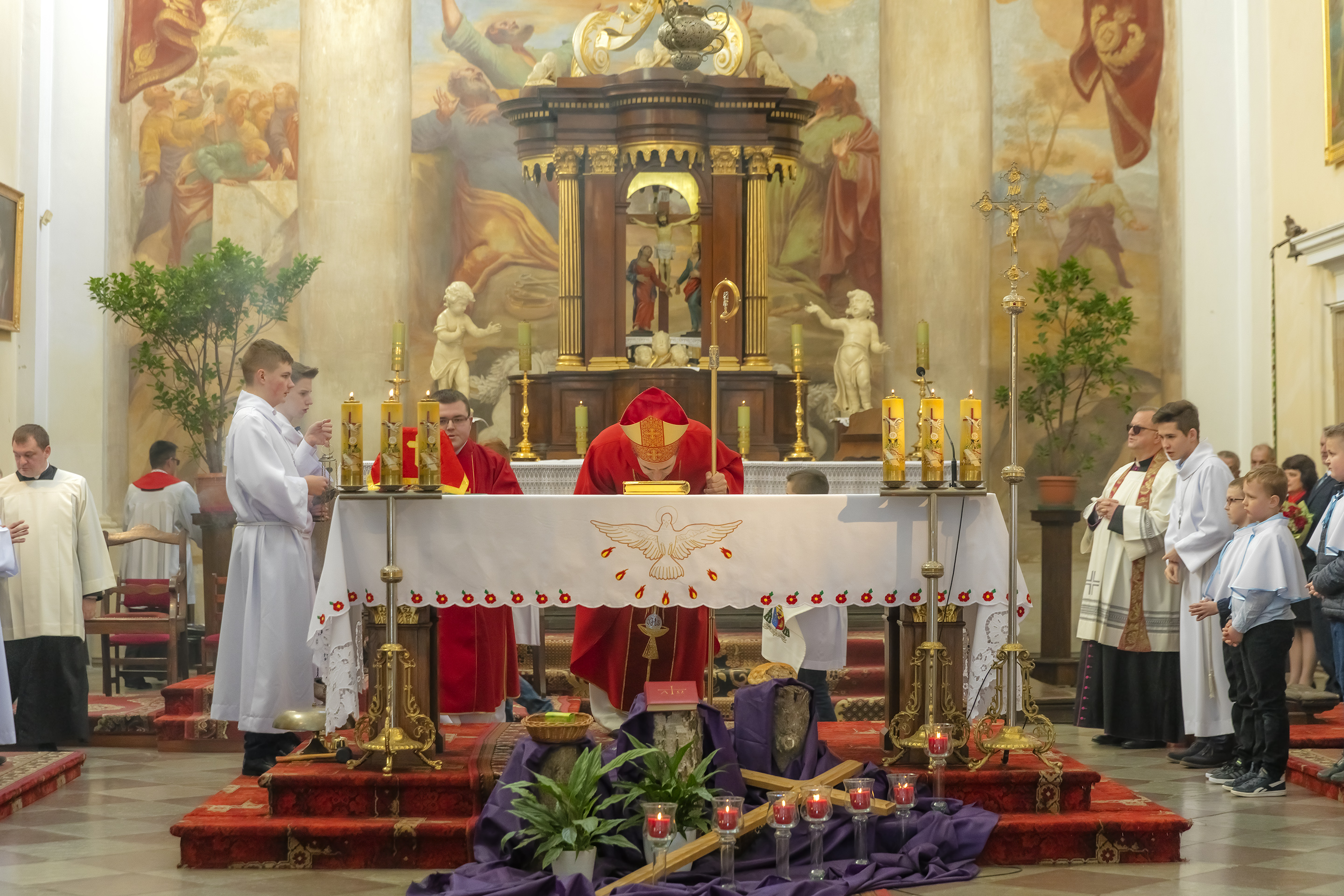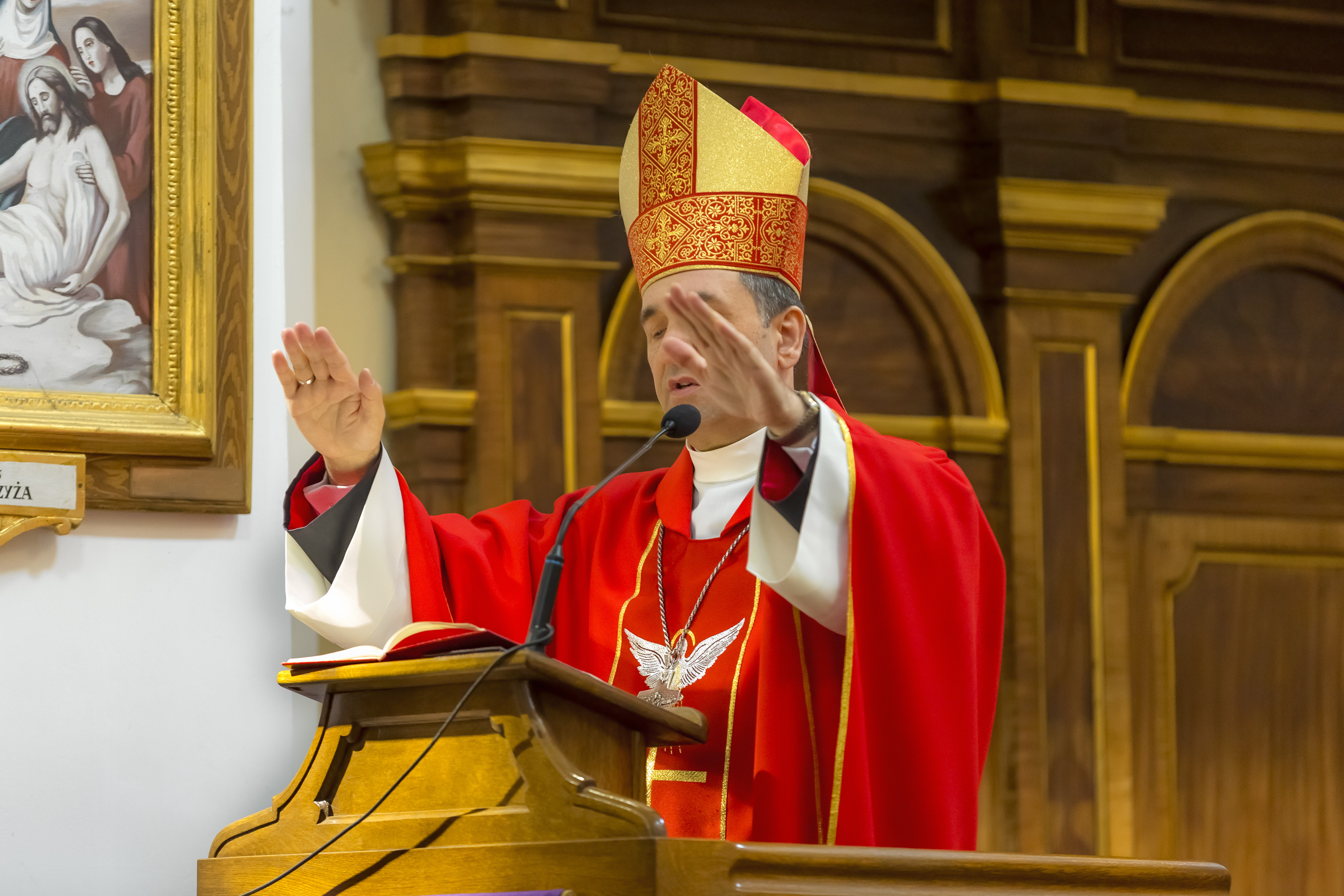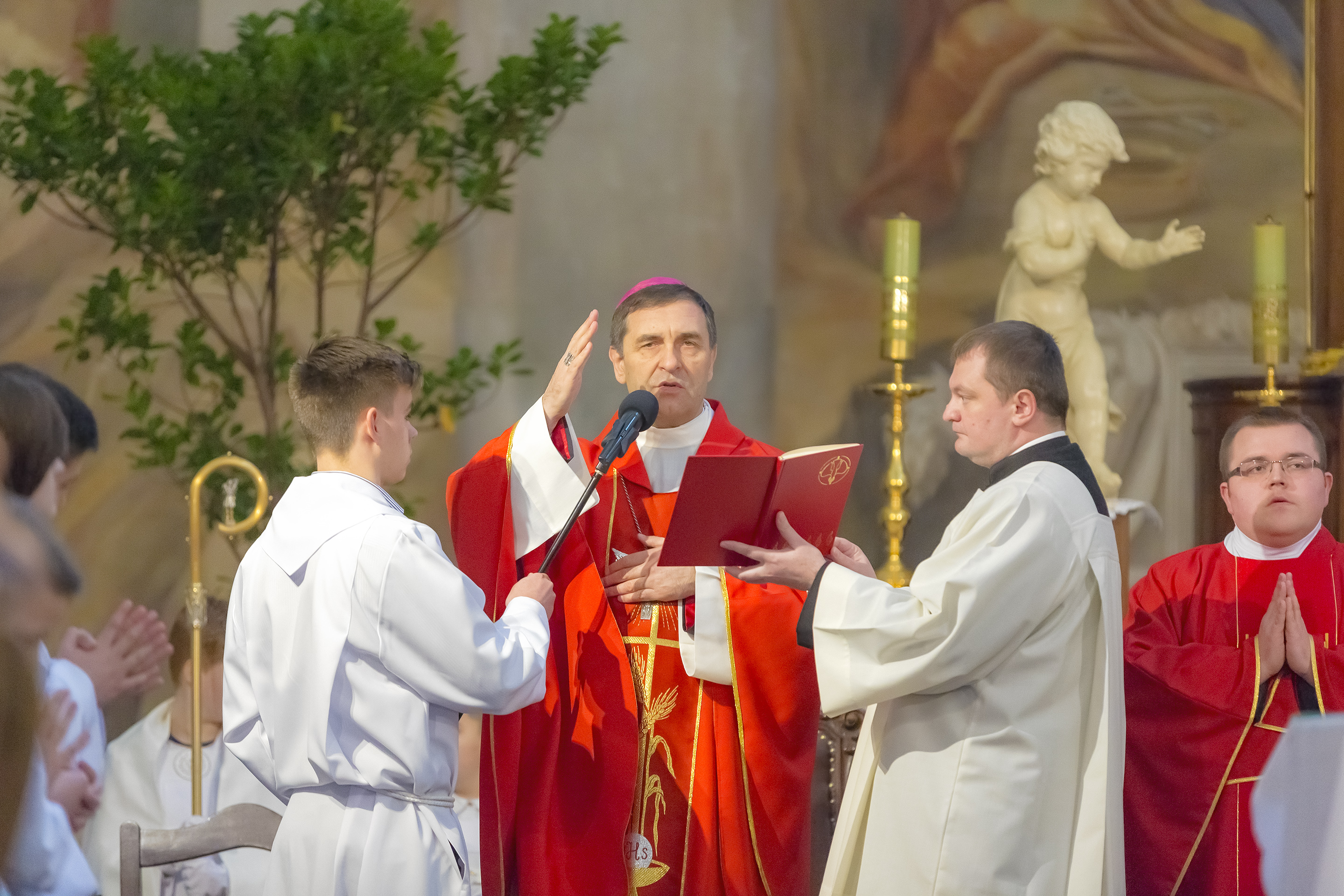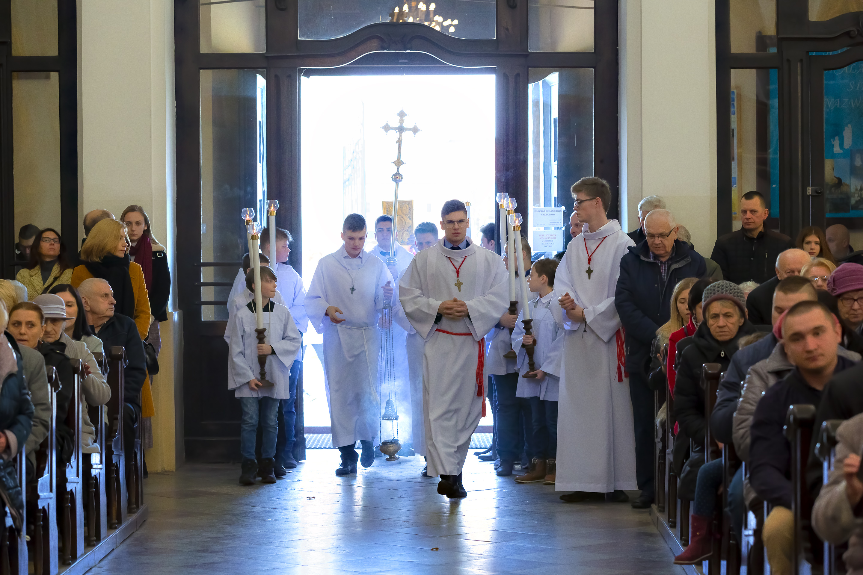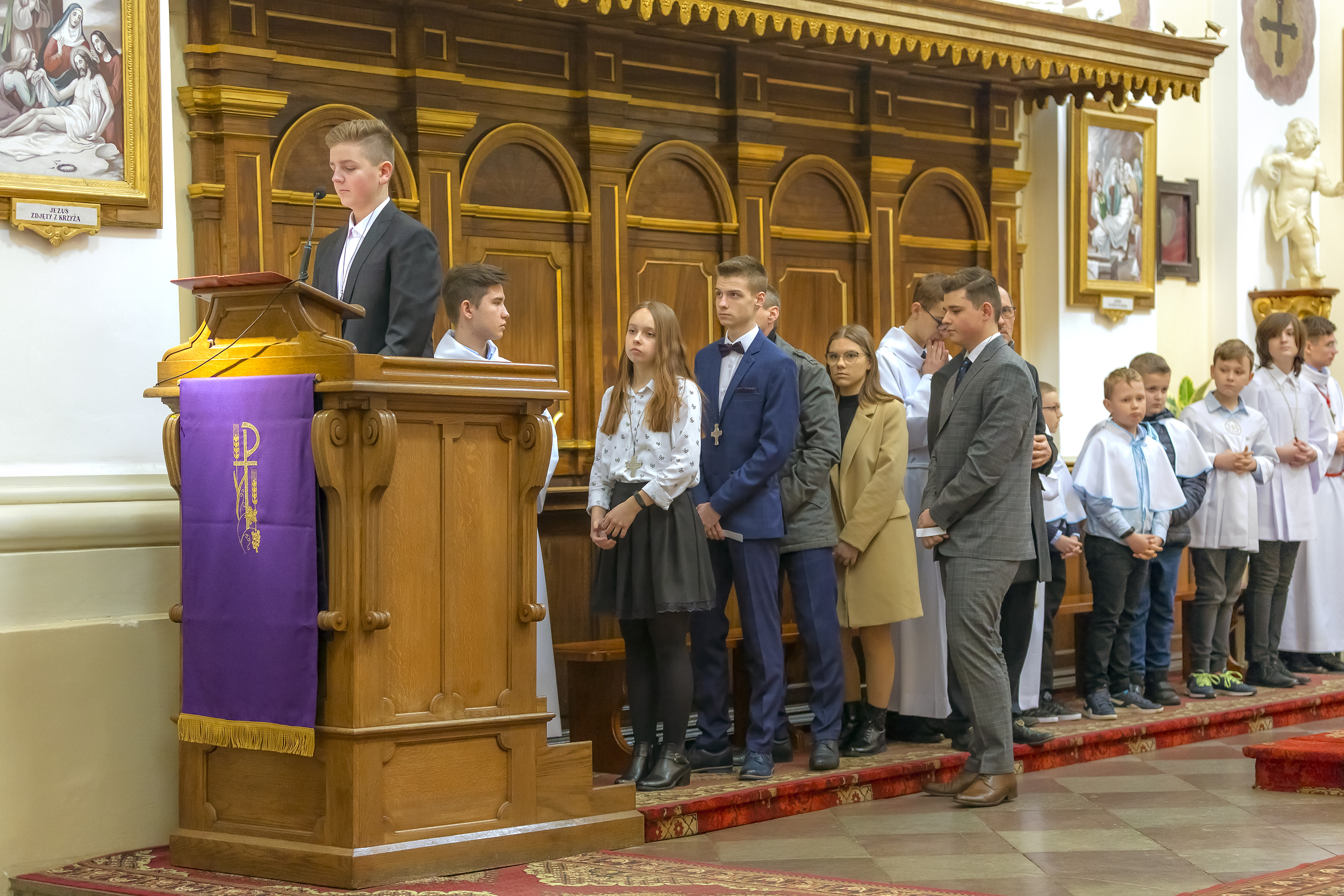 Podczas homilii skierowanej do kandydatów i towarzyszących im rodziców, rodziców chrzestnych oraz świadków, Ksiądz Biskup podkreślił, że mimo rozpoczynającego się okresu Wielkiego Postu, w którym rozważamy sprawy bolesne – Mękę Chrystusa, to jednak sam fakt przyjęcia znamion Ducha Świętego przez młodych ludzi, napawa wielką radością zarówno wspólnotę parafialną, jak i cały Kościół. Pasterz zwrócił uwagę na dwa istotne momenty: Kościół zrodził się na Golgocie, a objawił się światu w dniu Pięćdziesiątnicy. Od Golgoty do Pięćdziesiątnicy jest zatem bardzo blisko. Zesłanie Ducha Świętego nastąpiło jako owoc Męki i Śmierci Pana Jezusa. W opisie zesłania Ducha Świętego użyte są słowa twarde, nie sielankowe – te same, co w starotestamentalnym opisie przekazania Mojżeszowi Dekalogu na Synaju. Ksiądz Biskup przypomniał, że w dniu Pięćdziesiątnicy Żydzi obchodzili Święto Tygodni, czyli Święto odnowienia Prawa. Stroili synagogi na zielono, podobnie ja dziś chrześcijanie stoją swoje kościoły na Zielone Świątki. I to właśnie w tym dniu, kiedy Żydzi wspominali wydarzenia z Synaju, narodził się Kościół. Duch Święty dokonał przemiany w sercach Apostołów, którzy otrzymali nadprzyrodzone dary, o których istnieniu nie mieli nawet pojęcia i o których nawet nie marzyli: odwagę, męstwo – od tego momentu zaczęli głosić Dobrą Nowinę o zbawieniu, które przyszło w Chrystusie. Czynili to z wielkim zapałem, z wielką radością. Duch Święty pomógł im przezwyciężyć dotychczasowy lęk i duchowe zagubienie. Biskup Piotr zauważył, że Bóg bardzo często przychodzi w taką szczelinę, jaka tworzy się między naszym ludzkim lękiem, a zaufaniem, na które się zdobędziemy, na które się wzniesiemy. Jezus zapowiedział uczniom prześladowania, ale to jest mimo wszystko Dobra Nowina, choć mówi o trudnościach, o cierpieniu, o czekającym krzyżu. W Krzyżu jest ratunek, jest zbawienie, a Duch Święty pomaga w to uwierzyć, i właśnie bez lęku, a z zaufaniem to przyjąć. Sakrament Bierzmowania pomaga odnaleźć się w Kościele w czasach, gdy wielu ludzi odwraca się od Niego. Zamknięcie się na Ducha Świętego prowadzi do utraty wiary oraz spojrzenia przez jej pryzmat na Kościół. Dlatego też to Duch Święty daje mądrość nadprzyrodzoną, oświeca umysły, wyprowadza z różnorakich lęków i obaw. Wszystko to ku dojrzałości, świadomości i radości bycia uczniem Jezusa Chrystusa.