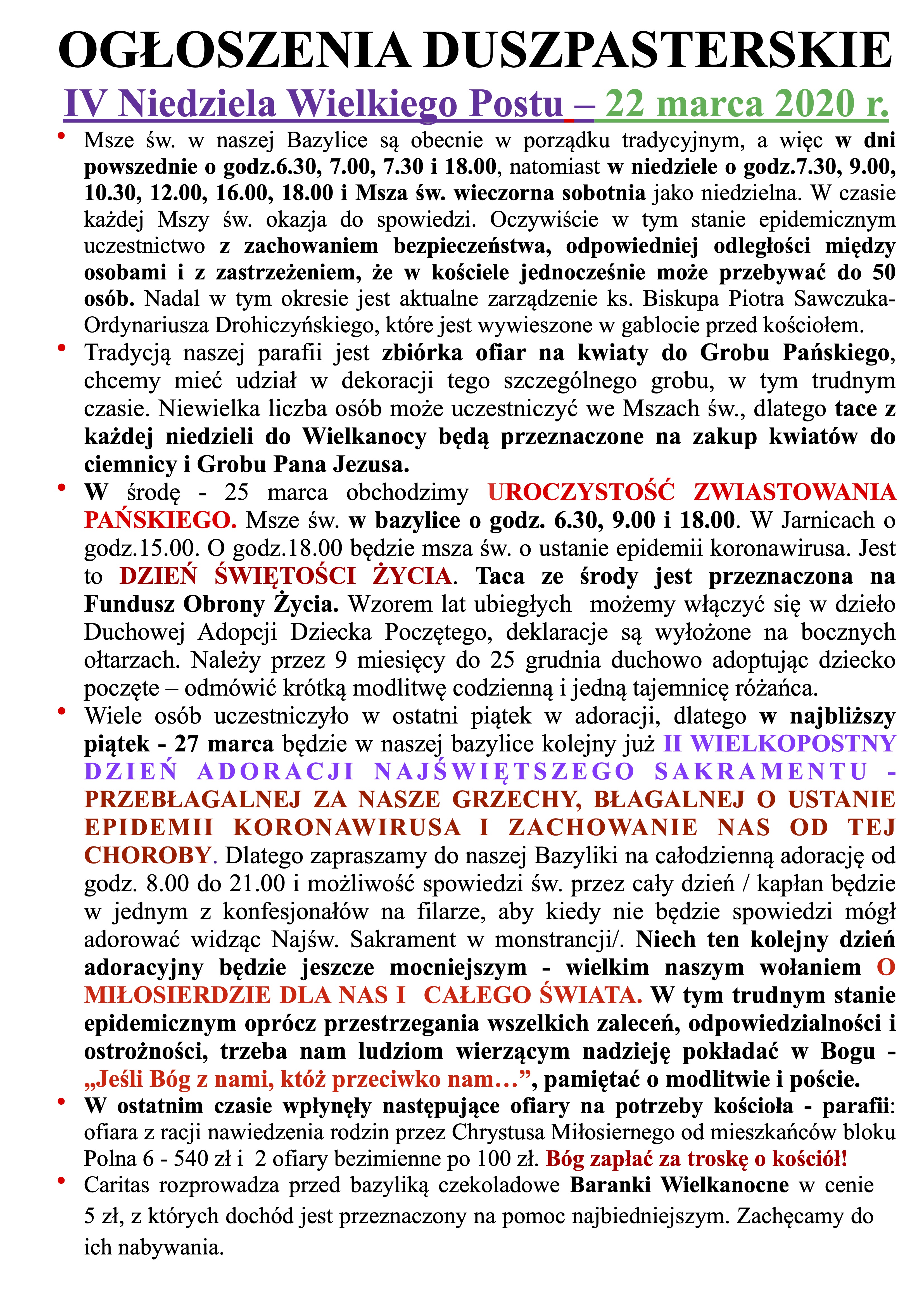 IV Niedziela Wielkiego Postu–22 marca 2020 r.