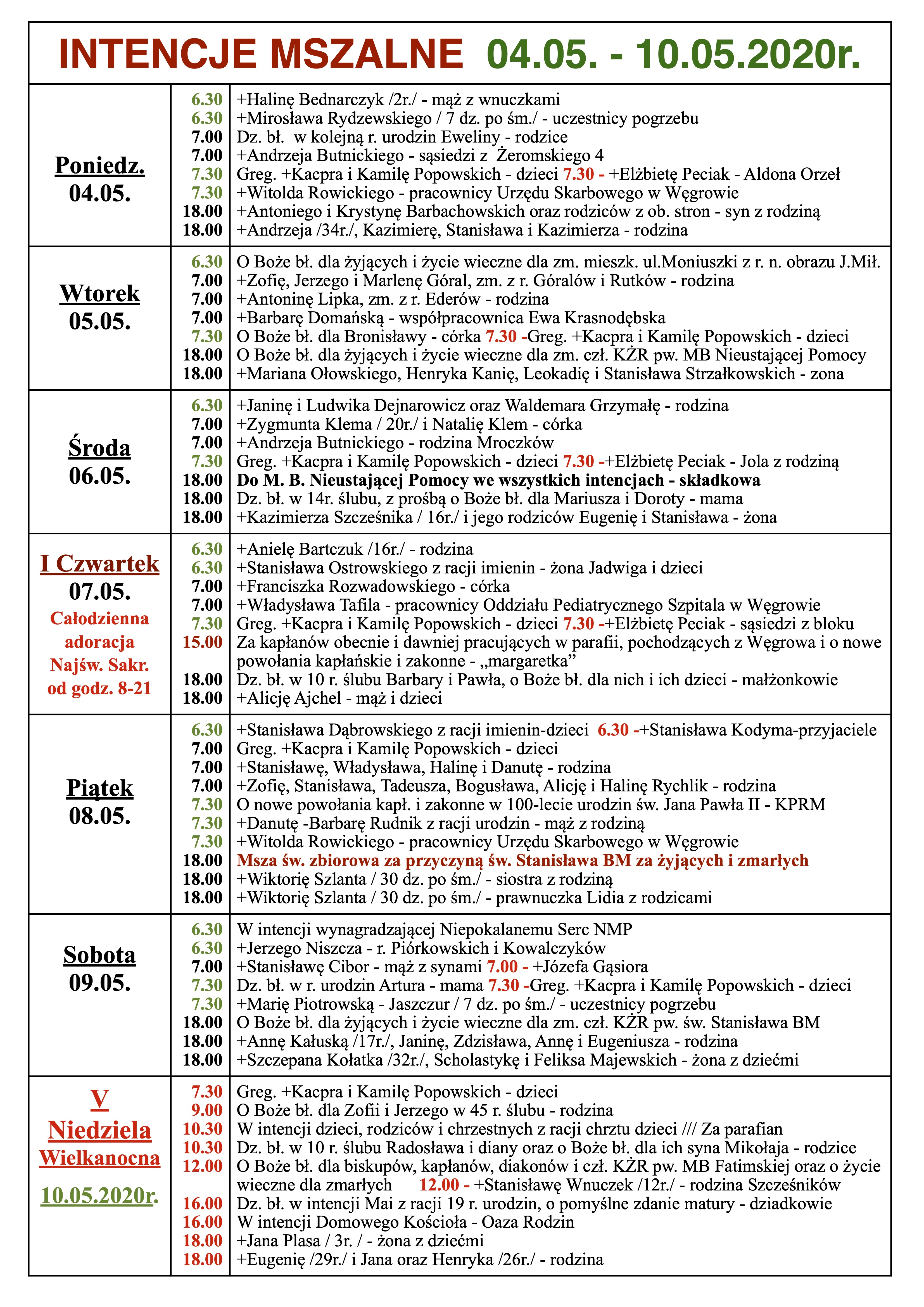 INTENCJE MSZALNE 04.04. – 10.05.2020r.
