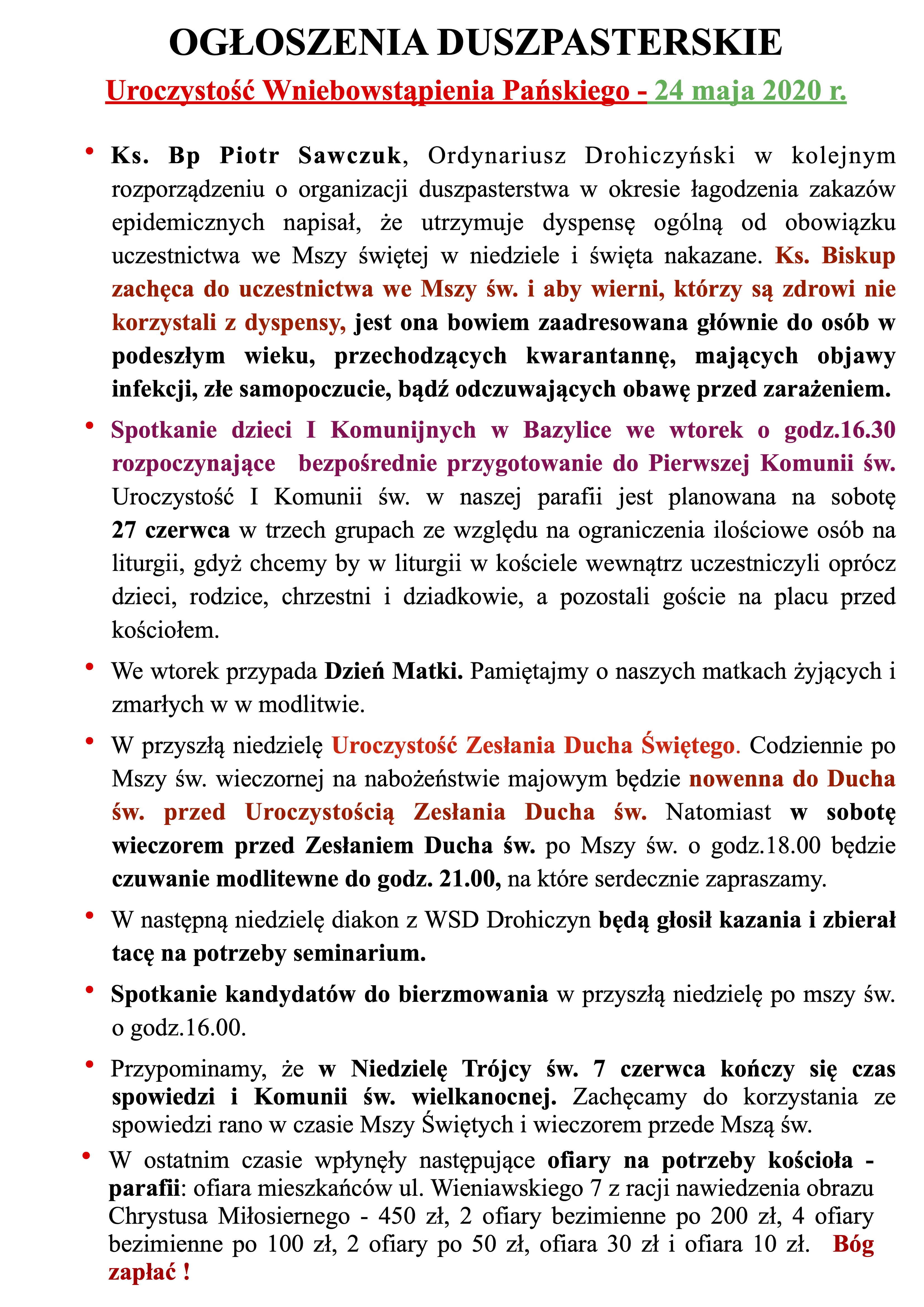 Uroczystość Wniebowstąpienia Pańskiego – 24 maja 2020 r.