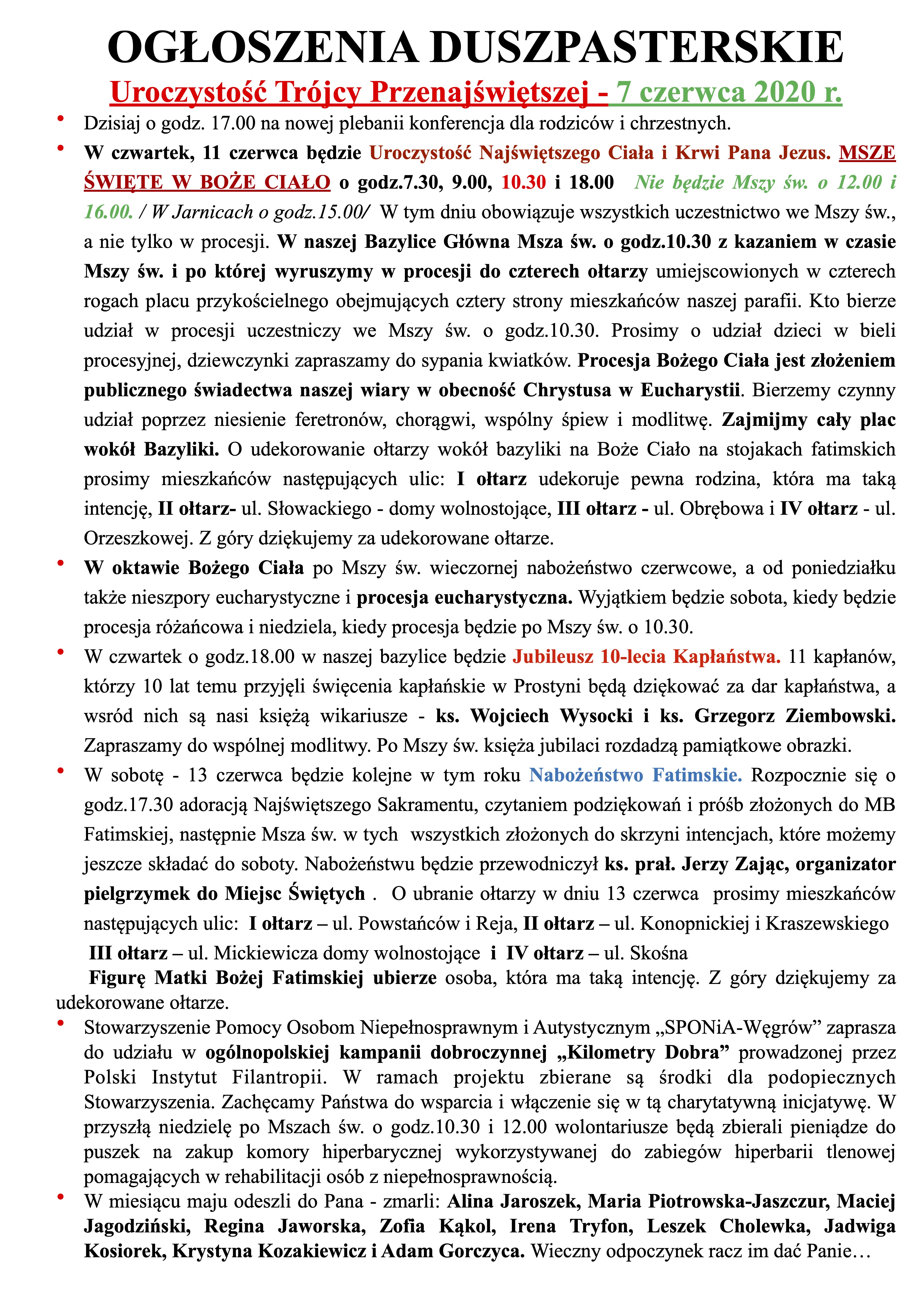 Uroczystość Trójcy Przenajświętszej – 7 czerwca 2020 r.