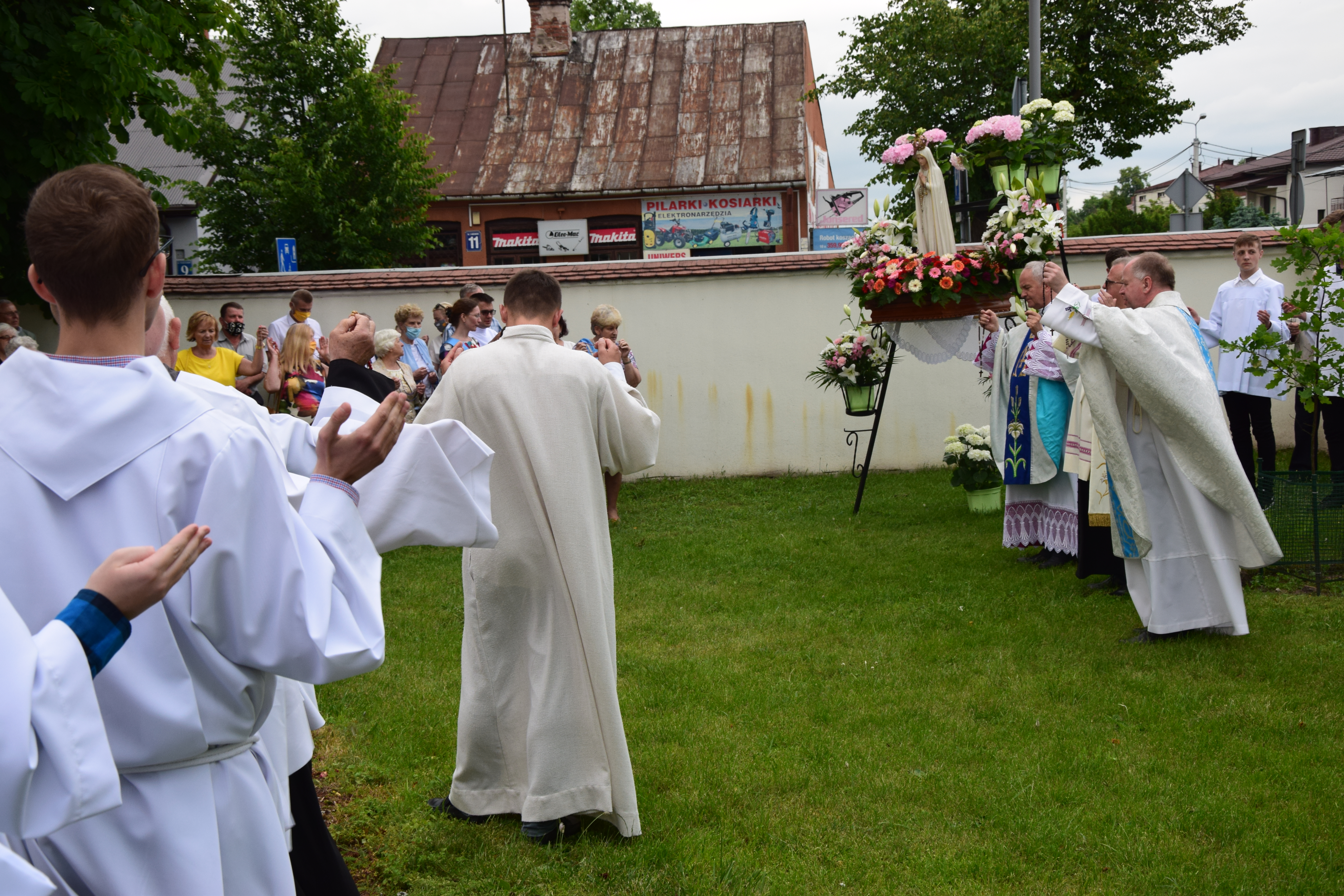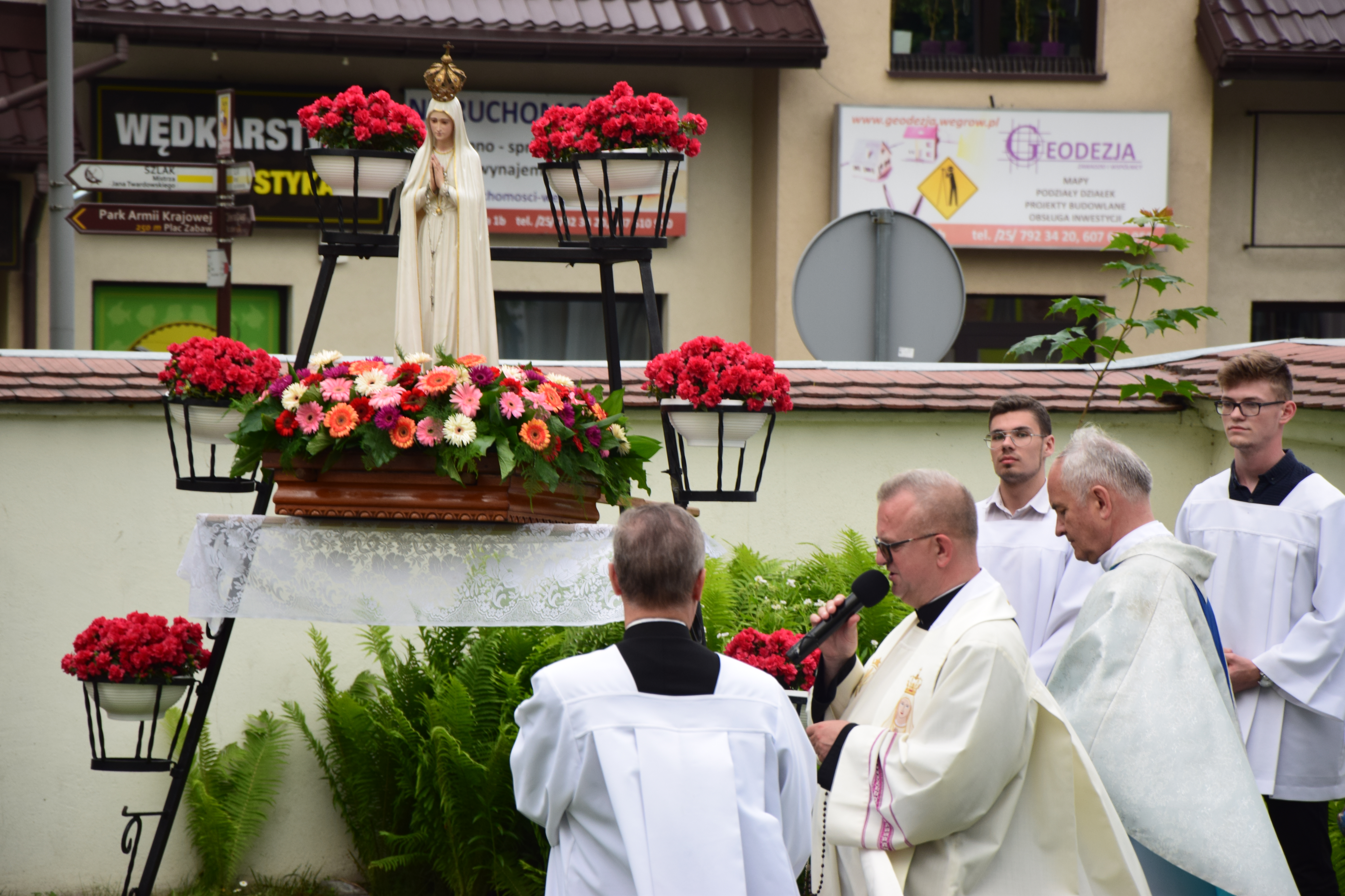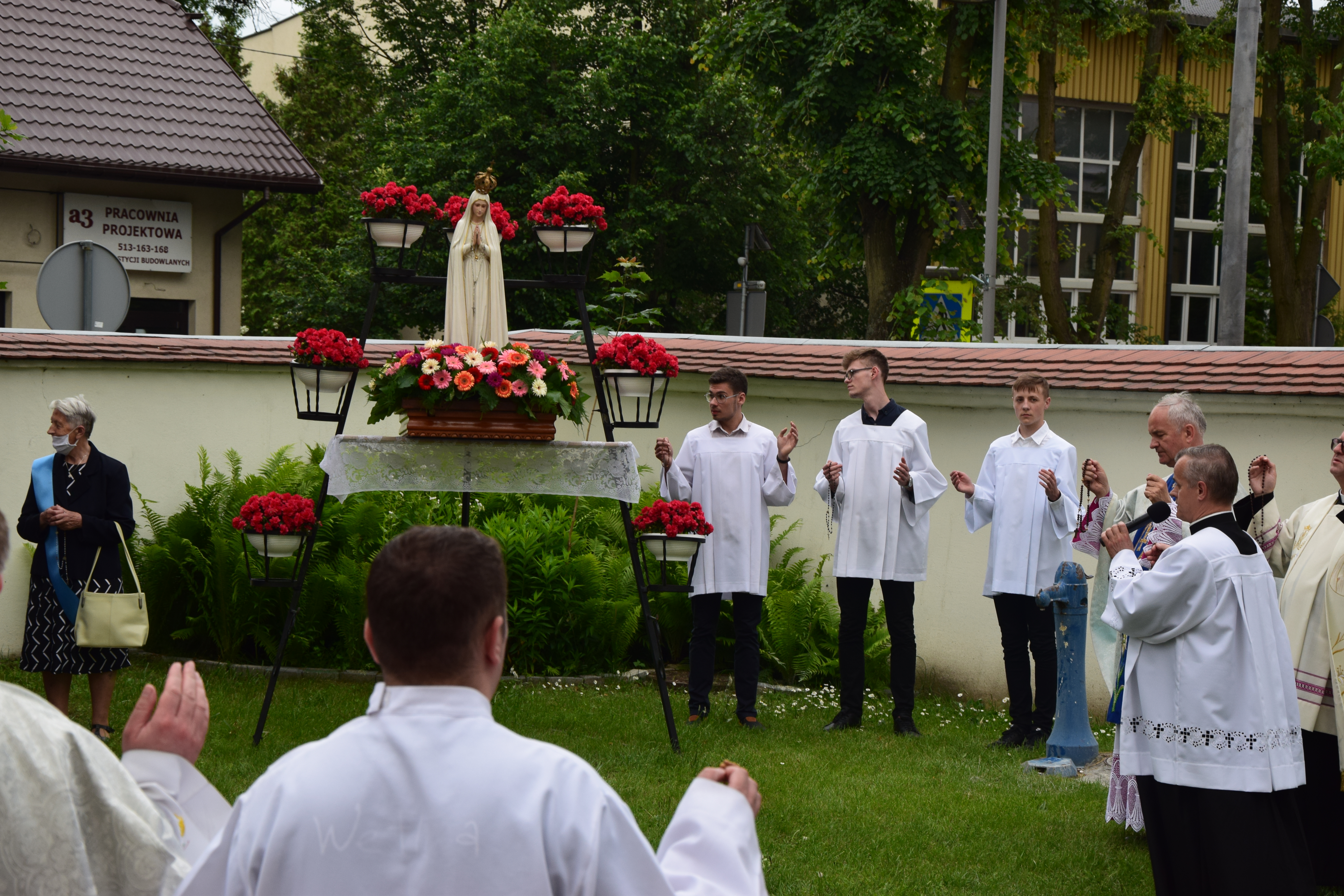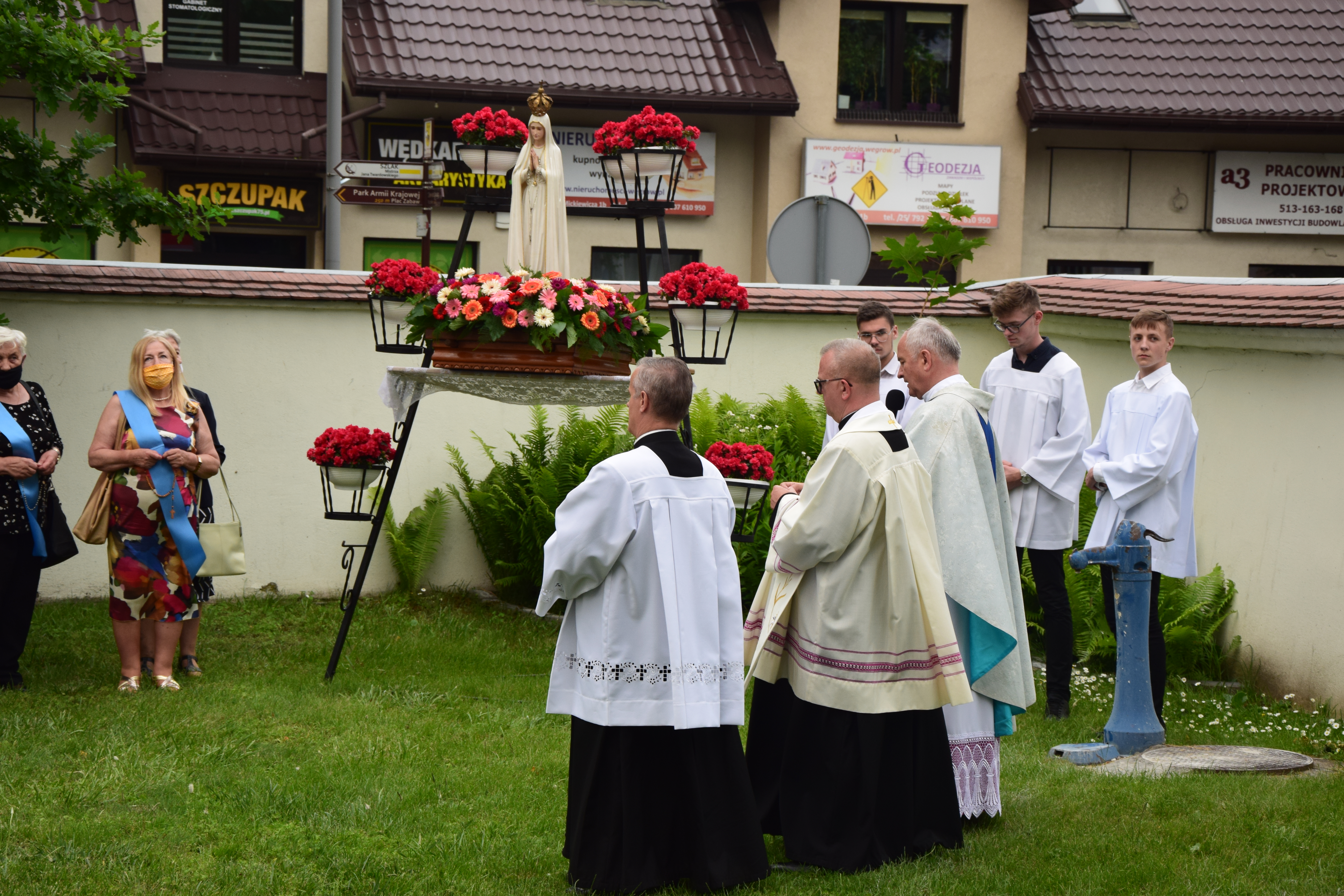 Później figura Najświętszej Maryi Panny Fatimskiej została wyniesiona na zewnątrz świątyni. Przy czterech kolejnych ołtarzach, ubranych przez mieszkańców ulic: Powstańców i Reja, Konopnickiej i Kraszewskiego, Mickiewicza (domy wolnostojące) oraz ulicy Skośnej, odmówiono poszczególne dziesiątki Różańca Świętego. Komentarze do tajemnic chwalebnych przygotował ks. prał. Jerzy Zając. Podczas modlitwy „zdrowaśkami”, licznie zgromadzeni na placu przykościelnym wierni unosili swe ręce na znak pokuty.