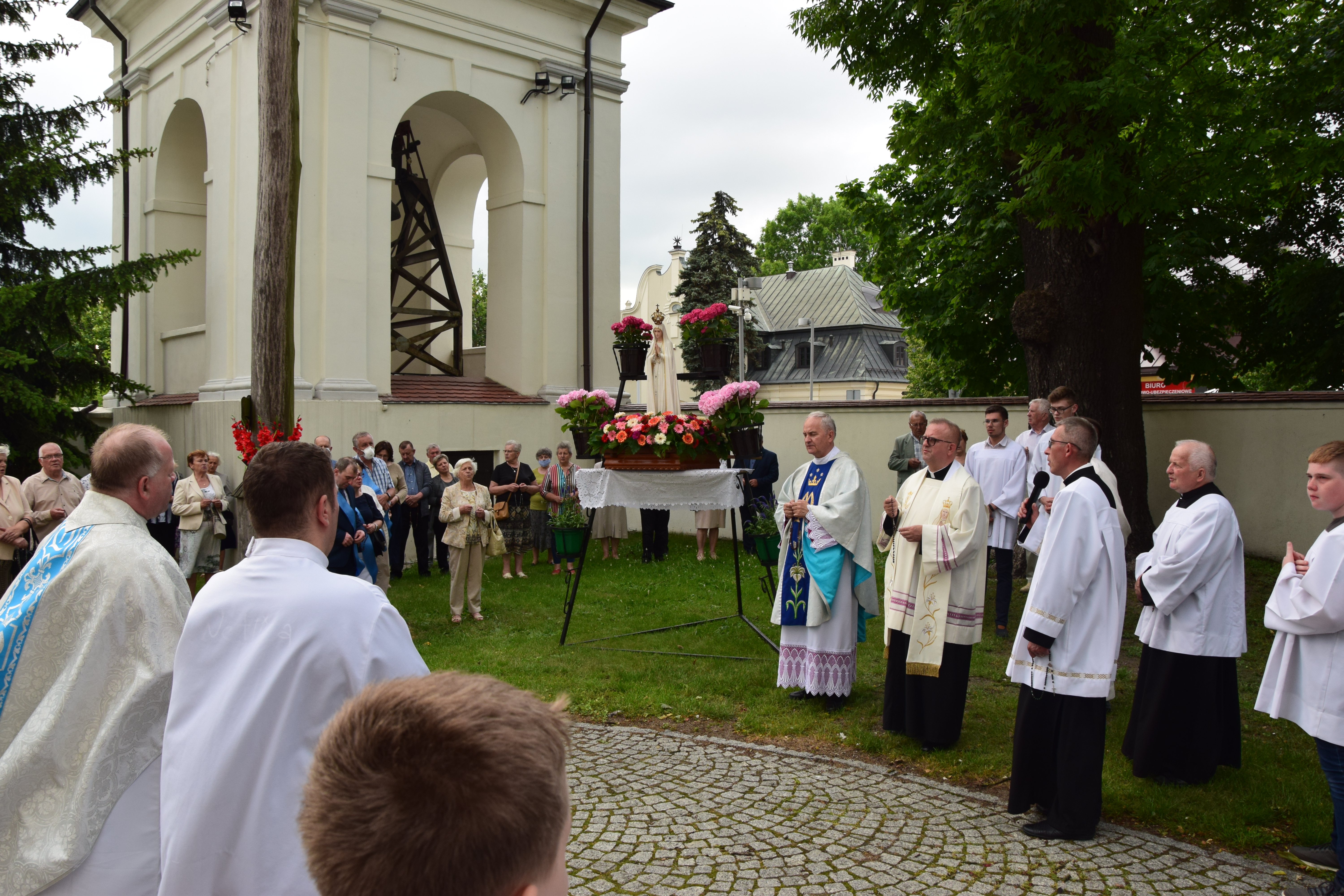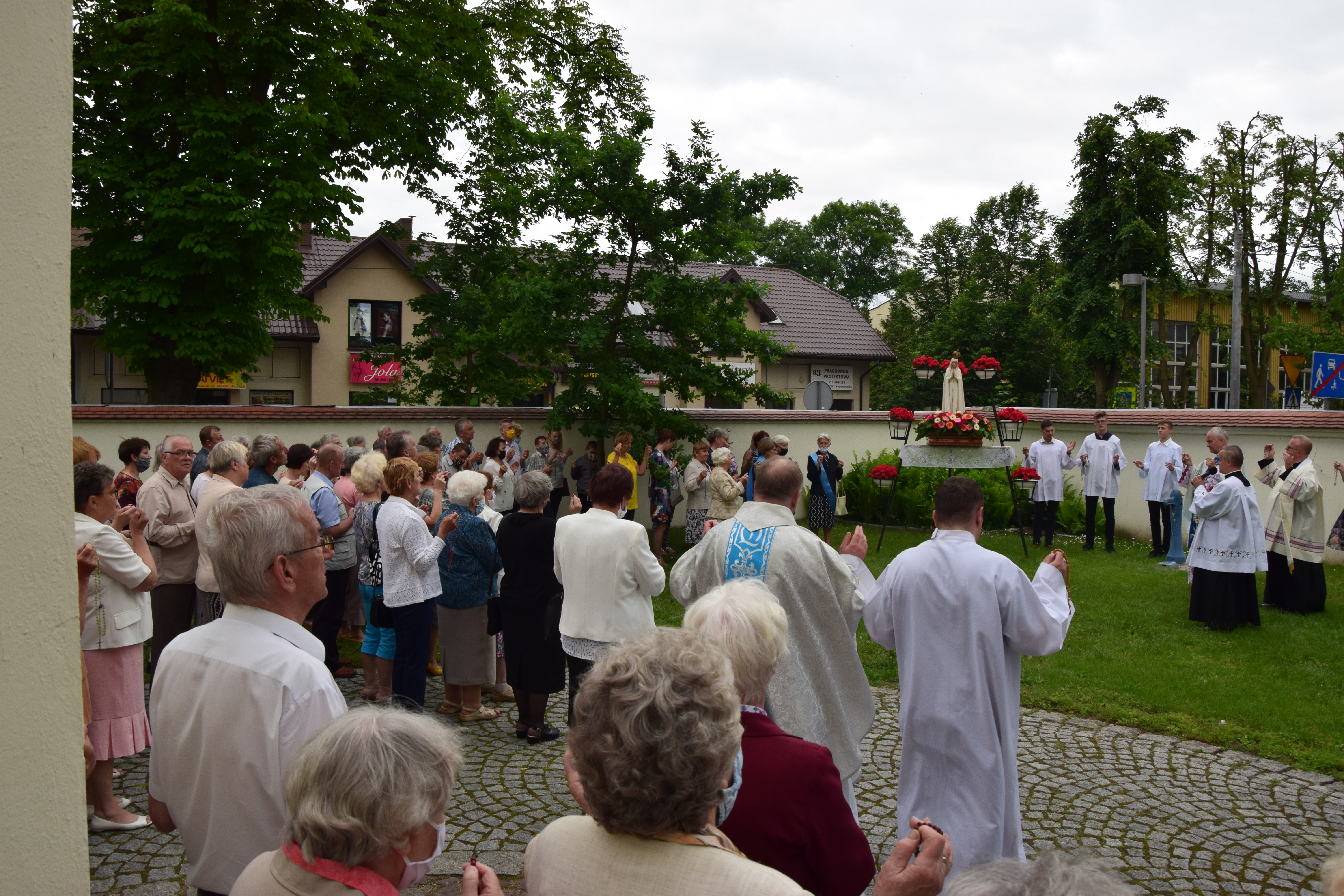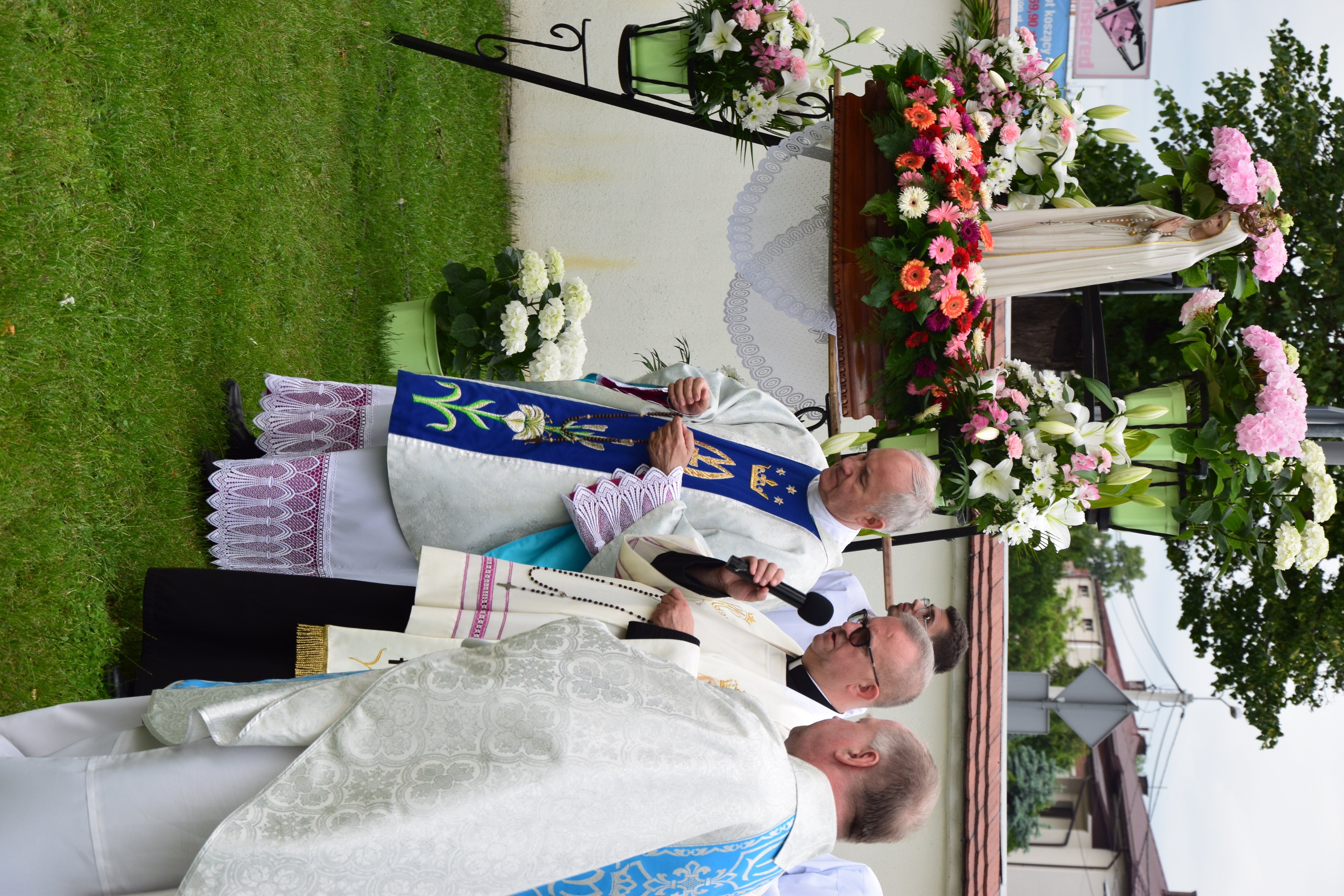 Później figura Najświętszej Maryi Panny Fatimskiej została wyniesiona na zewnątrz świątyni. Przy czterech kolejnych ołtarzach, ubranych przez mieszkańców ulic: Powstańców i Reja, Konopnickiej i Kraszewskiego, Mickiewicza (domy wolnostojące) oraz ulicy Skośnej, odmówiono poszczególne dziesiątki Różańca Świętego. Komentarze do tajemnic chwalebnych przygotował ks. prał. Jerzy Zając. Podczas modlitwy „zdrowaśkami”, licznie zgromadzeni na placu przykościelnym wierni unosili swe ręce na znak pokuty.