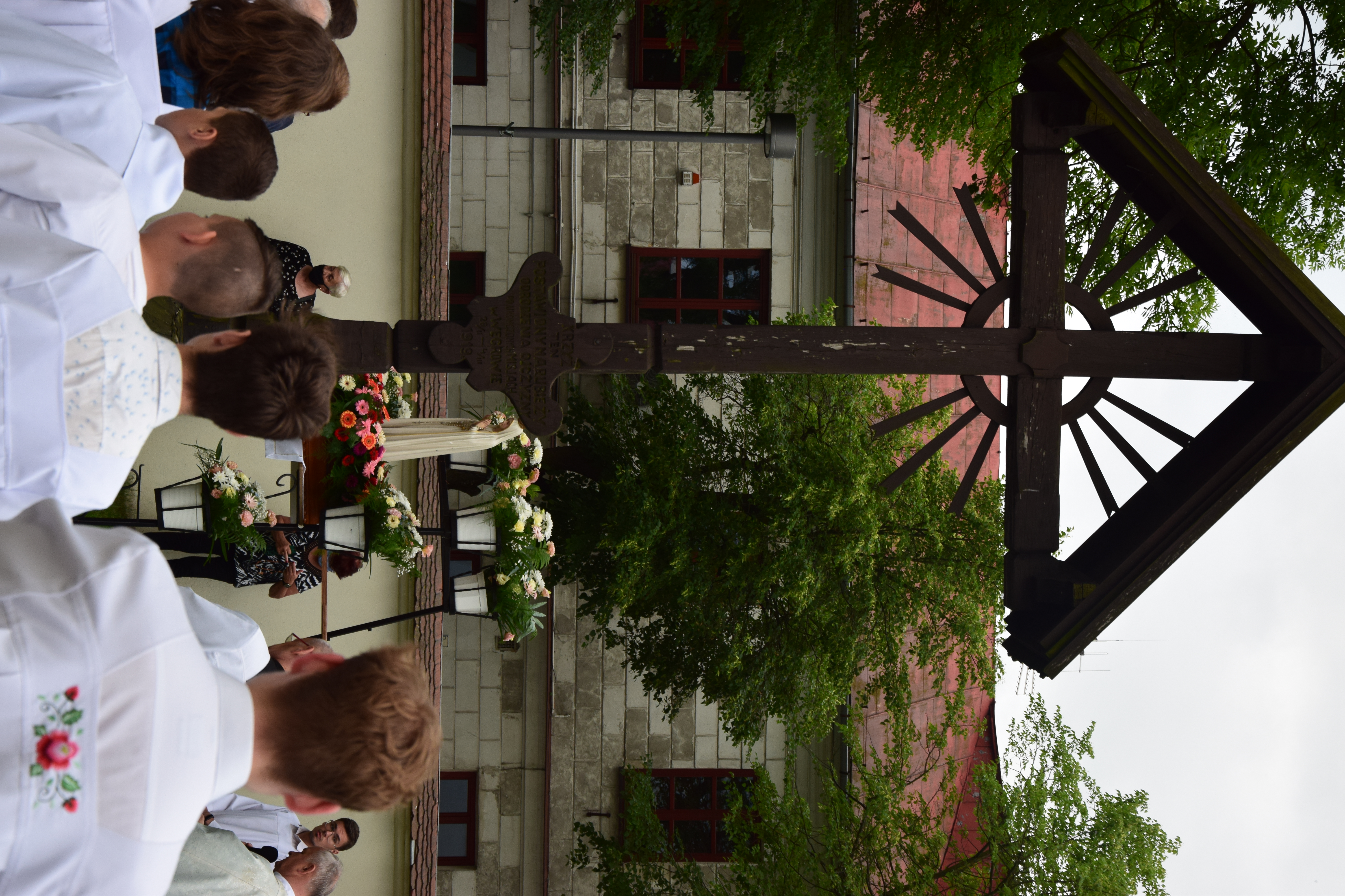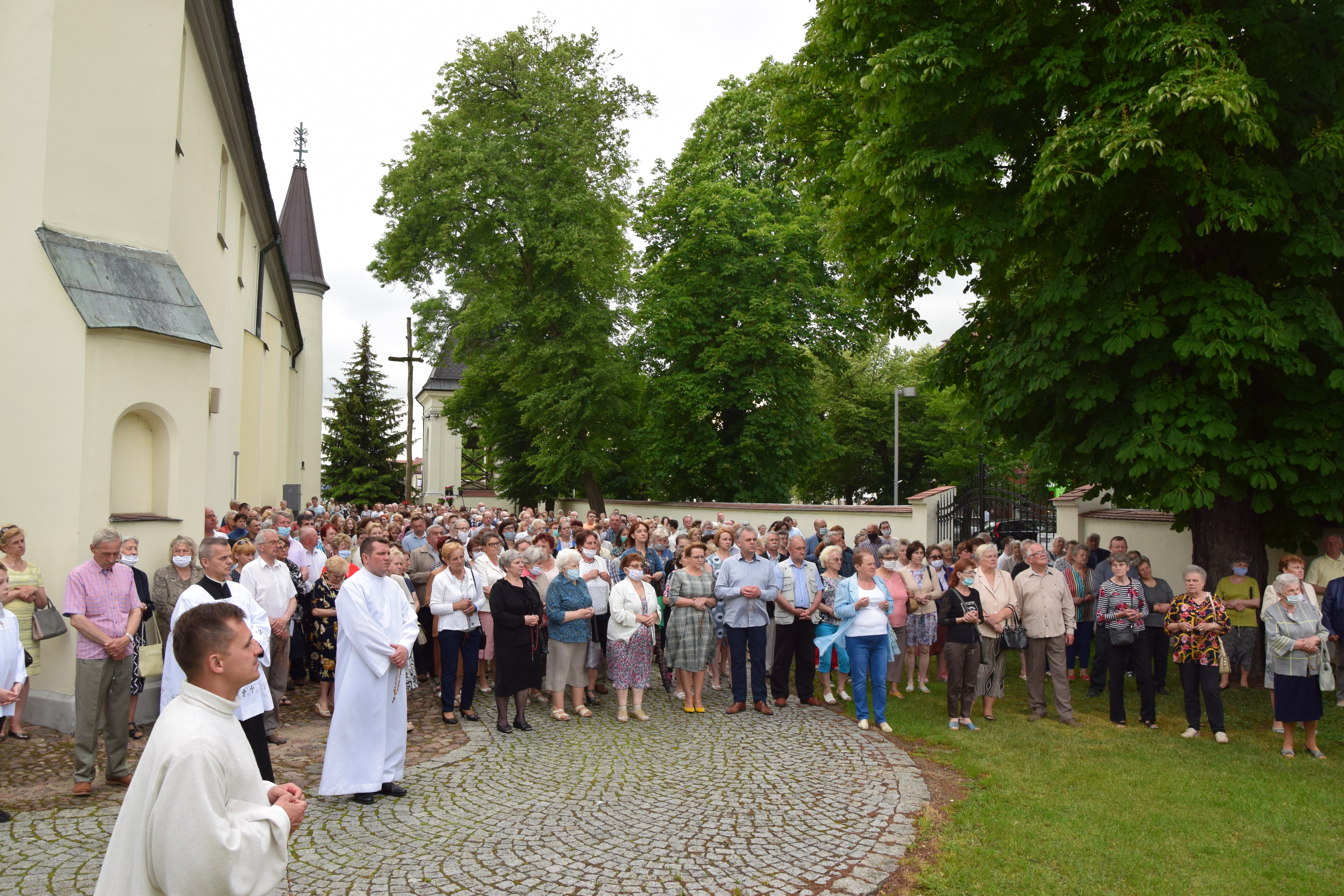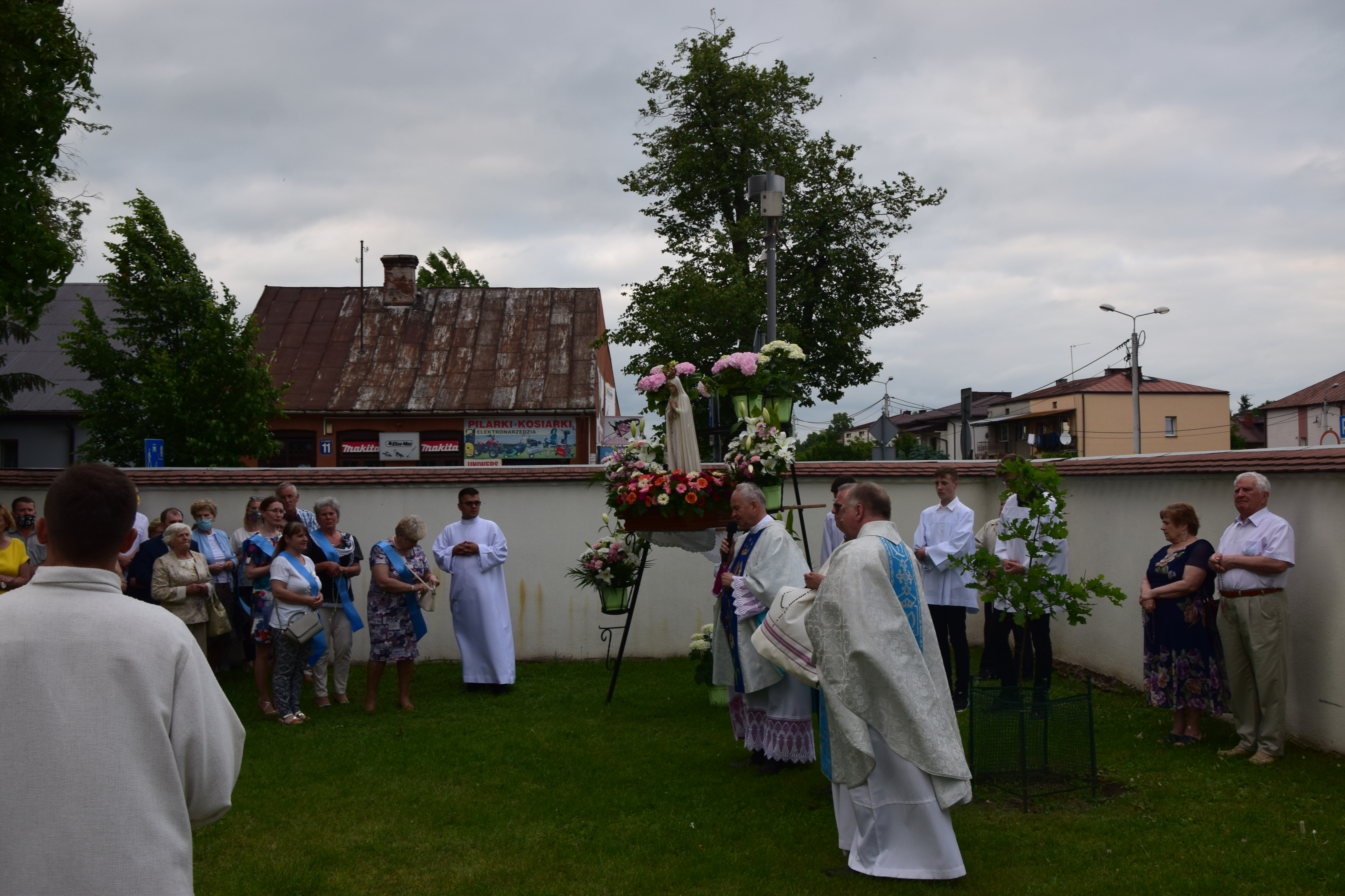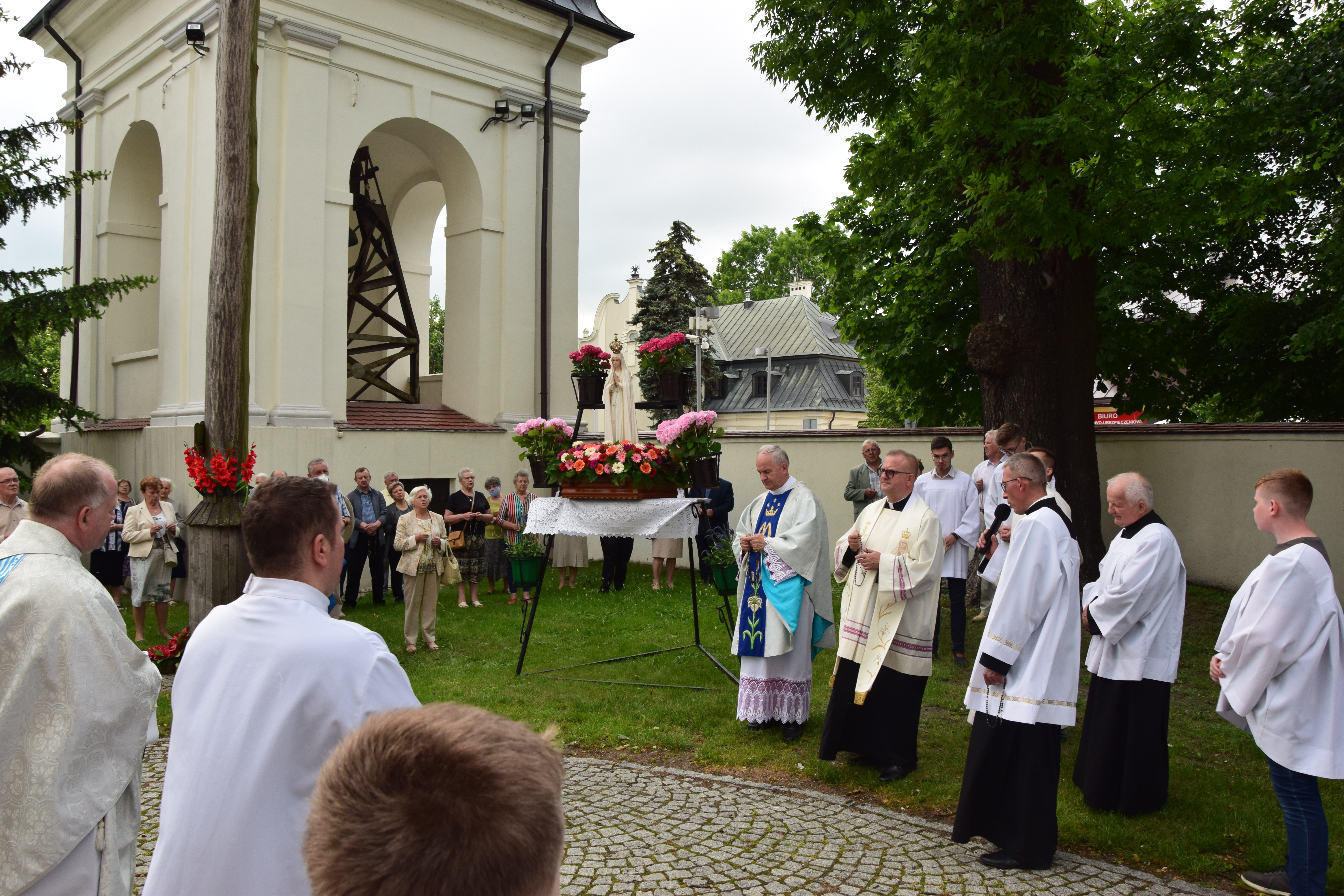 Później figura Najświętszej Maryi Panny Fatimskiej została wyniesiona na zewnątrz świątyni. Przy czterech kolejnych ołtarzach, ubranych przez mieszkańców ulic: Powstańców i Reja, Konopnickiej i Kraszewskiego, Mickiewicza (domy wolnostojące) oraz ulicy Skośnej, odmówiono poszczególne dziesiątki Różańca Świętego. Komentarze do tajemnic chwalebnych przygotował ks. prał. Jerzy Zając. Podczas modlitwy „zdrowaśkami”, licznie zgromadzeni na placu przykościelnym wierni unosili swe ręce na znak pokuty.