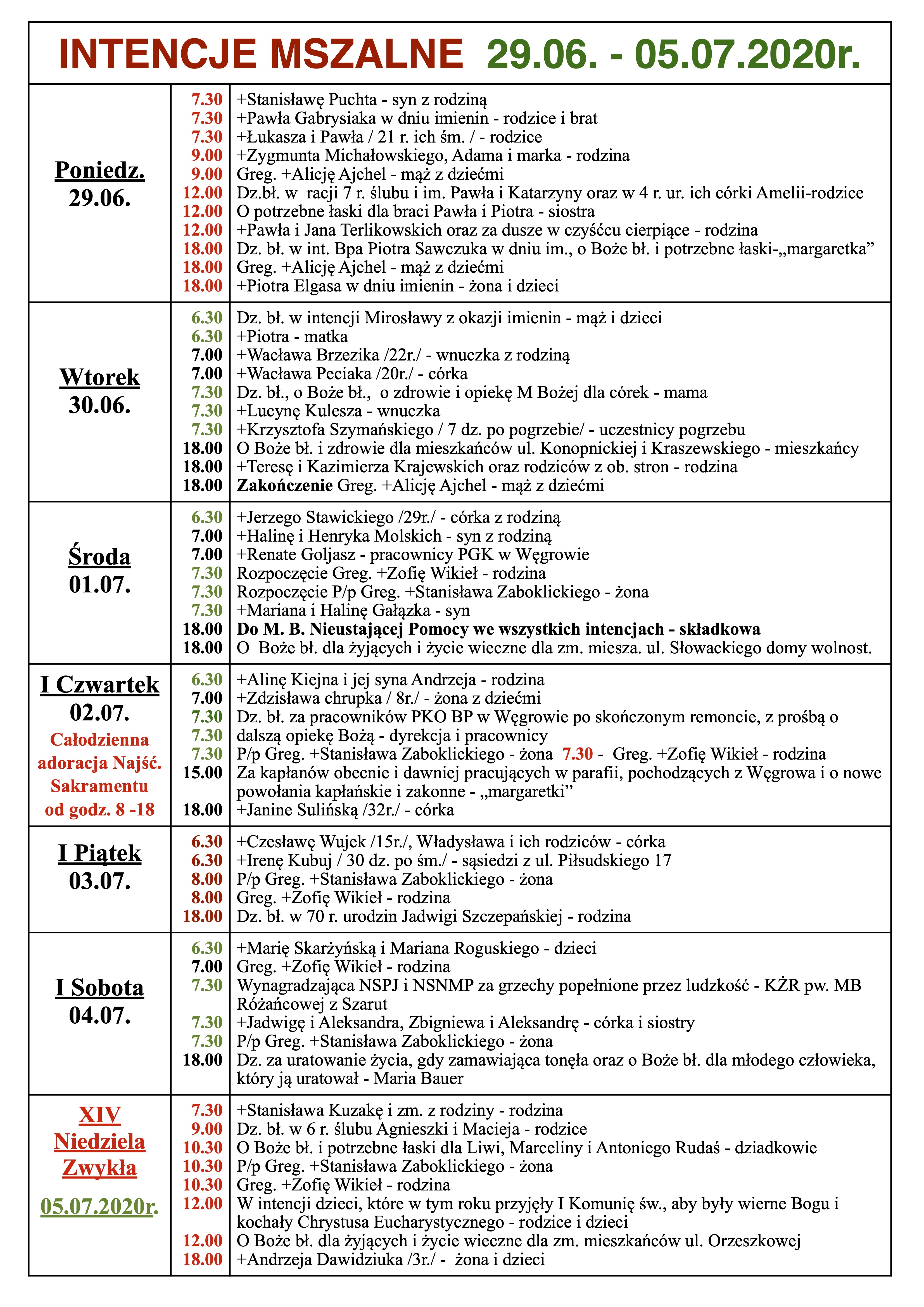 INTENCJE MSZALNE 29.06. – 05.07.2020r.