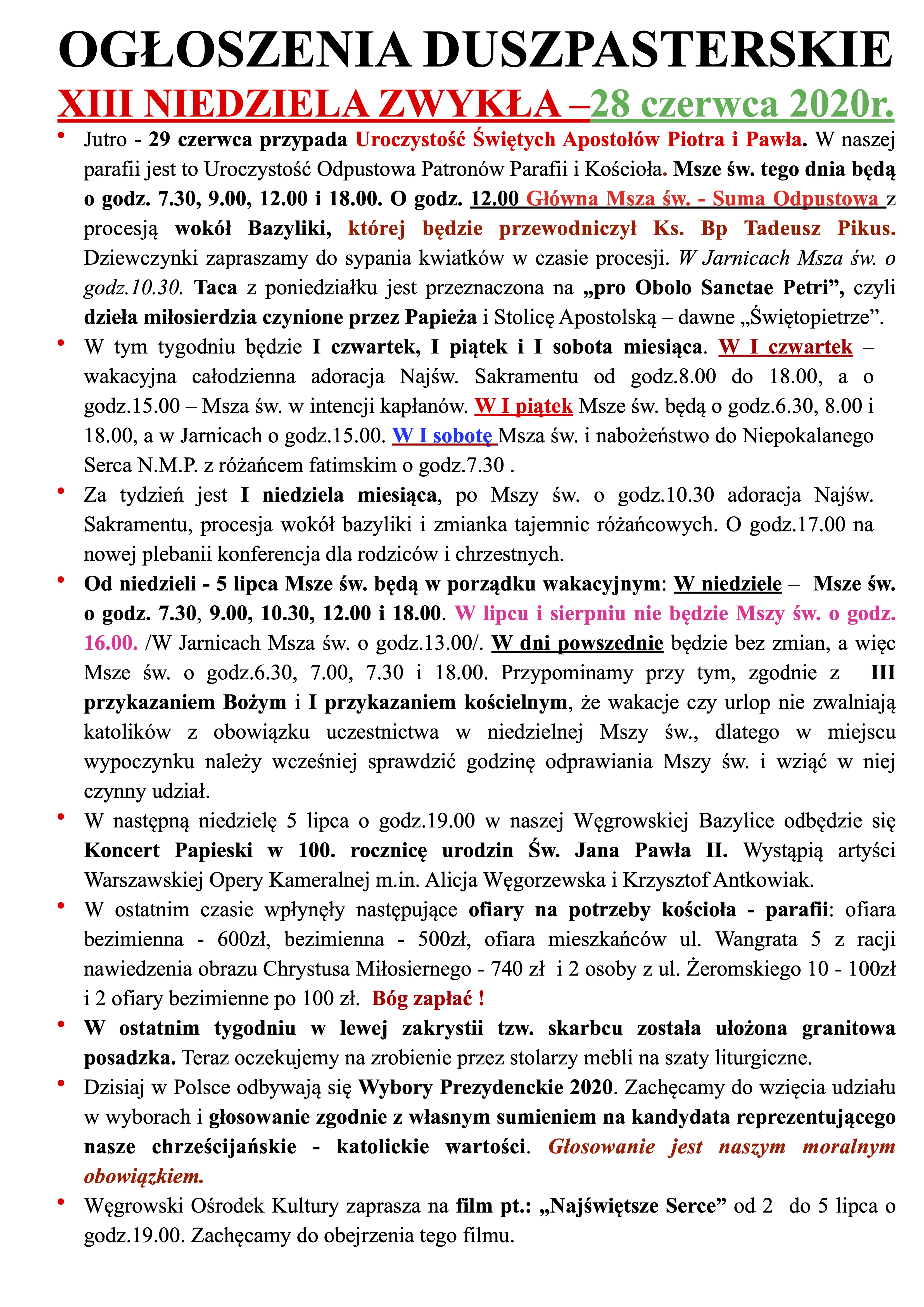 XIII NIEDZIELA ZWYKŁA –28 czerwca 2020r.