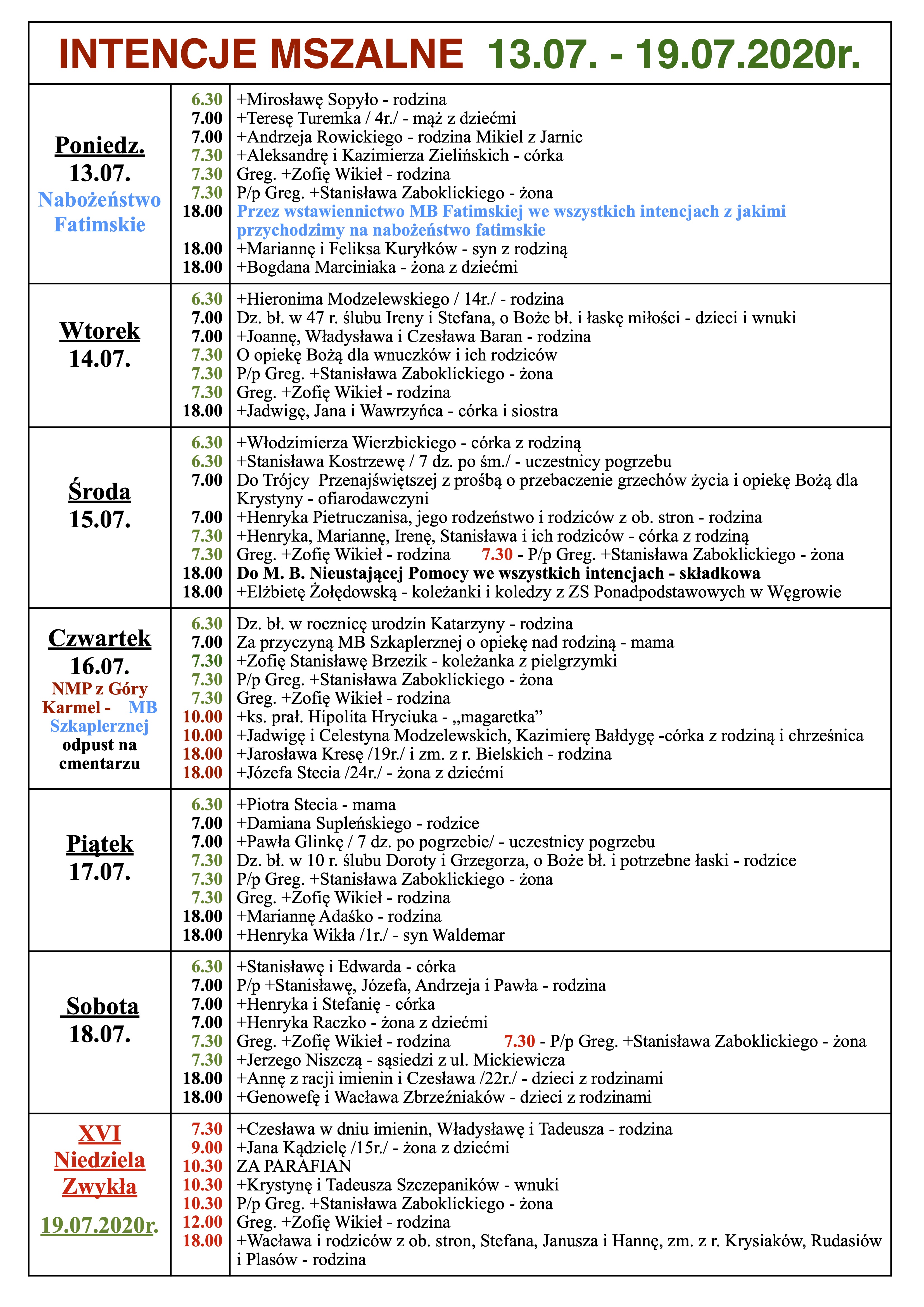 INTENCJE MSZALNE 13.07. – 19.07.2020r.