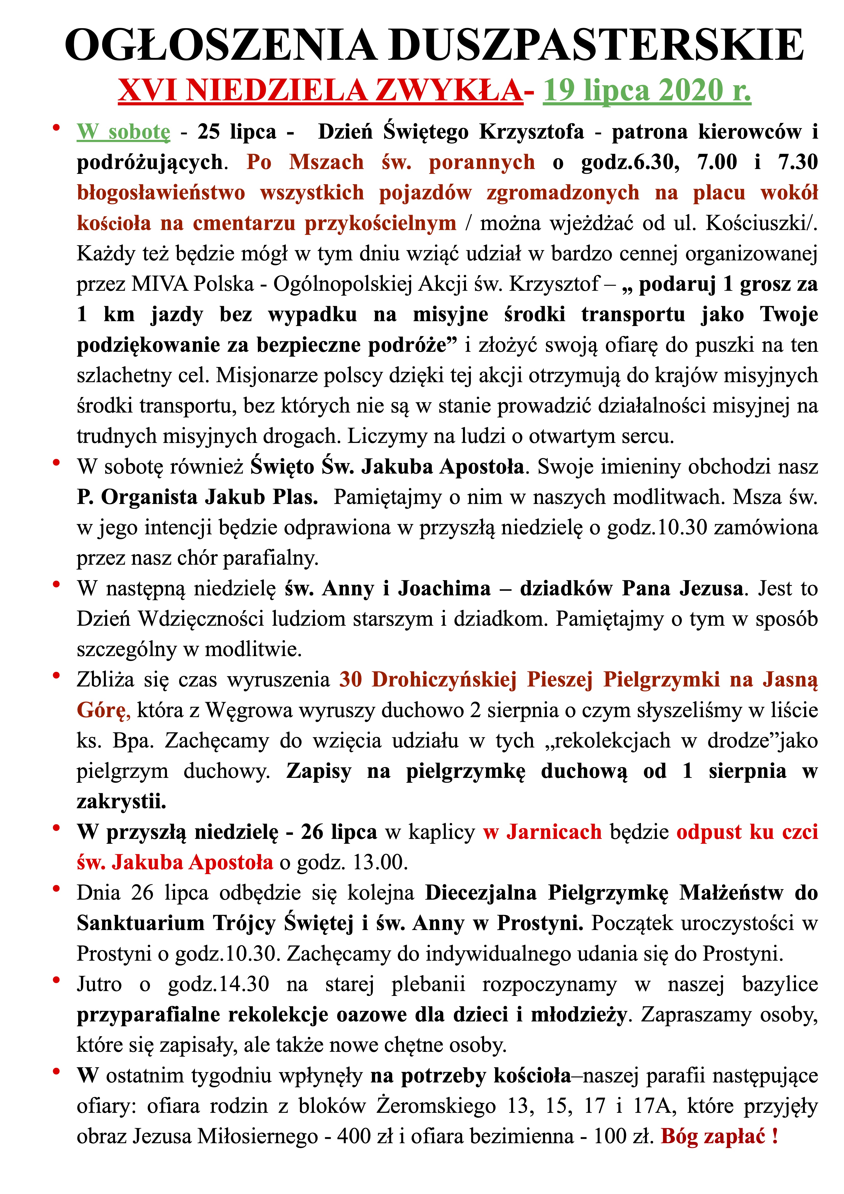 XVI NIEDZIELA ZWYKŁA- 19 lipca 2020 r.
