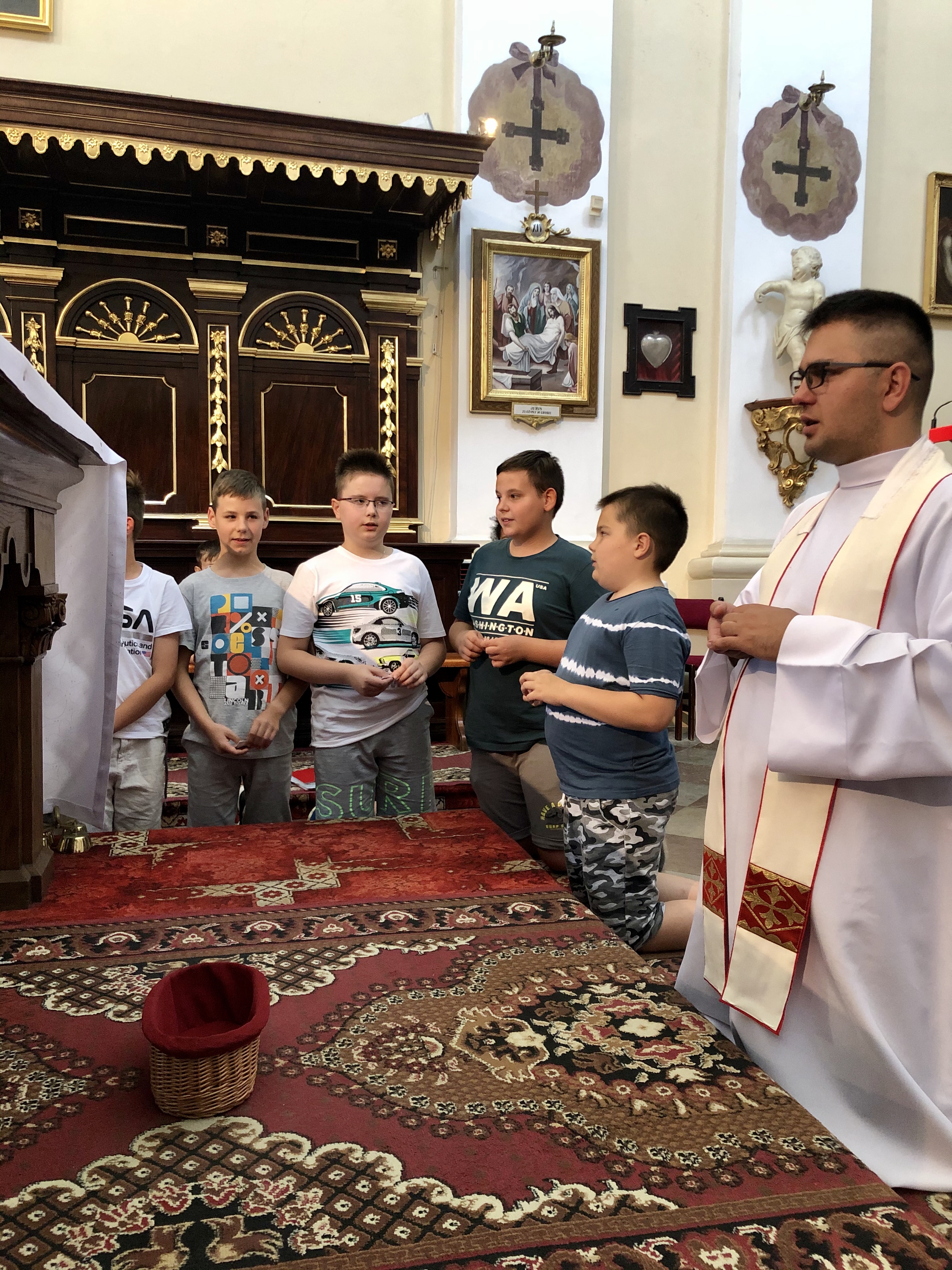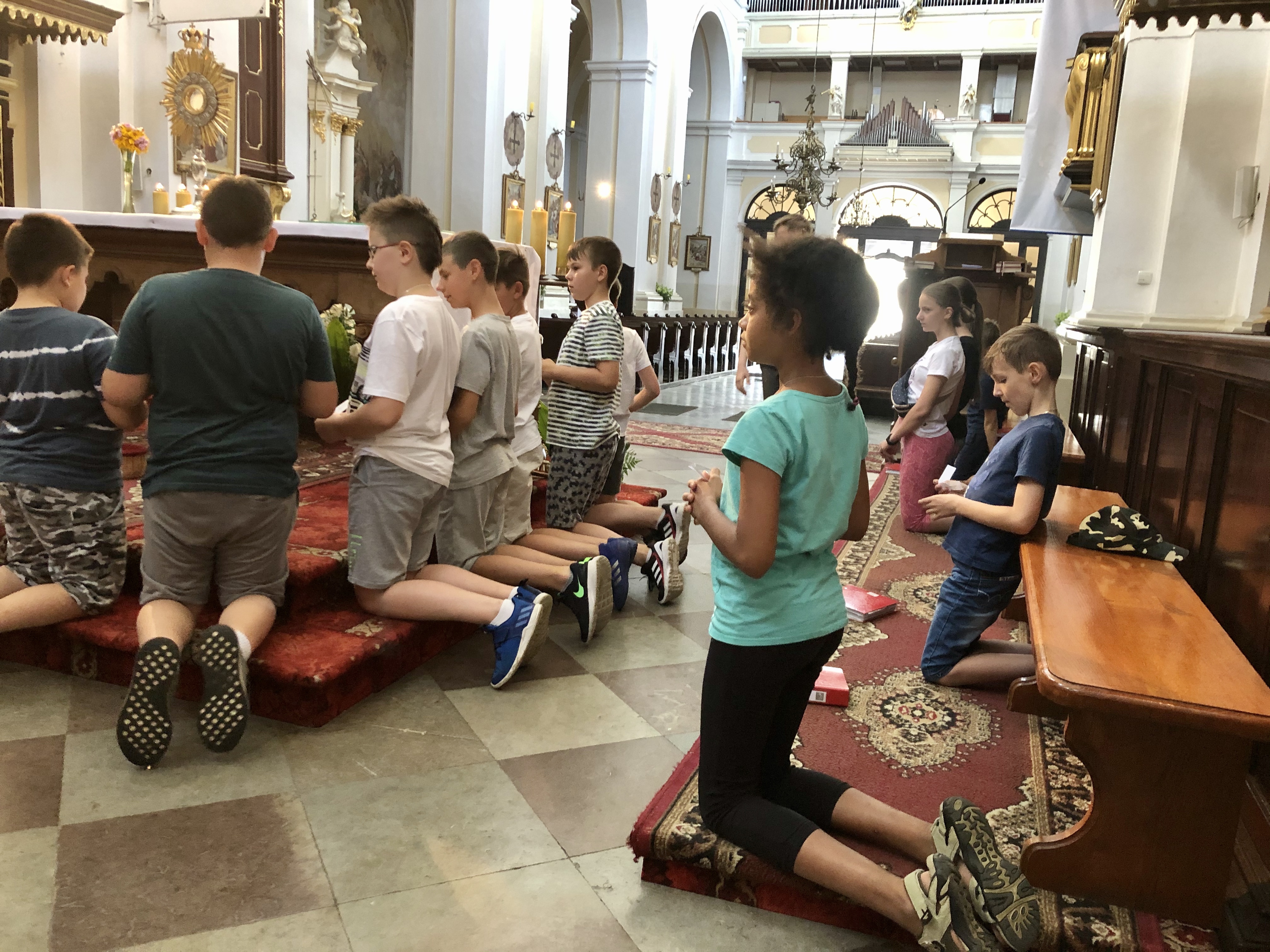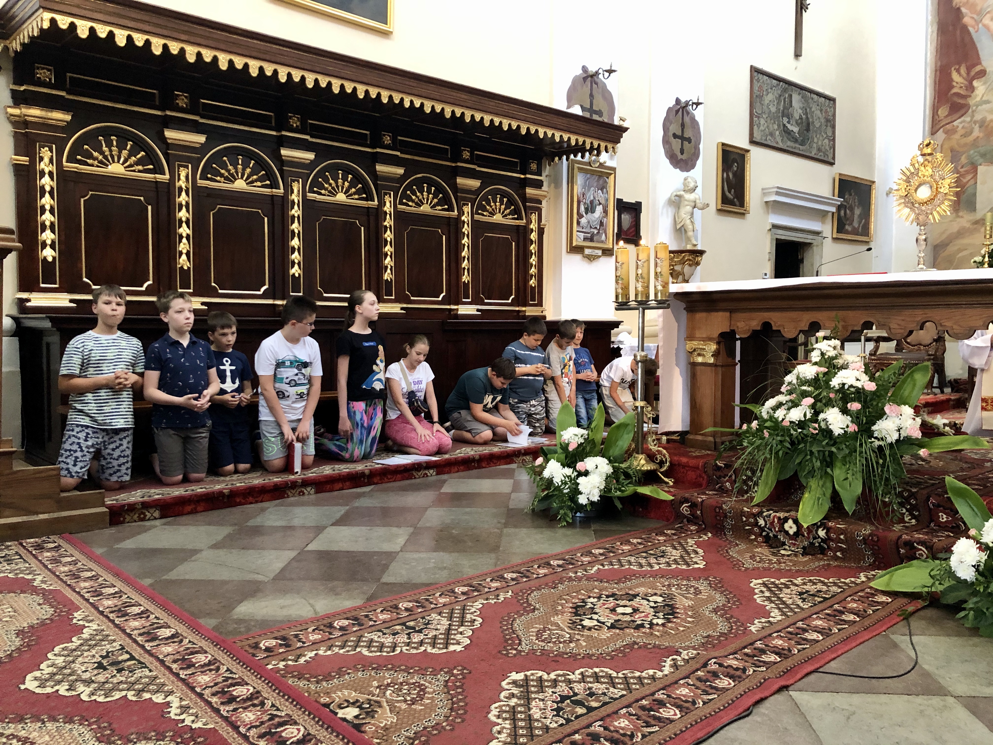 W dniach od 20-ego do 25-go lipca 2020 r. (poniedziałek-sobota) w naszej parafii miały miejsce rekolekcje oazowe, zorganizowane w ramach tzw. półkolonii ‚z Bogiem’. Blisko 30 osób wraz z opiekunami i animatorami wzięło udział w codziennych zajęciach edukacyjno-rekreacyjnych. W ramach kilkugodzinnych spotkań dzieci i młodzież miały okazję rozwijać swą sprawność intelektualną oraz fizyczną, poprzez czynne uczestnictwo w różnego rodzaju grach zręcznościowo-pamięciowych i zabawach szkolno-wychowawczych. Nie zabrakło również formacji duchowej w formie specjalnie przygotowanych katechez. Każdy dzień przyparafialnych rekolekcji oazowych kończyła Msza św. o godz 18:00. Podczas Eucharystii sprawowanej w Bazylice Węgrowskiej, dzieci i młodzież ochoczo włączały się w liturgię poprzez odpowiednie przygotowanie śpiewów oraz asysty przy ołtarzu. Jak to zwykle bywa na tego typu półkoloniach, znalazło się i co nieco dla ciała; pizza i słodkie napoje niejednemu dodawały sił i energii do rywalizacji w prowadzonych przez animatorów zawodach i konkursach.