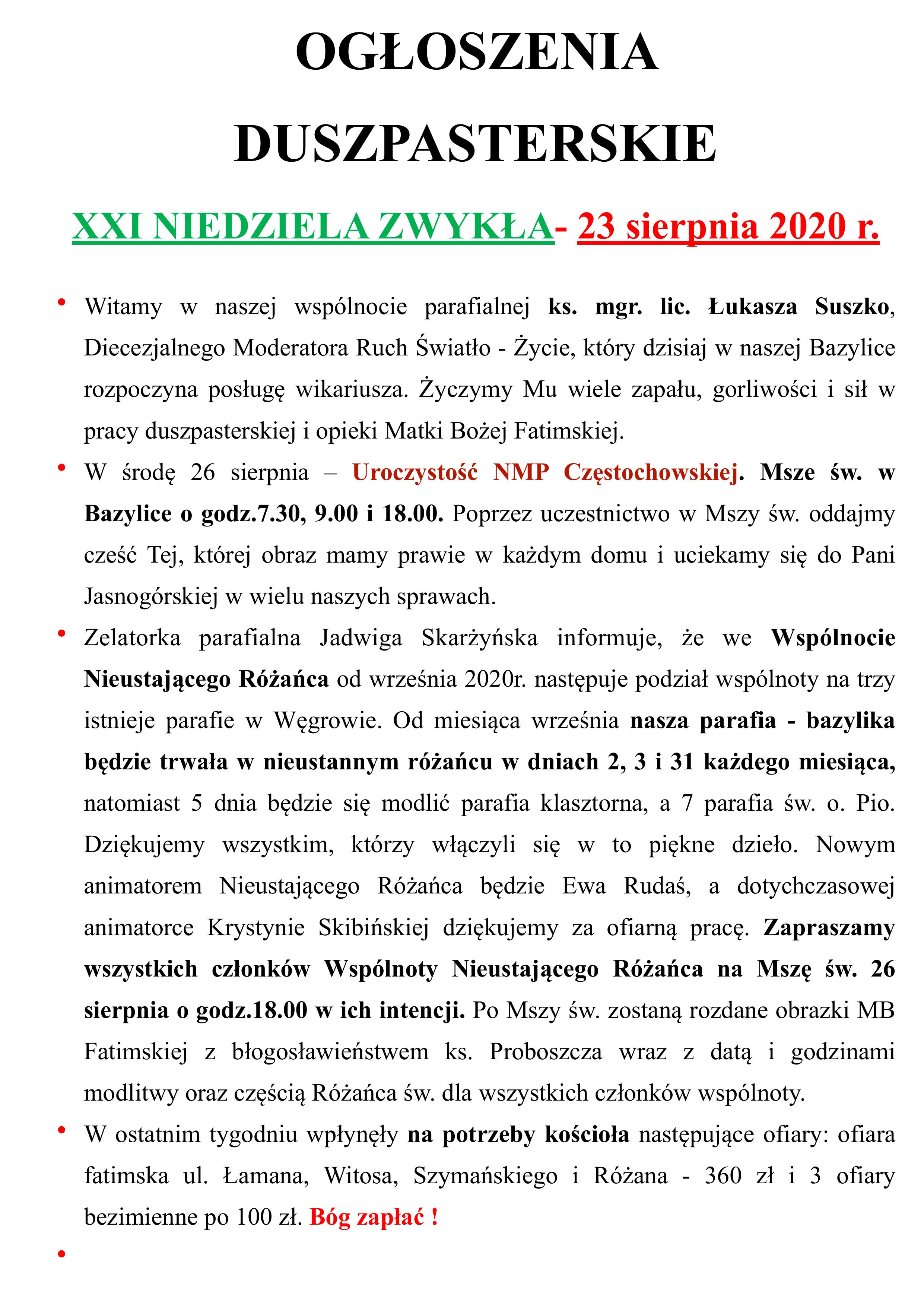 INTENCJE MSZALNE 17.08. – 23.08.2020r.