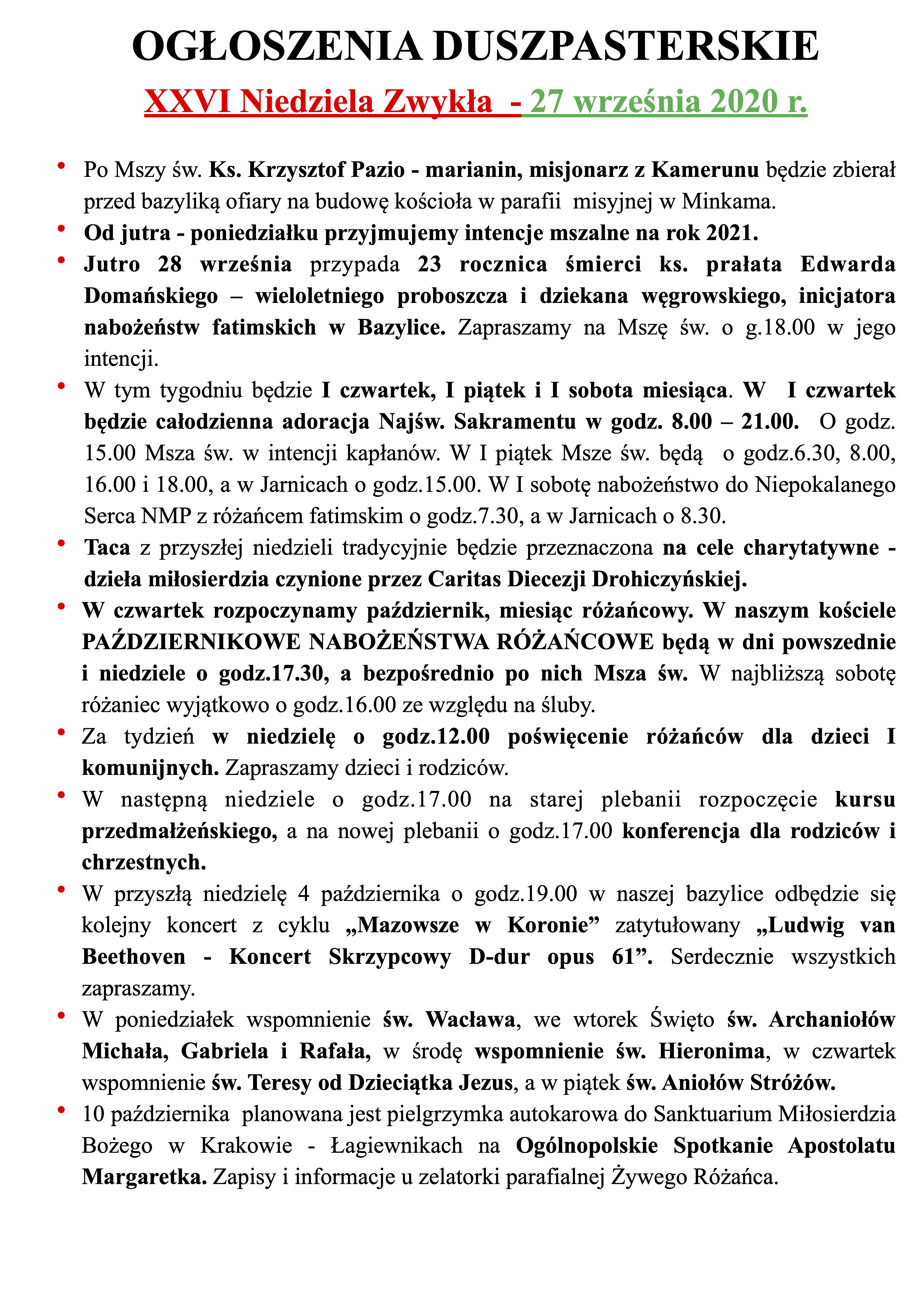 INTENCJE MSZALNE 28.09. – 04.10.2020r.