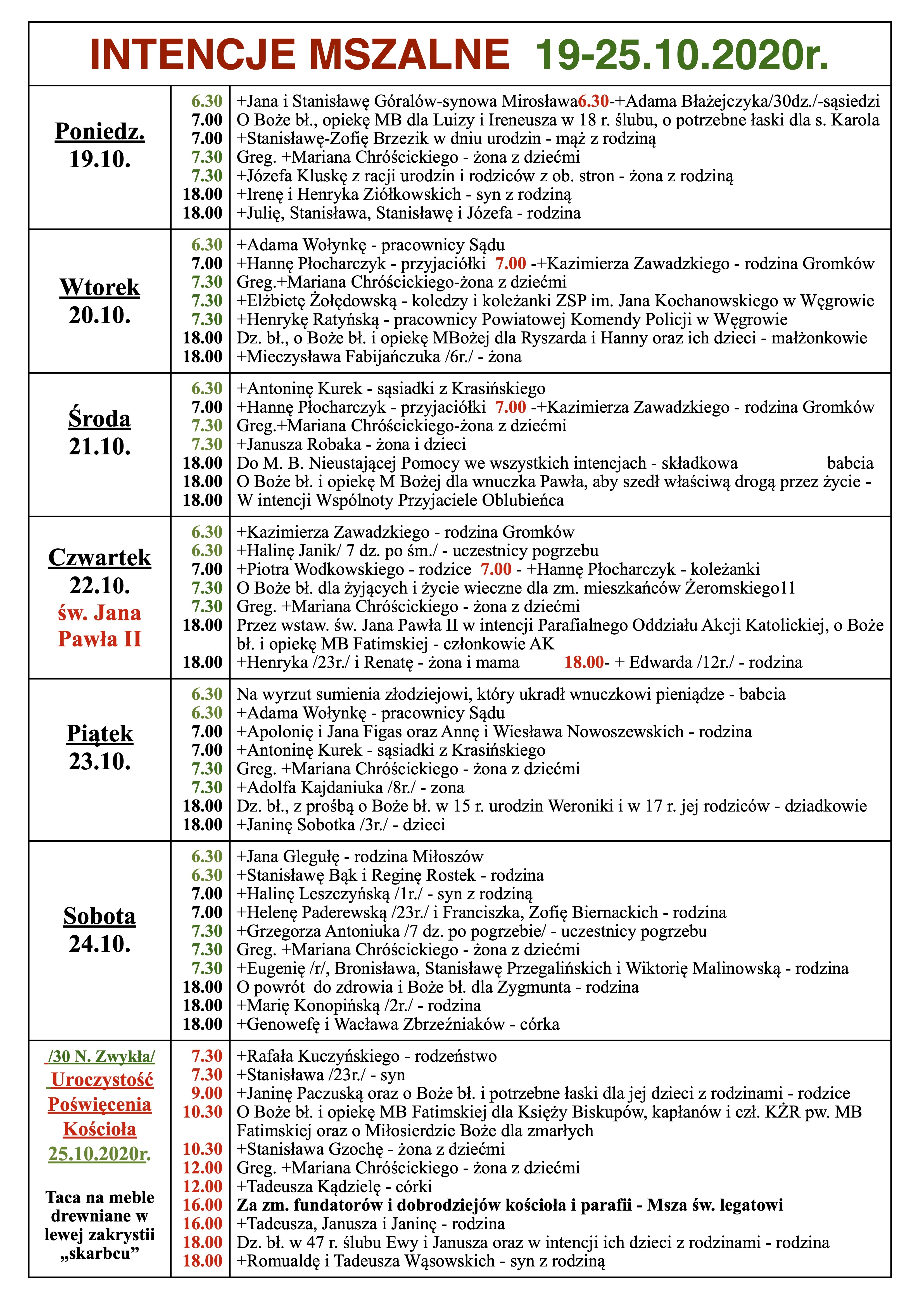 INTENCJE MSZALNE 19-25.10.2020r.