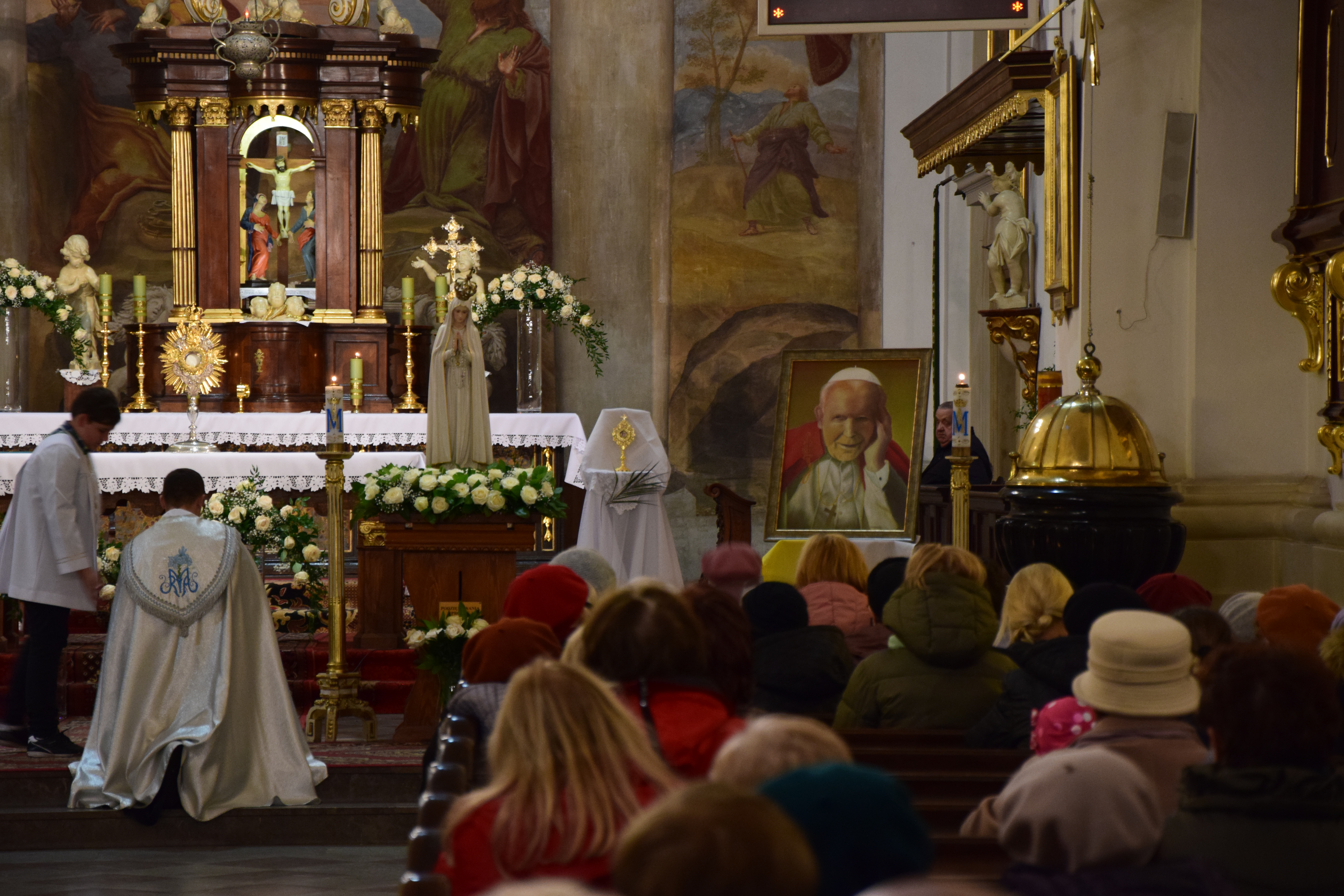 Niestety, z uwagi na deszczową pogodę, tradycyjna procesja różańcowa do czterech ołtarzy, symbolizujących kolejne Tajemnice Różańca, została przeniesiona do środka kościoła. Jednak, mimo to i w świątyni udało się uformować ciut okrojoną procesję z figurą Matki Bożej Fatimskiej, w której skład weszli miejscowi księża, kapłani przybyli z sąsiednich parafii oraz liturgiczna służba ołtarza. Wierni zgromadzeni w bazylice mogli uczestniczyć w modlitwie, pozostając na swoich miejscach, a odwracając się sukcesywnie w kierunku, gdzie podążała figura Najświętszej Maryi Panny. Krótkie, ale bogate w treści rozważania poszczególnych Tajemnic różańcowych przygotował i wygłosił ksiądz biskup.