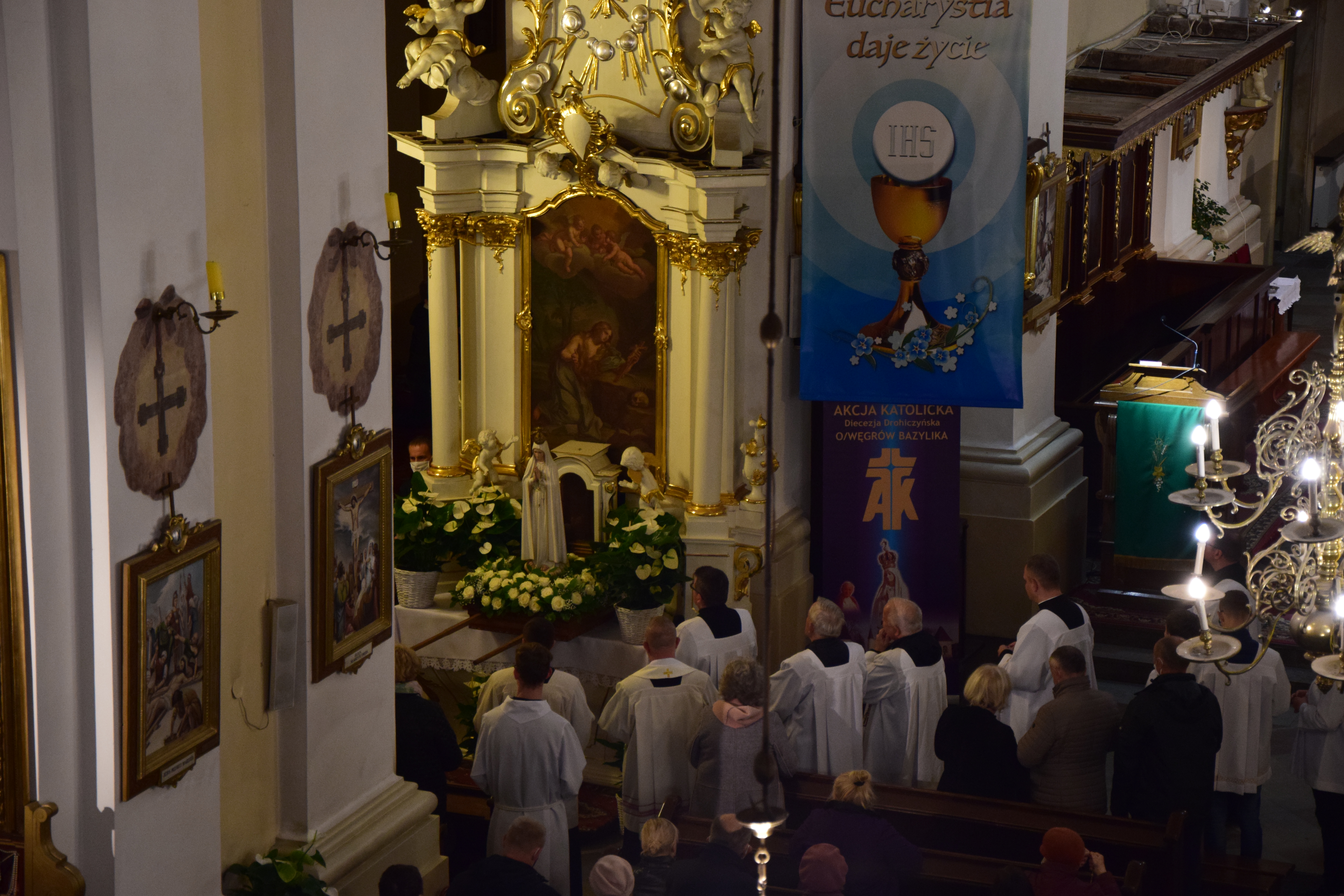O godz. 17:30 nastąpiło wystawienie Najświętszego Sakramentu i półgodzinna adoracja. Podczas modlitwy wstawienniczej ks. Wojciech Wysocki, miejscowy wikariusz, odczytywał intencje, spisane przez wiernych na kartkach i złożone w skrzyni pod figurą MB Fatimskiej. We wtorek 13 października rozpoczęto również dziewięciodniową Nowennę przed liturgicznym wspomnieniem św. Jana Pawła II, papieża. Przygotowana specjalnie na tą okazję modlitwa stała się zwieńczeniem czuwania przy Jezusie Chrystusie obecnym w Żywym Chlebie na ołtarzu.